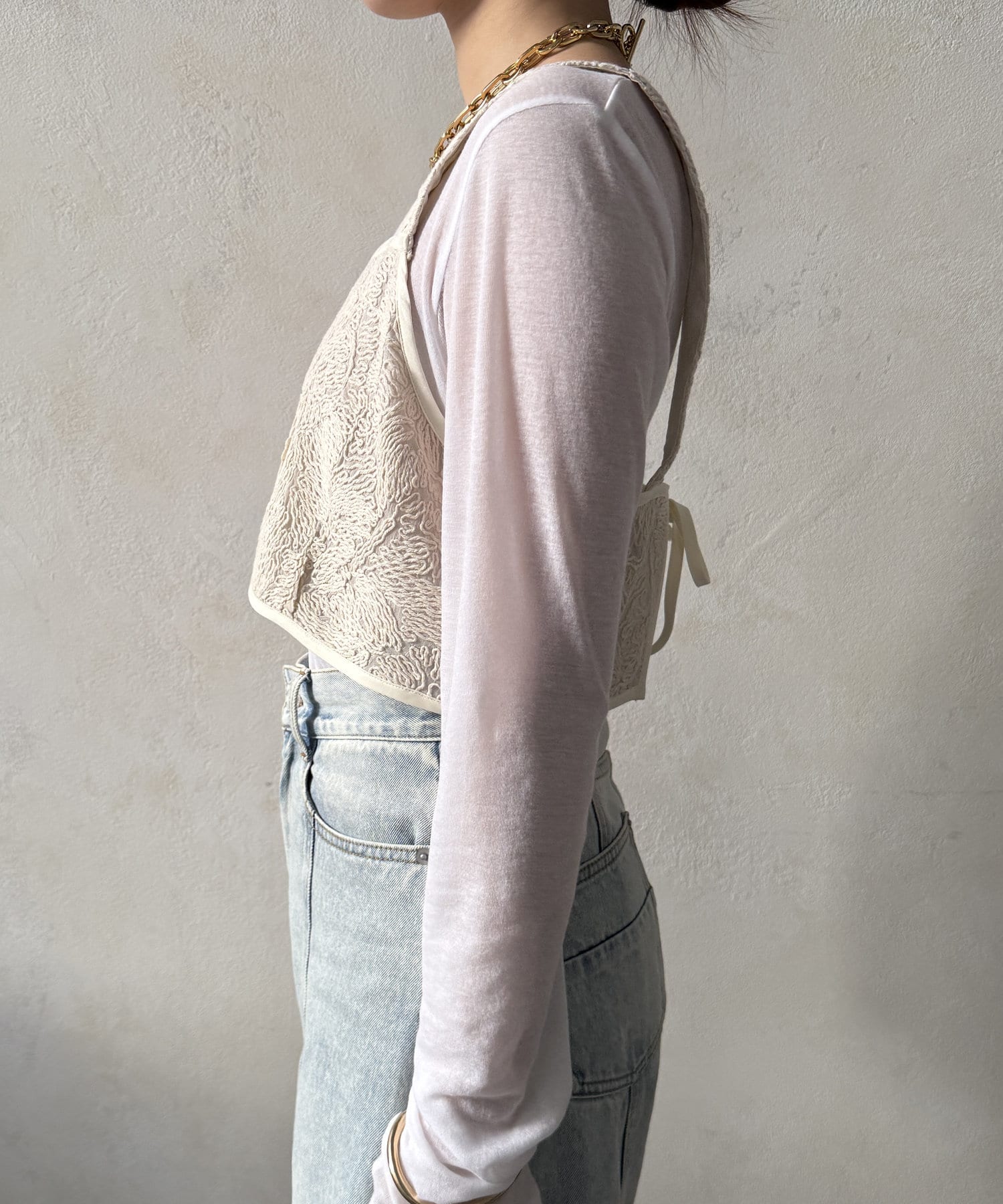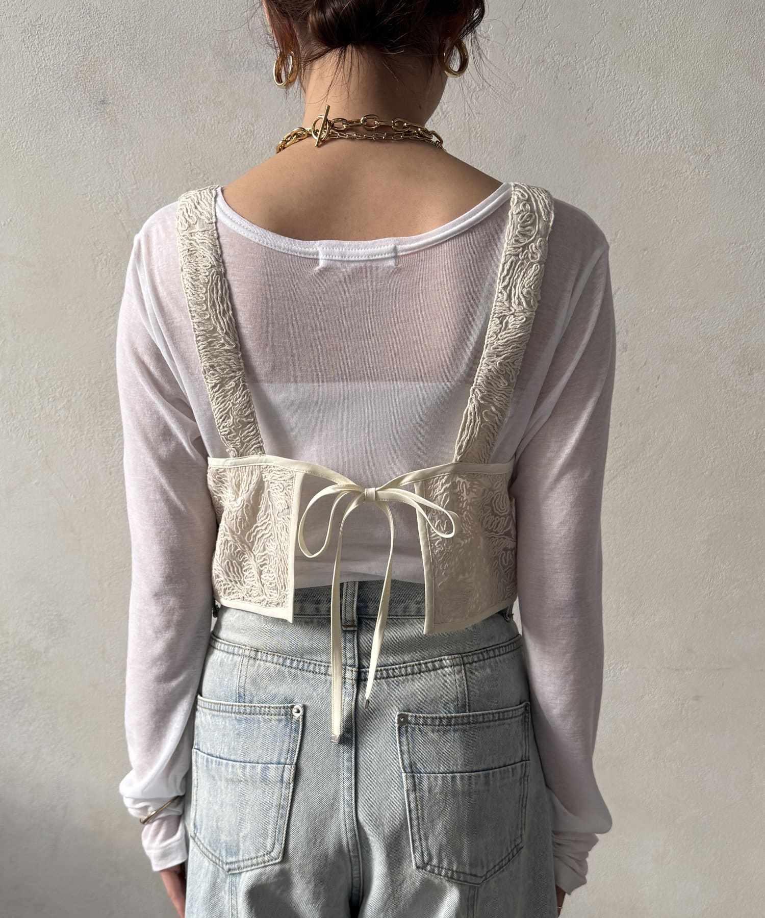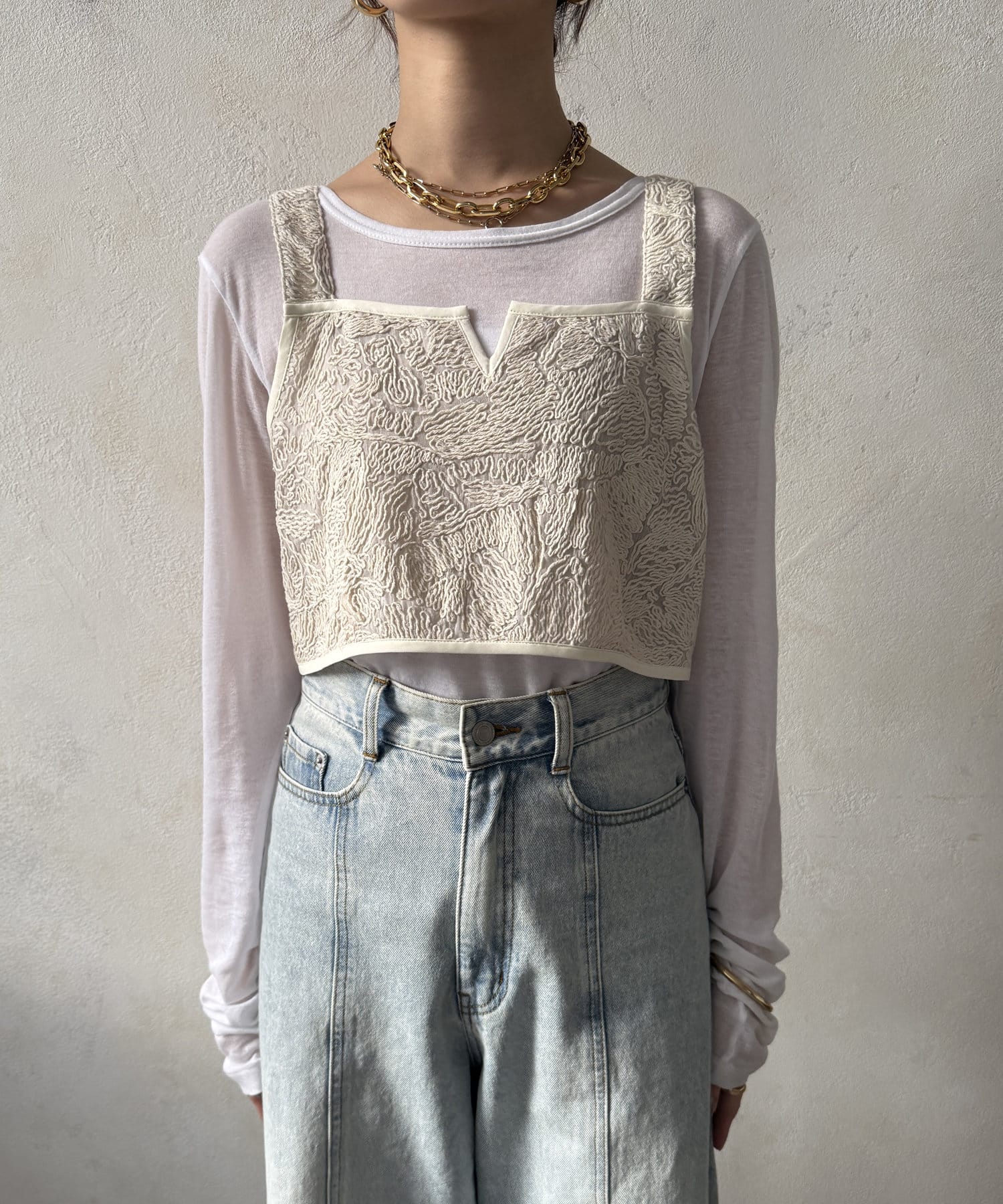 ベースにテープ刺繍が施されることで甘くなりすぎず、