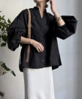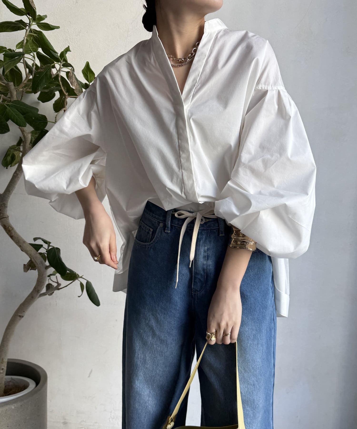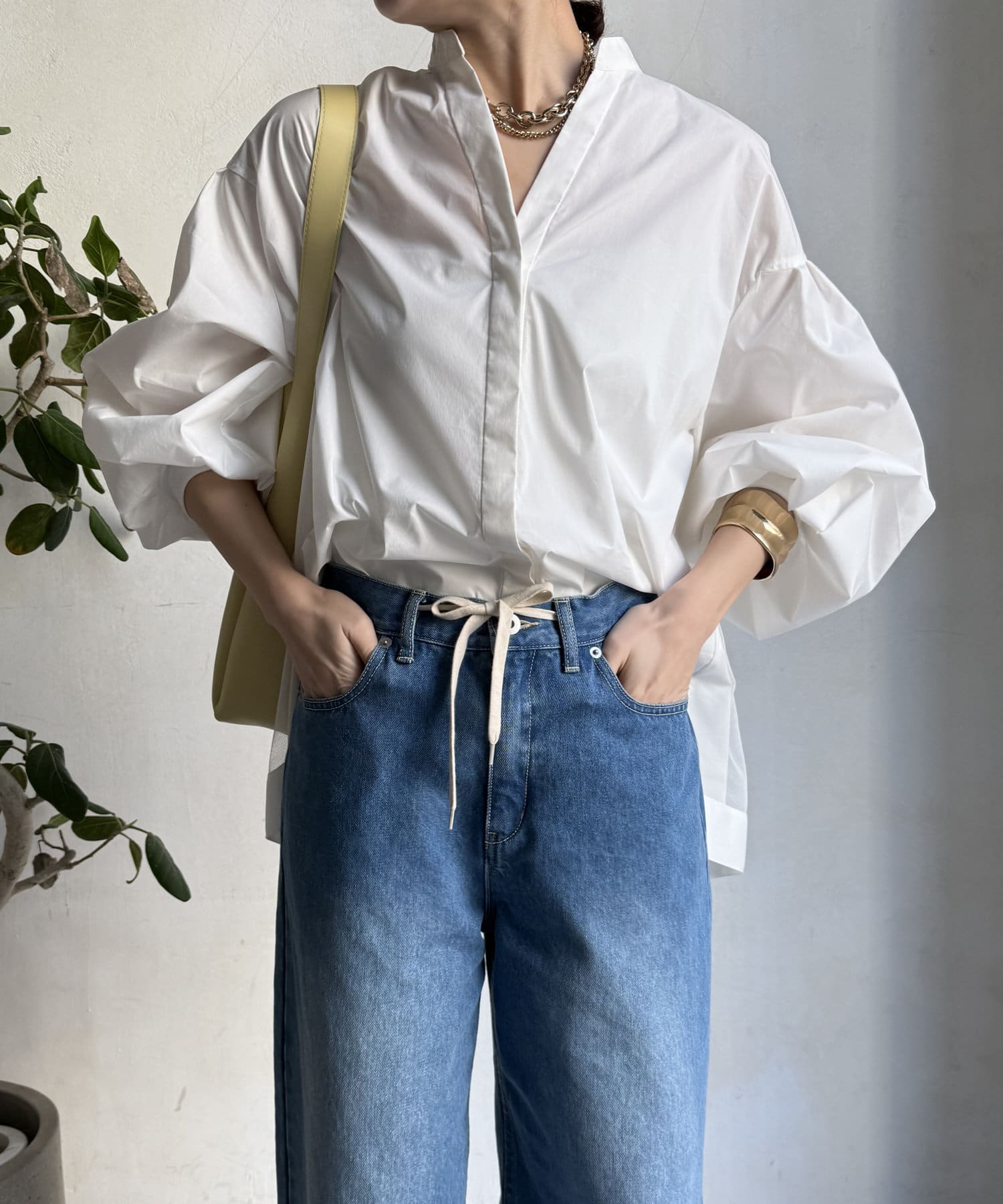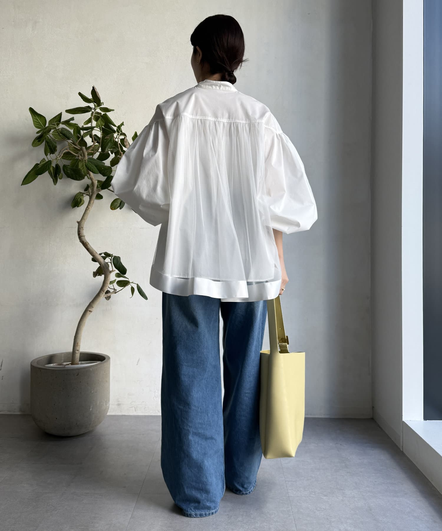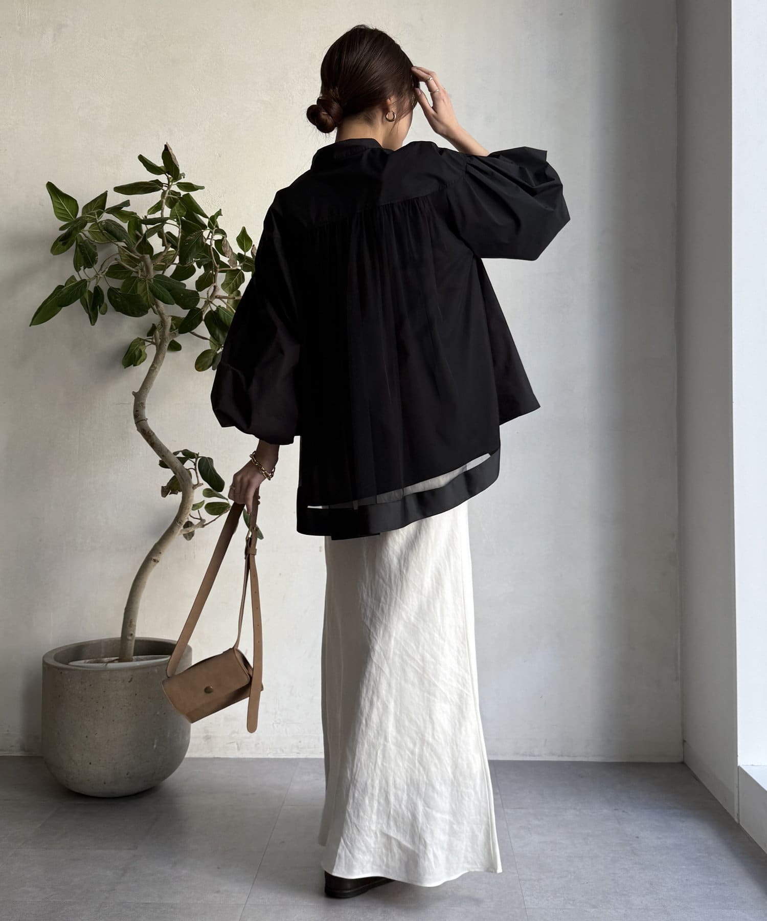 バックチュールのデザインが抜け感をプラスしてくれて、他のブラウスと差をつけるスタイルに!