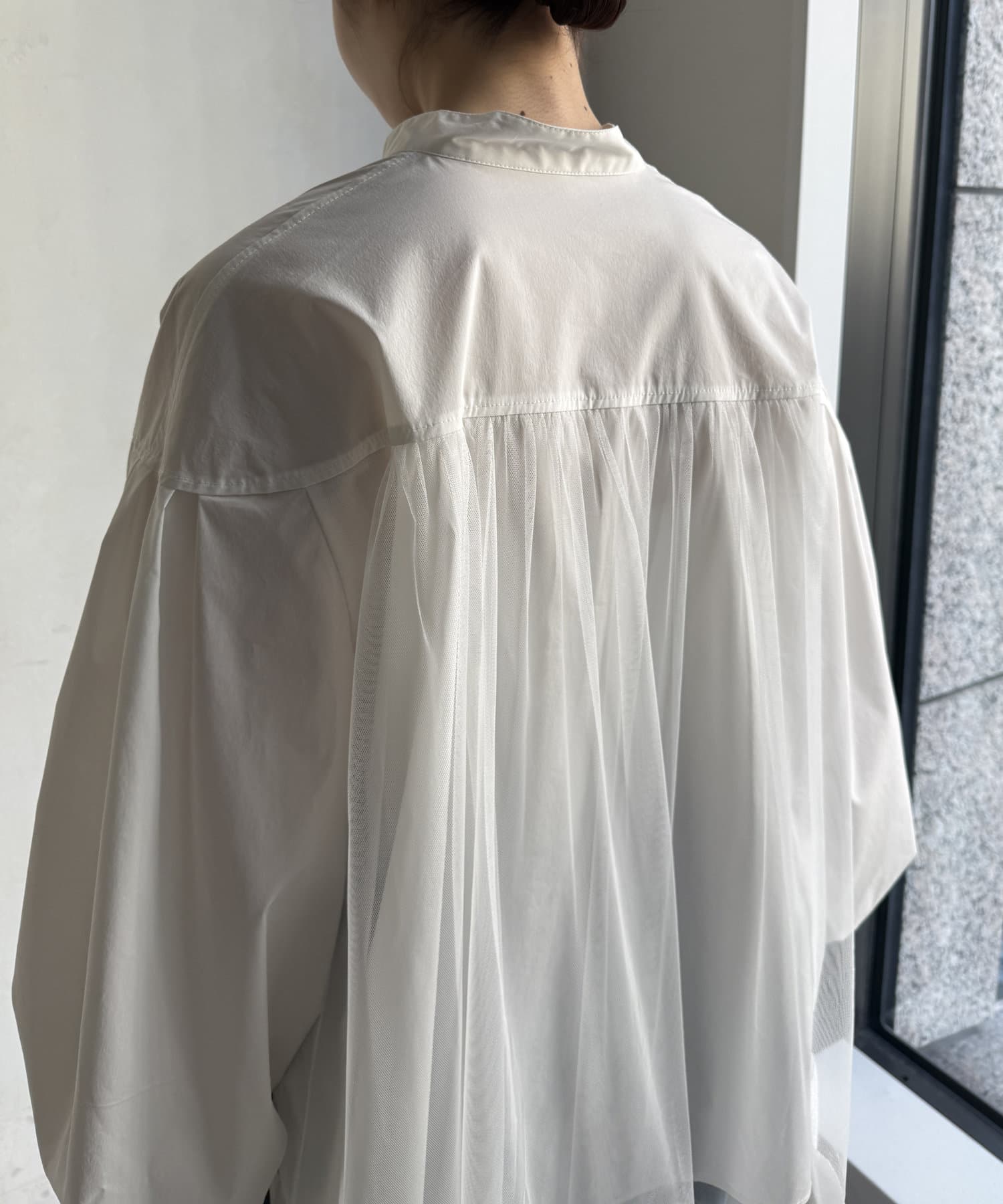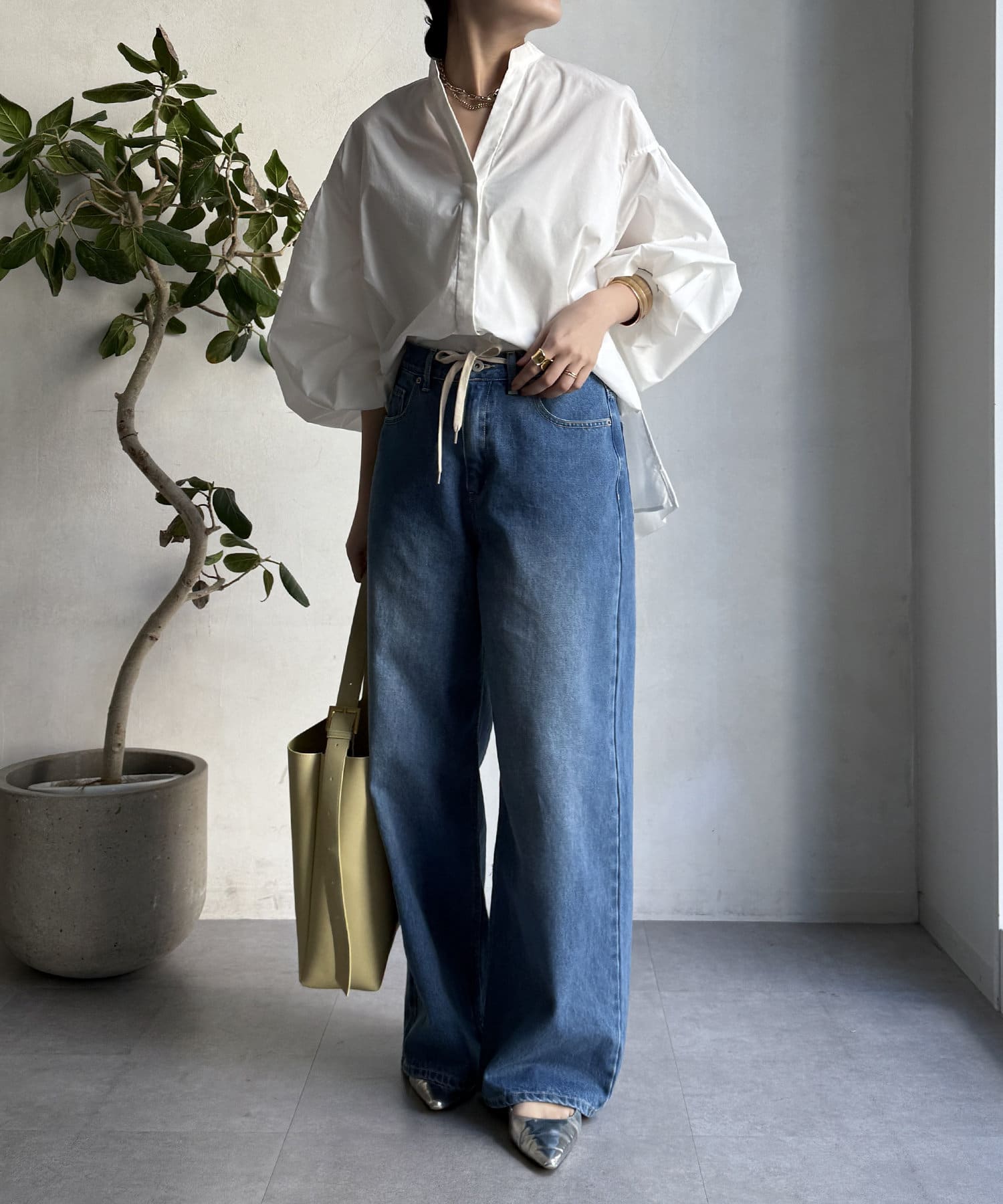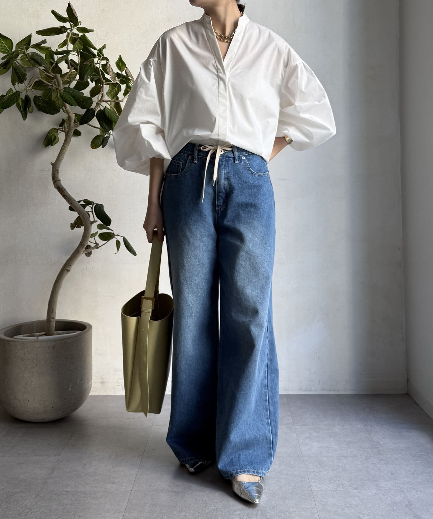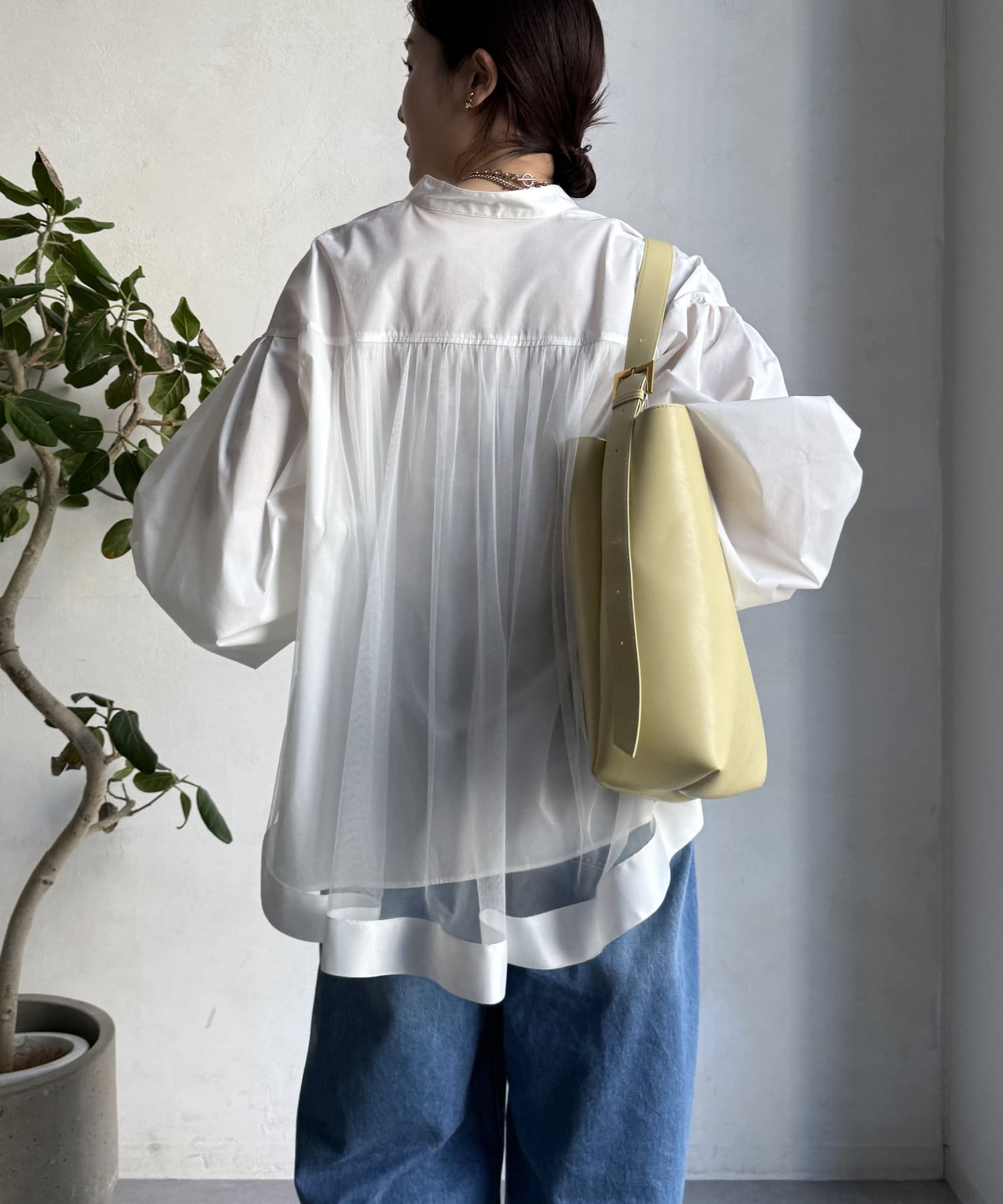 バックチュールのデザインが抜け感をプラスしてくれて、他のブラウスと差をつけるスタイルに!