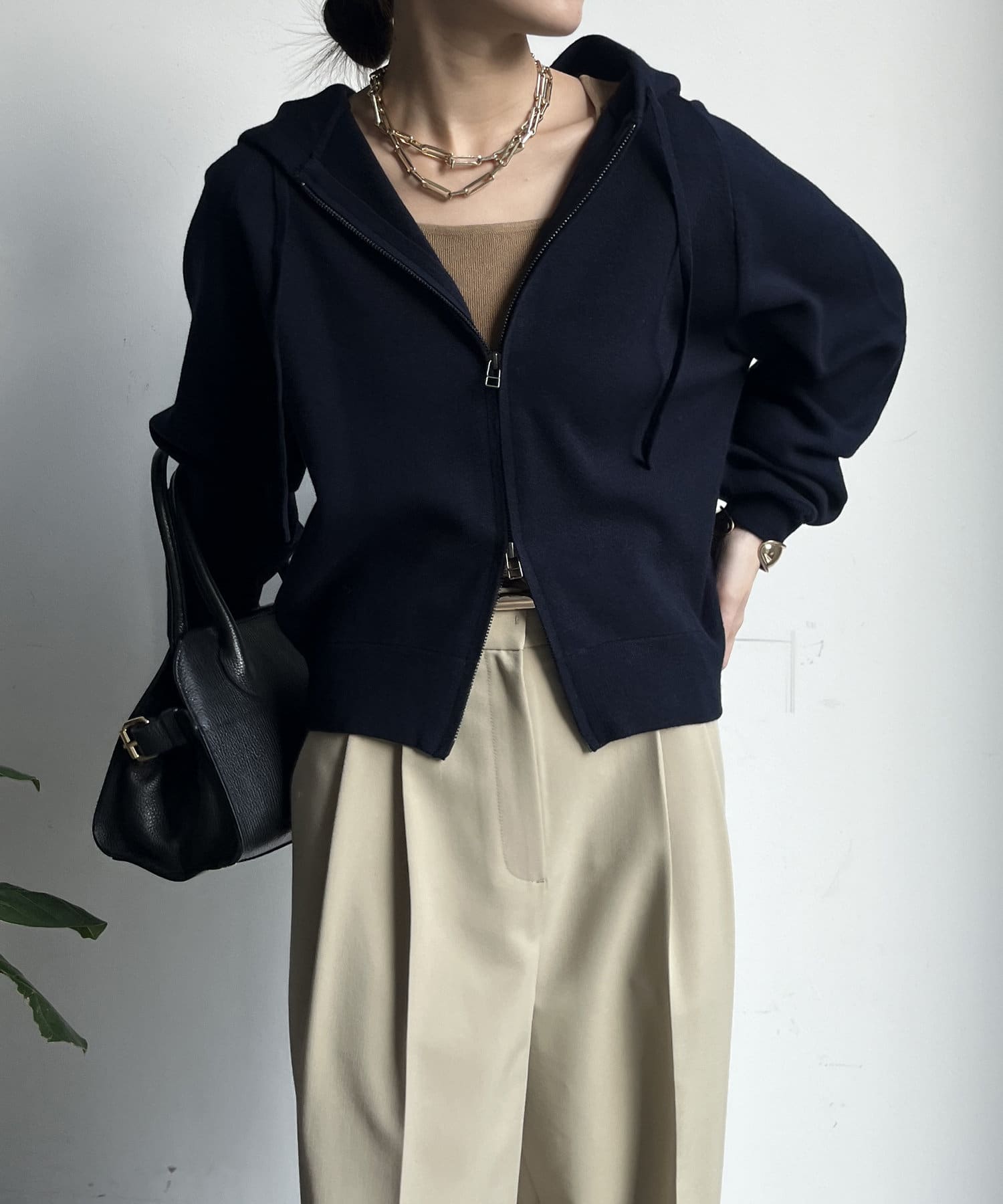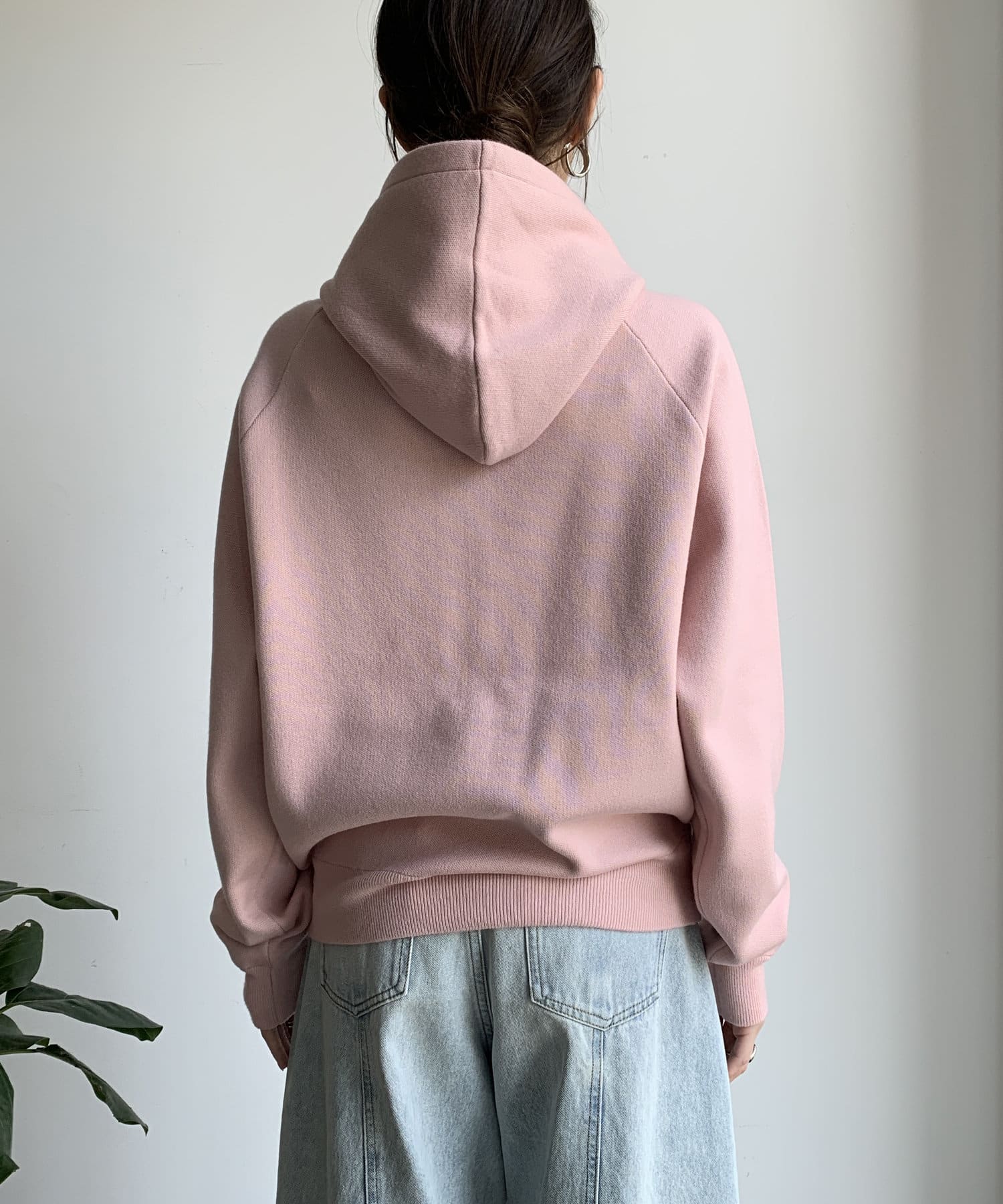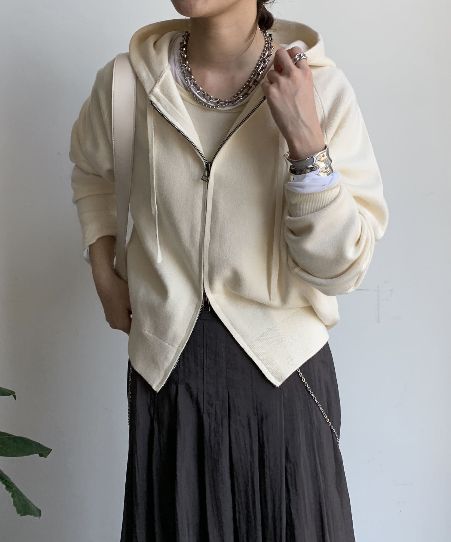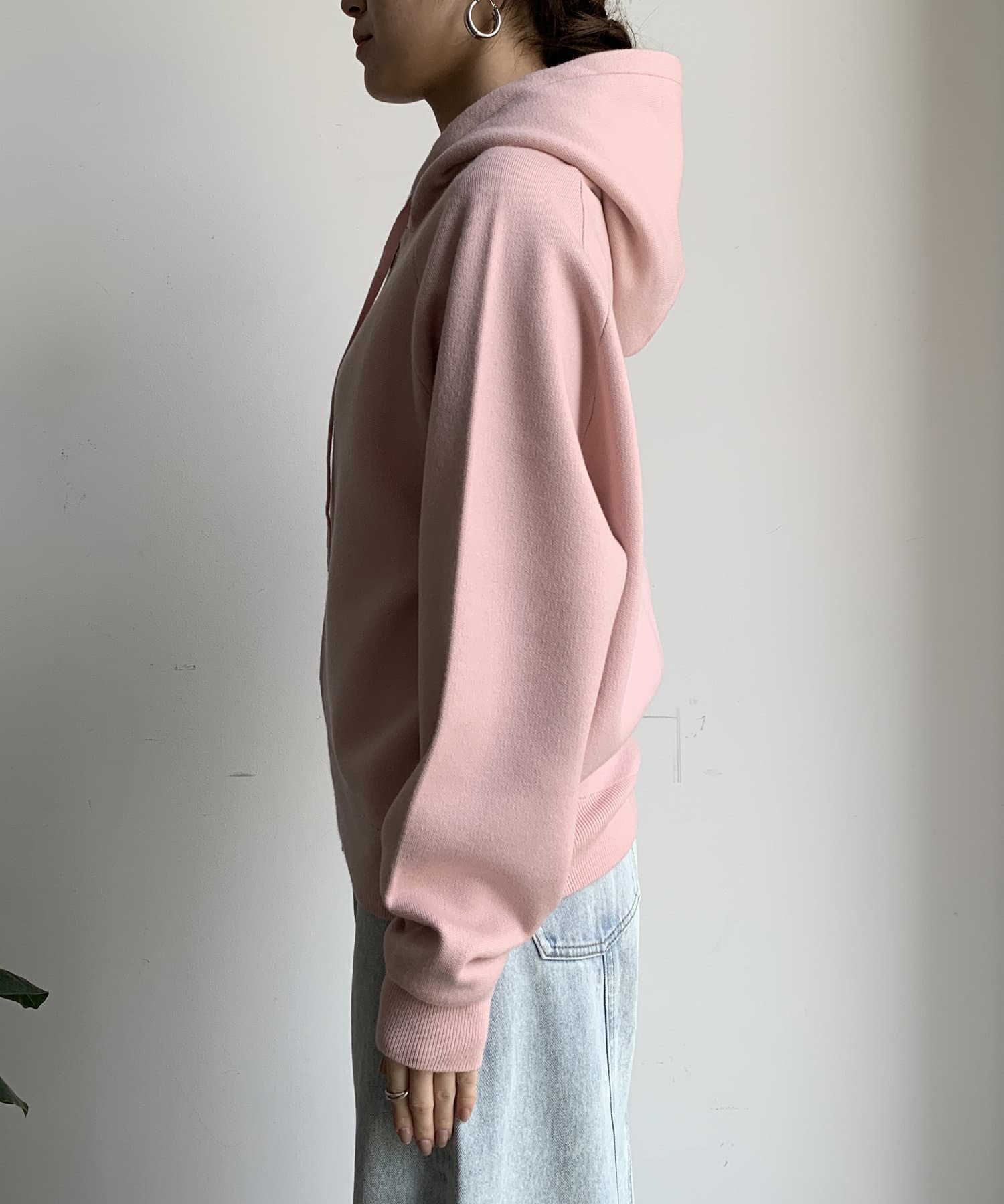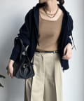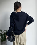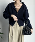 カジュアルなパーカーに程よいタイトなサイズ感で上品さをプラスした1着。