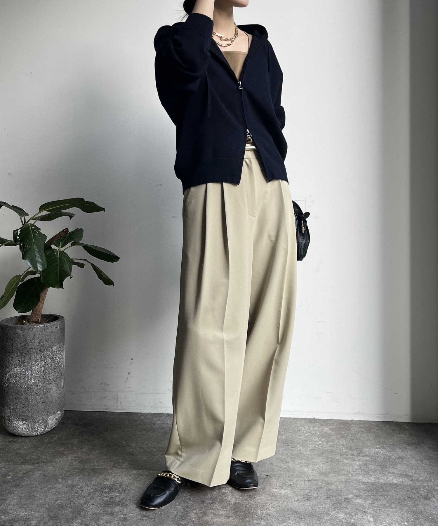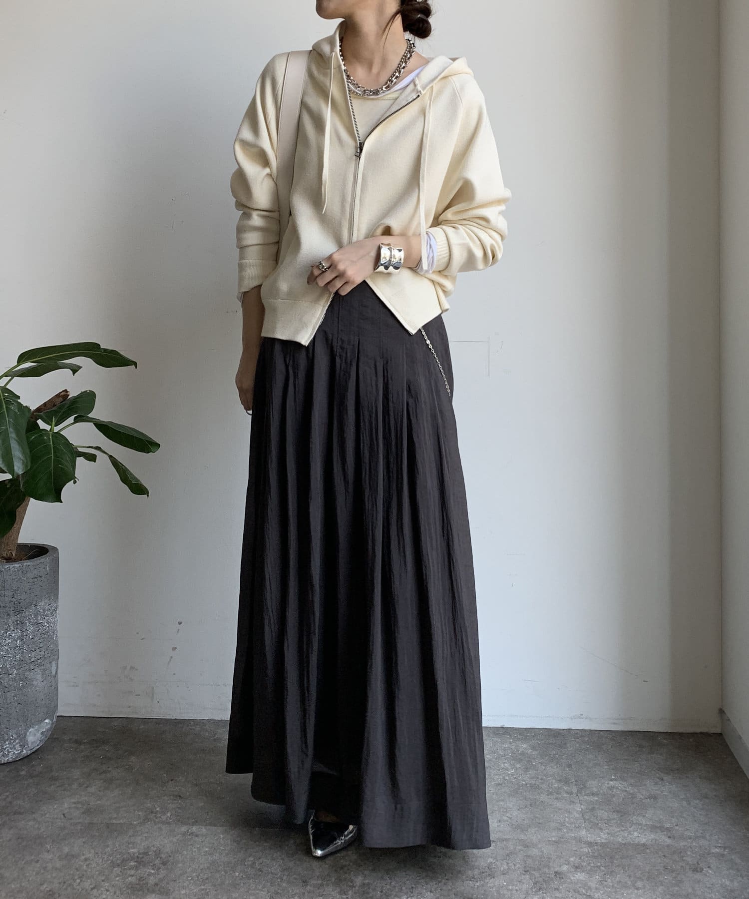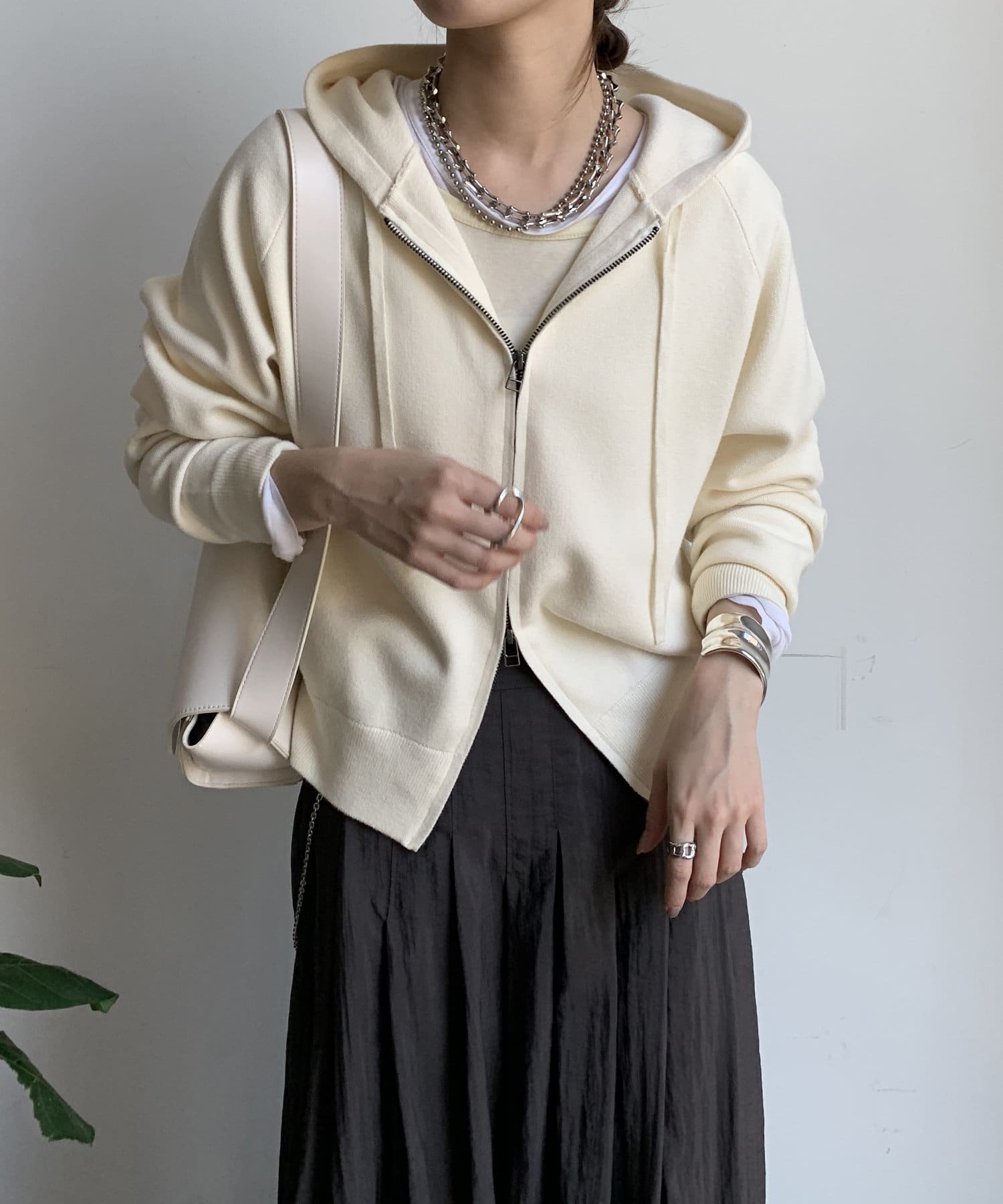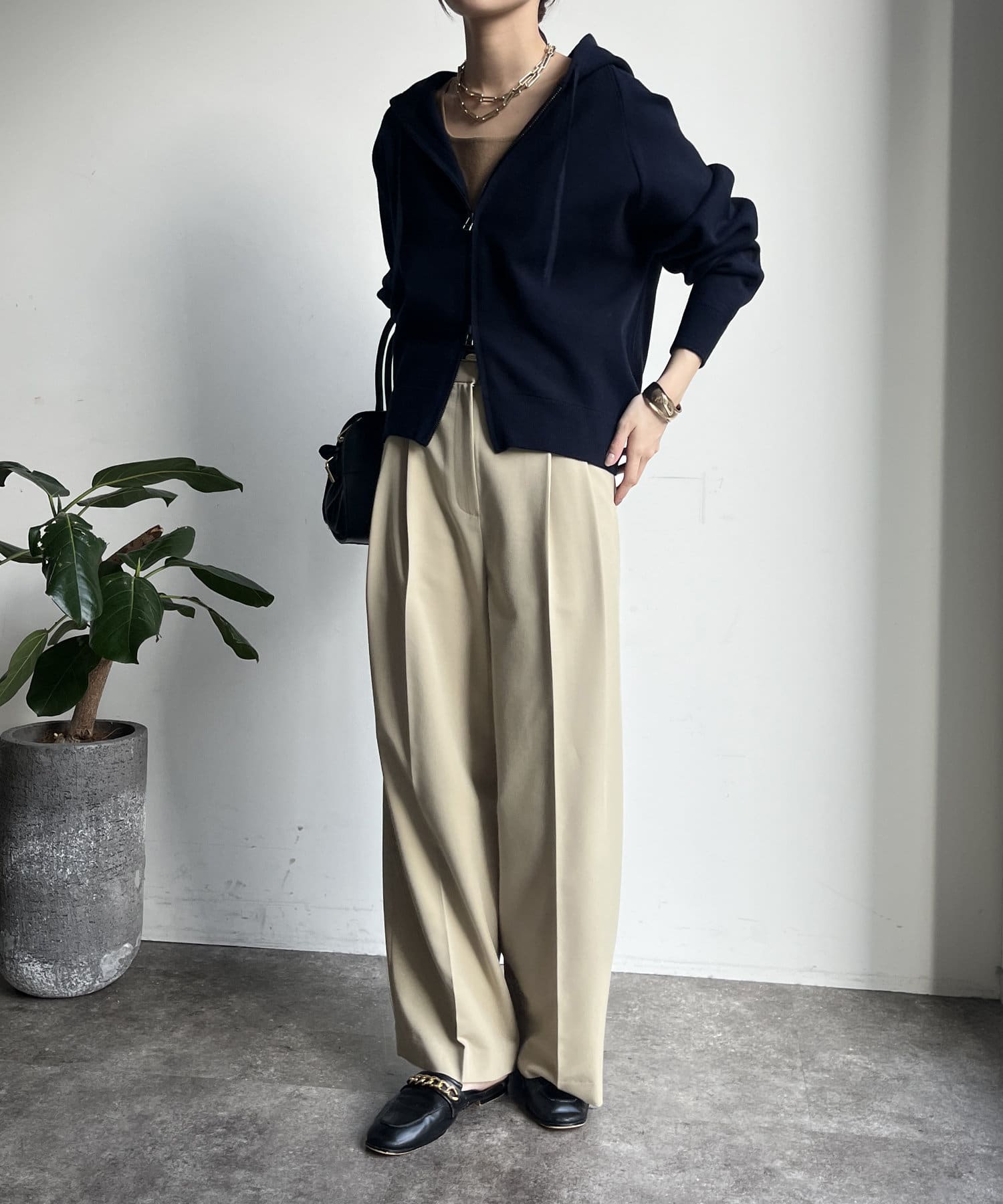 カジュアルなパーカーに程よいタイトなサイズ感で上品さをプラスした1着。