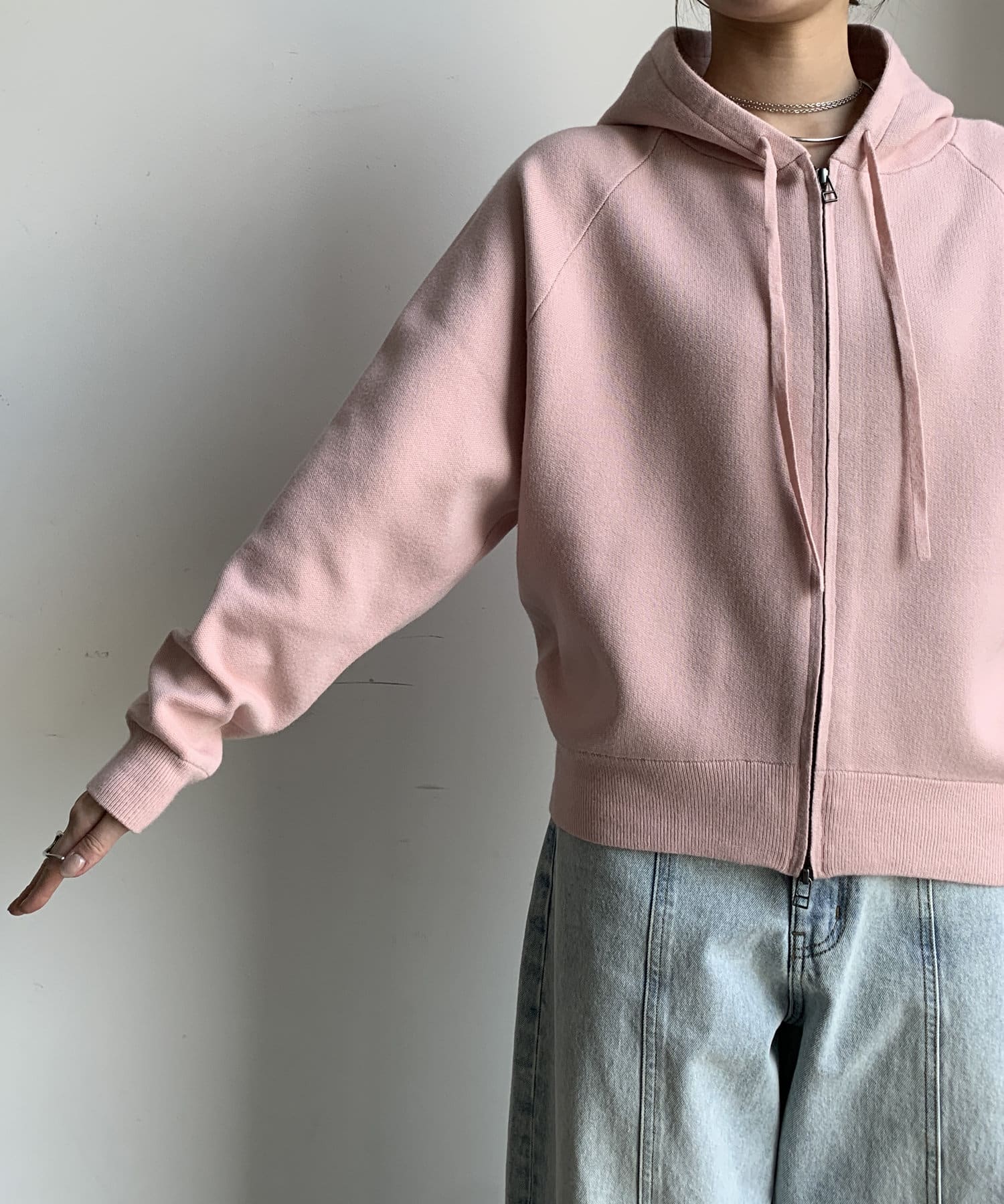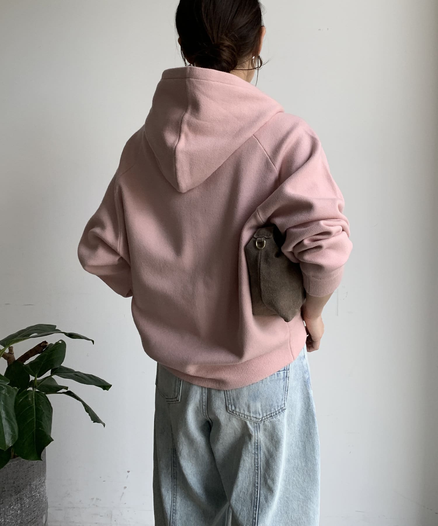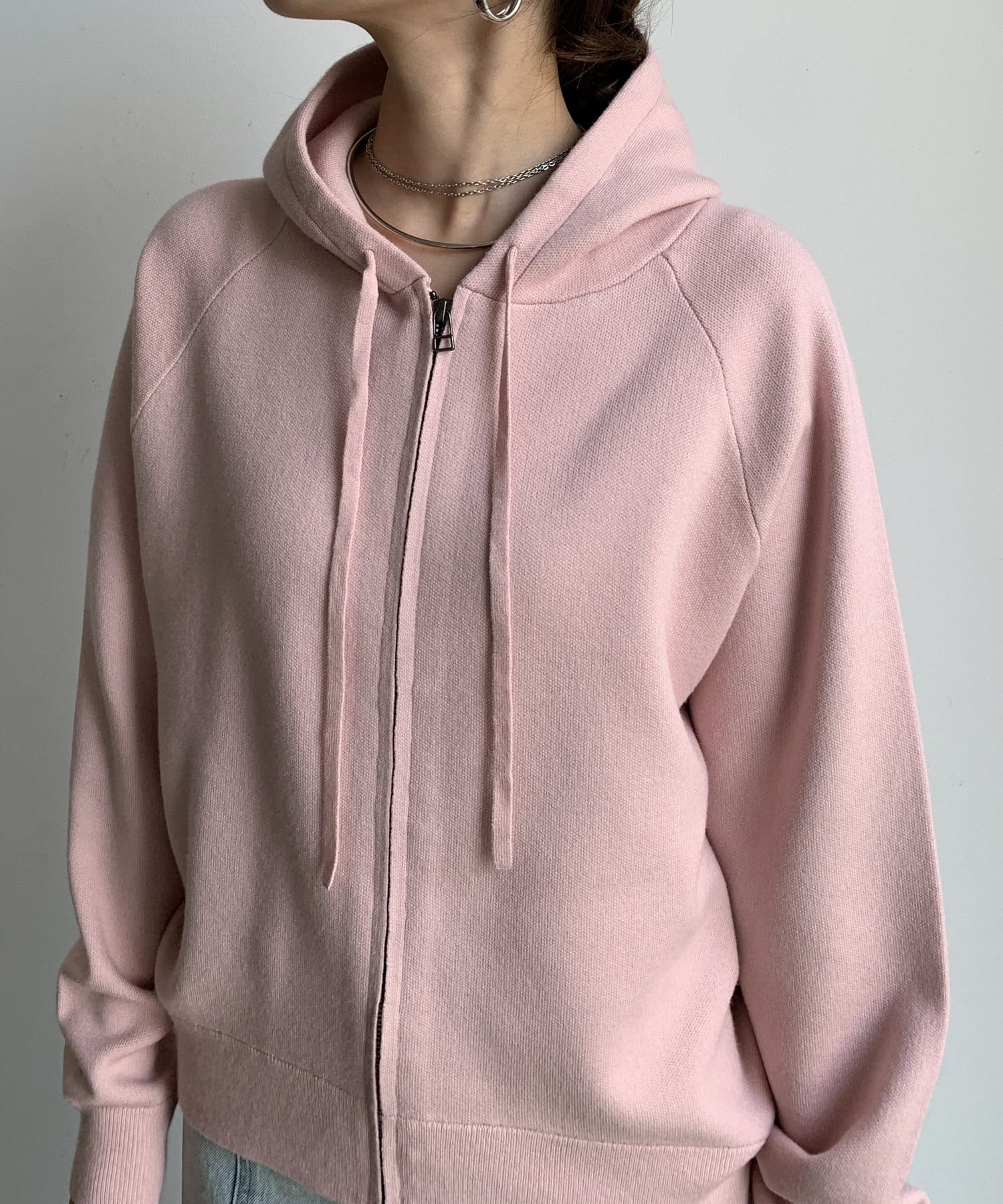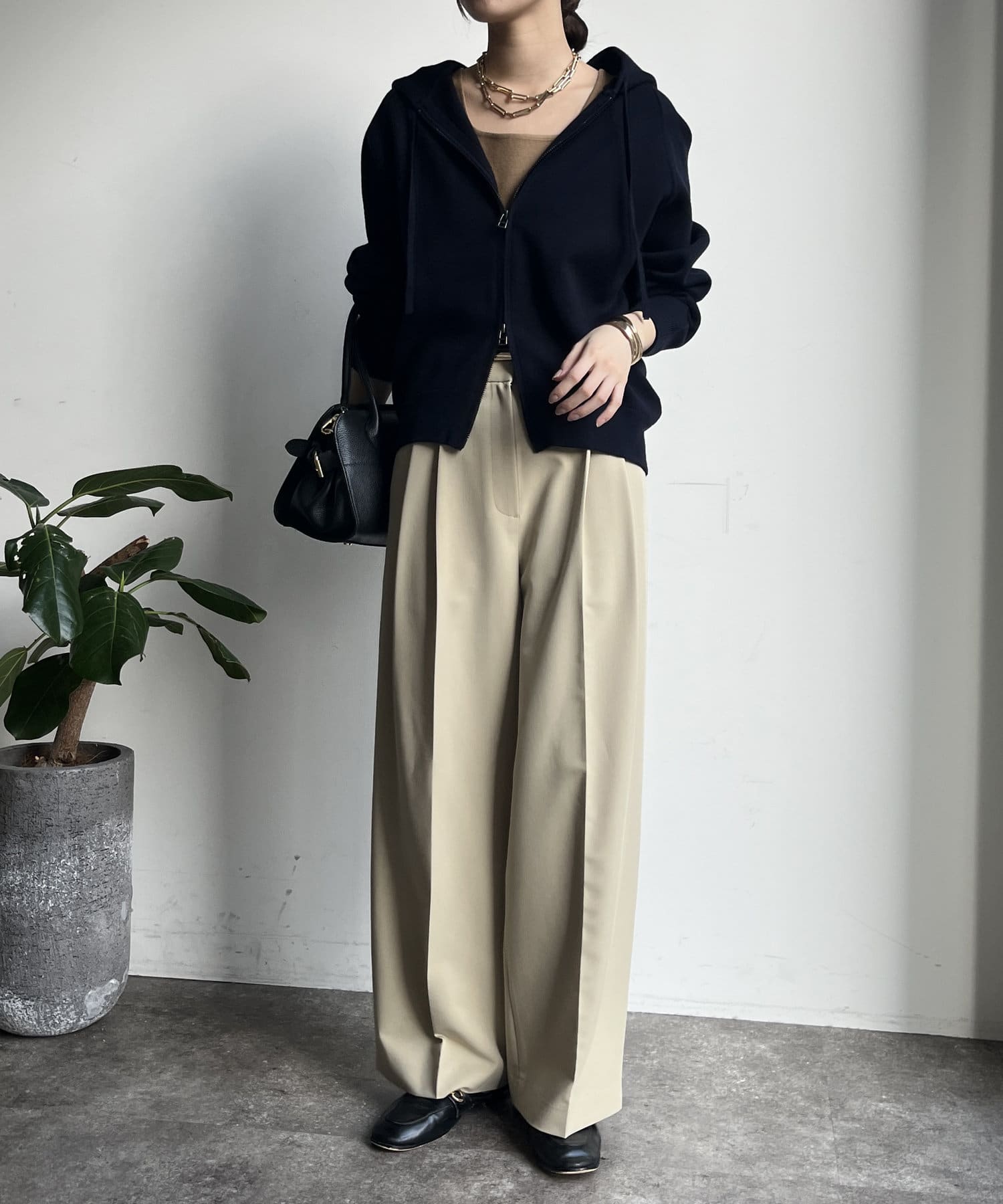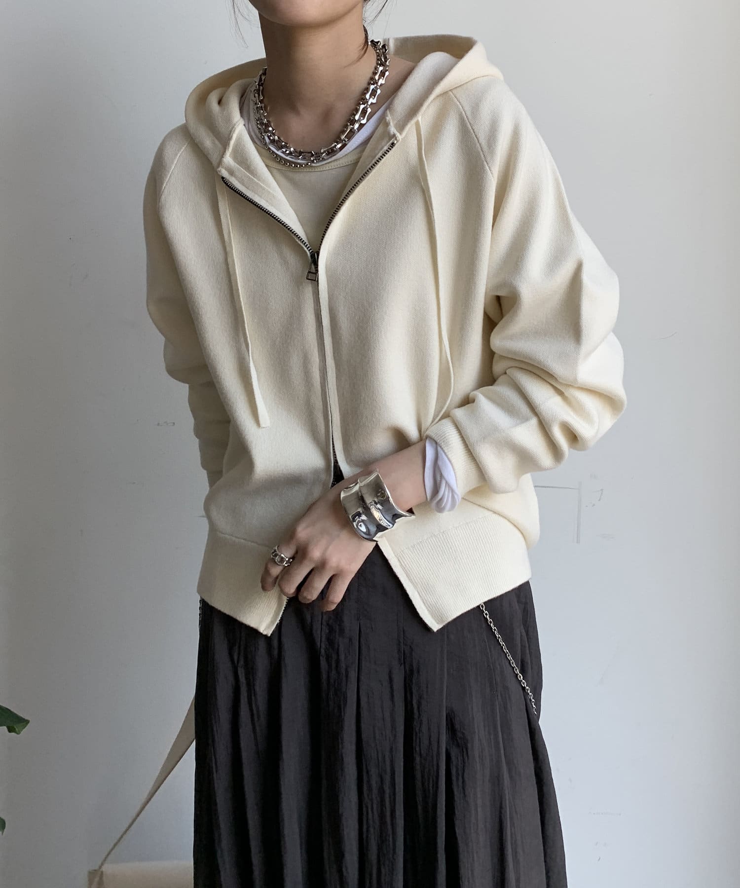 カジュアルなパーカーに程よいタイトなサイズ感で上品さをプラスした1着。