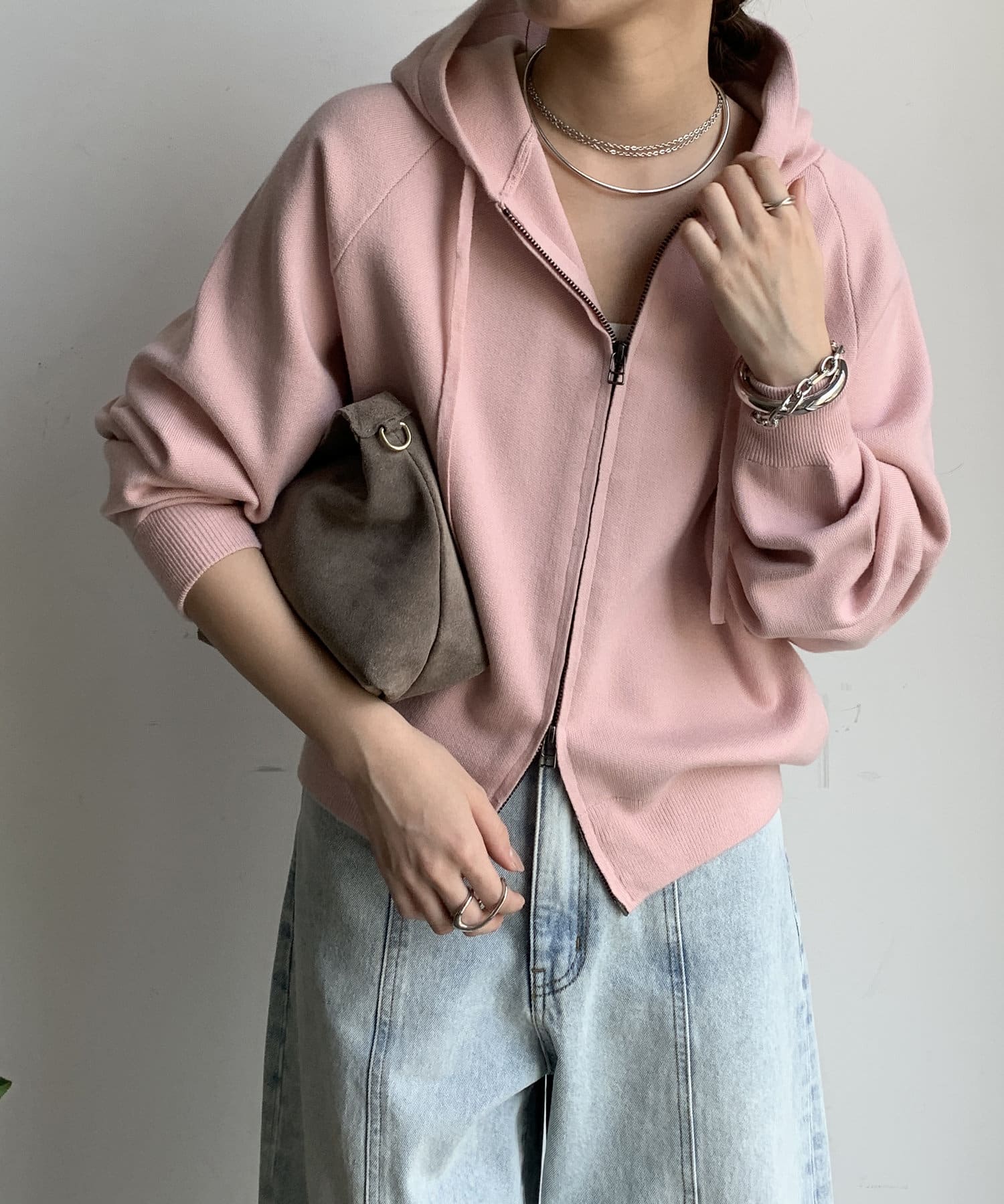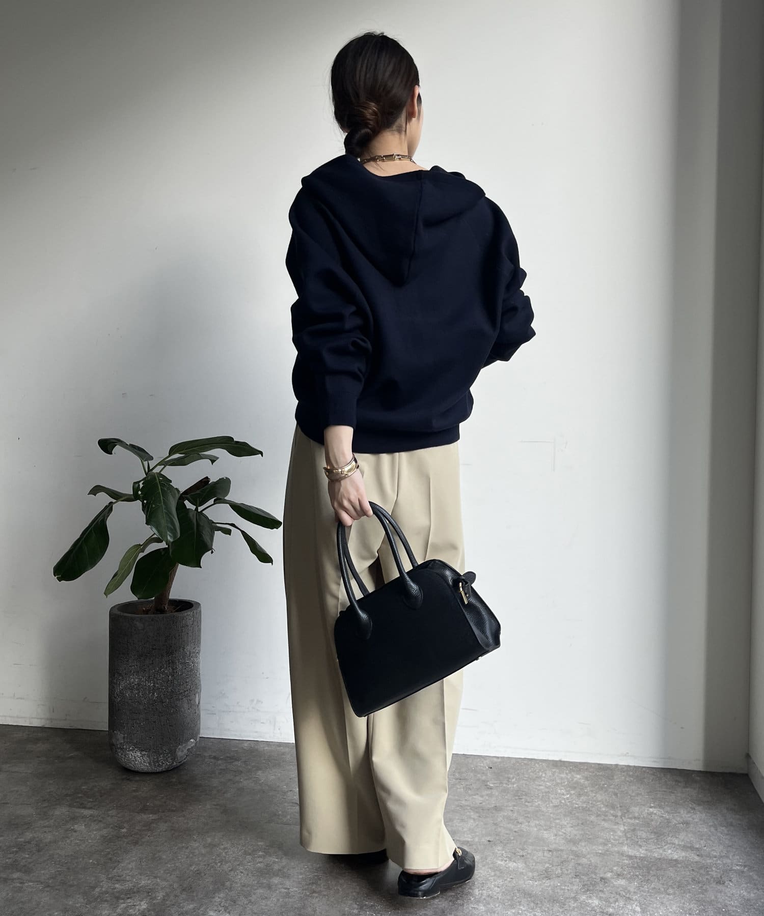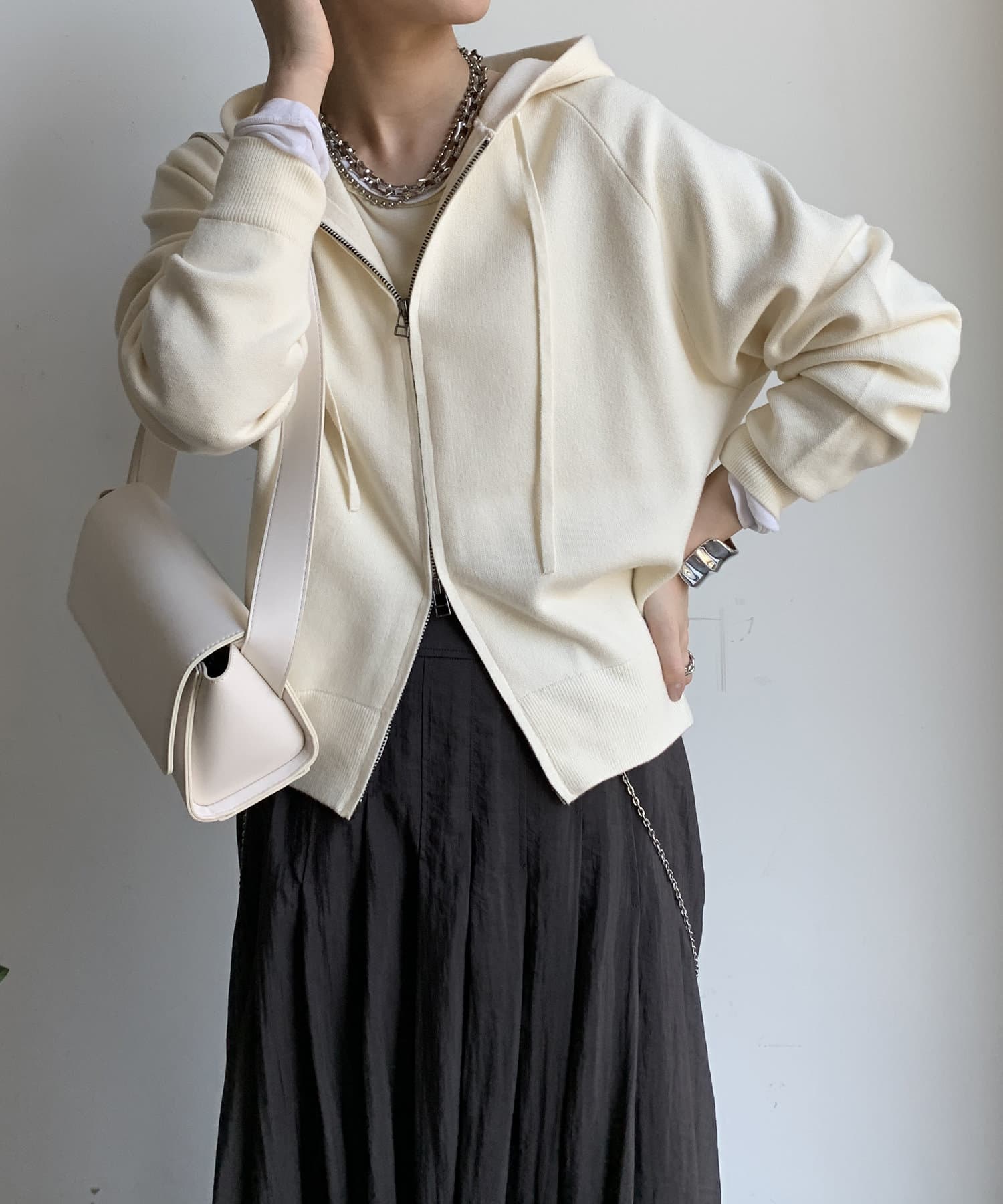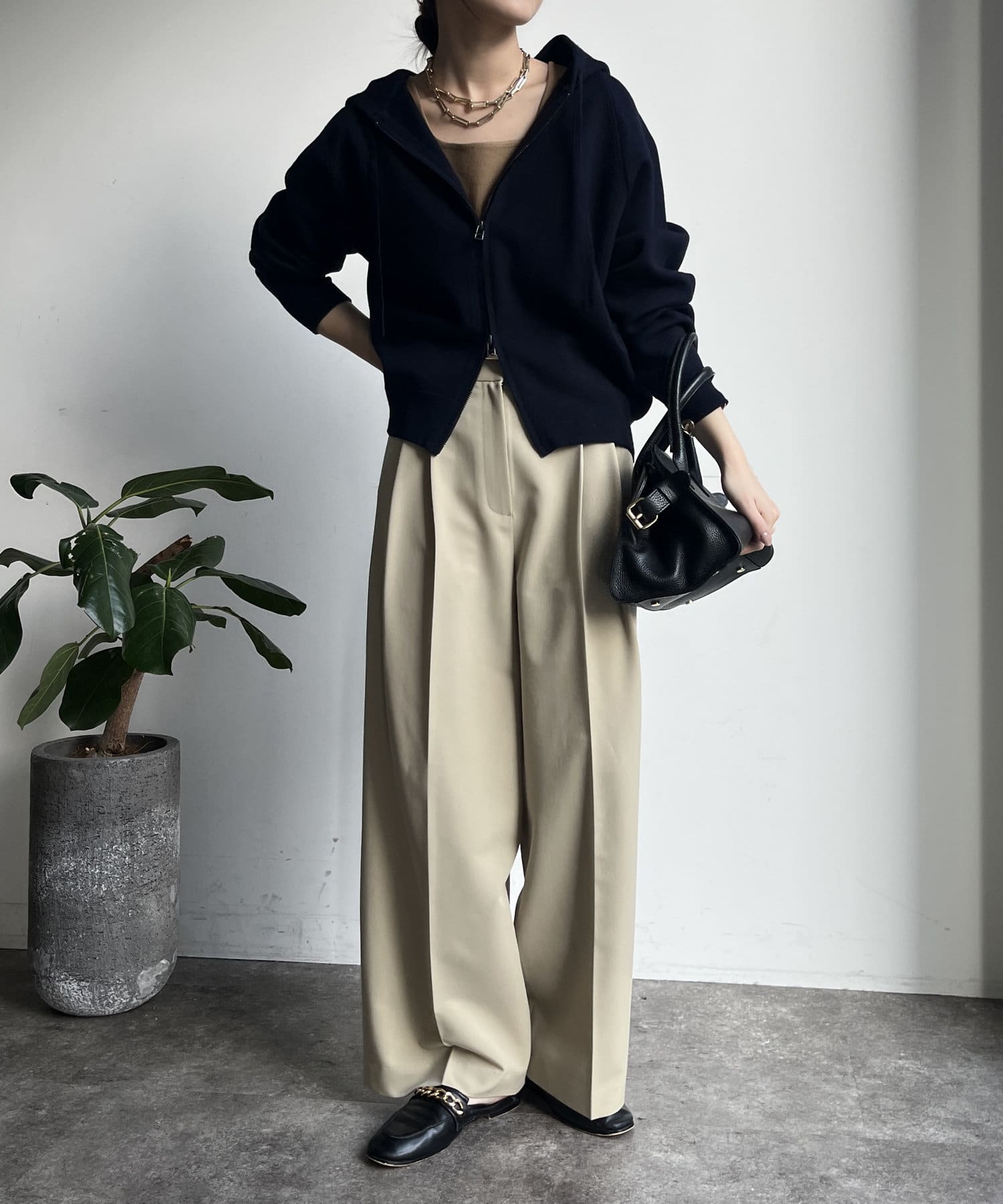 カジュアルなパーカーに程よいタイトなサイズ感で上品さをプラスした1着。