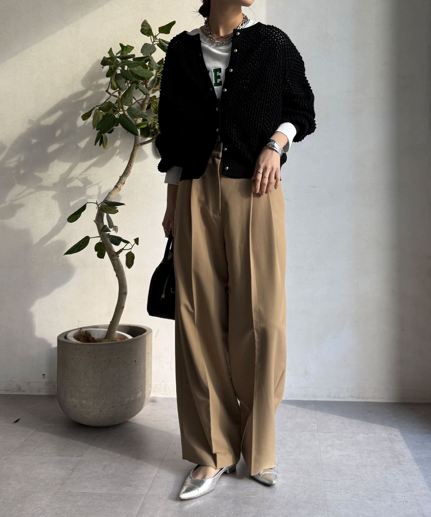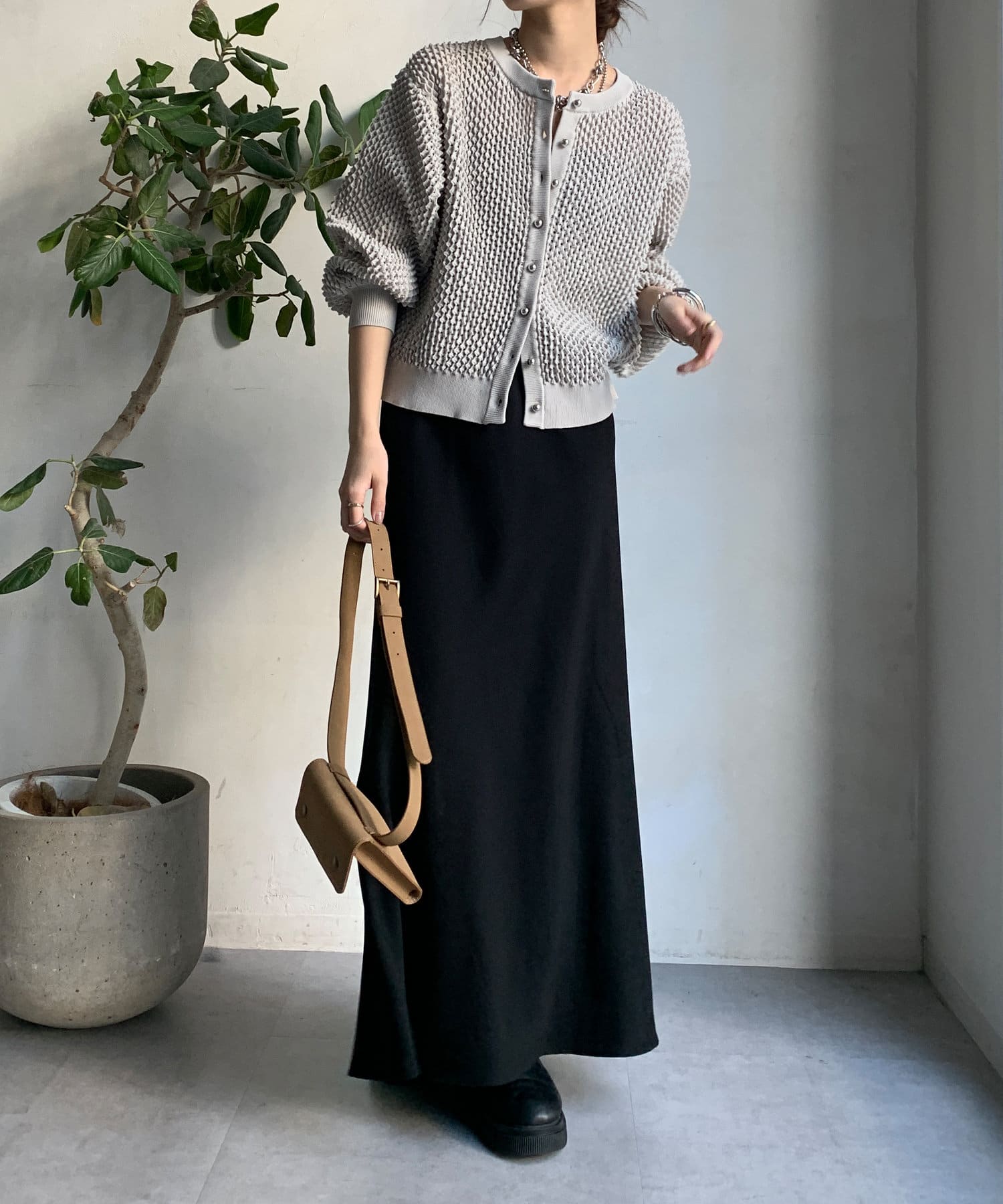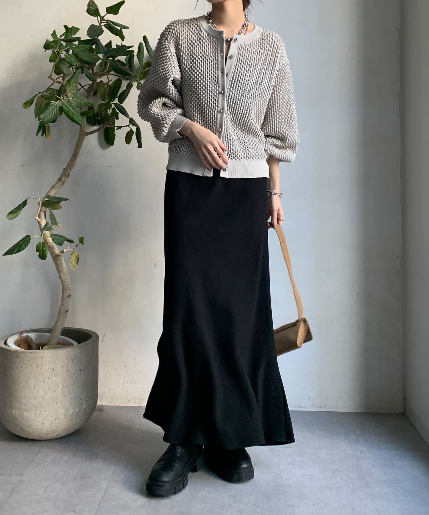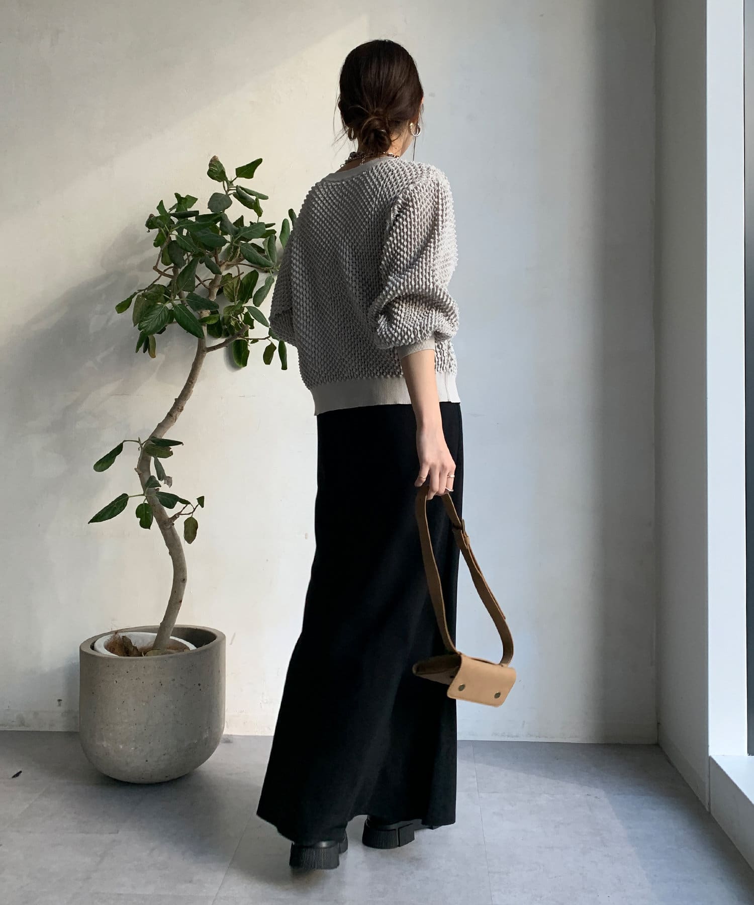 表面感のある素材で存在感をプラスしてくれるので、合わせるアイテムはシンプルなものでもおしゃれ見え。