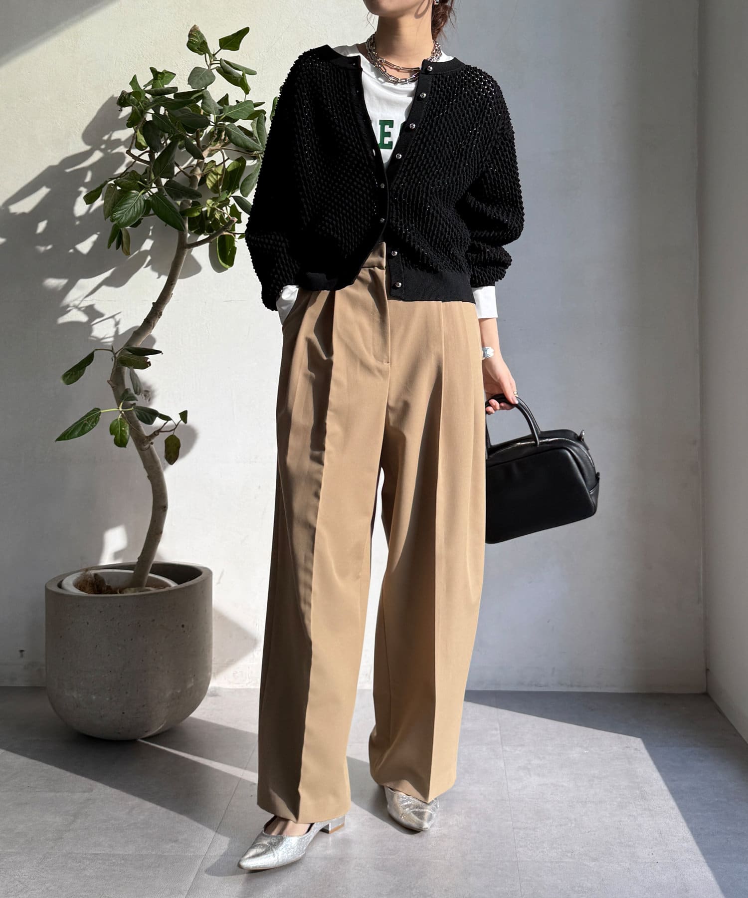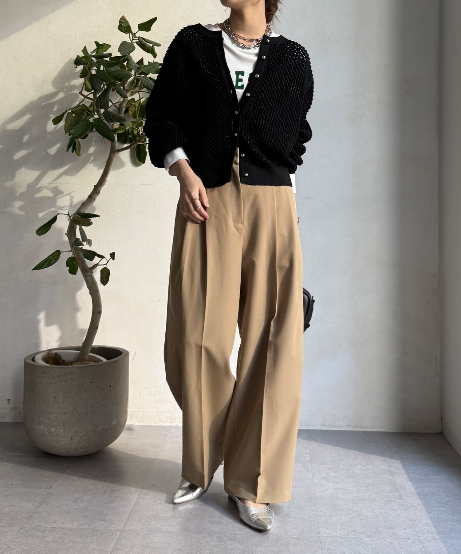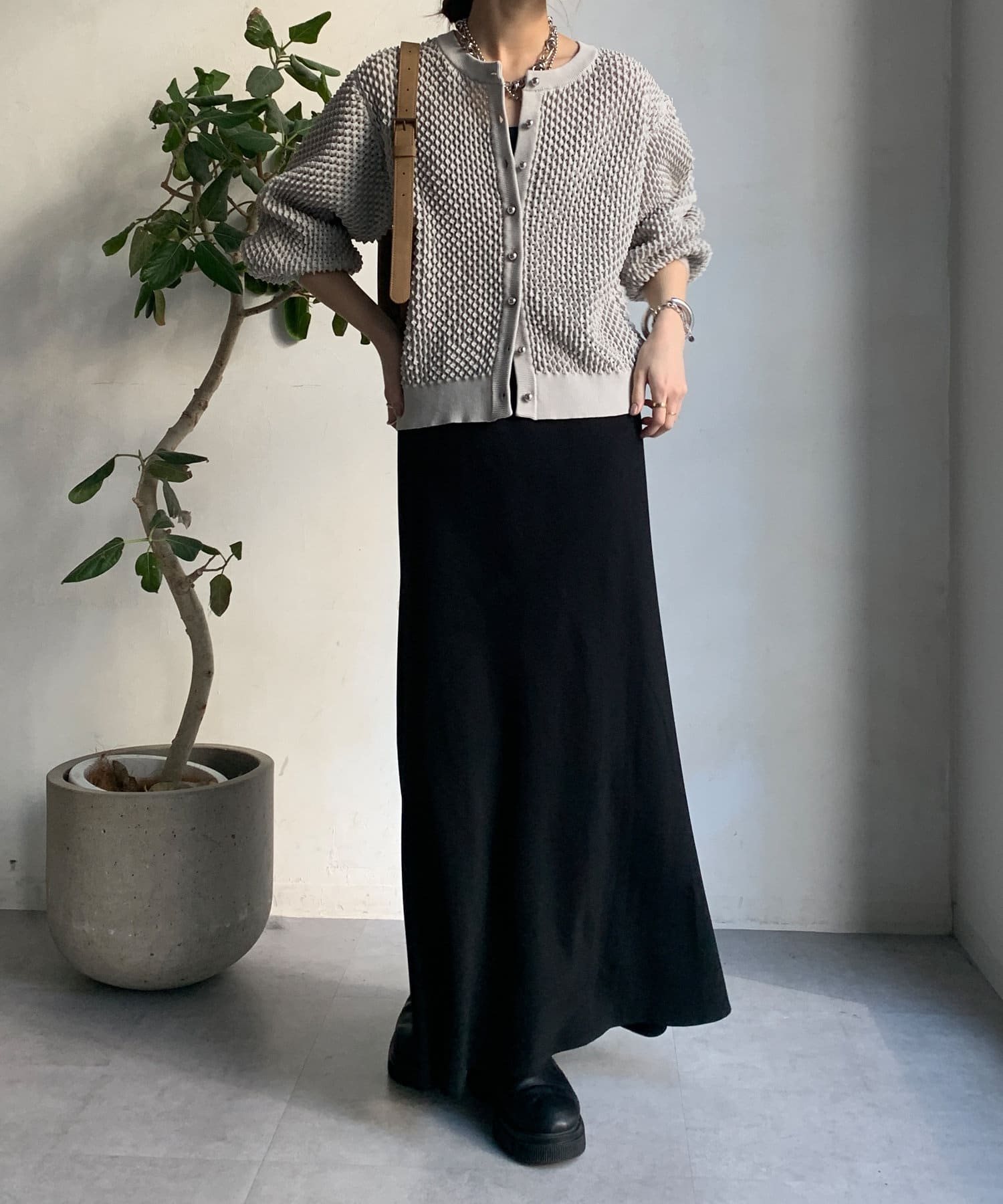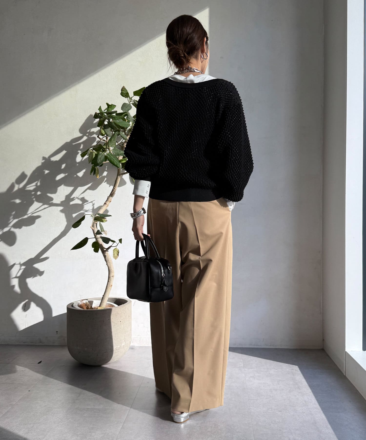 表面感のある素材で存在感をプラスしてくれるので、合わせるアイテムはシンプルなものでもおしゃれ見え。