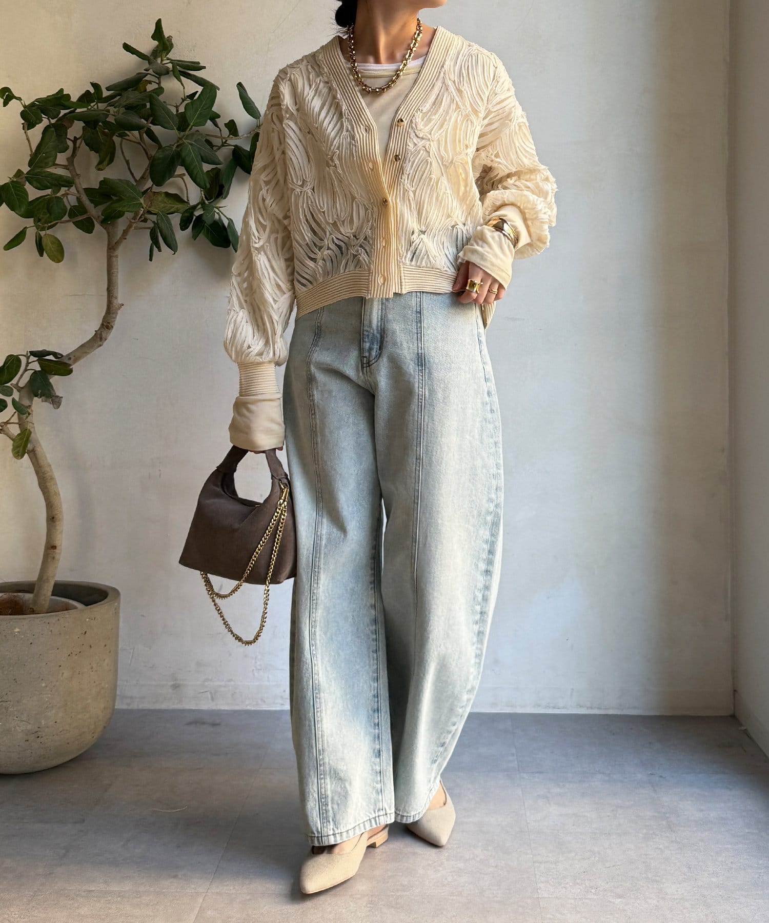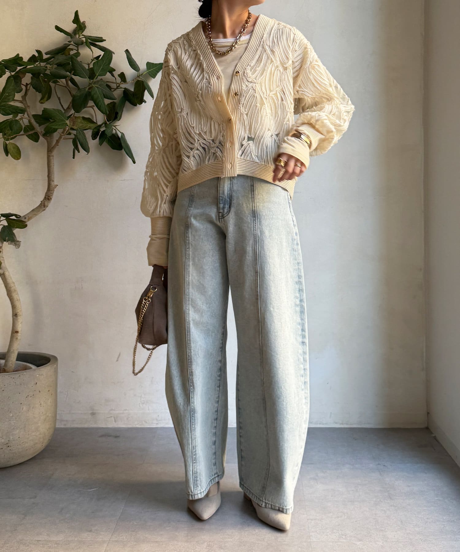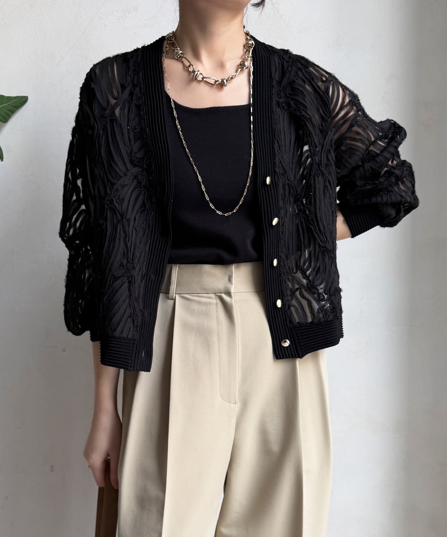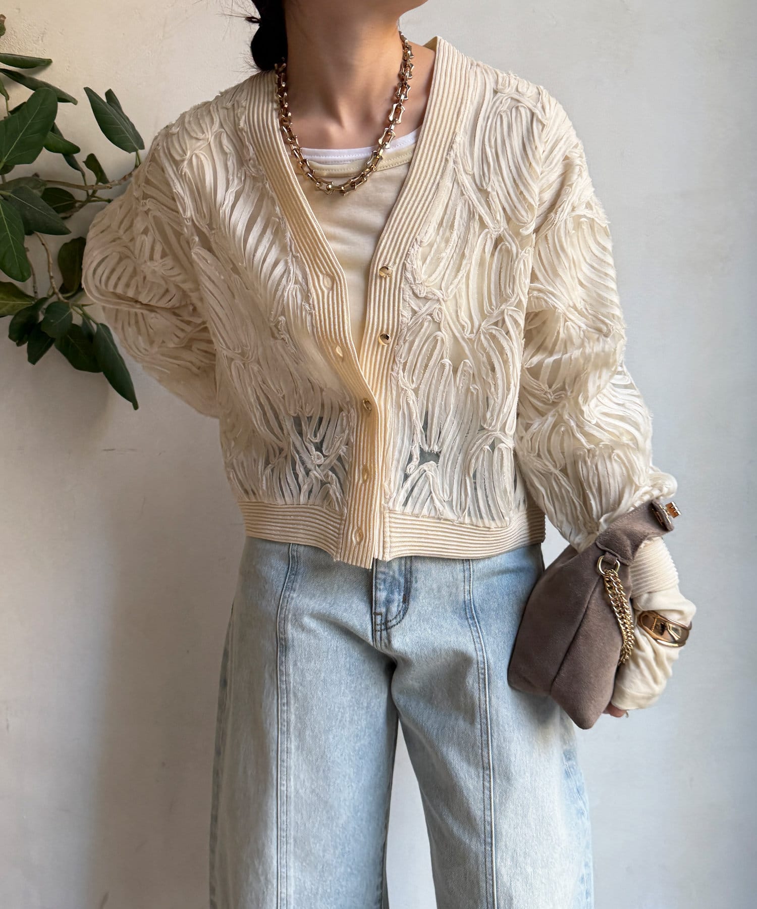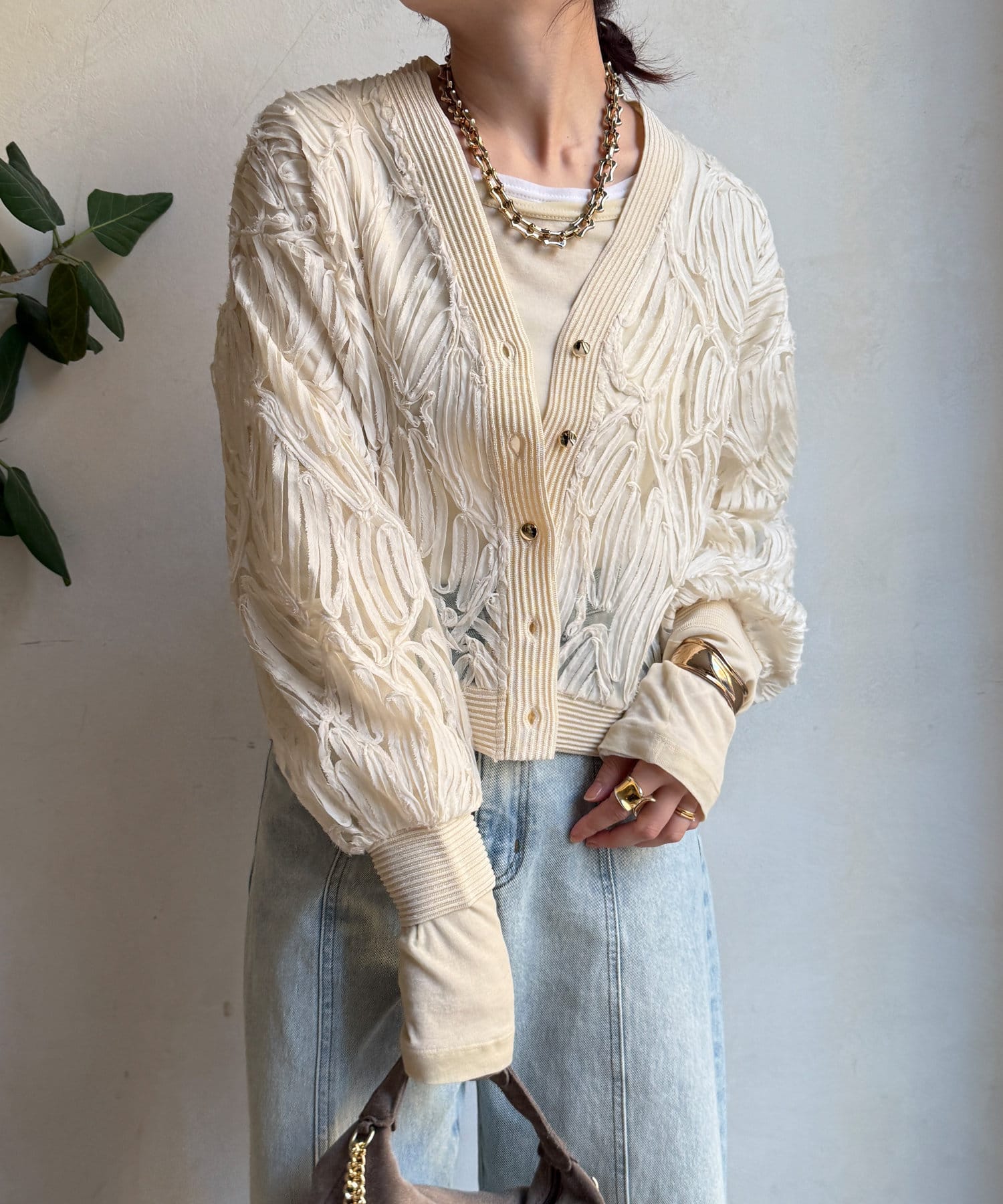 スタイリングを華やかに見せてくれる凹凸感のあるデザインのカーディガン。