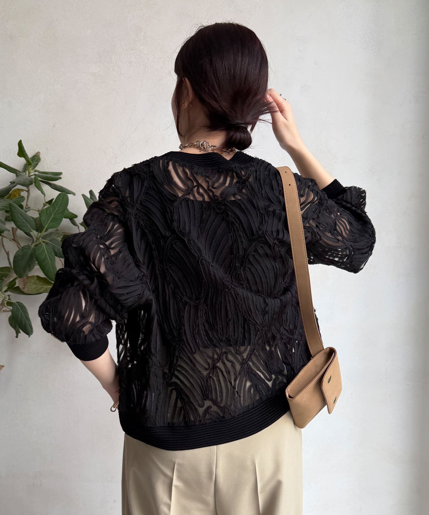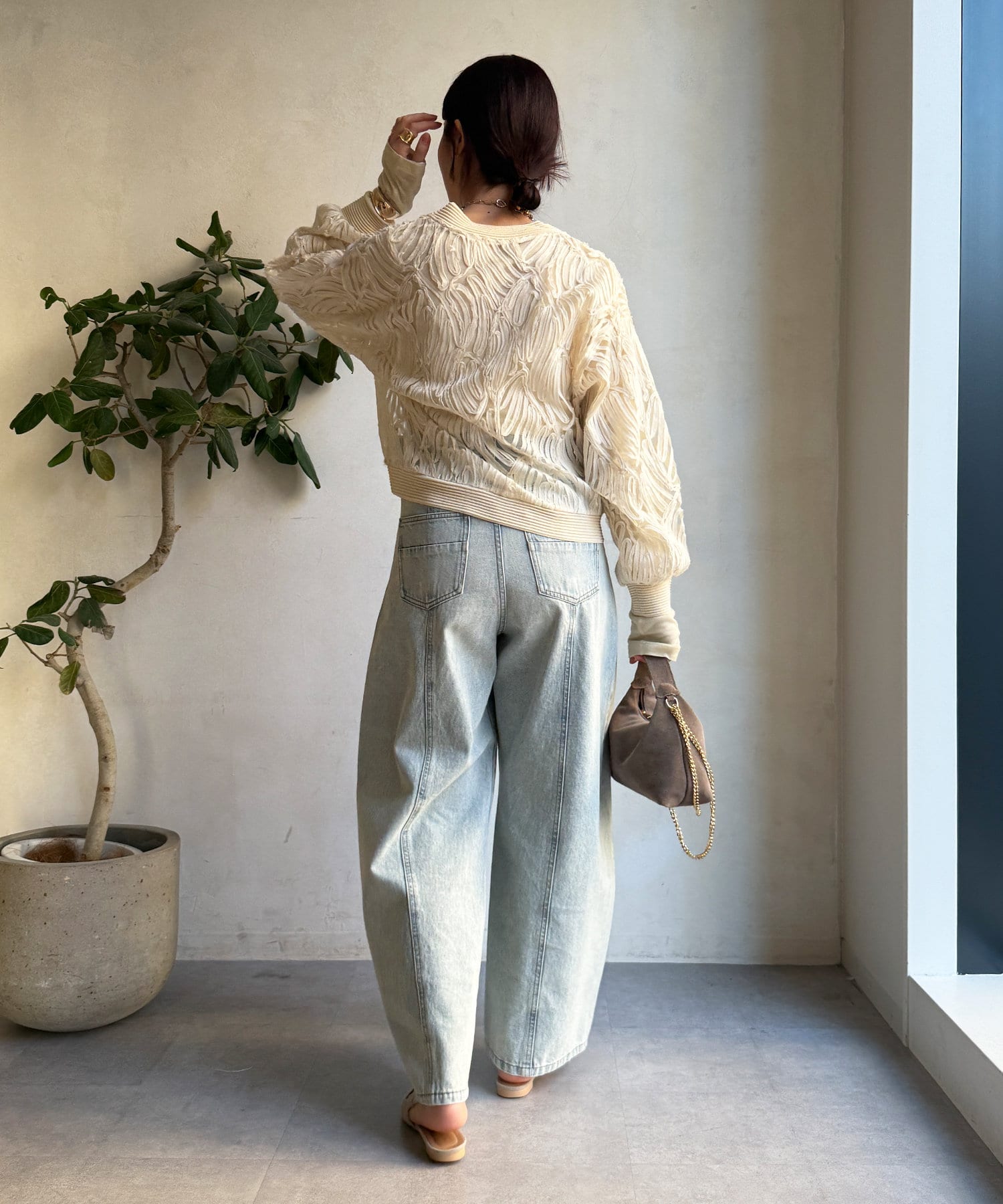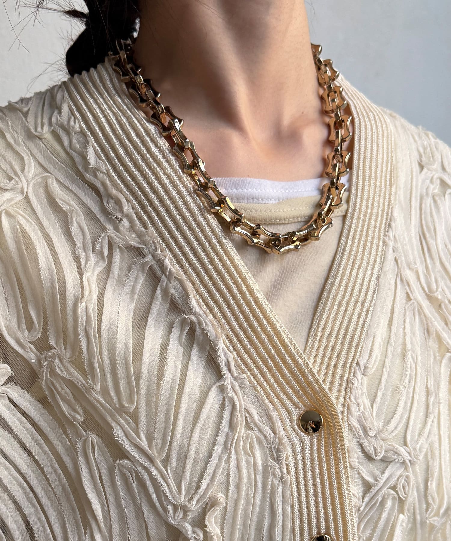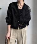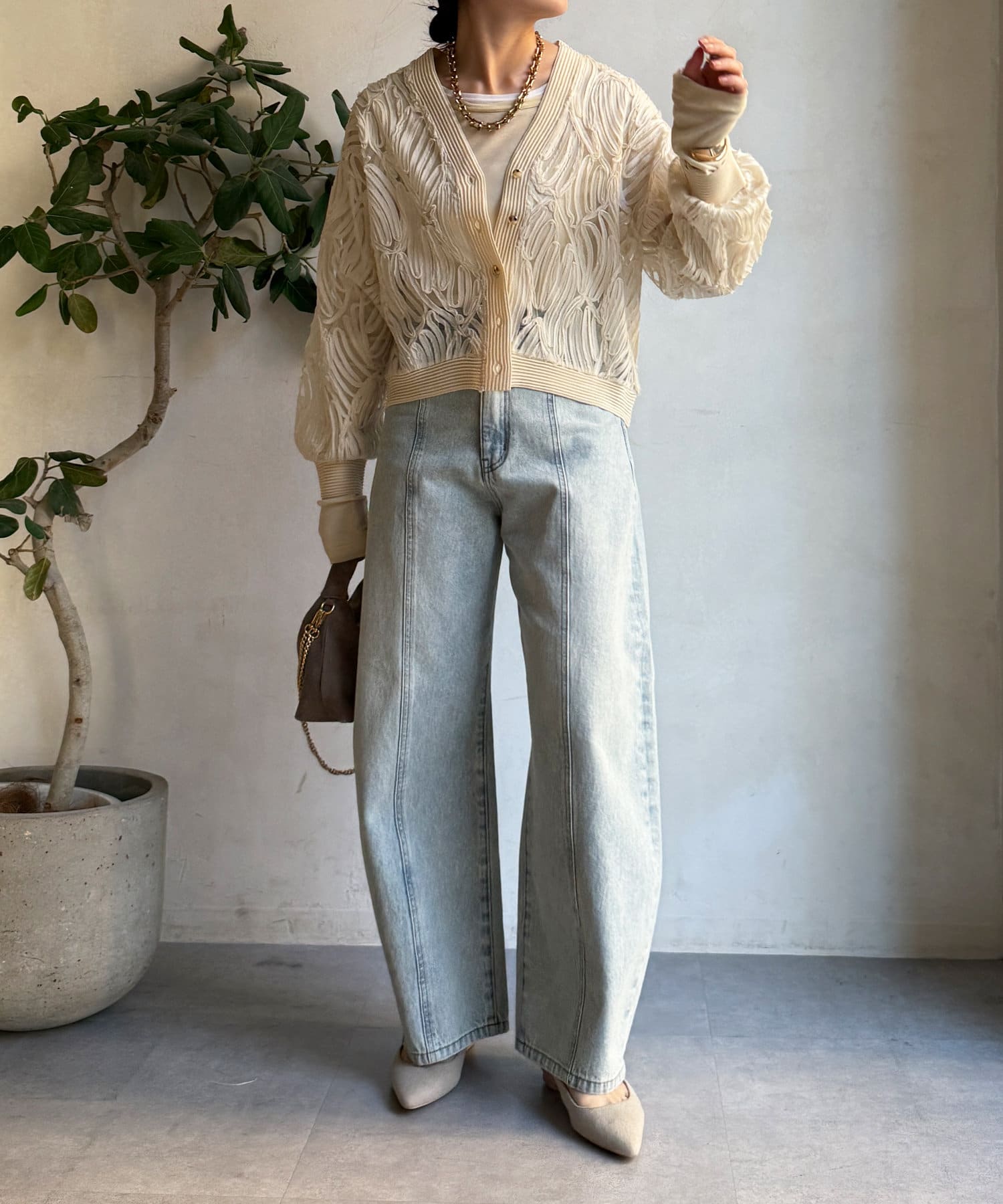 スタイリングを華やかに見せてくれる凹凸感のあるデザインのカーディガン。