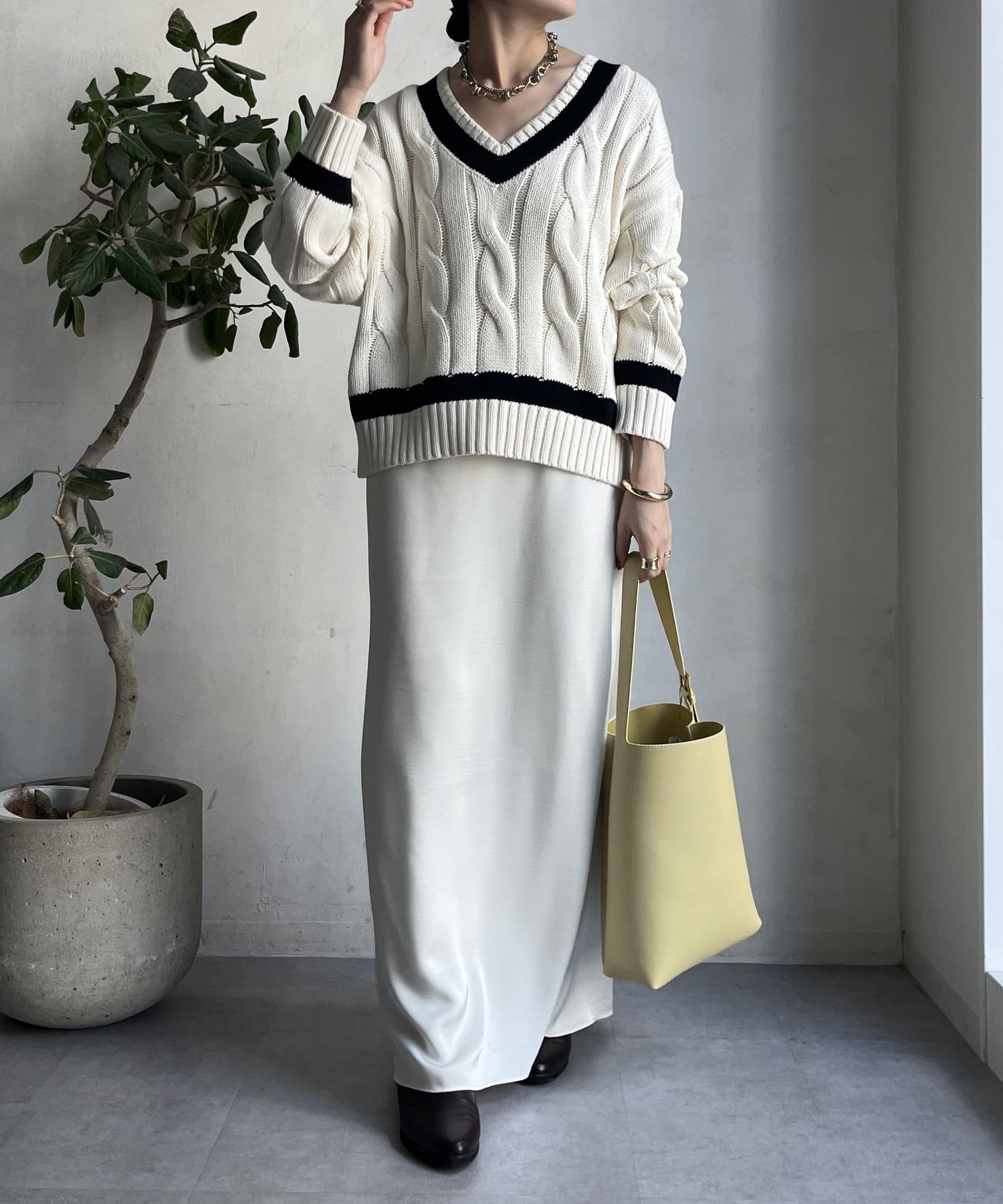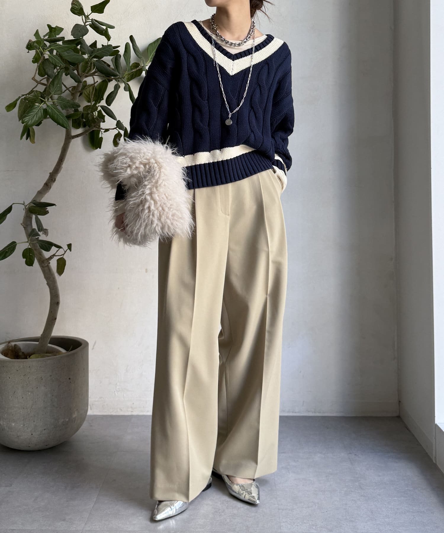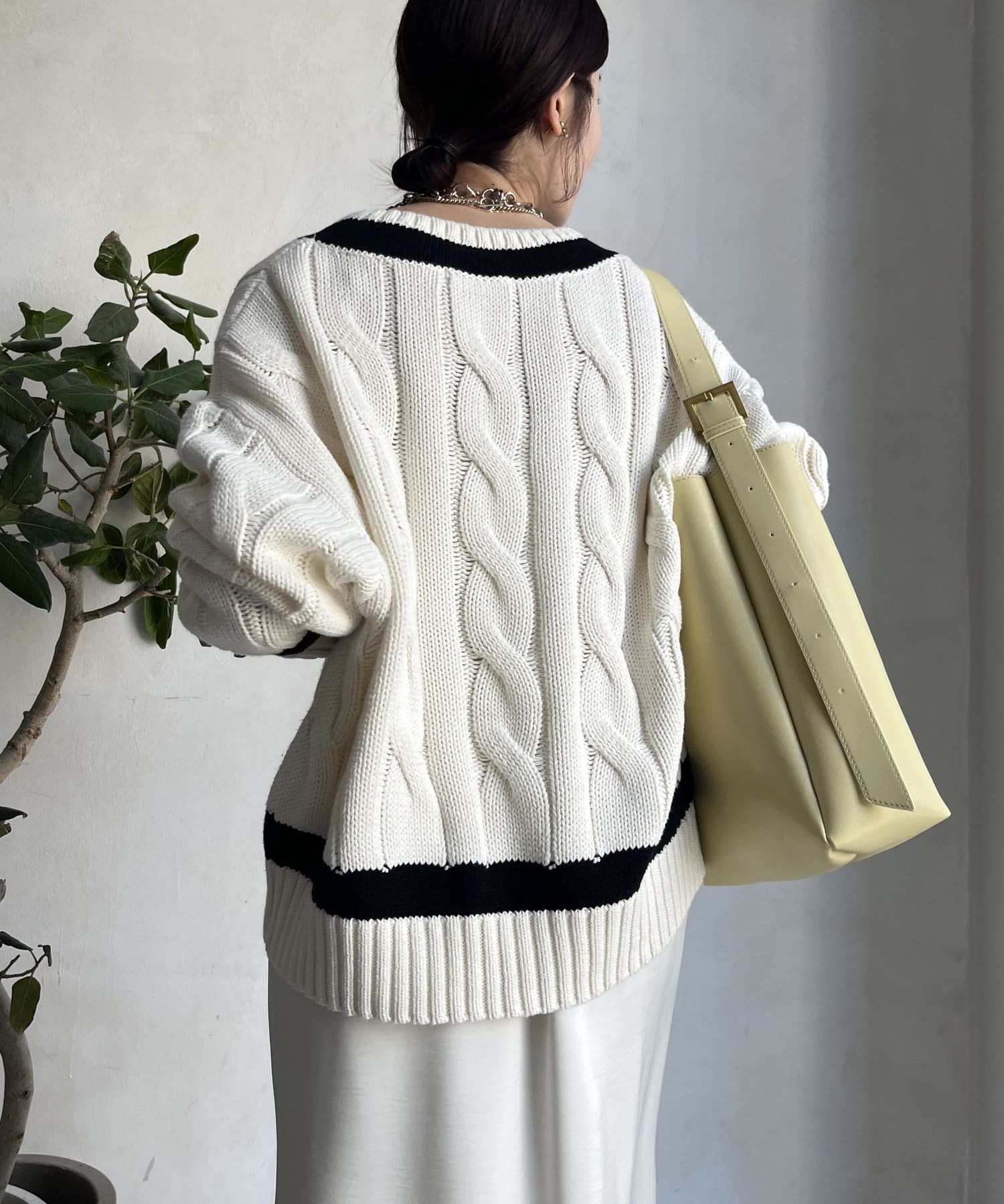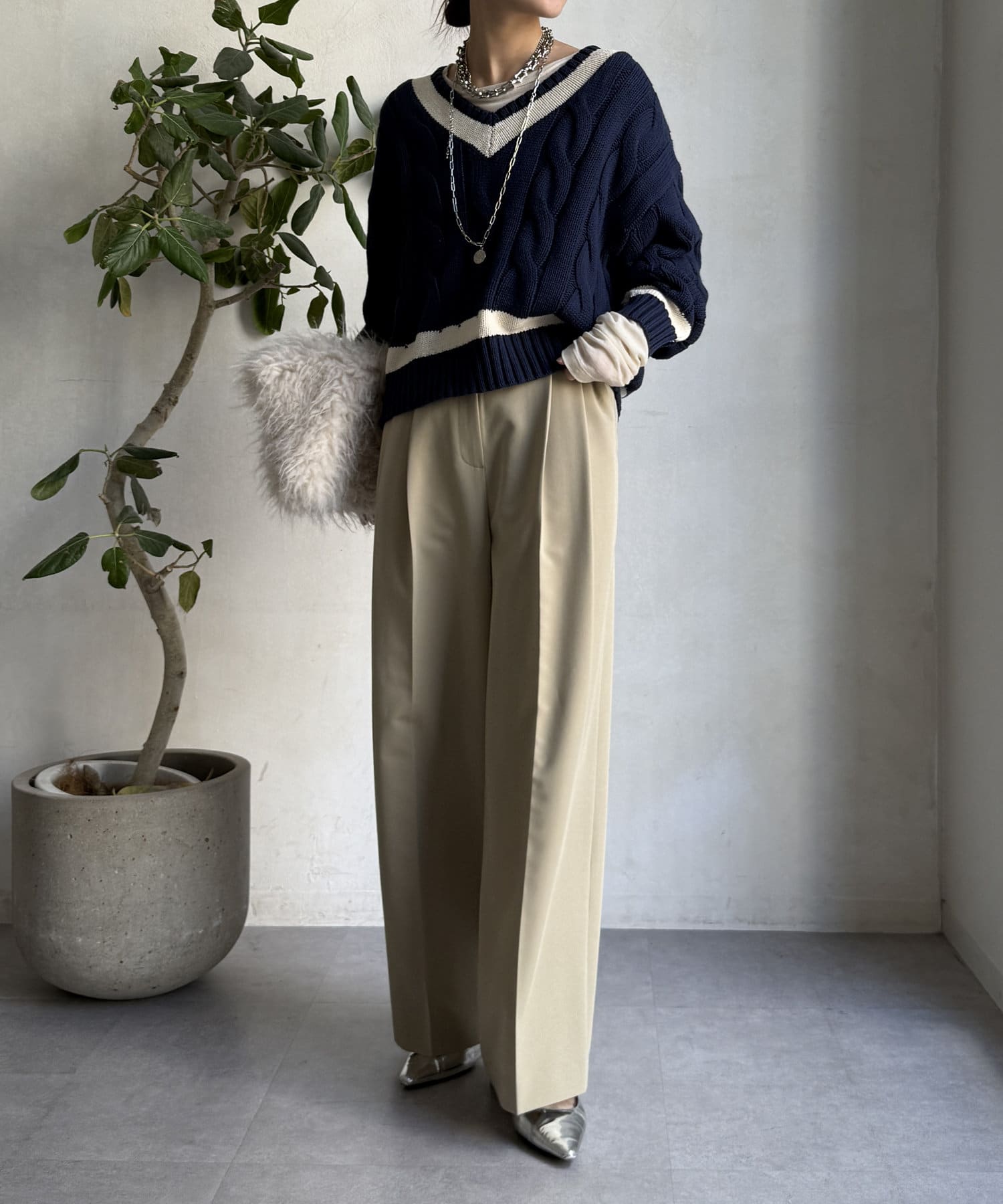 TOP > DOUDOU > レディース > トップス > ニット/セーター > 【WEB限定】配色ケーブル編みVプルオーバー