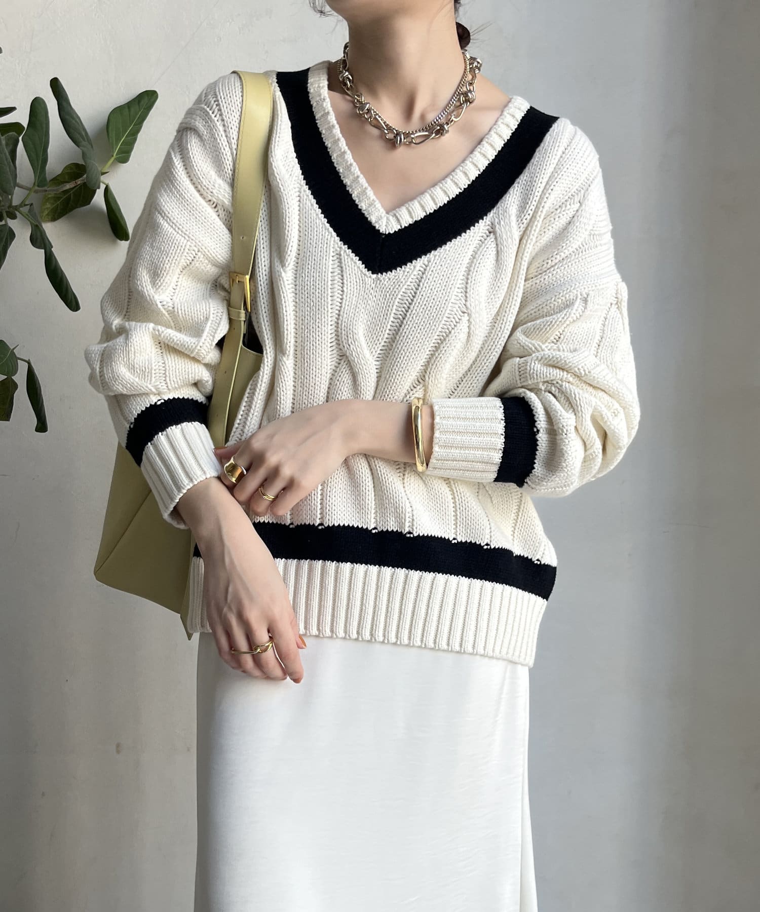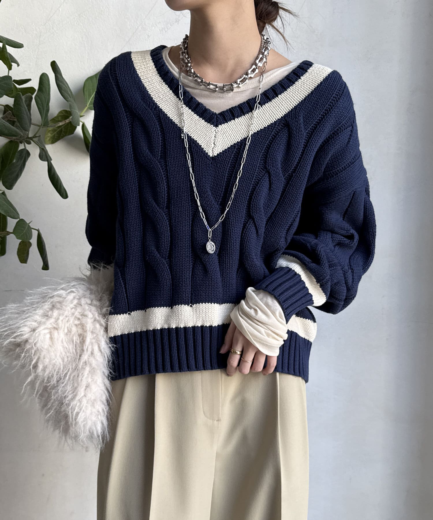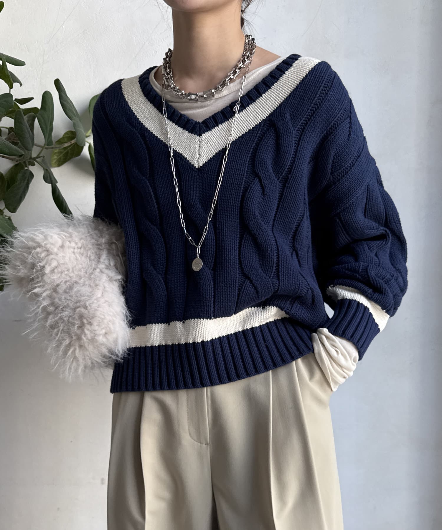 DOUDOU(ドゥドゥ) 【WEB限定】配色ケーブル編みVプルオーバー