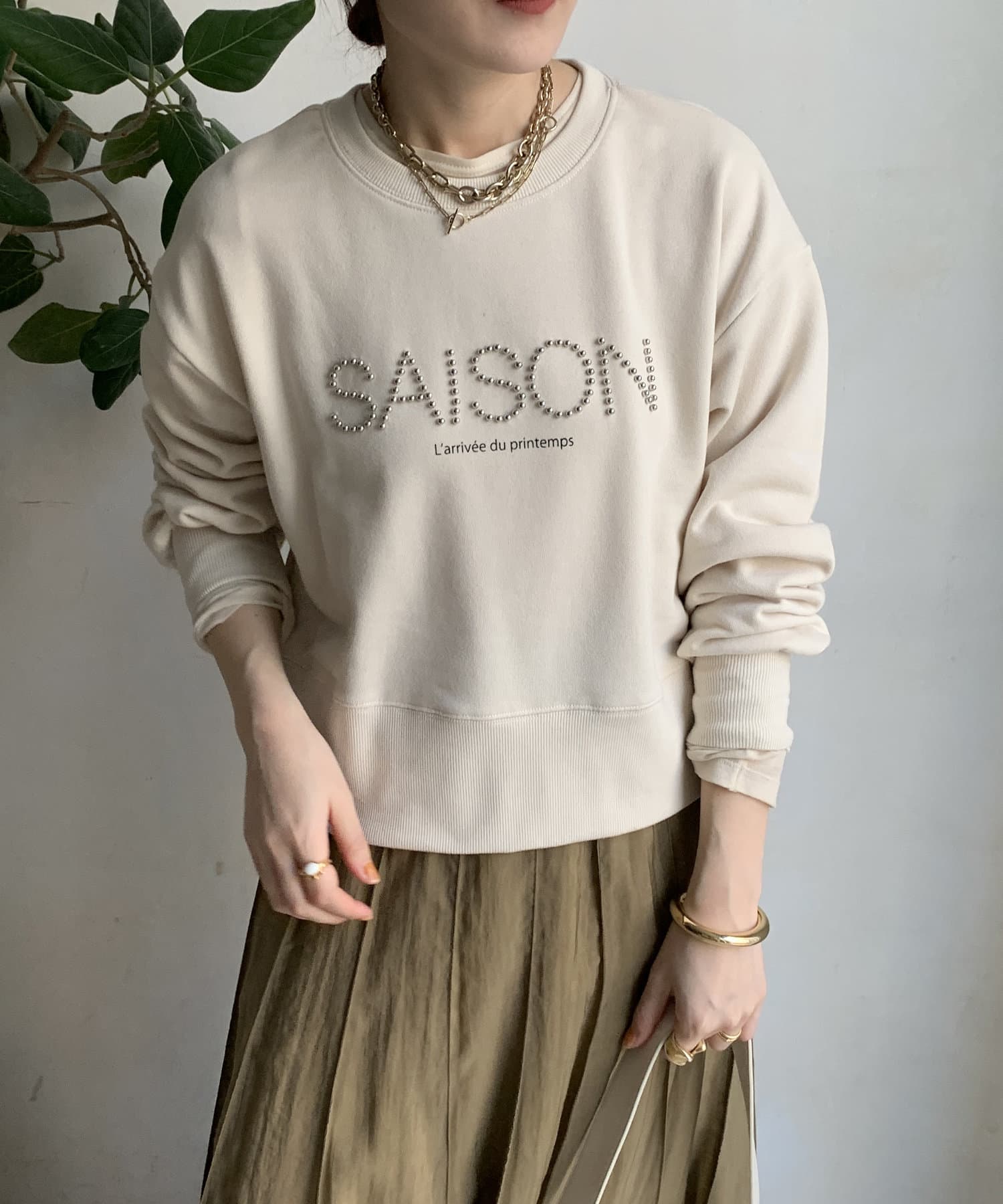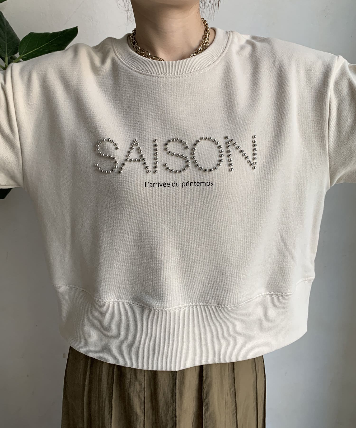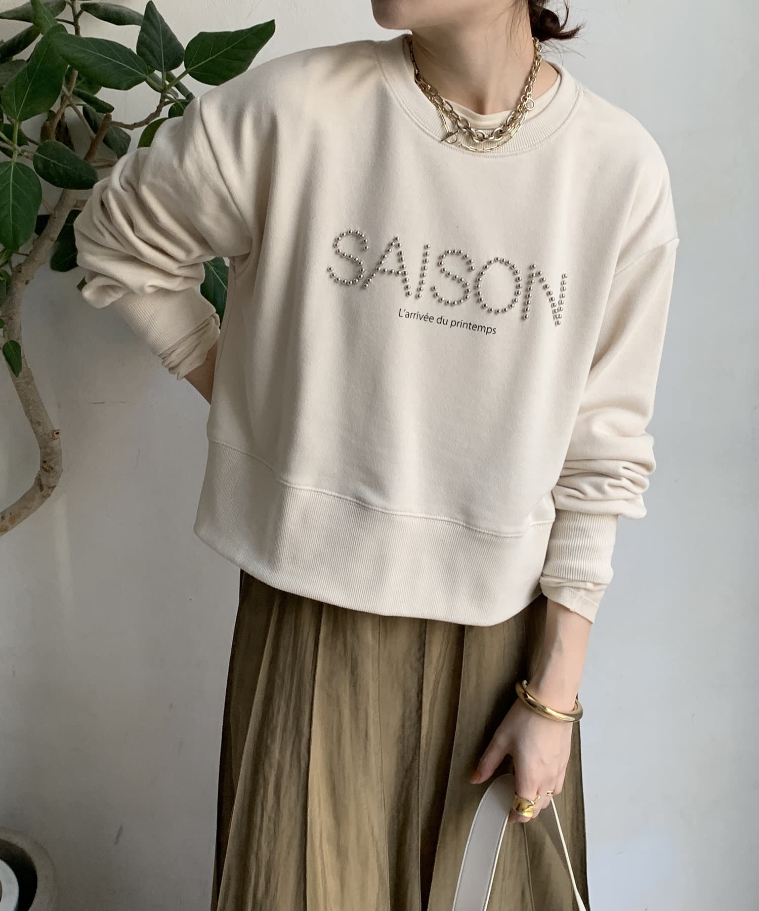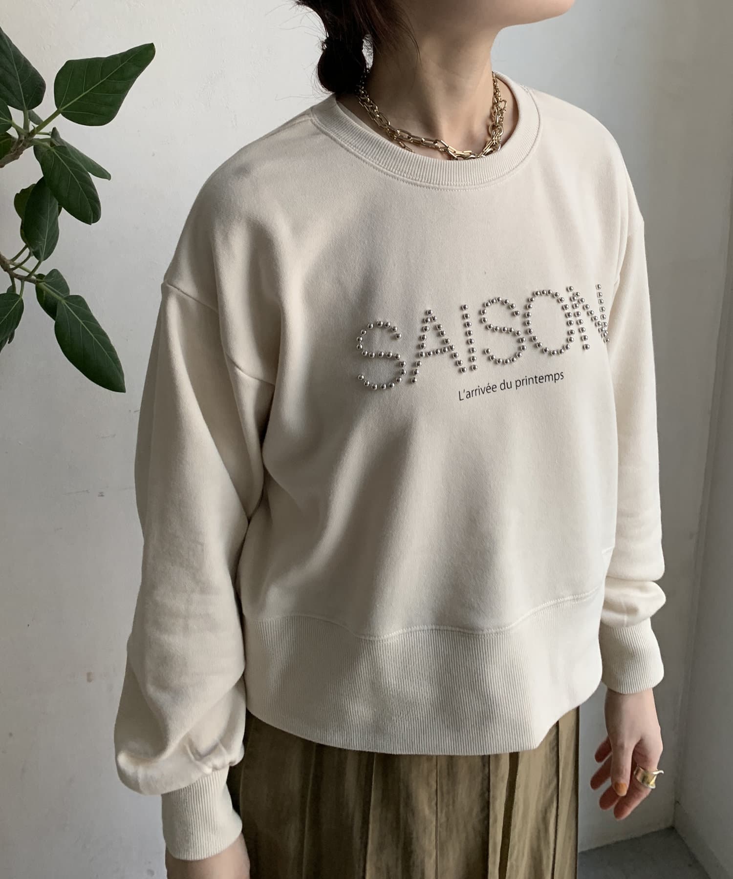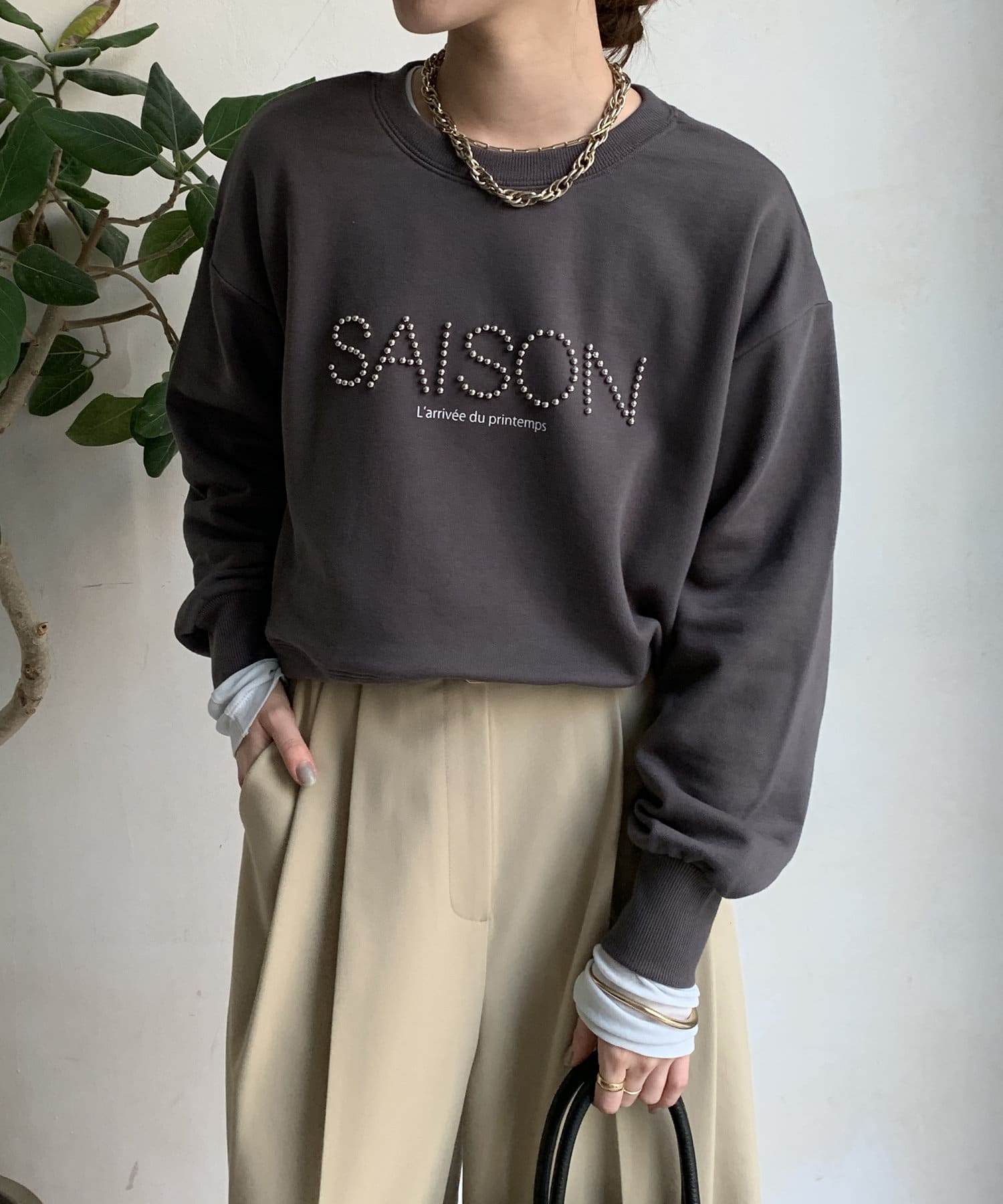 細かいスタッズが上品なロゴを飾ってくれるので、カジュアルになりすぎない1枚