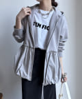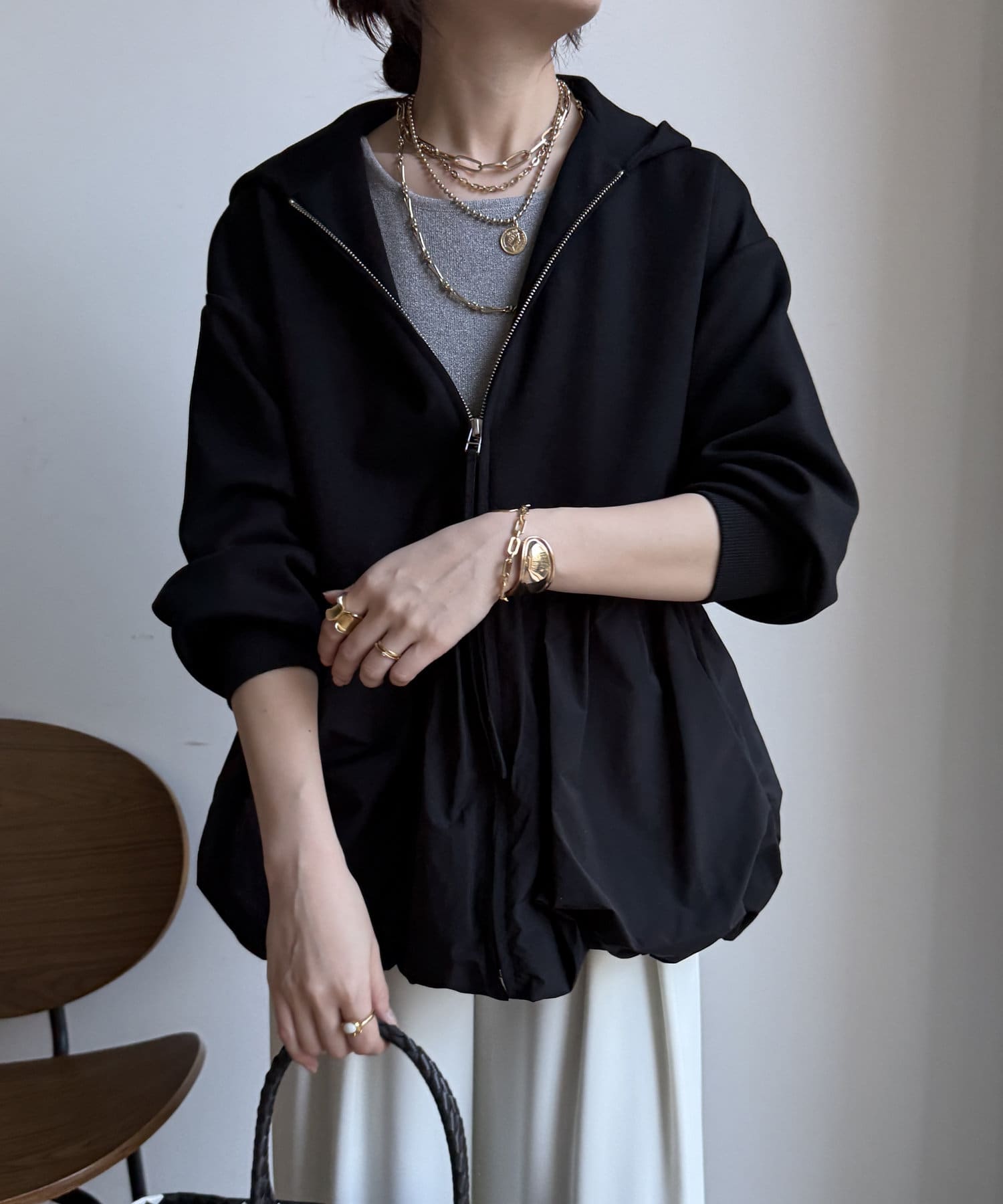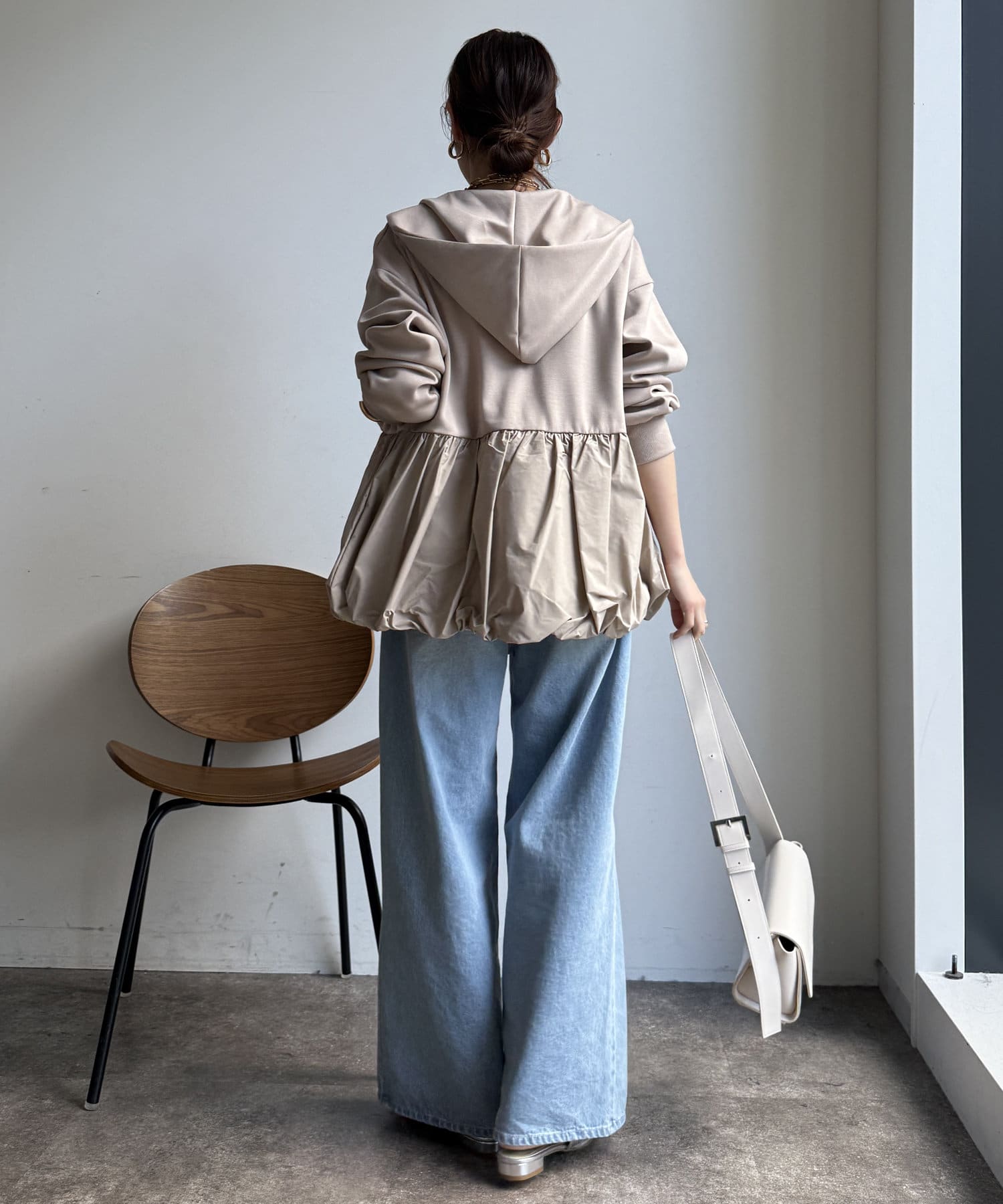 丸みと立体感のあるシルエットとフードがアクセントになり、カジュアルになりすぎない