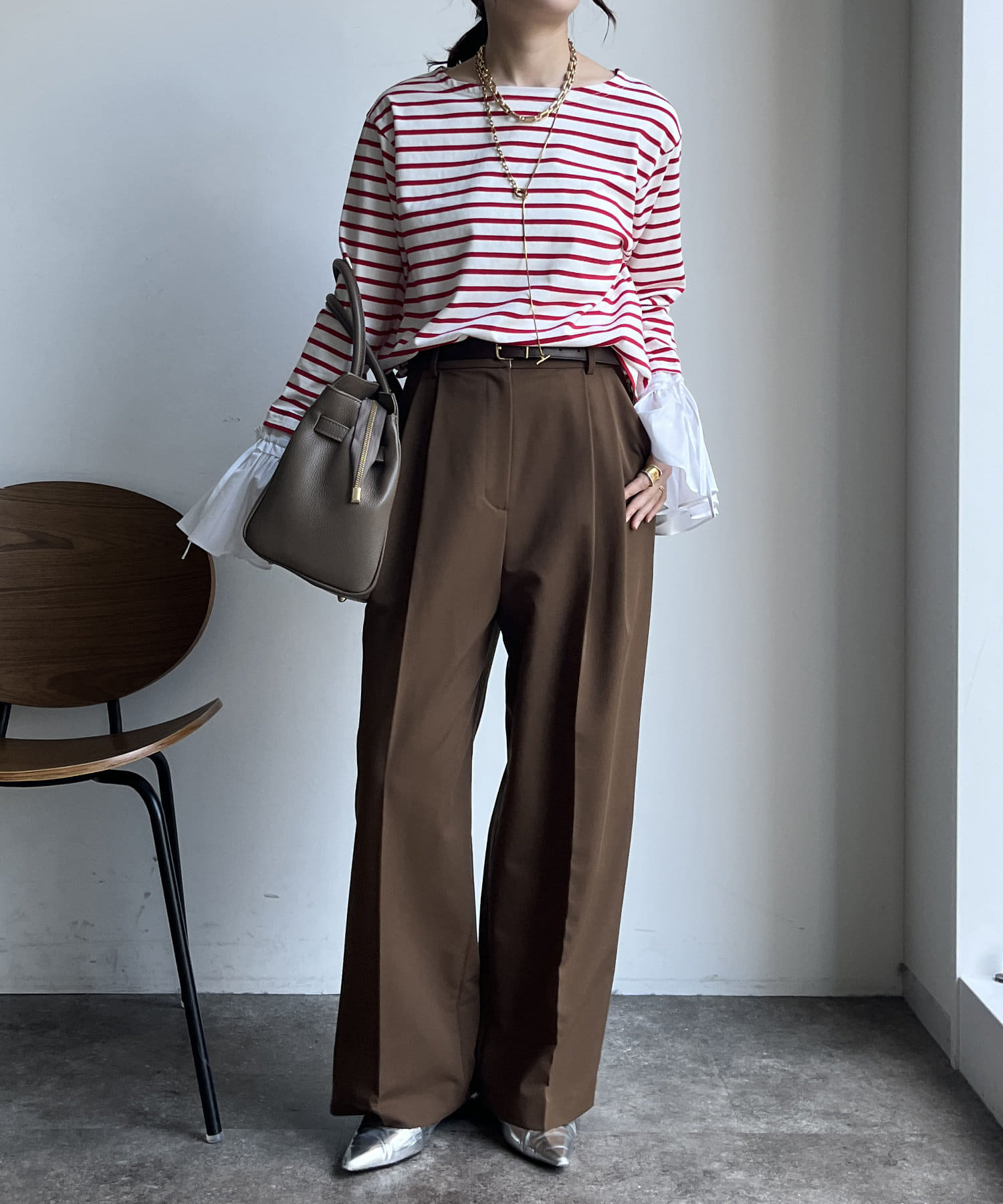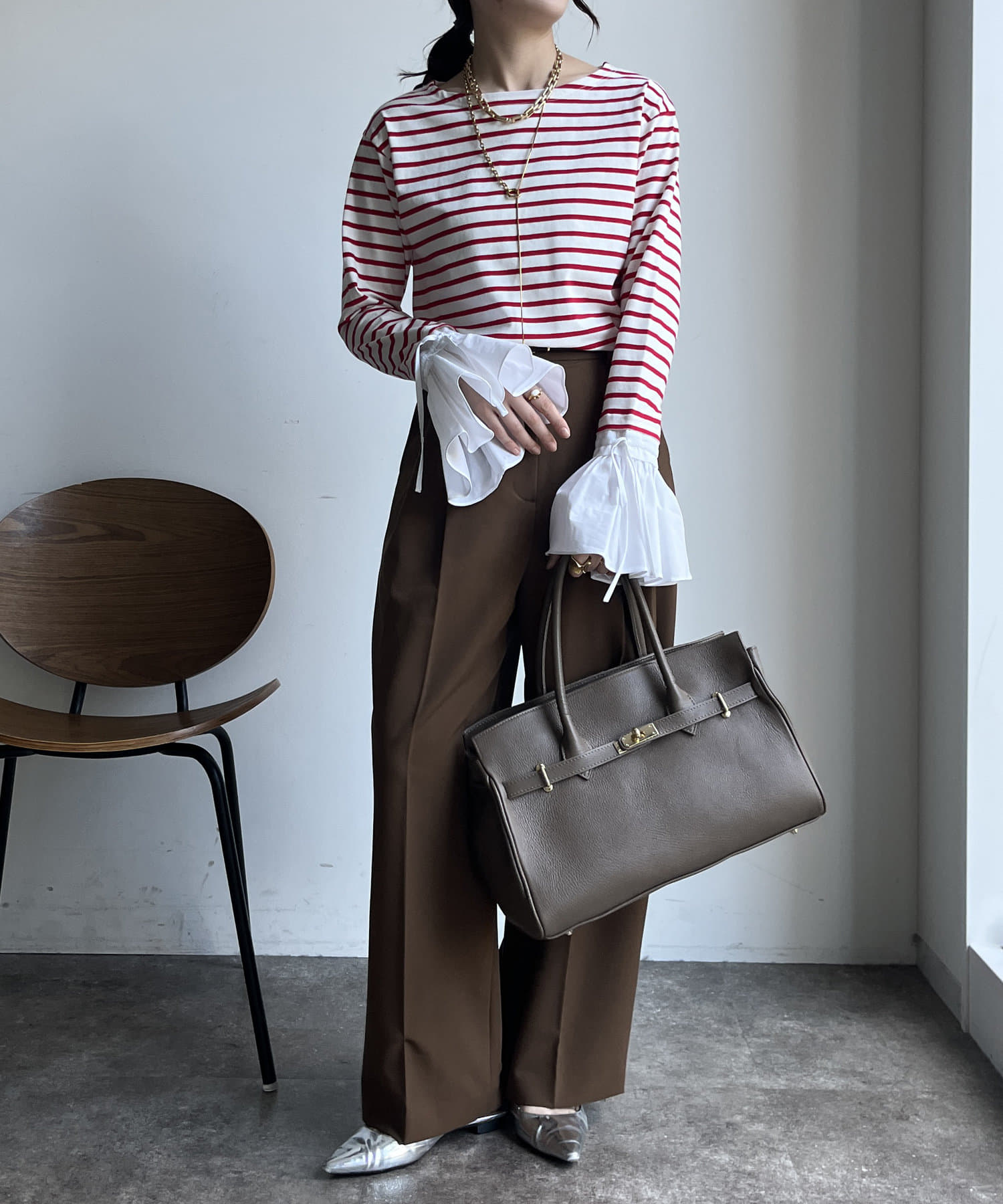 ジャケットやニットと重ね着して、袖口からたっぷりのフレアを出すコーディネートがオススメです。