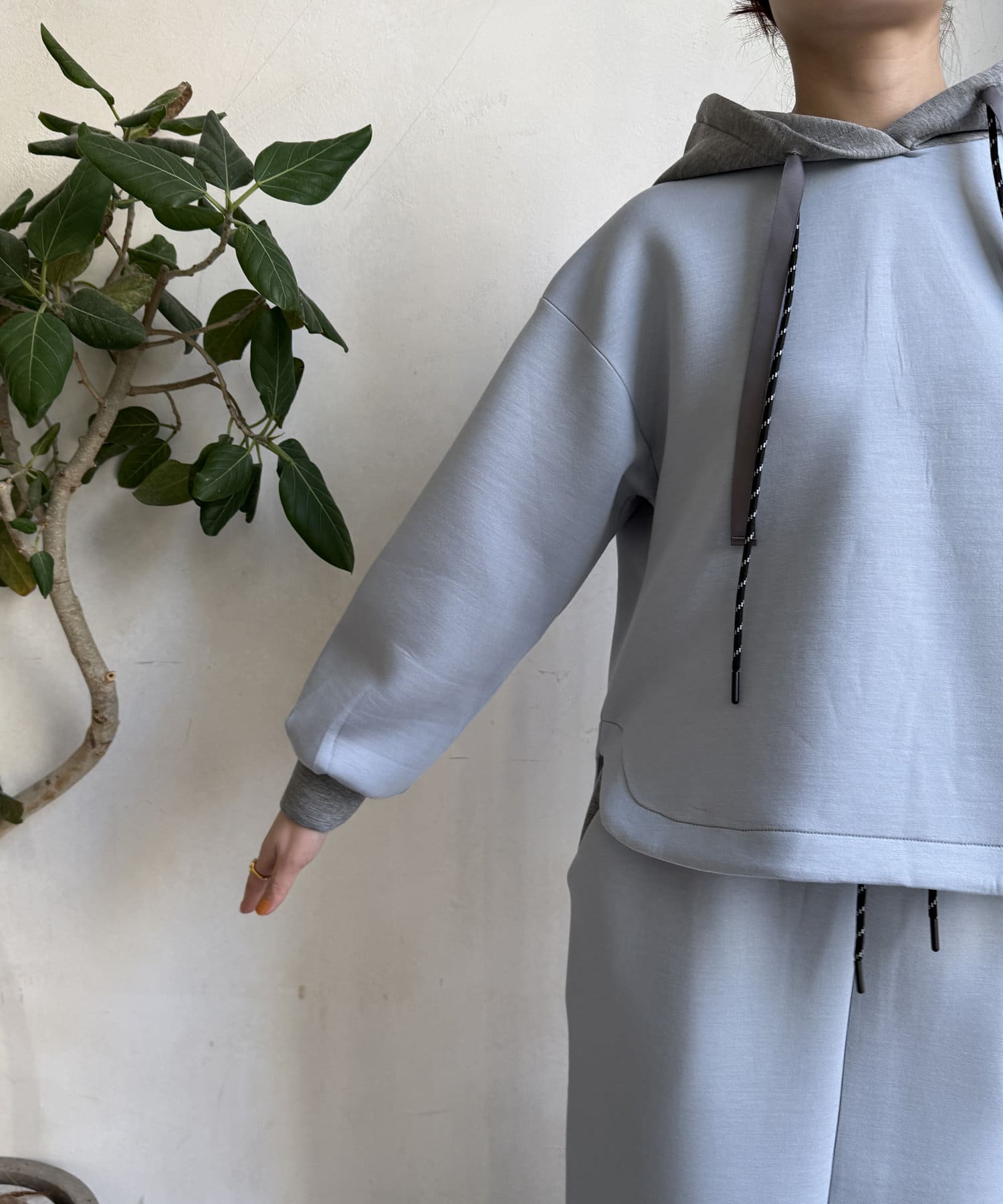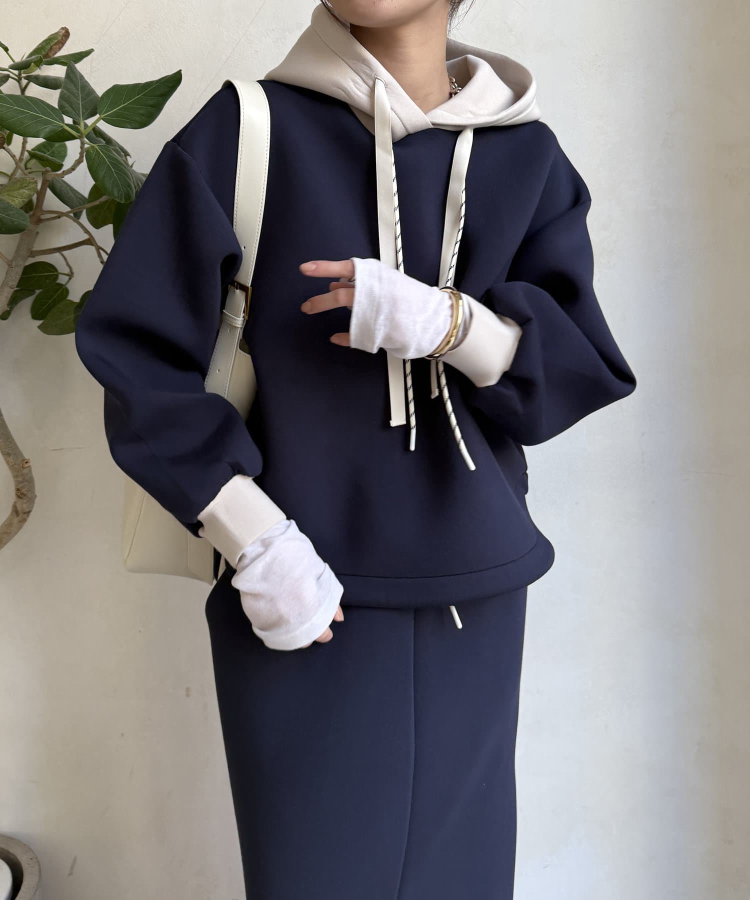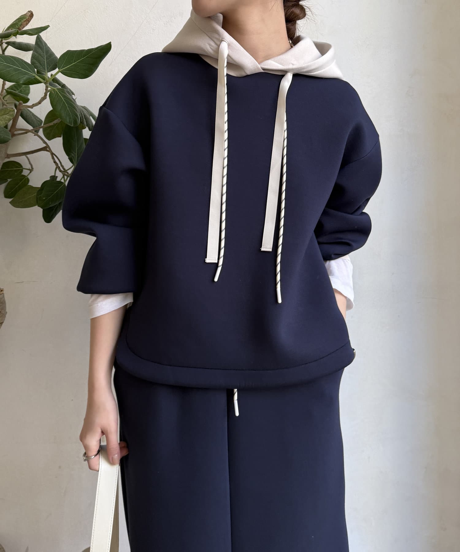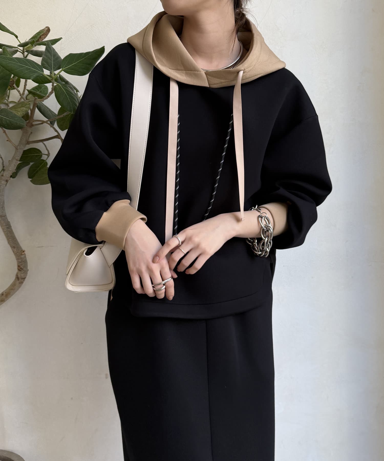 バイカラーディテールが新鮮なパーカー