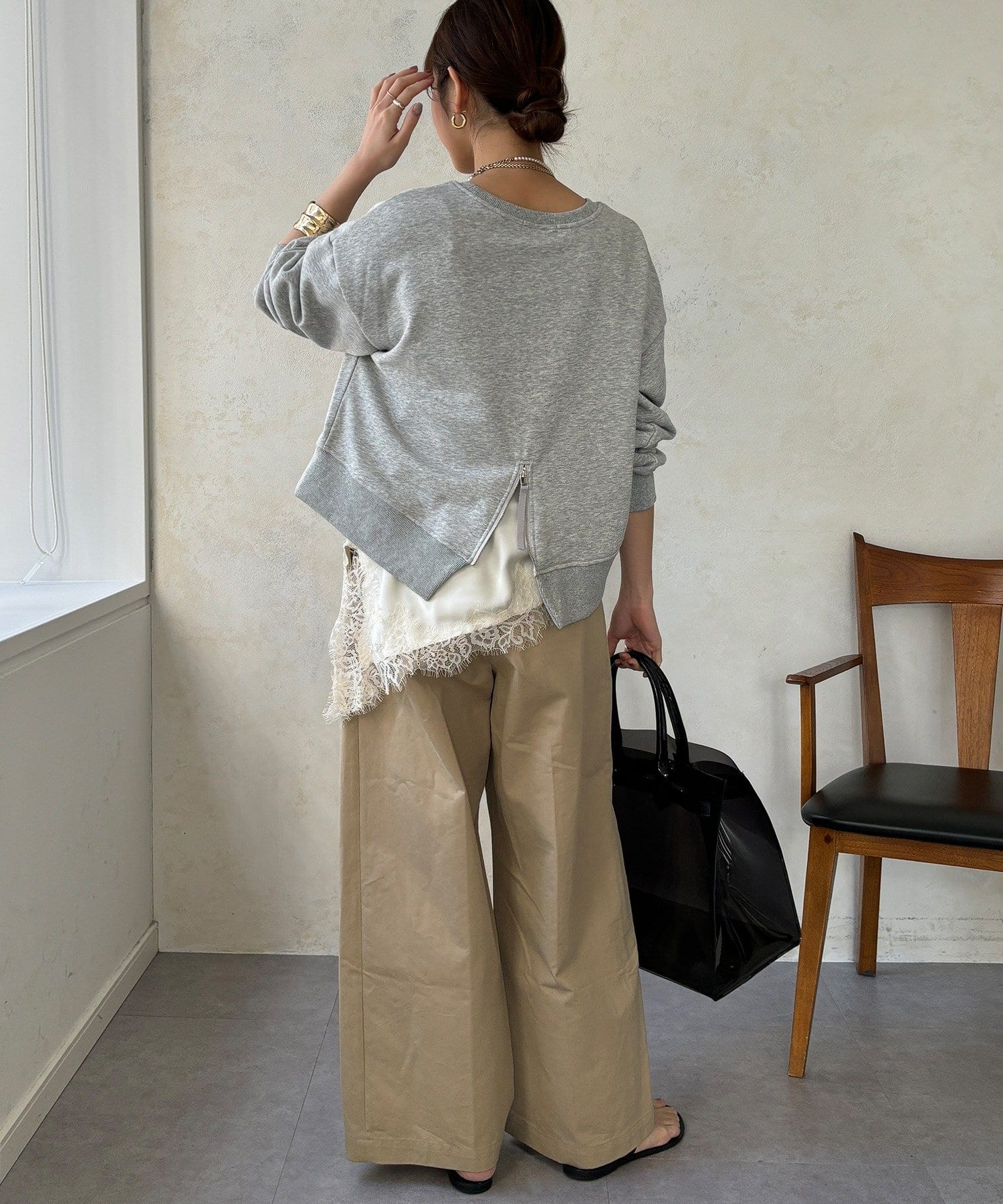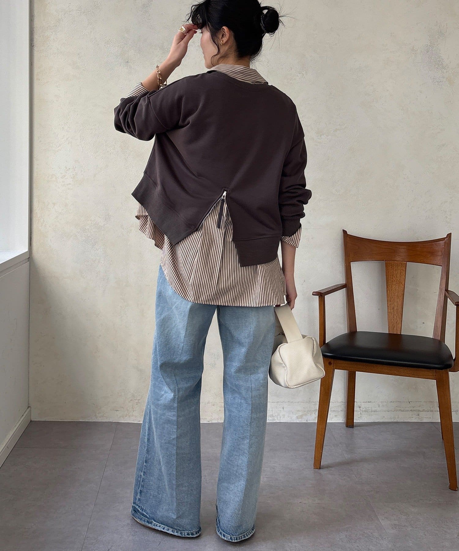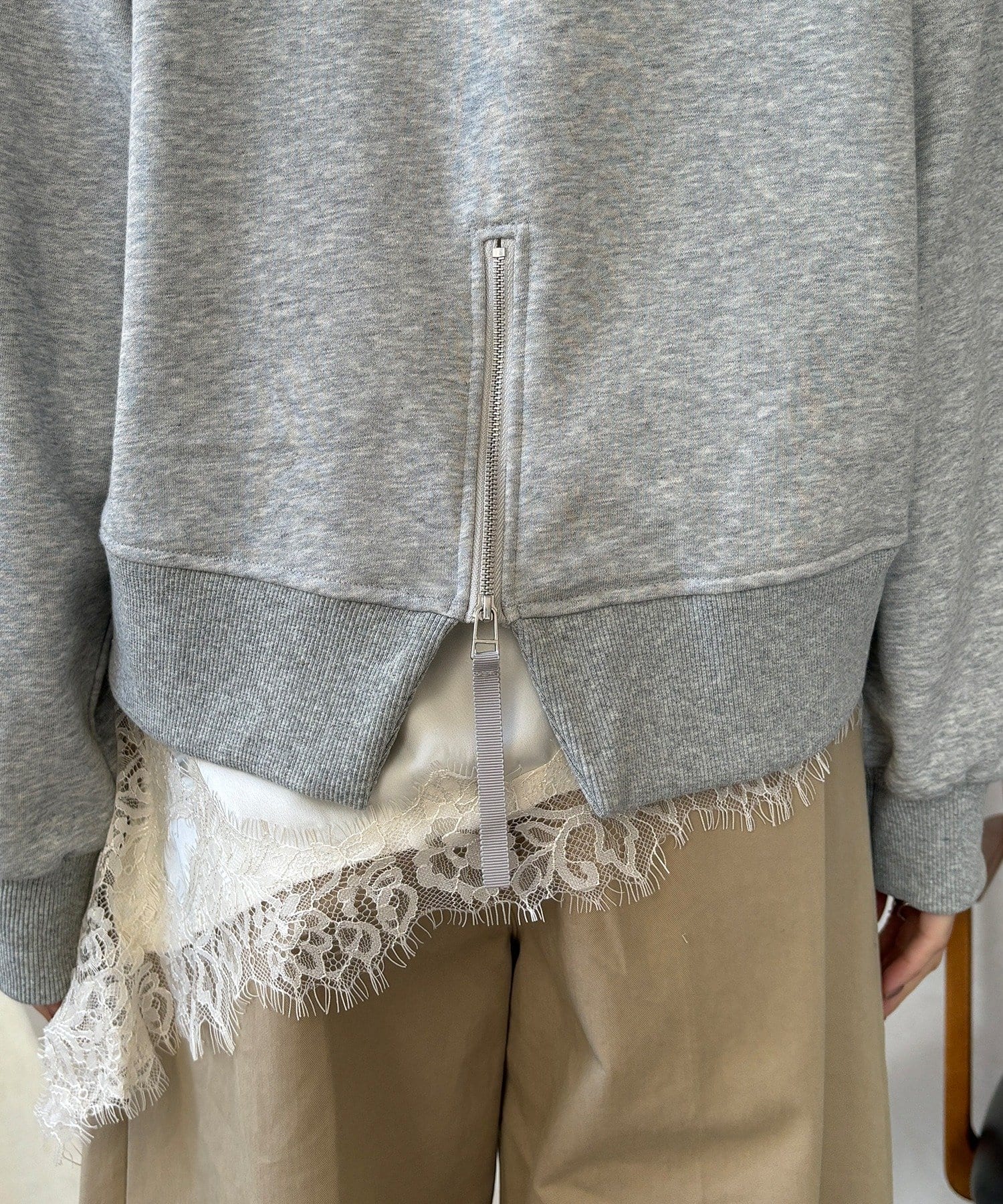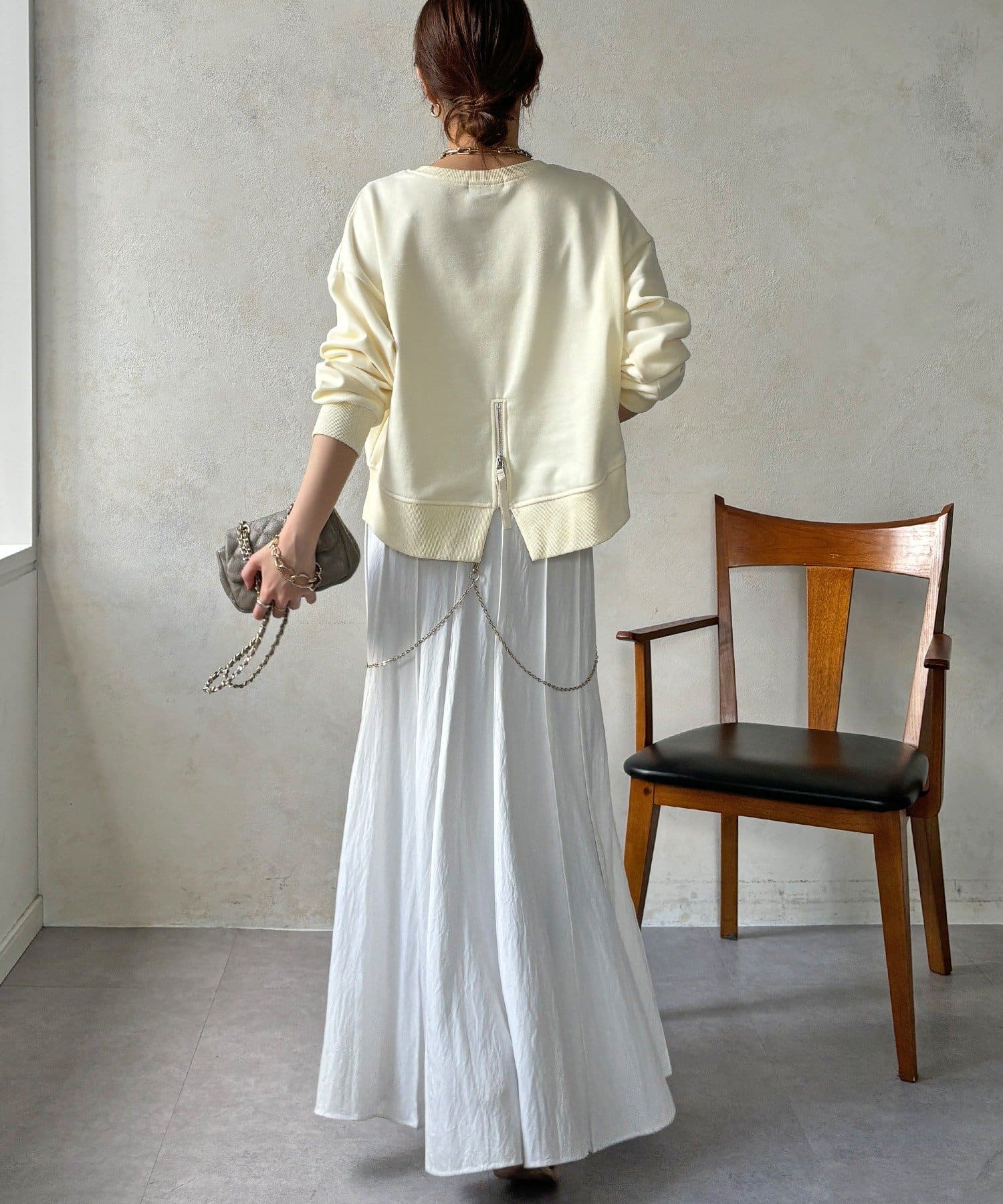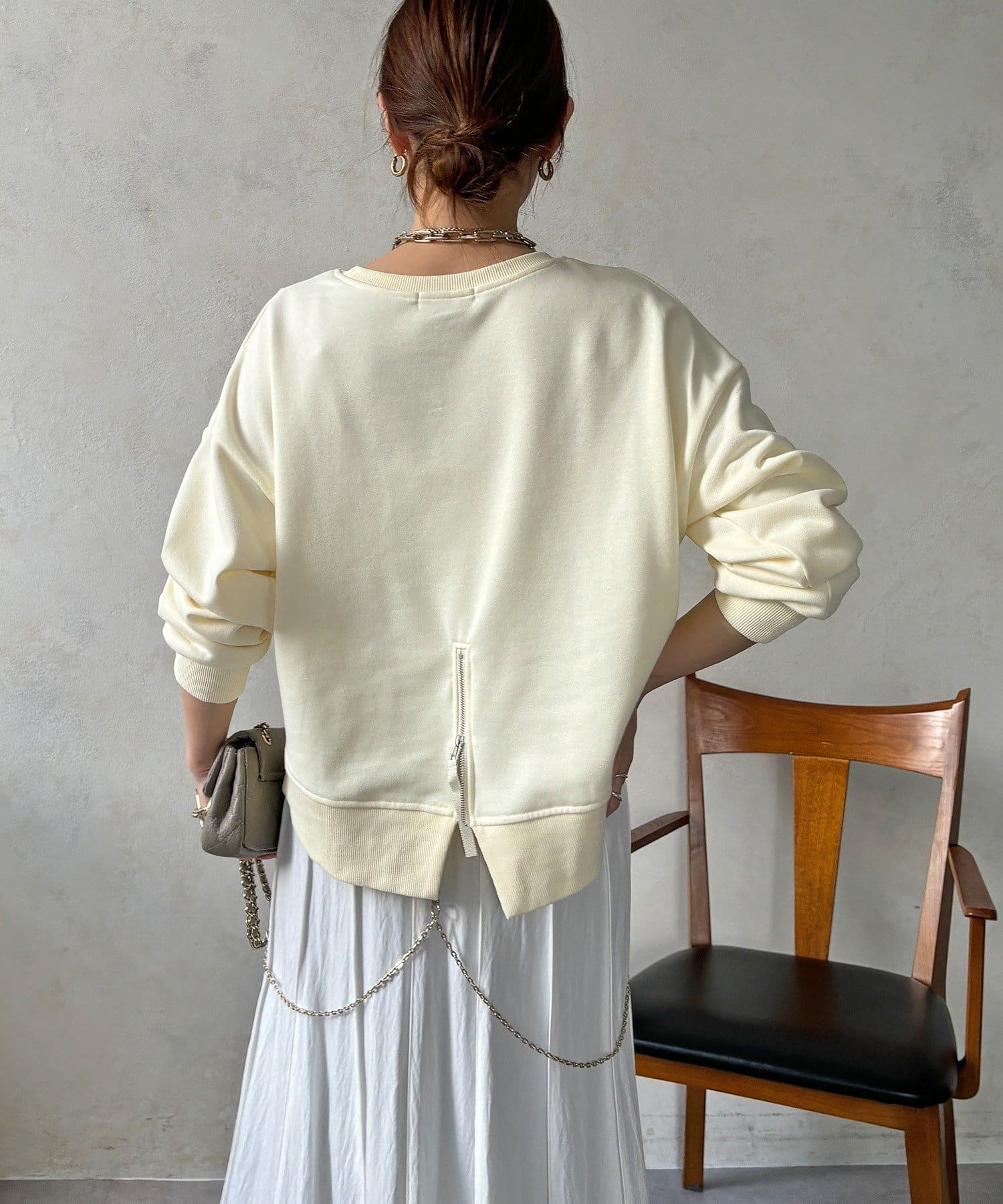 後ろにはジップが施されているので、後ろ姿までしっかりとおしゃれに◎