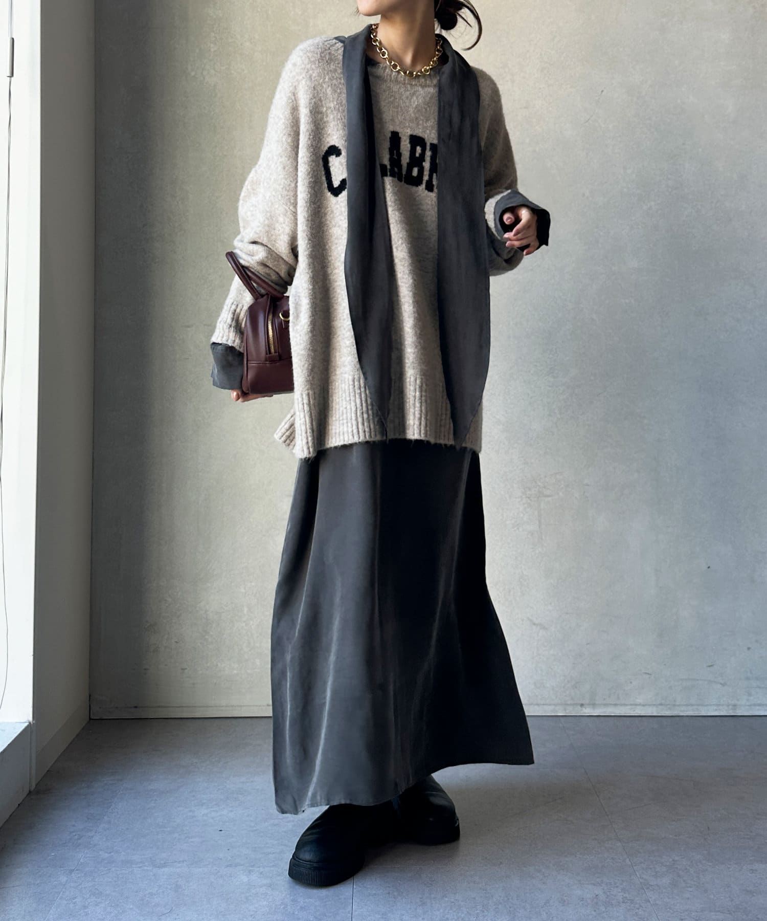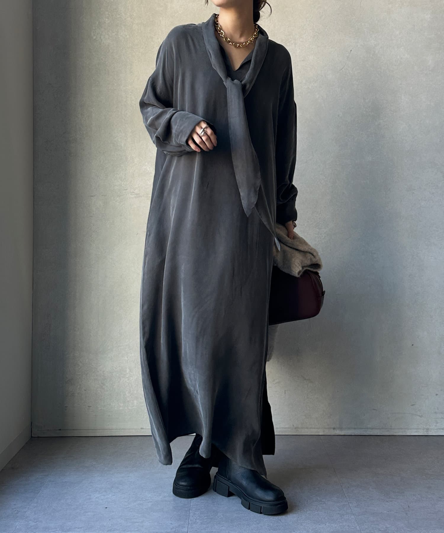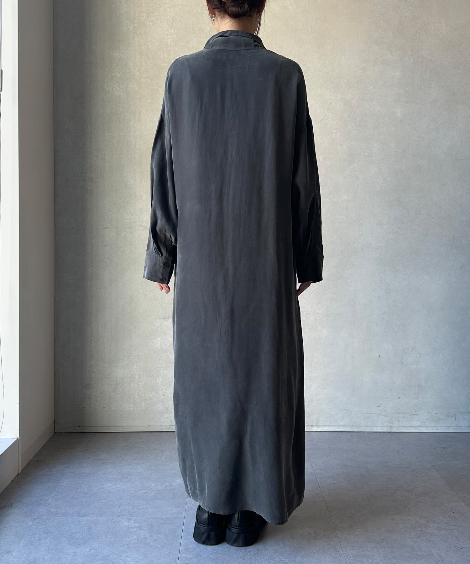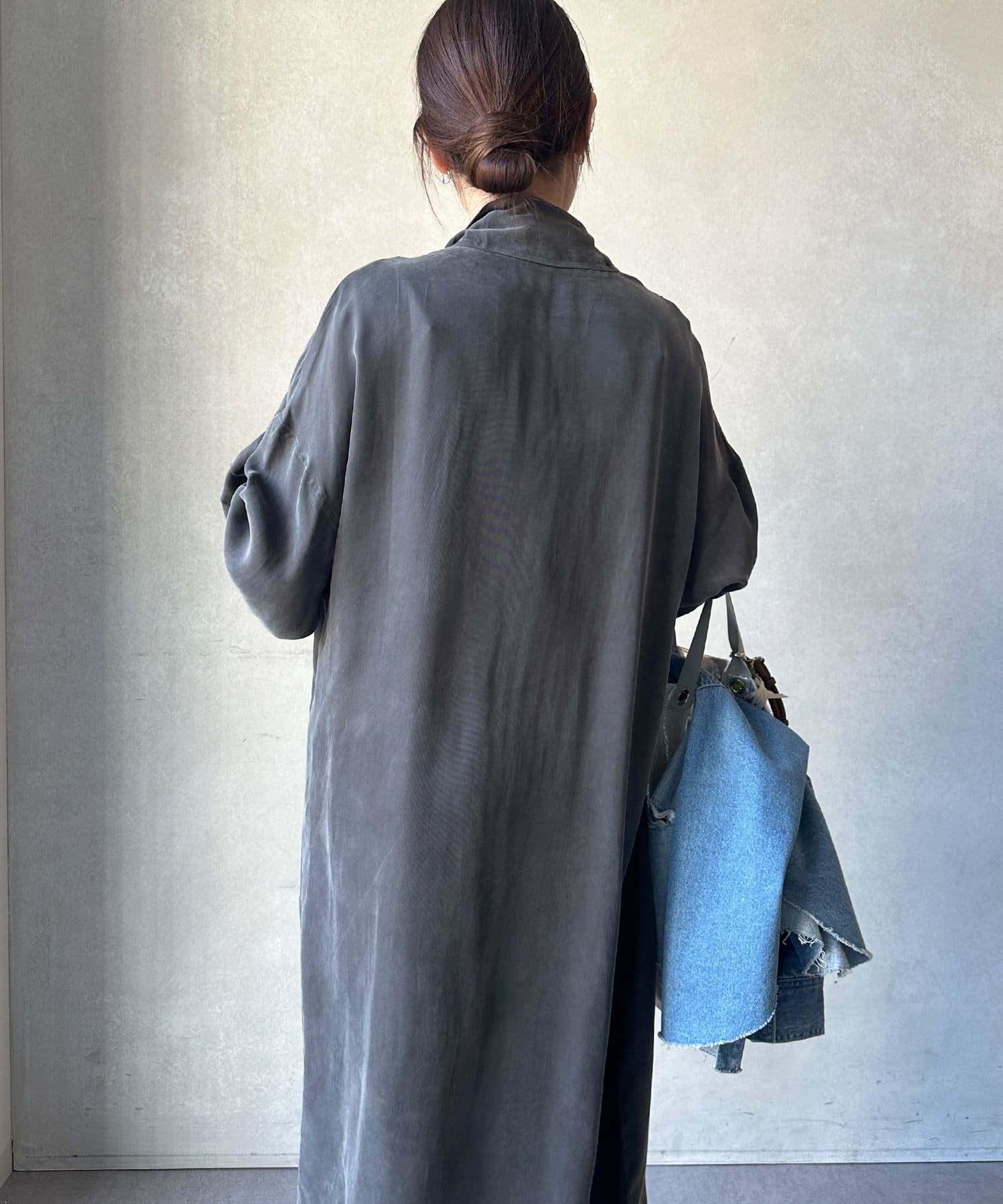 ロング丈で体型もすっぽりカバーしながらも、キュプラ混の落ち感ある素材で広がりすぎずに着ていただけます。