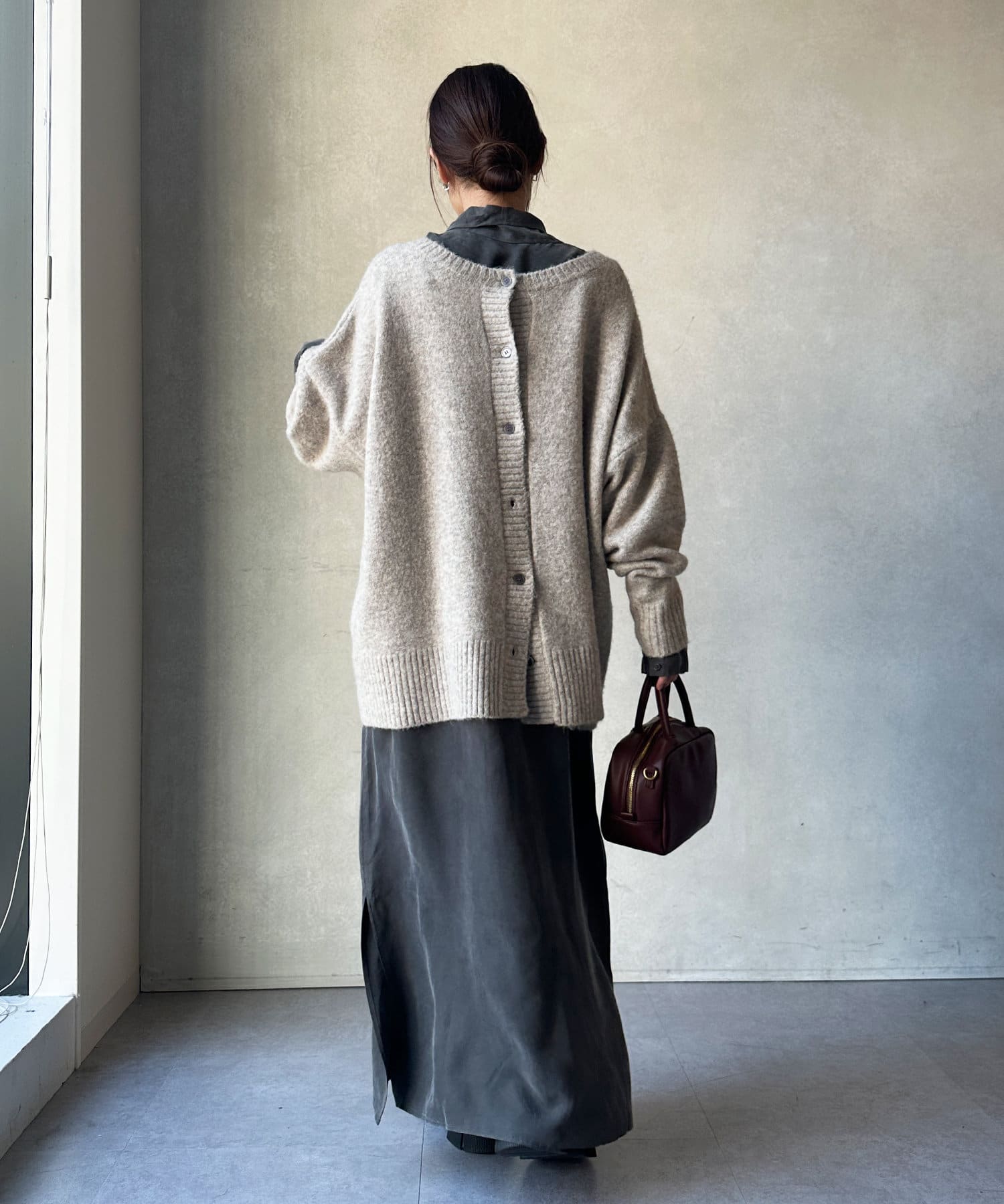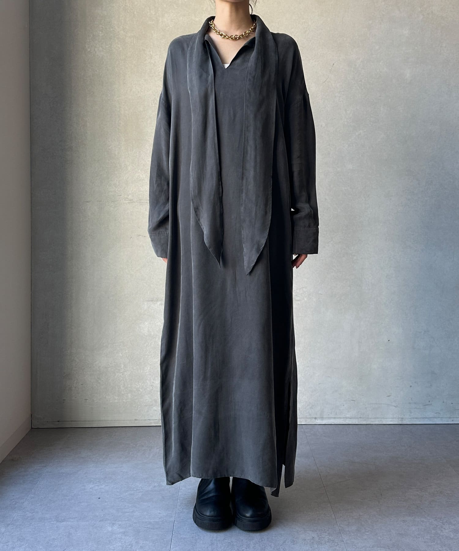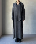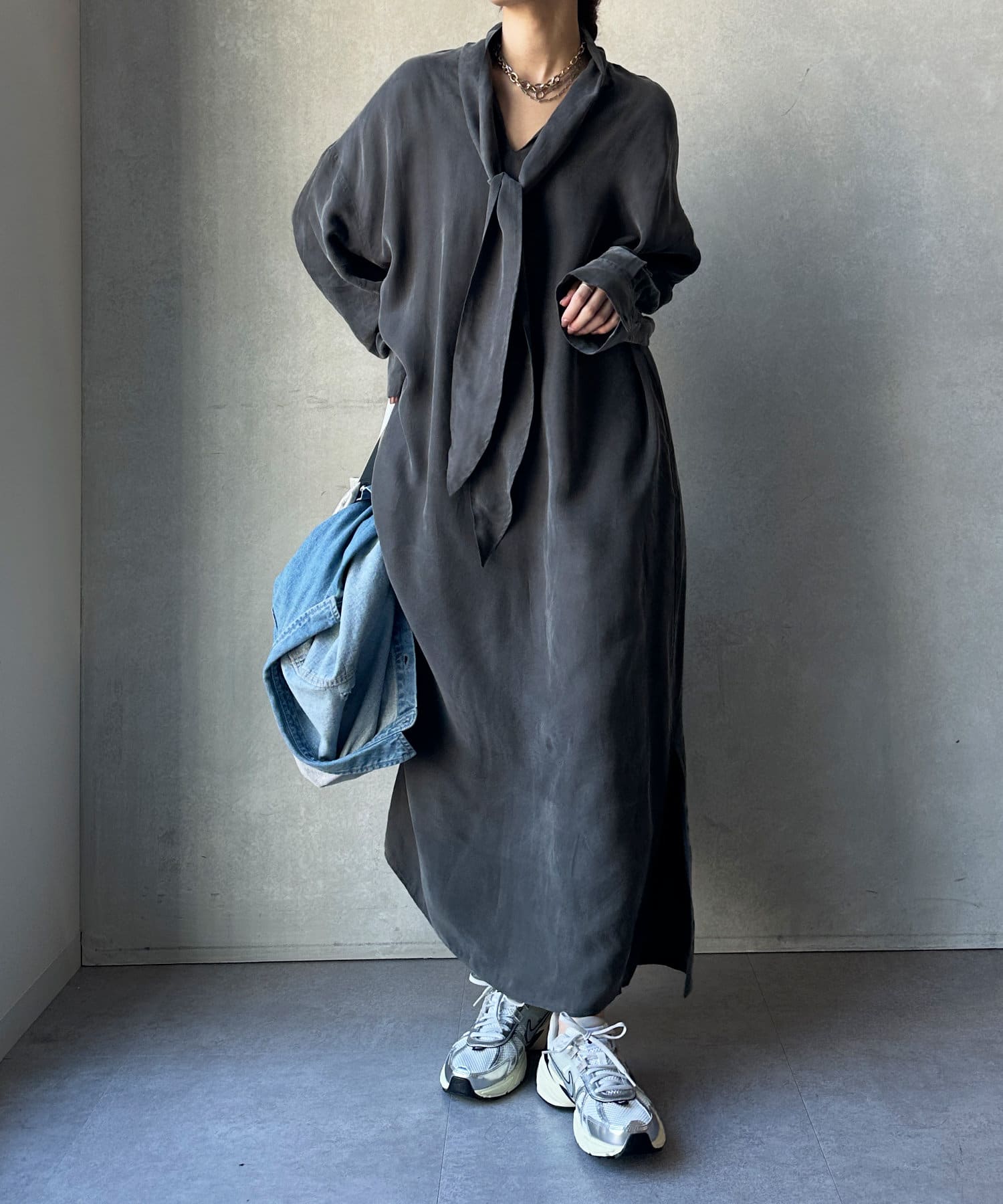 ロング丈で体型もすっぽりカバーしながらも、キュプラ混の落ち感ある素材で広がりすぎずに着ていただけます。