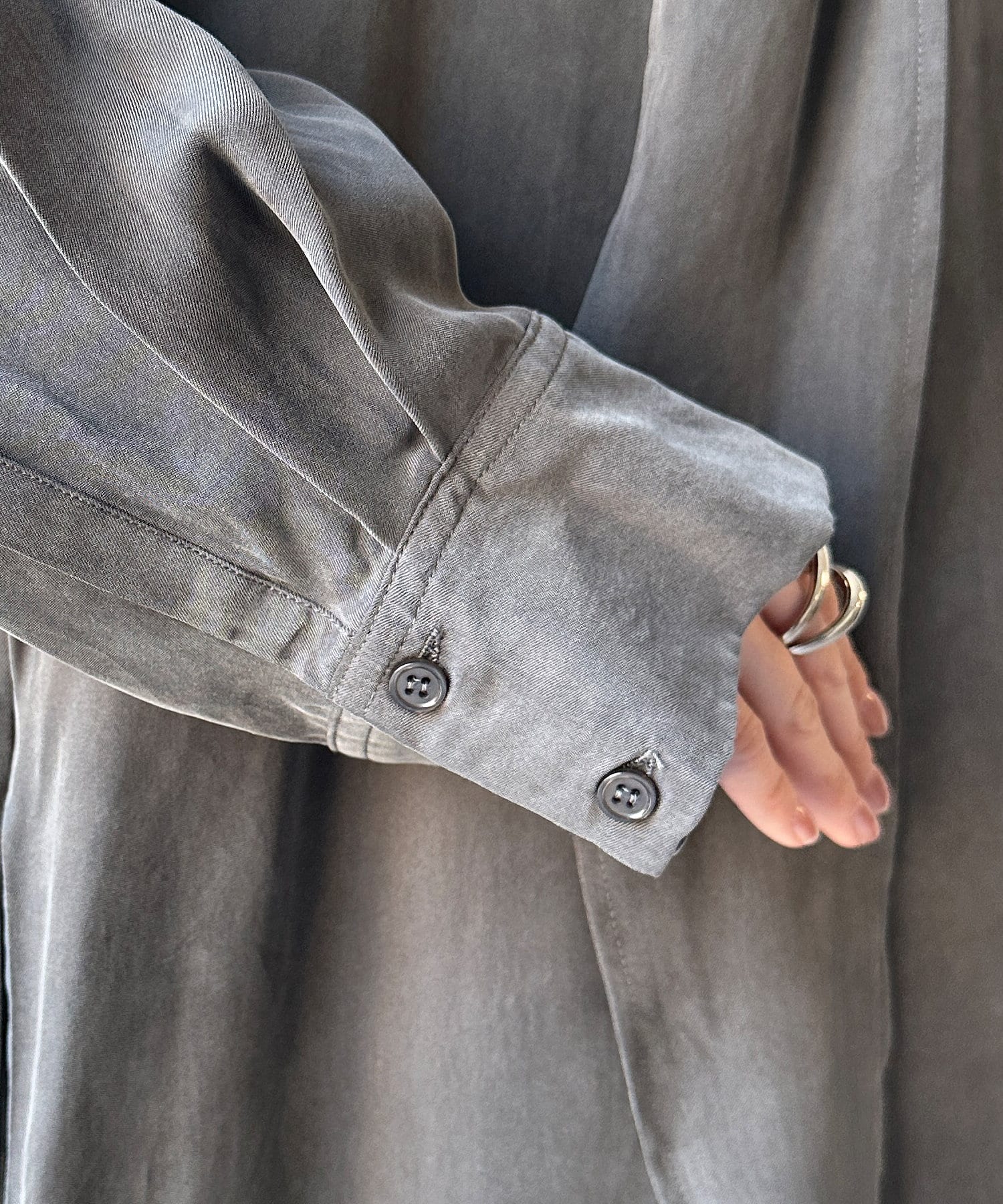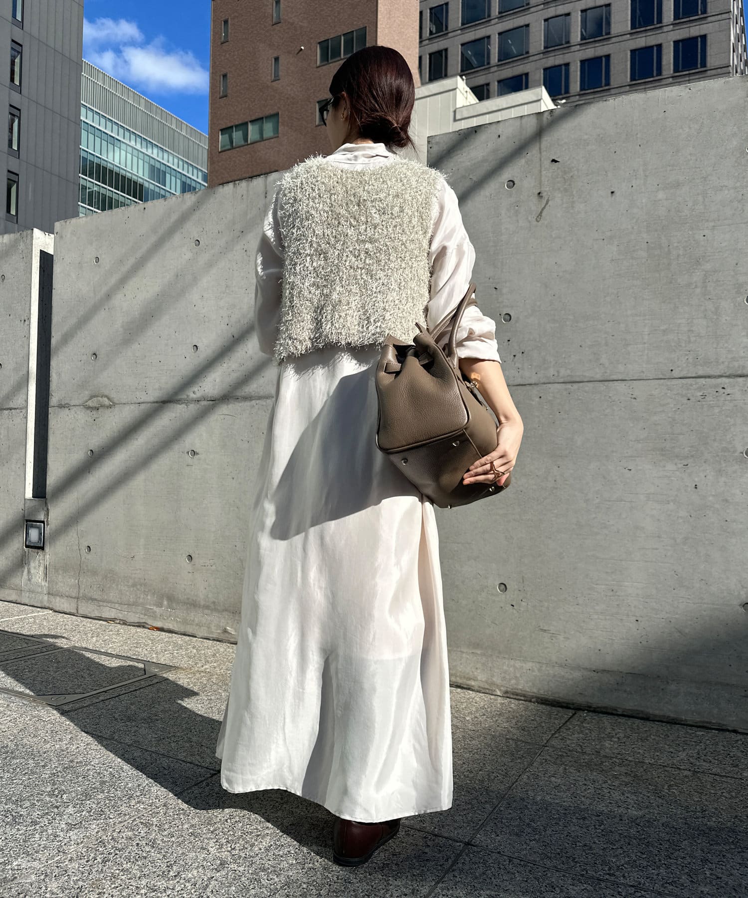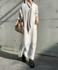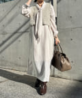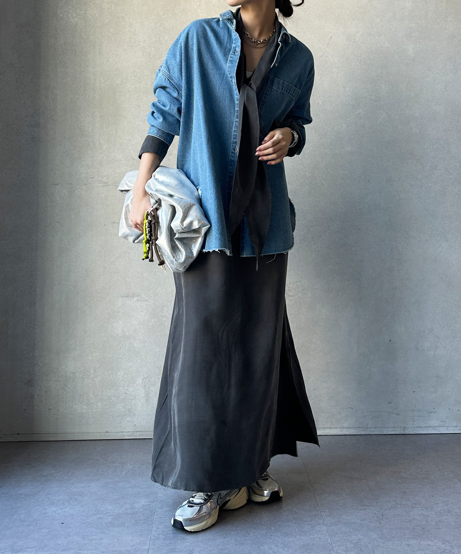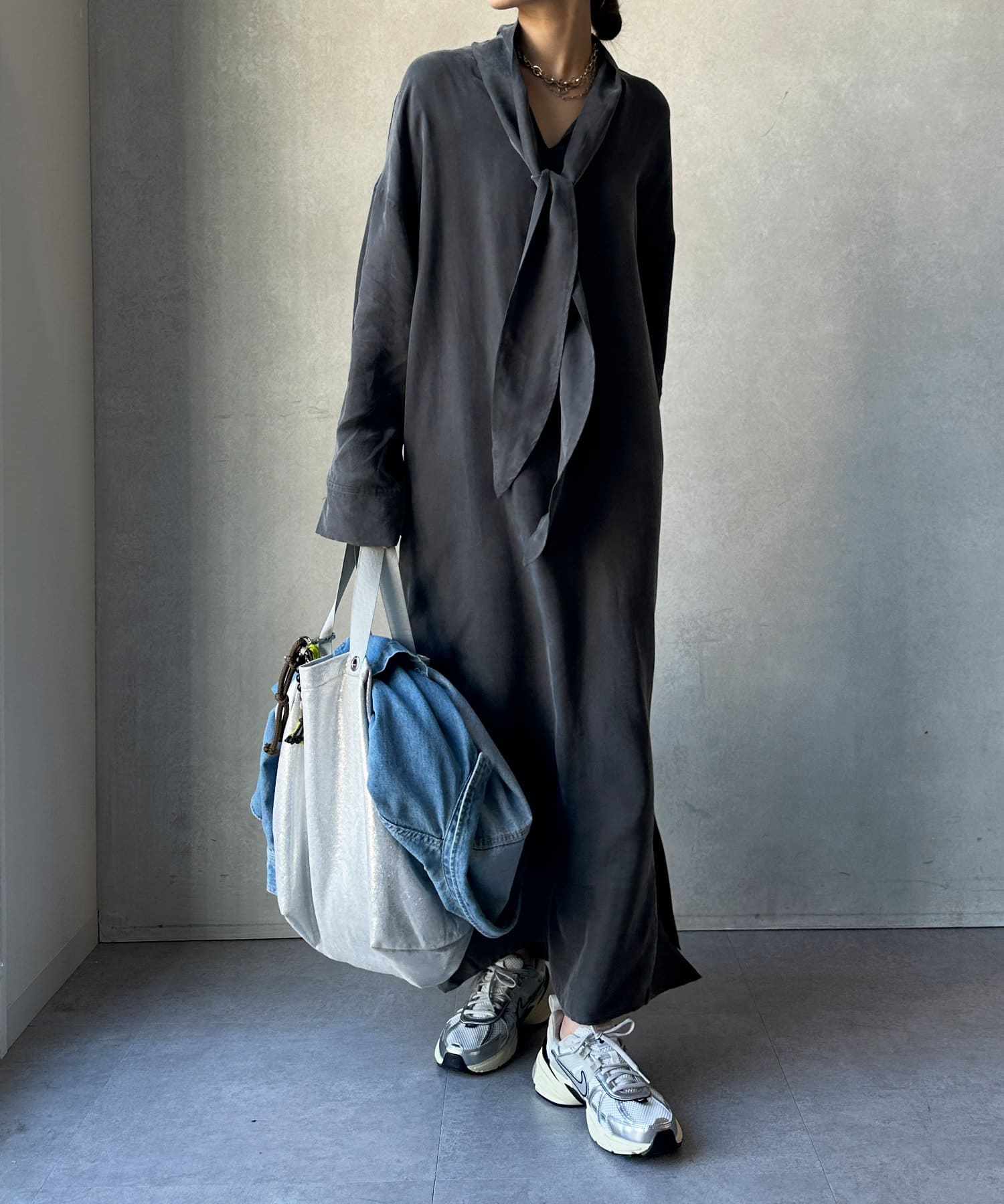 ロング丈で体型もすっぽりカバーしながらも、キュプラ混の落ち感ある素材で広がりすぎずに着ていただけます。