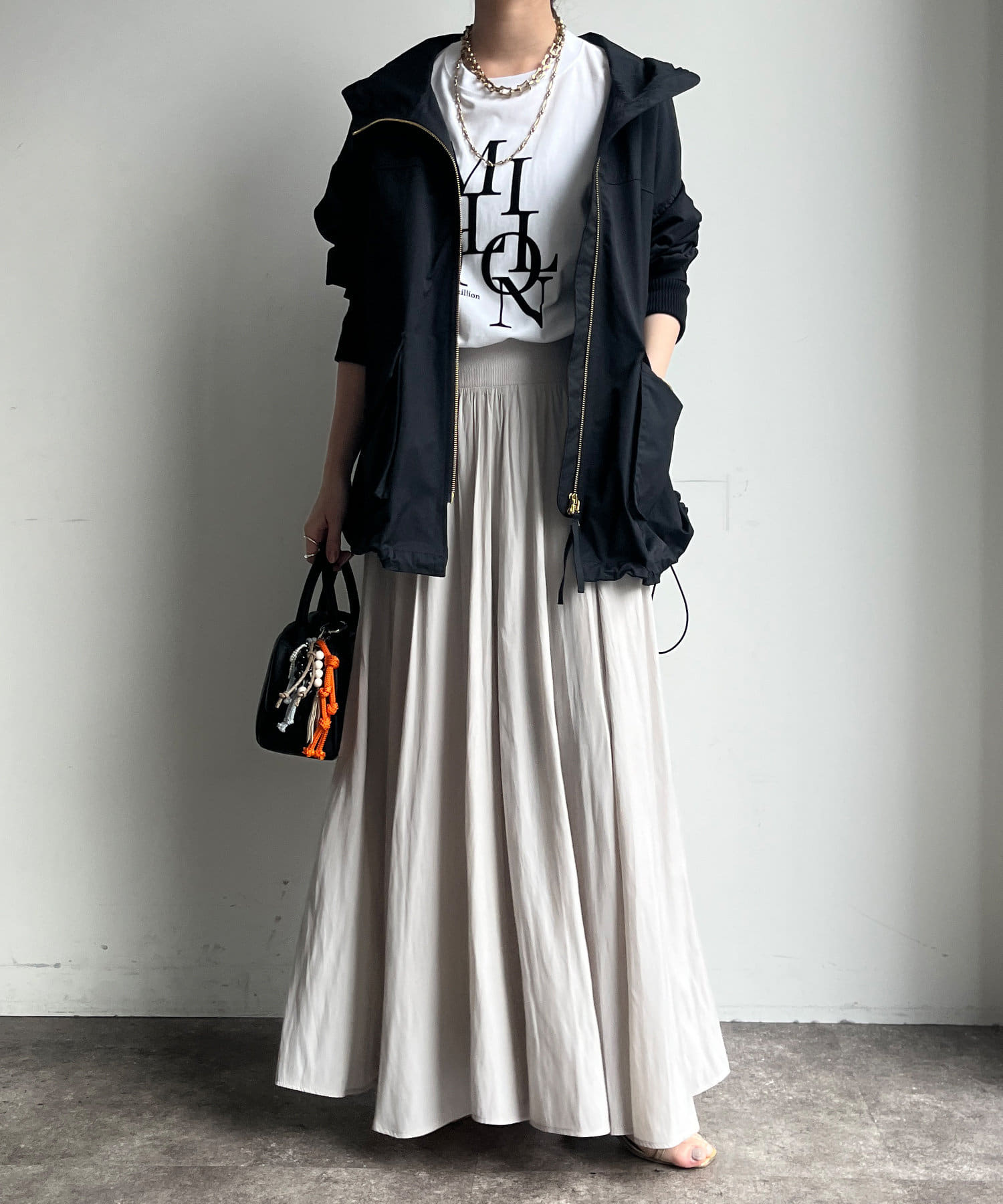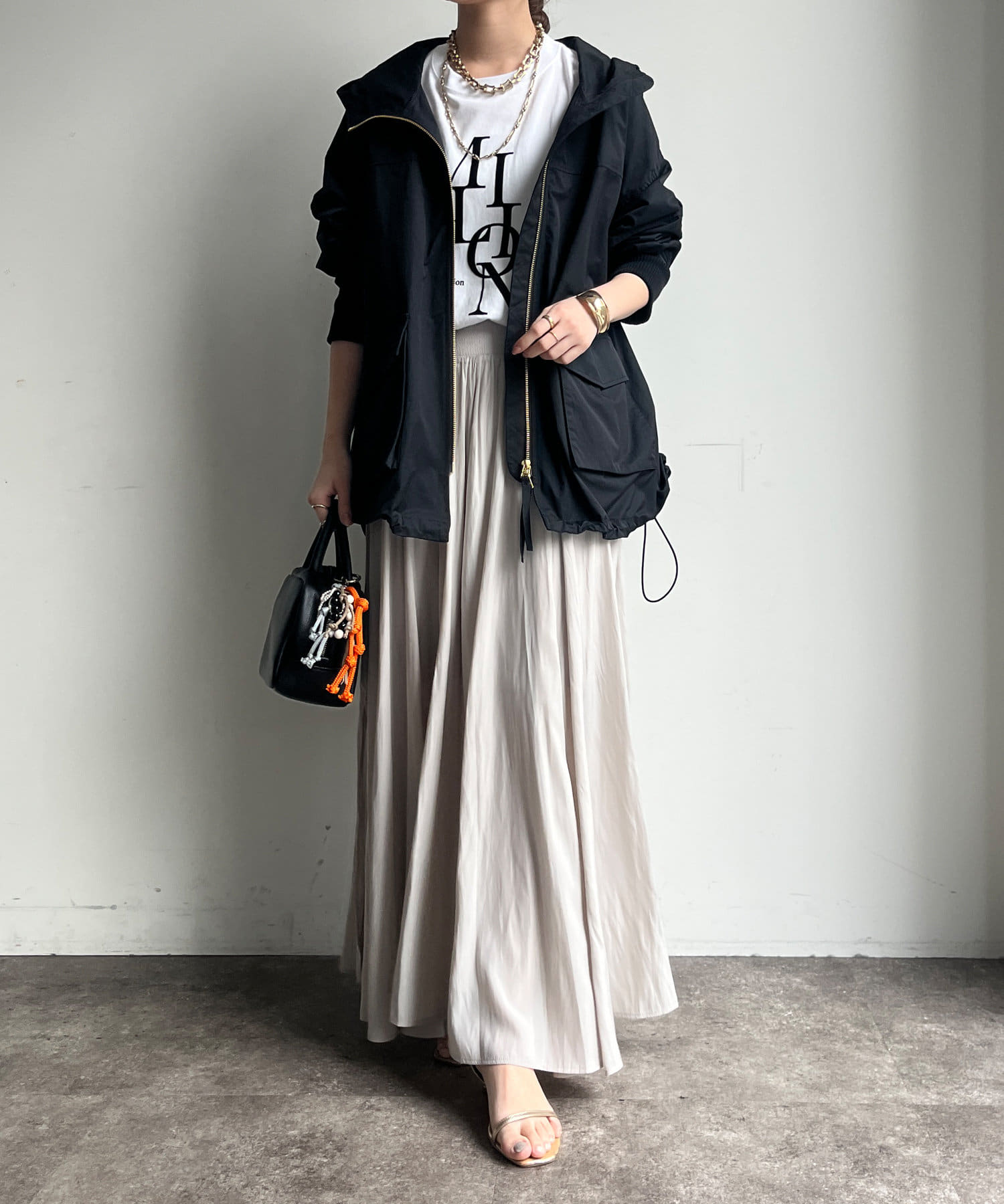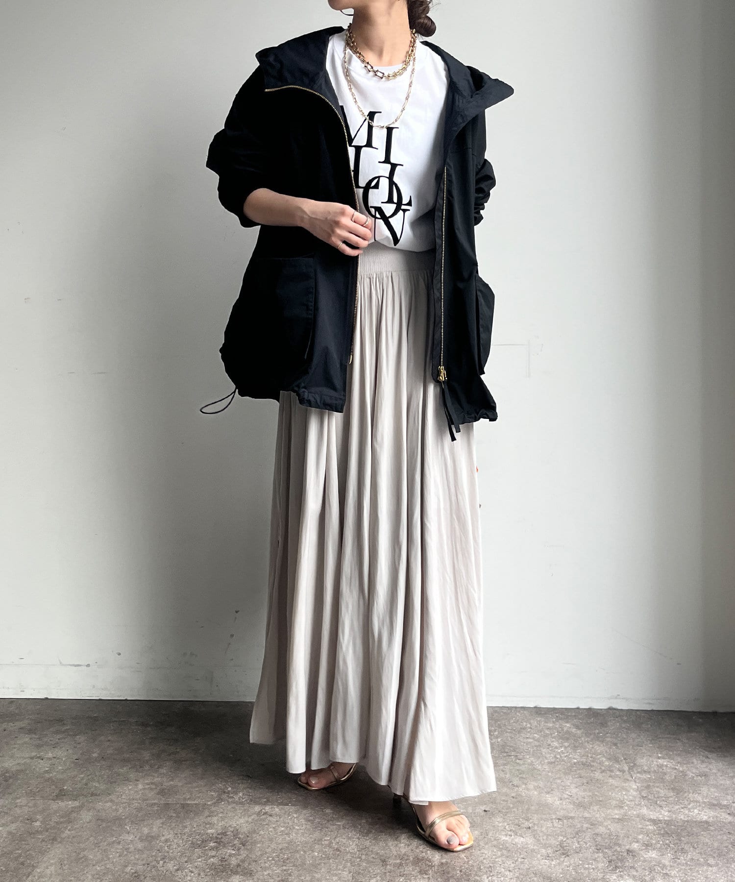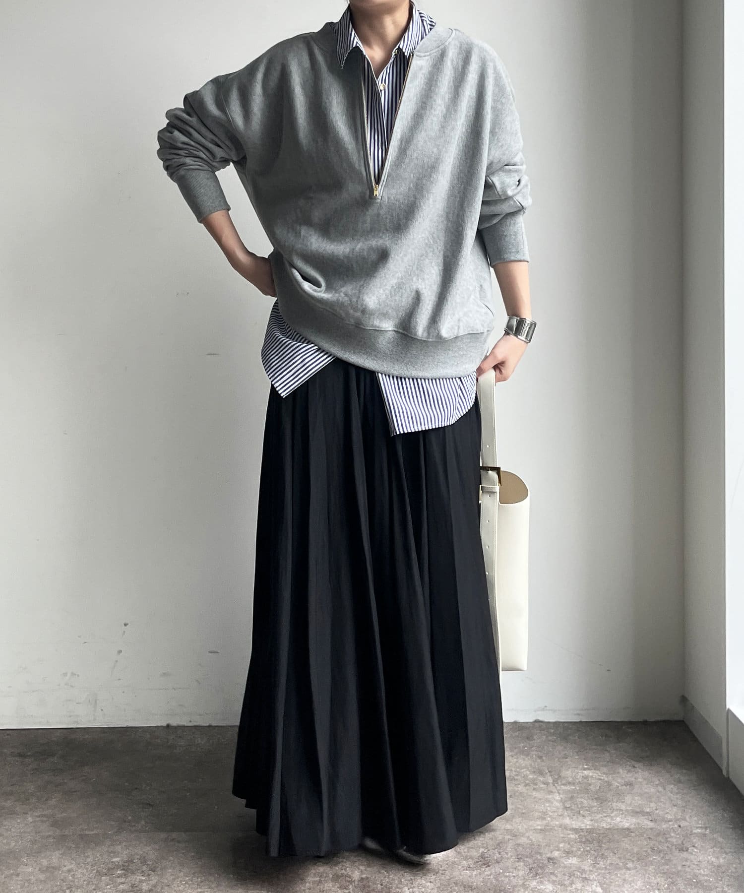 分量感はあるものの、片方の裾にはスリットを加えているため重たくなりすぎず、抜け感を与えてくれます。
