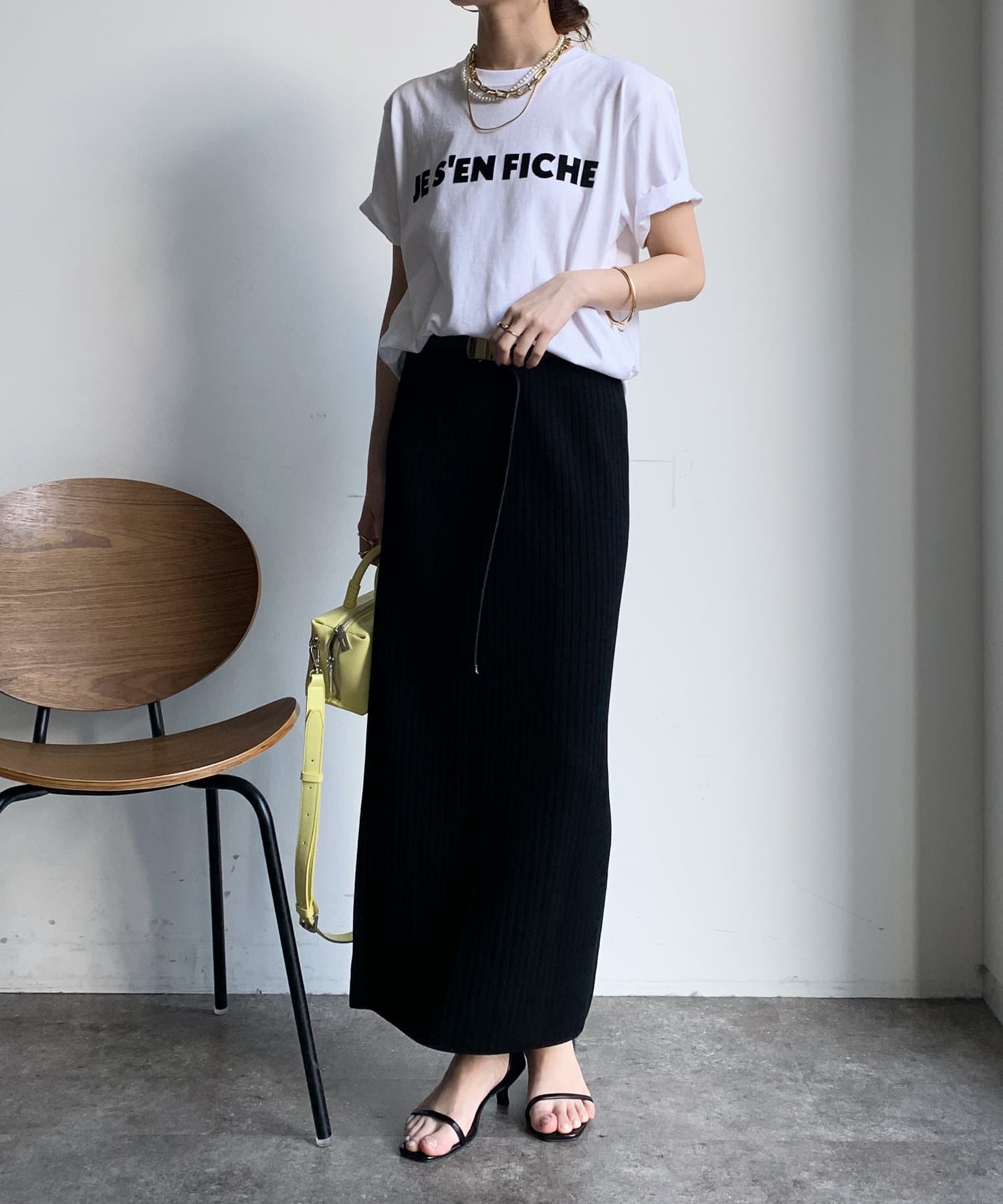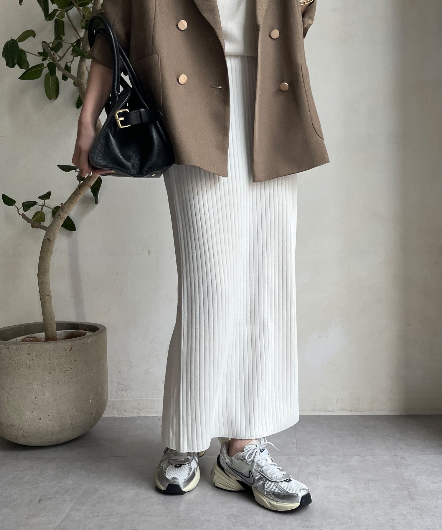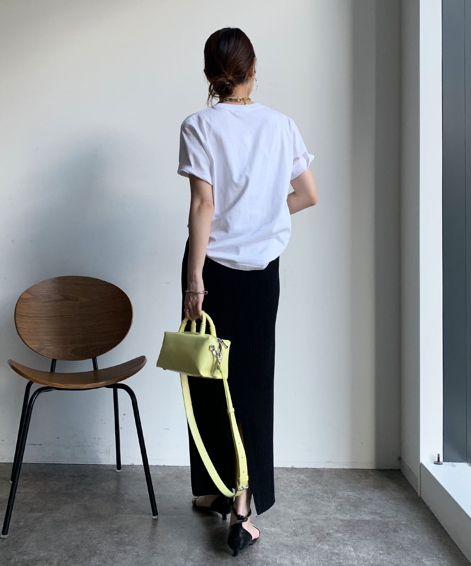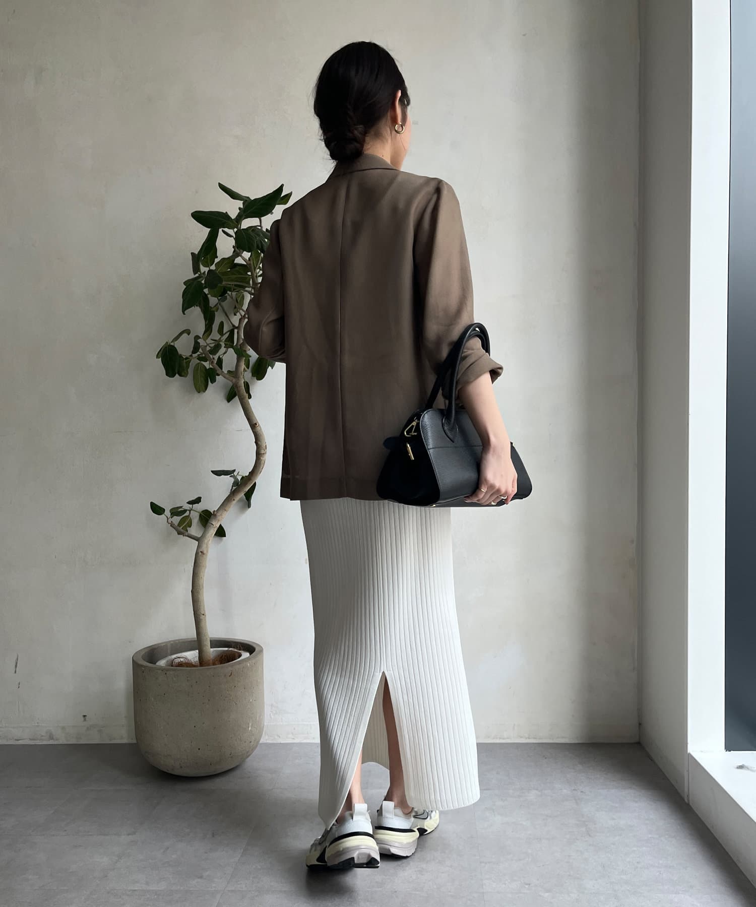 程よくボディラインに沿うIラインのタイトシルエットでありながらも、ぴたぴたとした窮屈感はなくリラクシーな着心地。