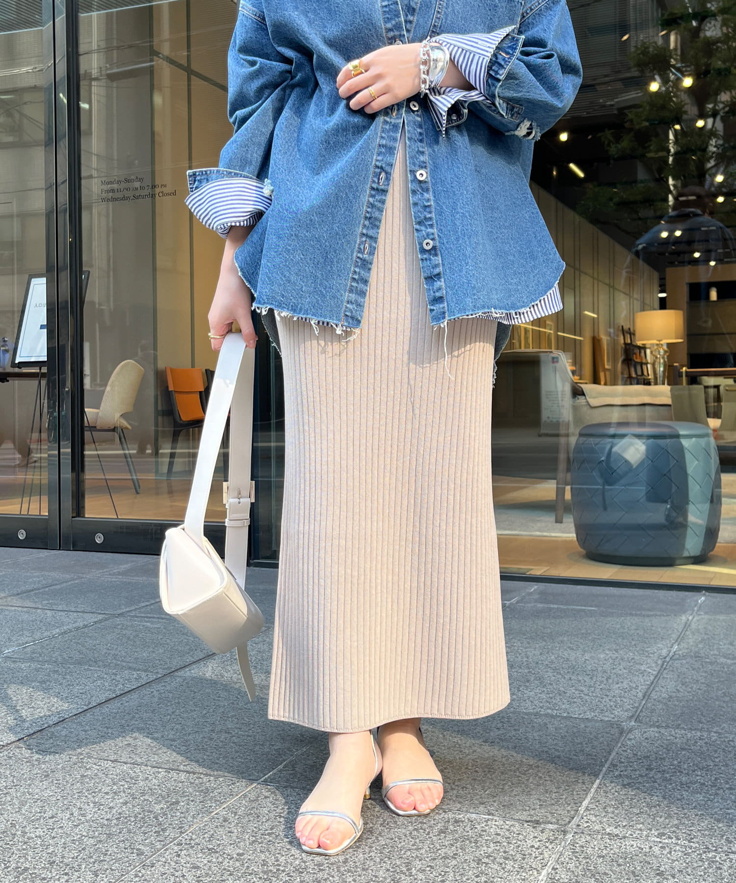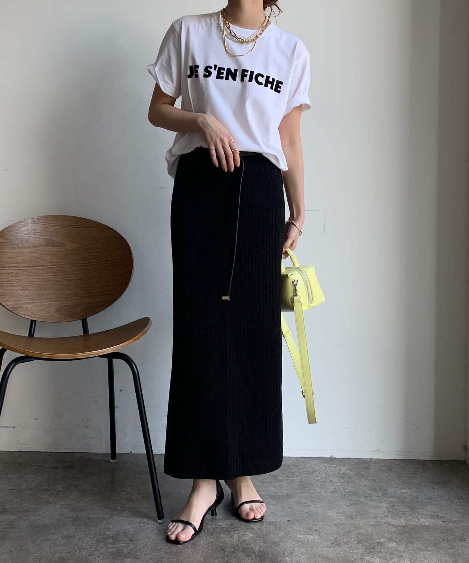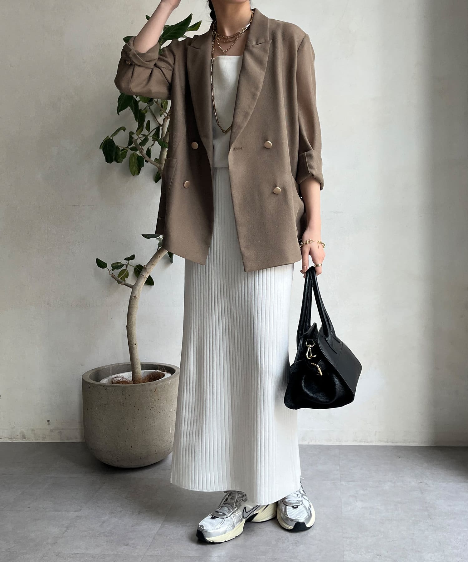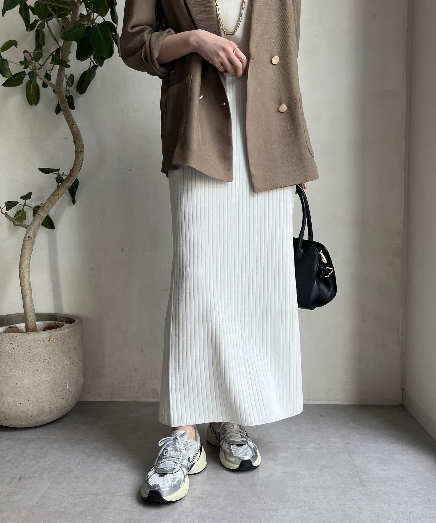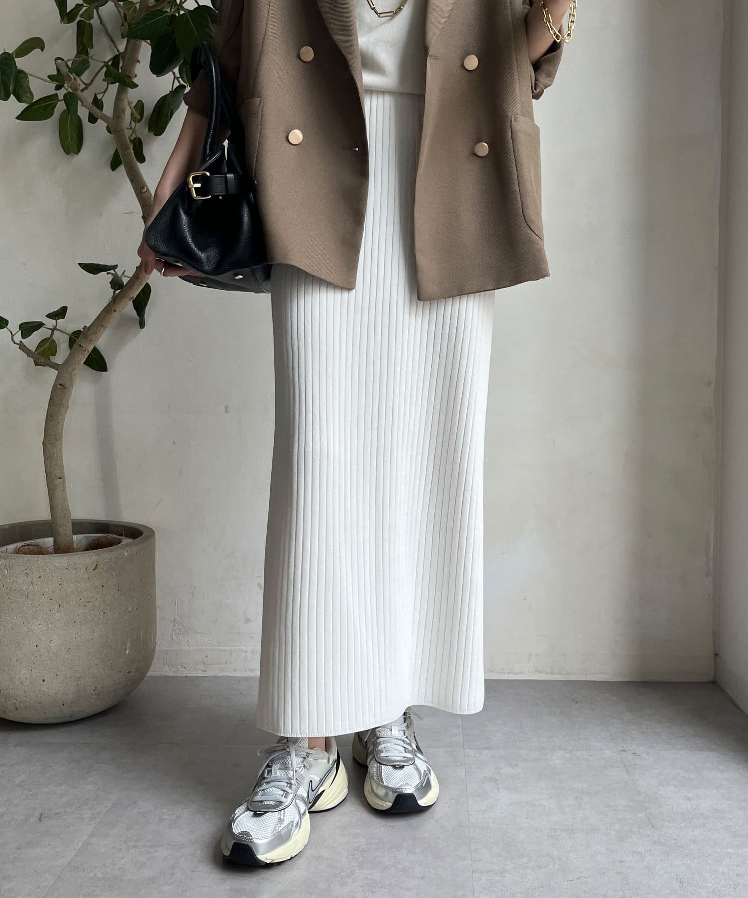 程よくボディラインに沿うIラインのタイトシルエットでありながらも、ぴたぴたとした窮屈感はなくリラクシーな着心地。