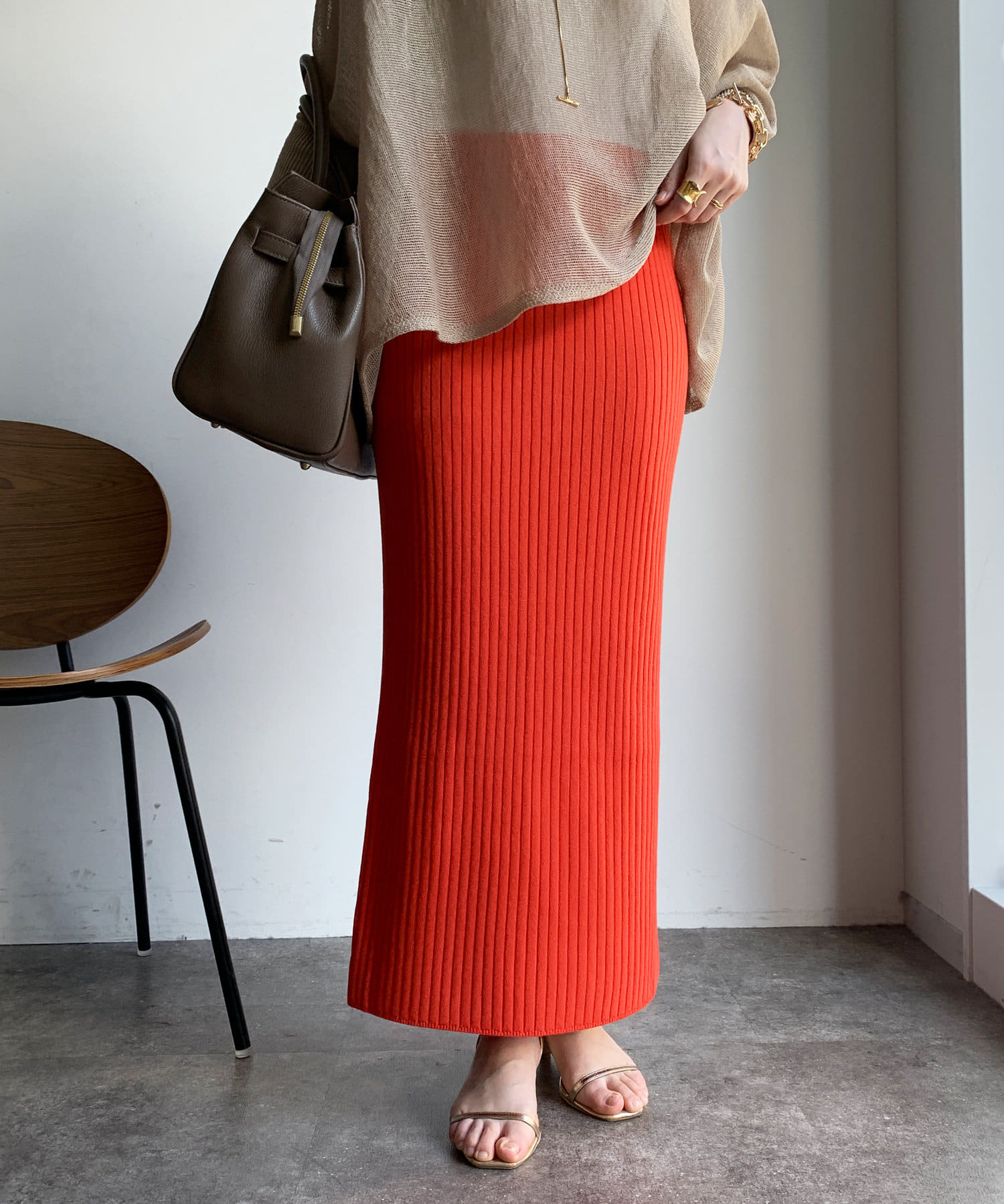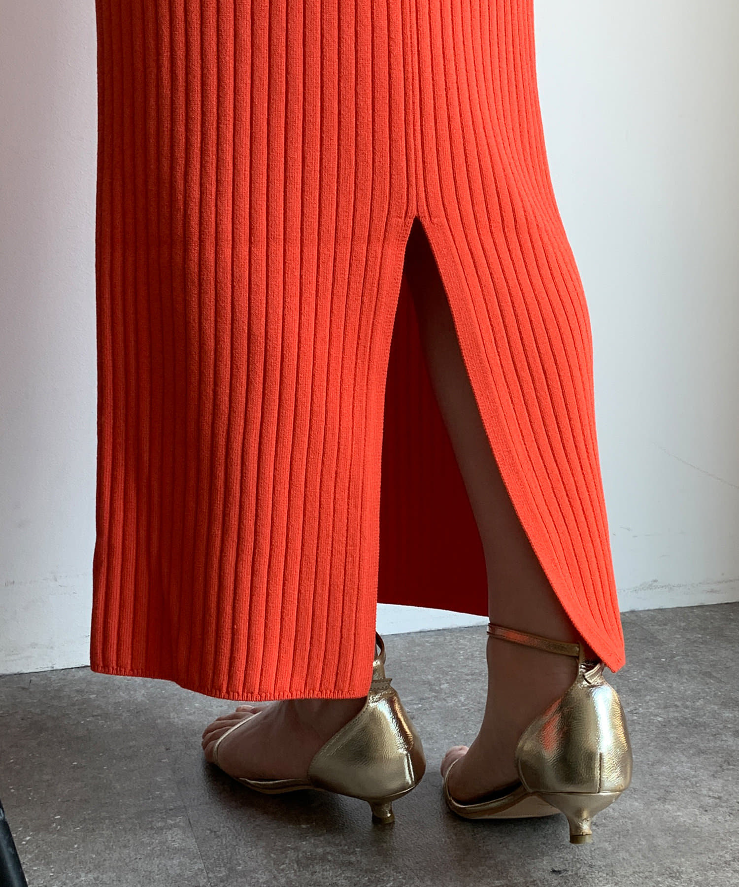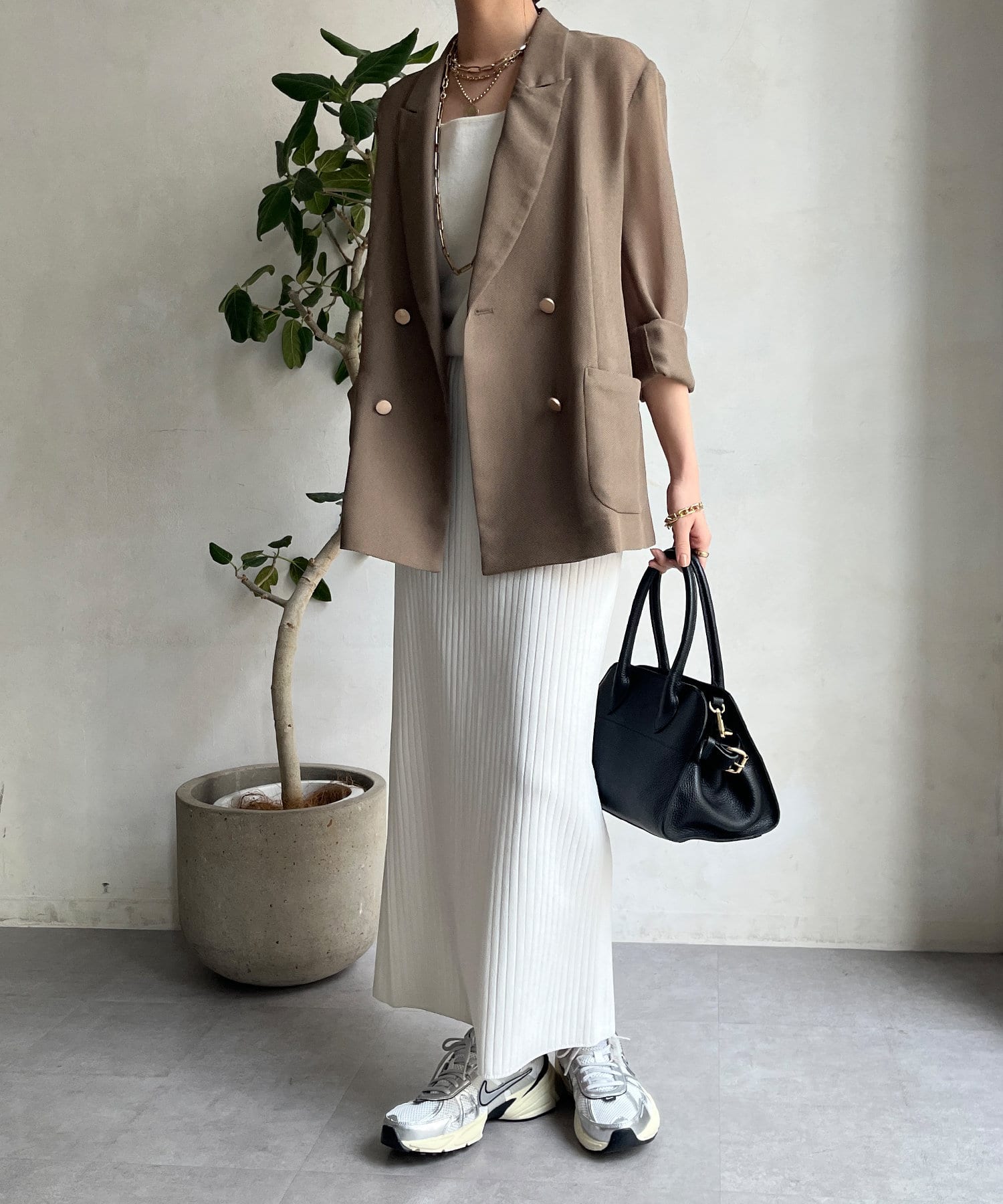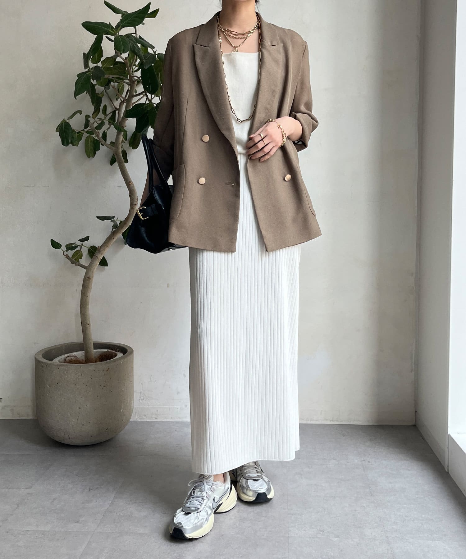 程よくボディラインに沿うIラインのタイトシルエットでありながらも、ぴたぴたとした窮屈感はなくリラクシーな着心地。