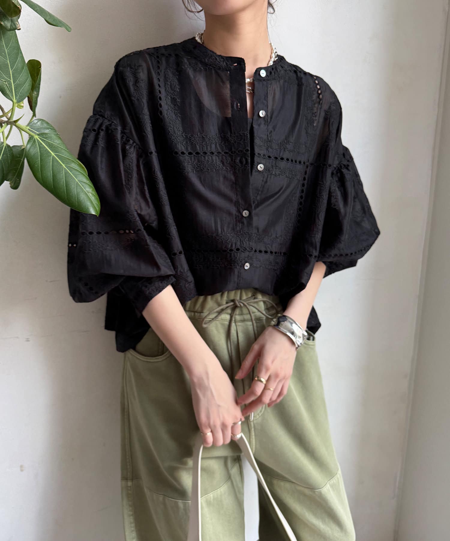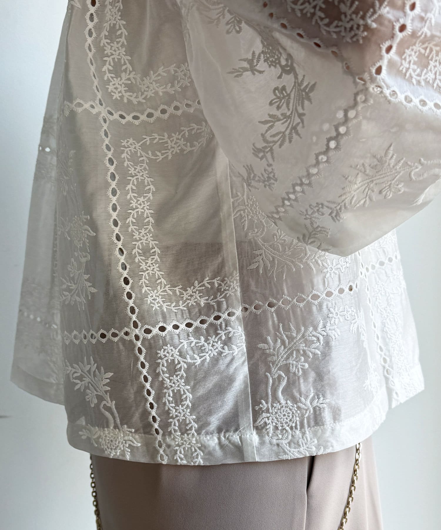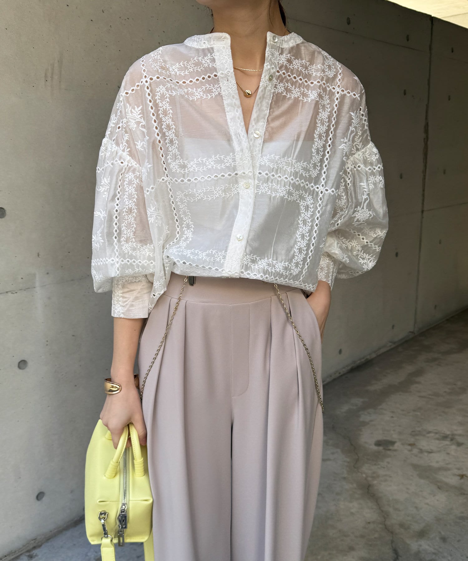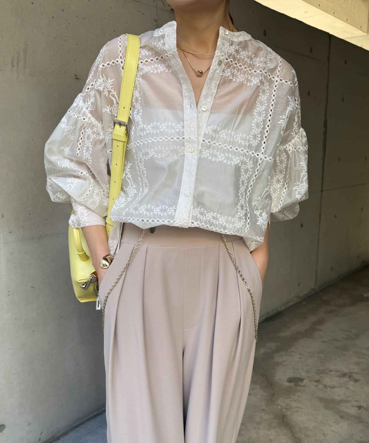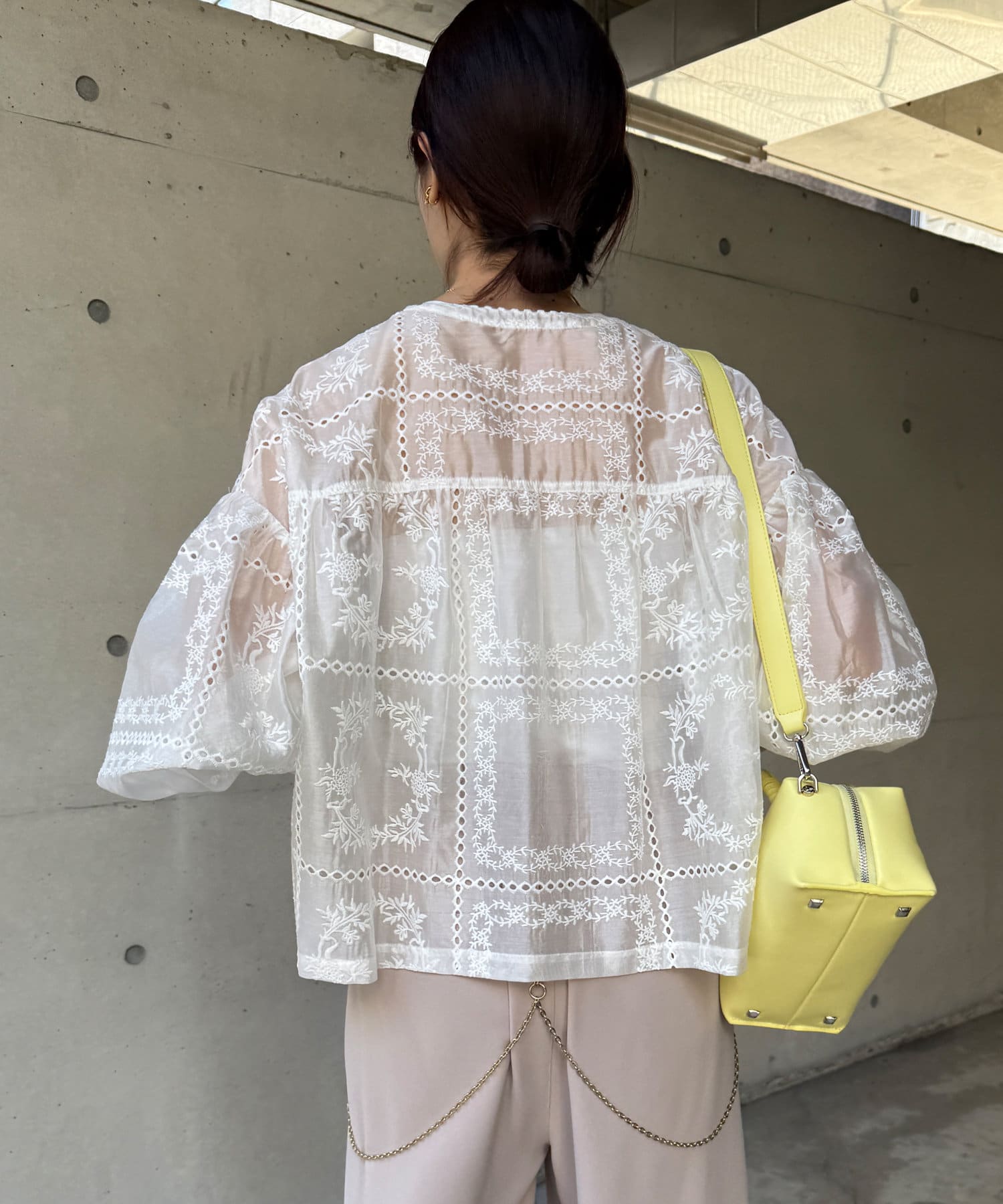 トレンドのシアーに存在感抜群の刺繍デザインが、いつものコーデに投入するだけで一気に華やかさアップ。