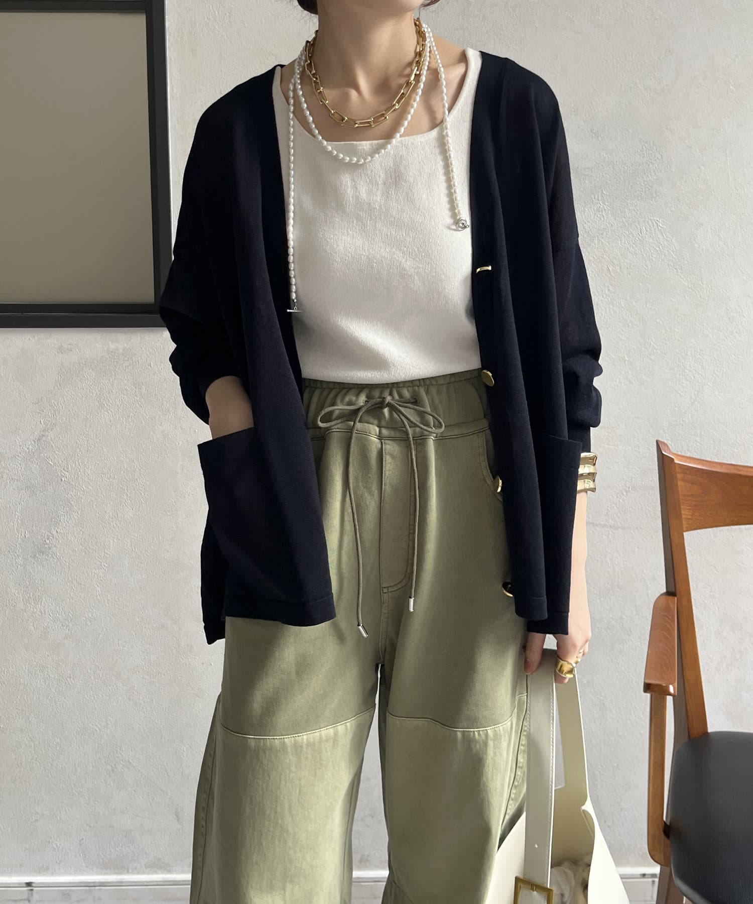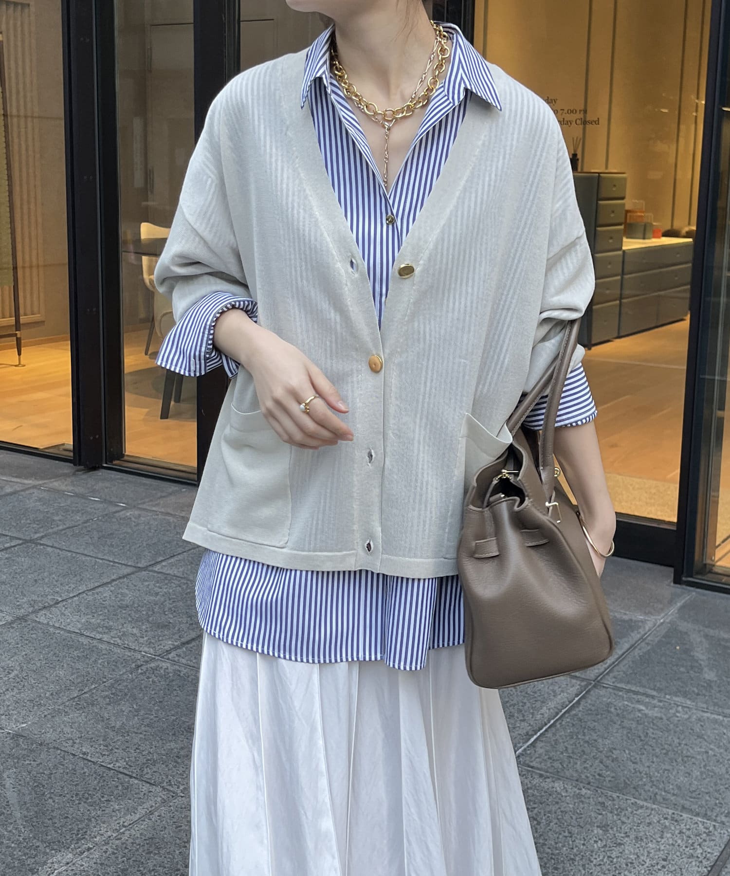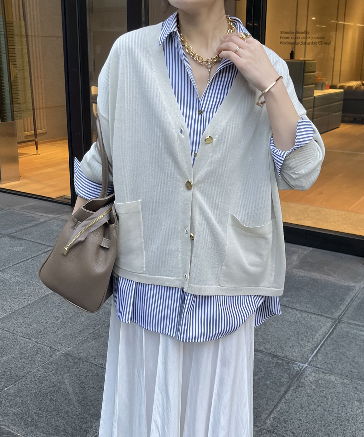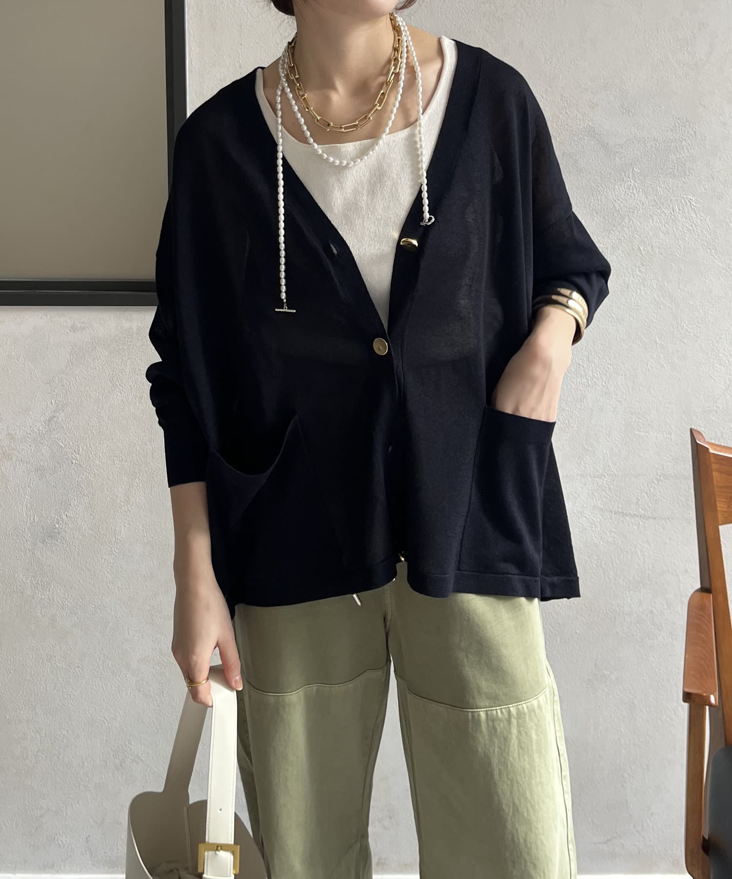 すっきりと見せてくれるVネックカーディガンの定番シルエットは、様々なスタイルに馴染みます。