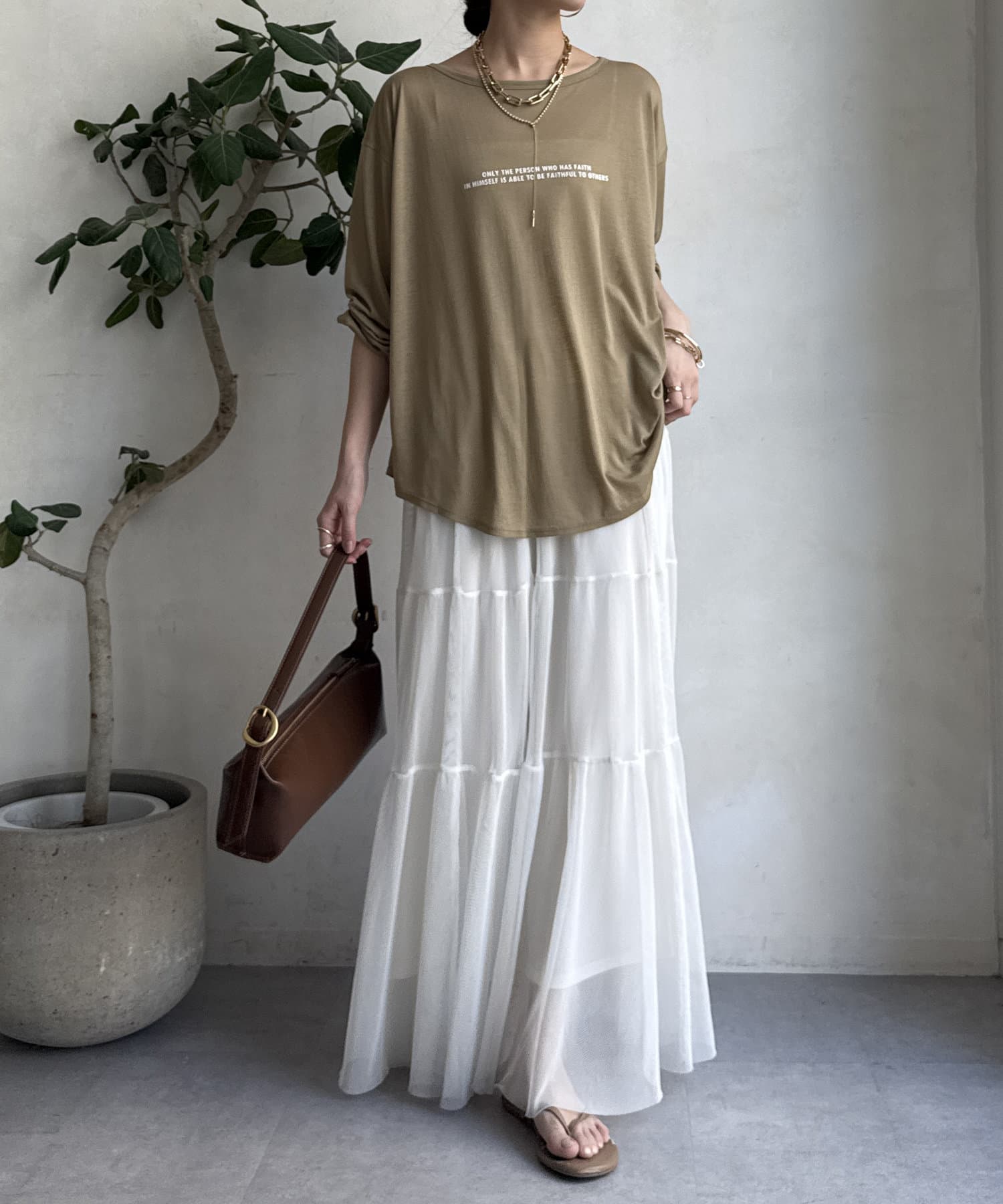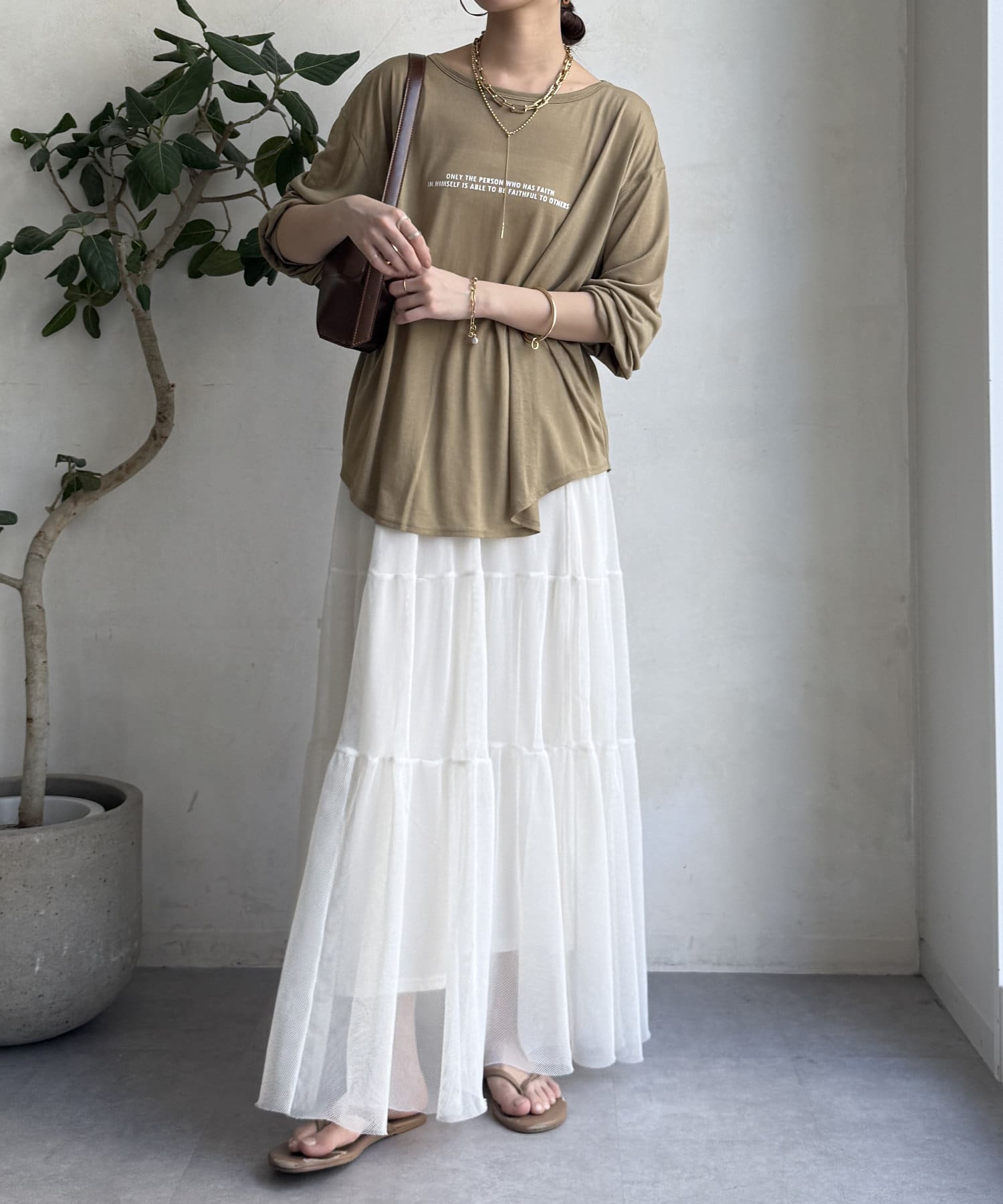程よい透け感が大人らしく上品に決まるので、カジュアルになり過ぎないのがポイントです。