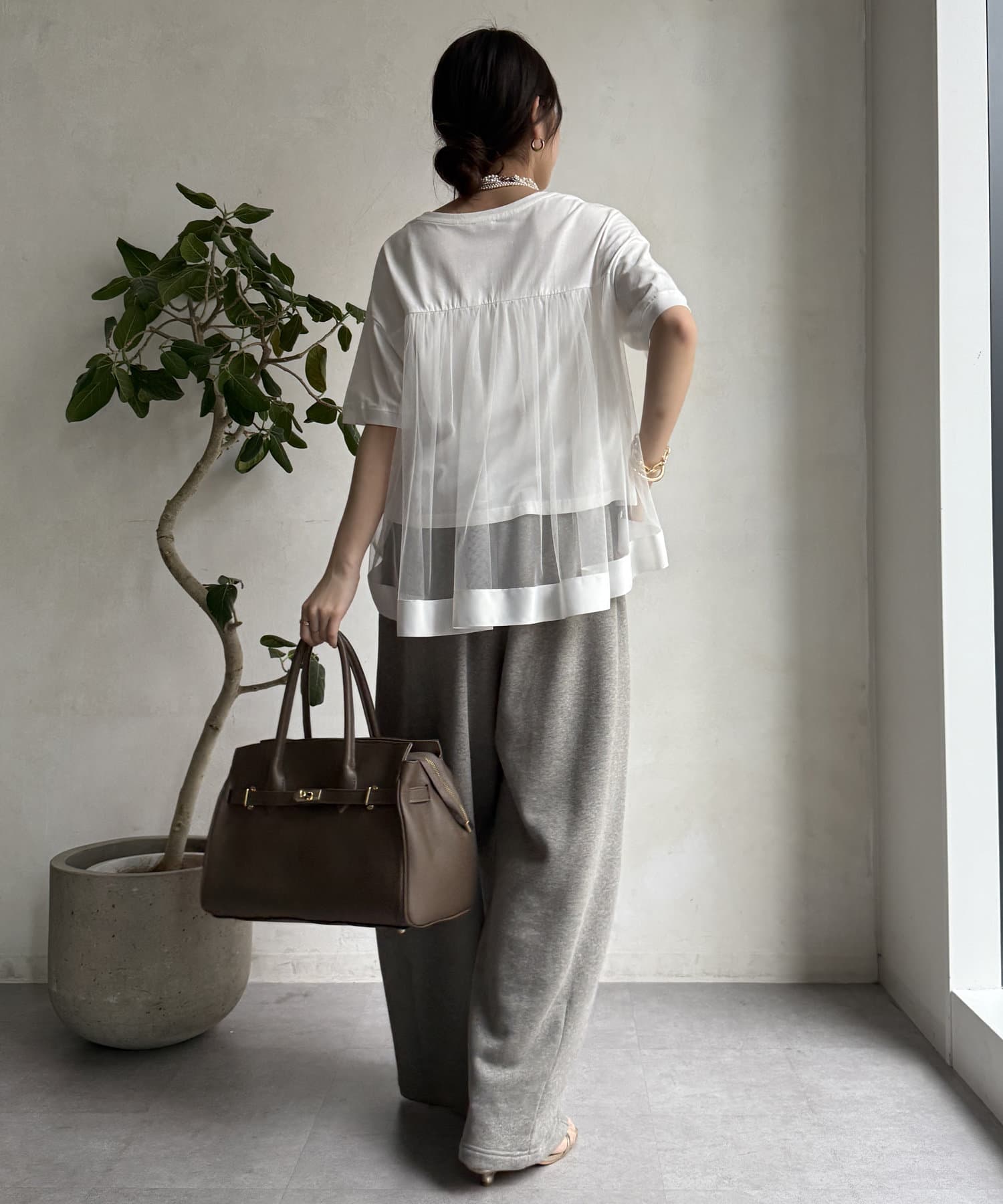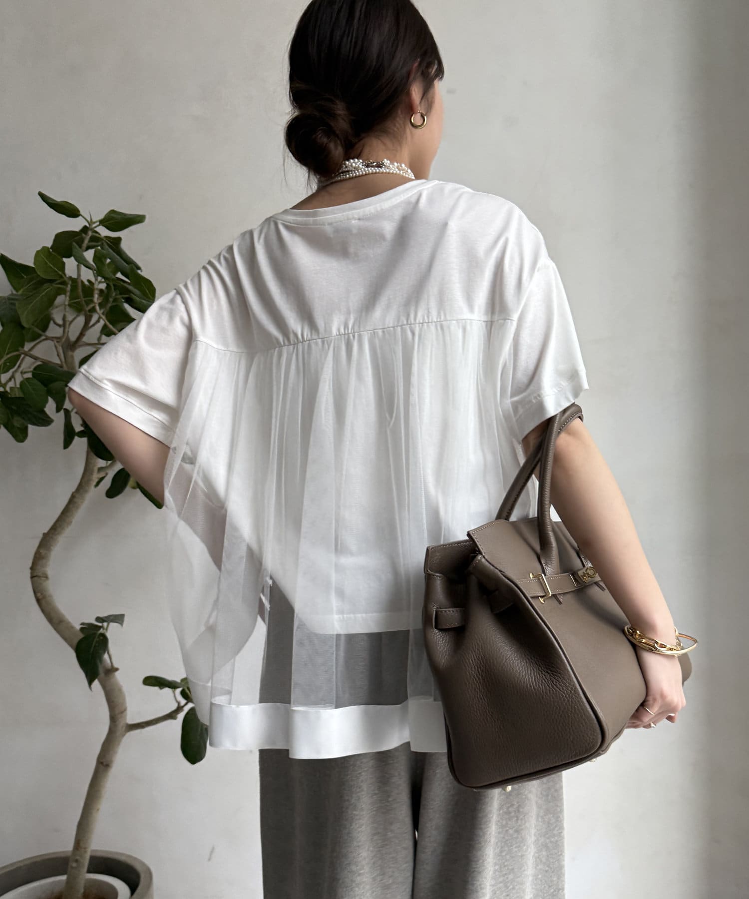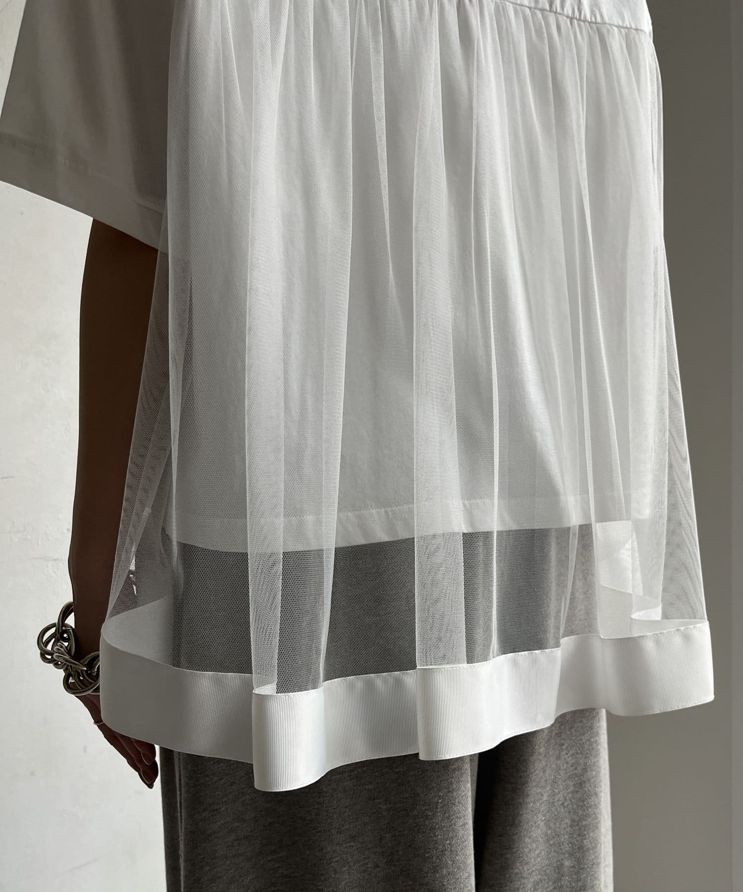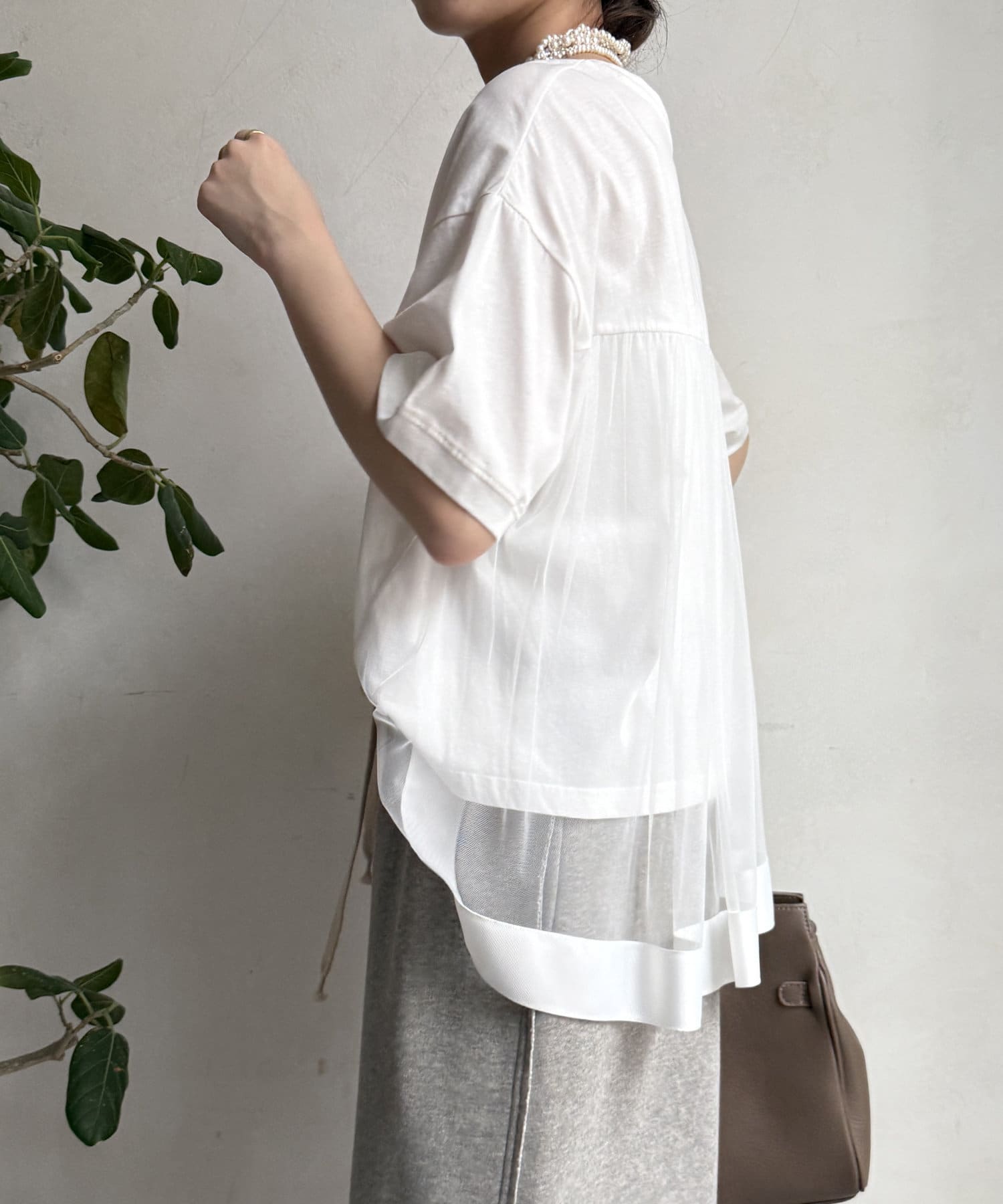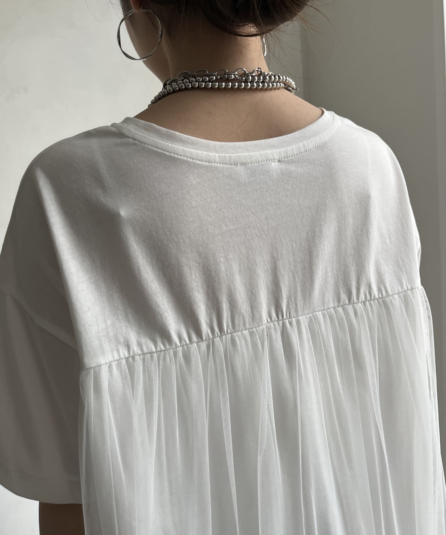後ろの着丈が長めに作られていて、チュールが抜け感をプラスしてくれるので