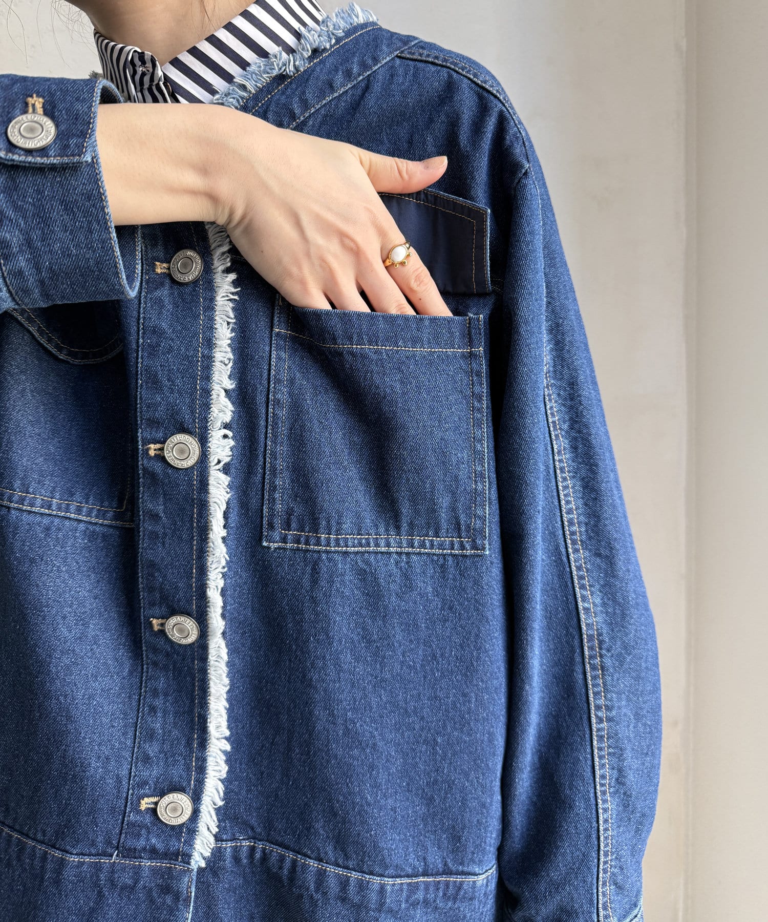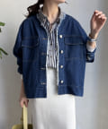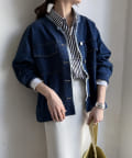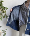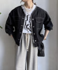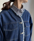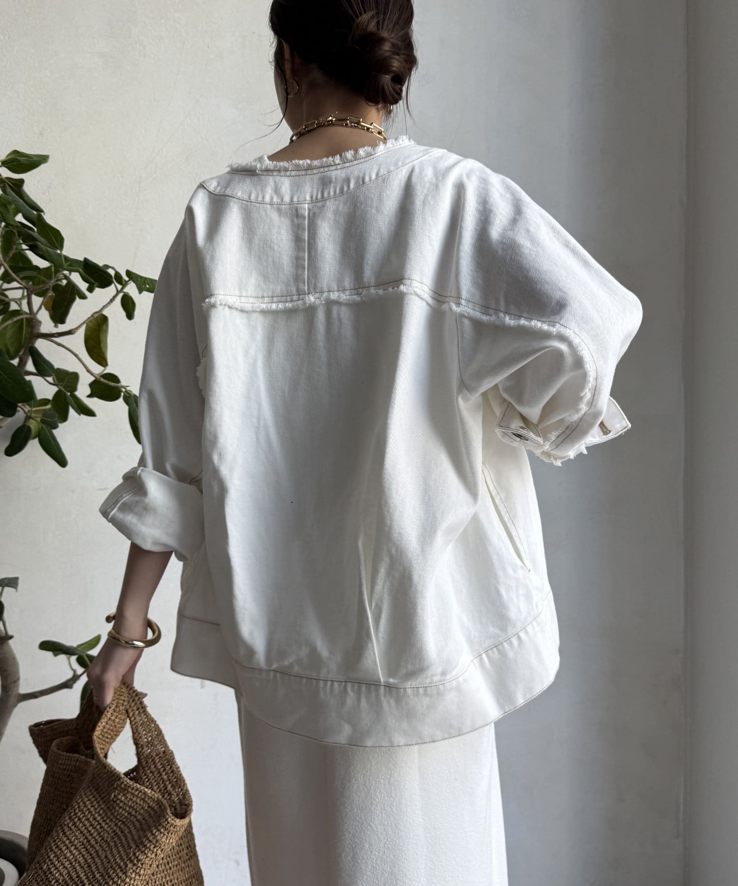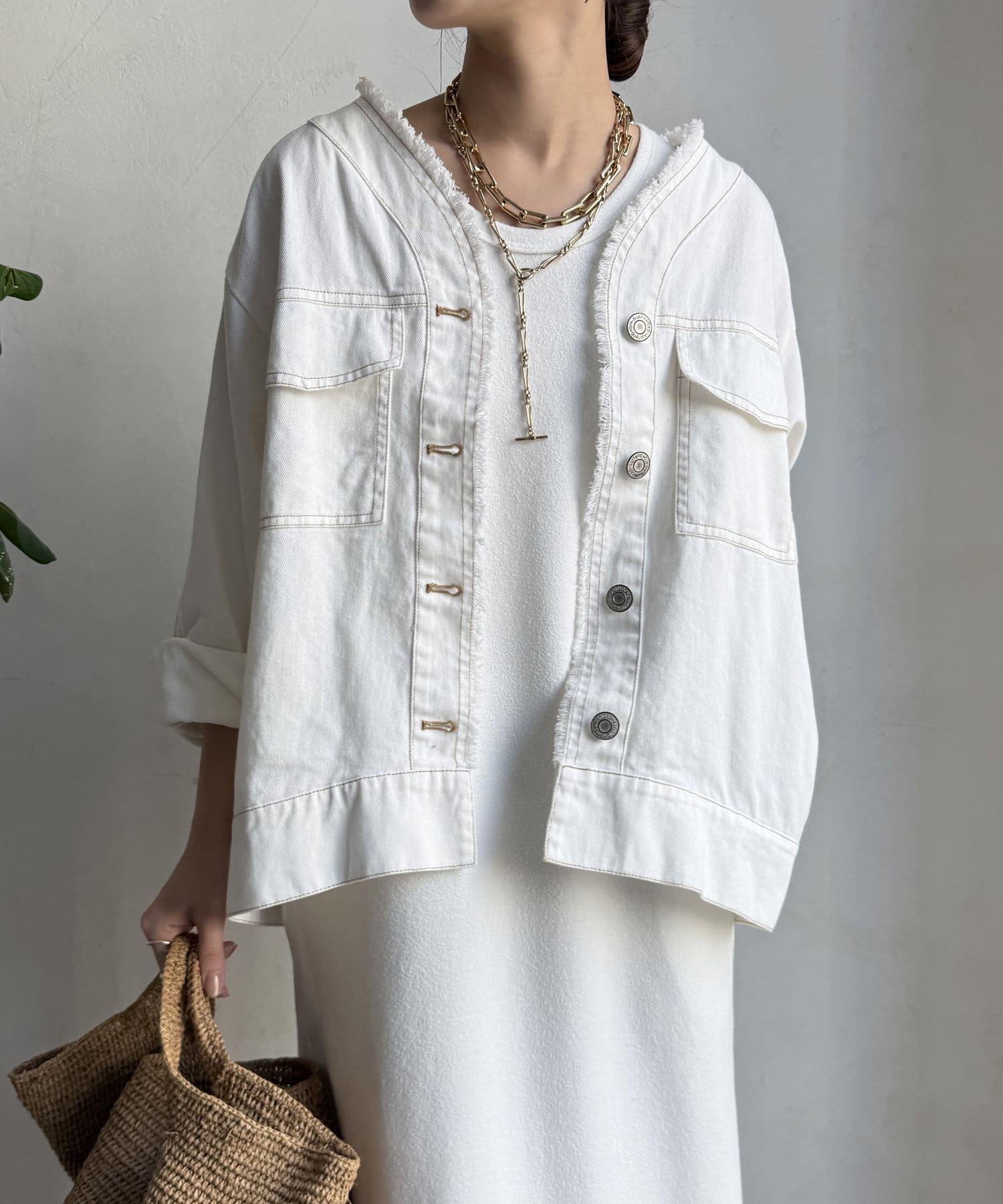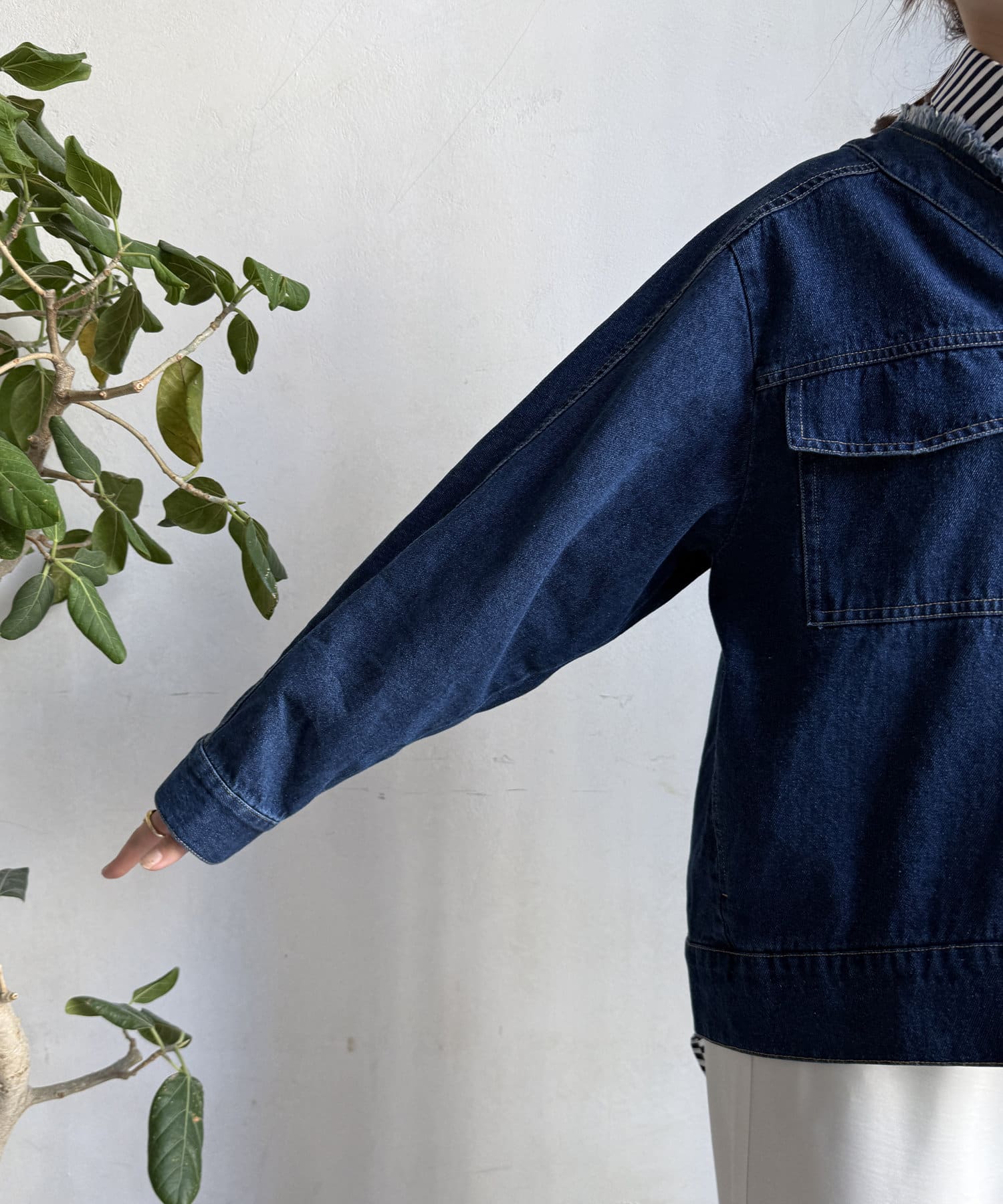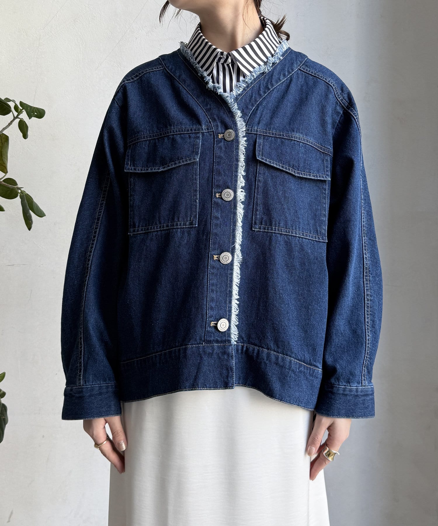 女性らしい印象のノーカラー+Vネック仕様のデニムジャケット。