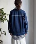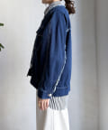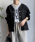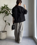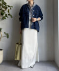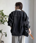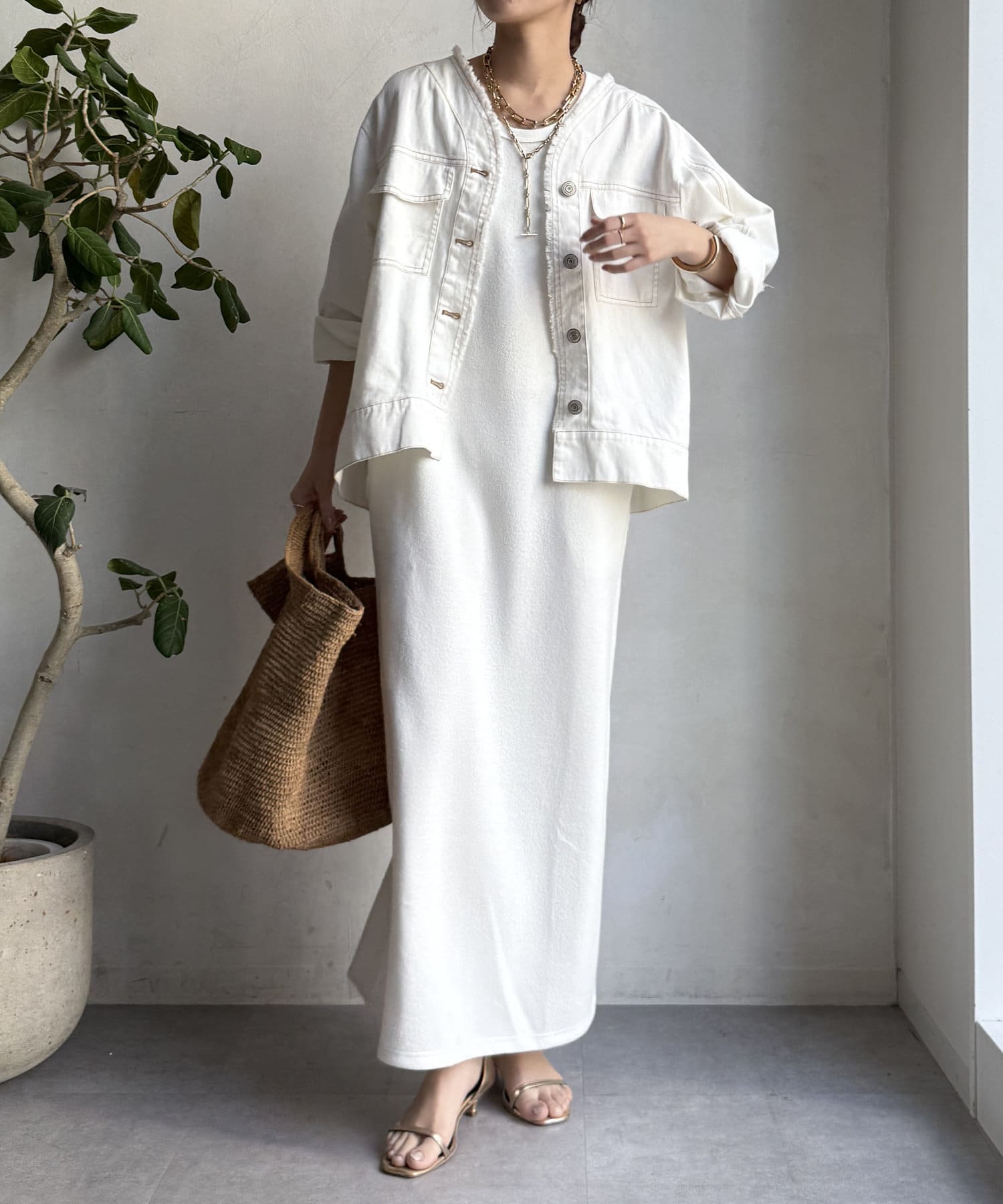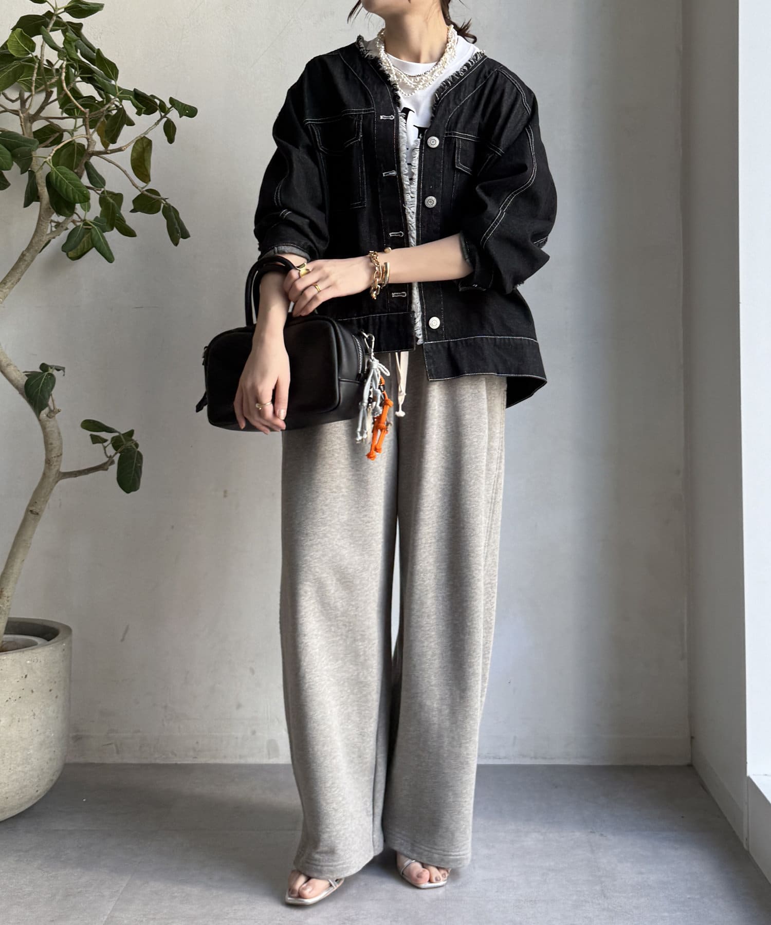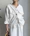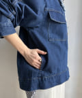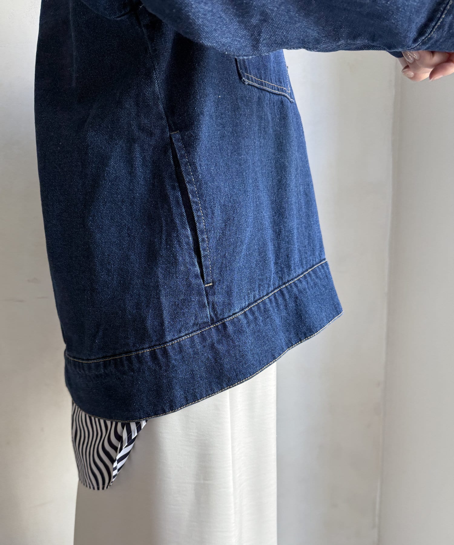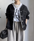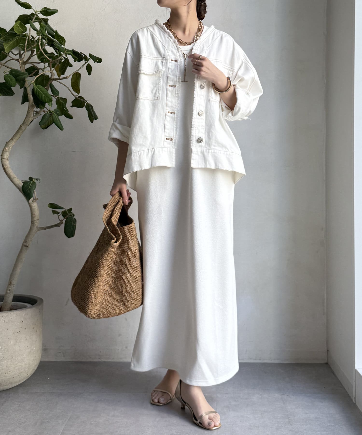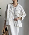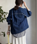 女性らしい印象のノーカラー+Vネック仕様のデニムジャケット。