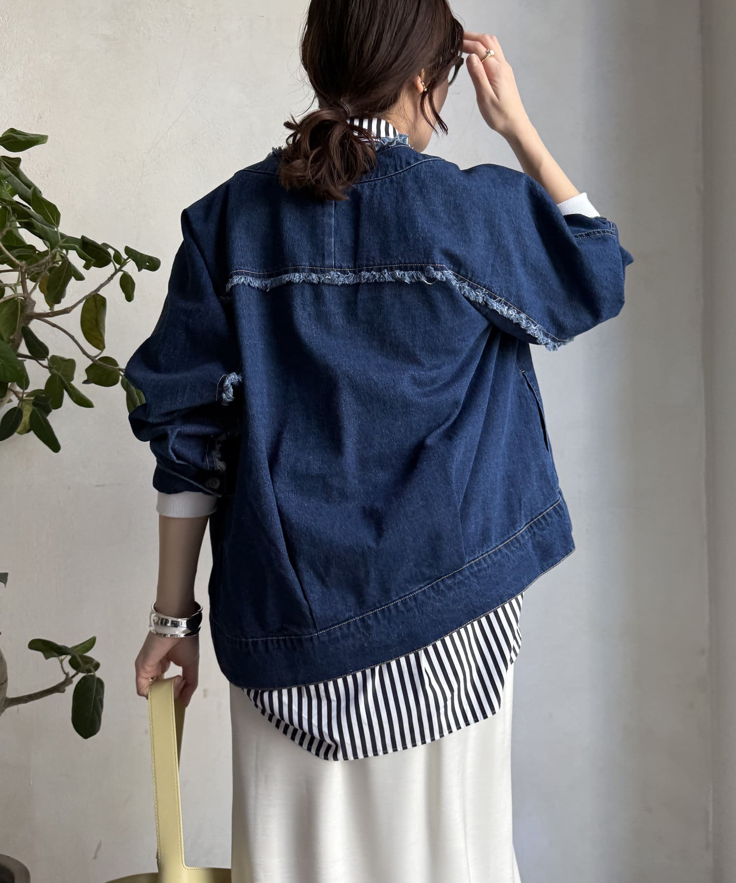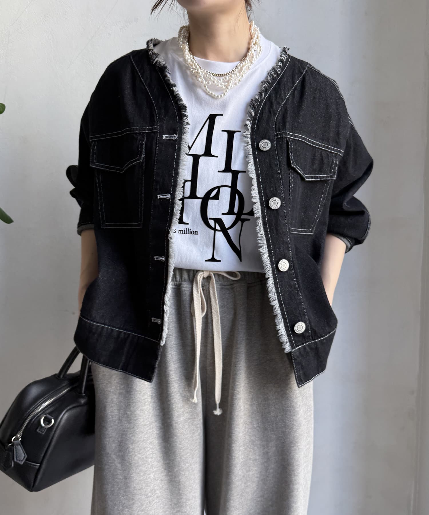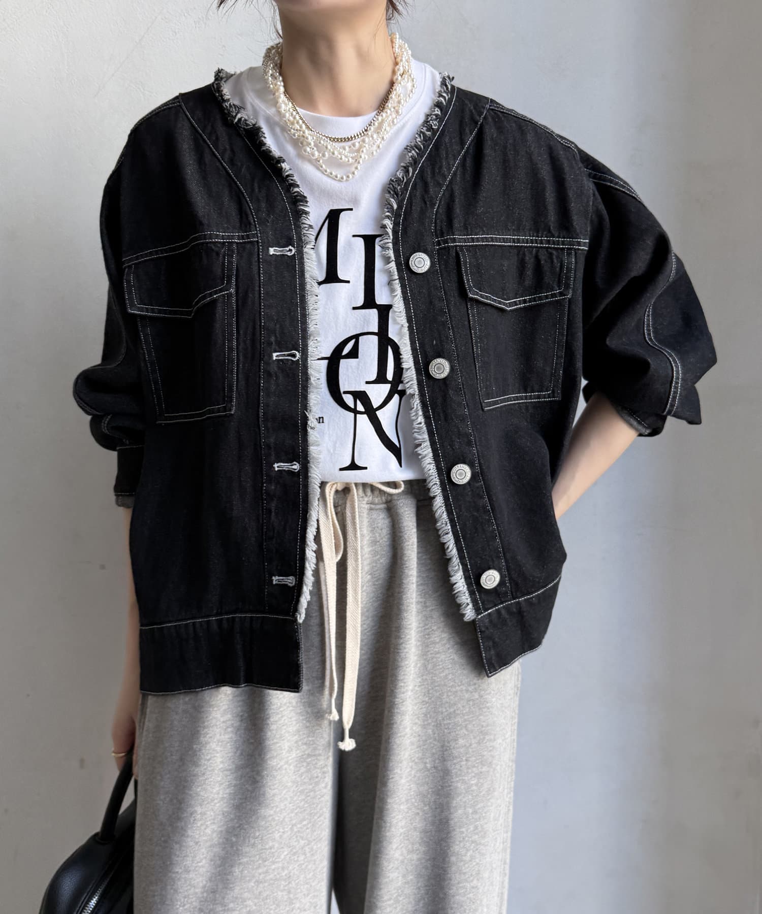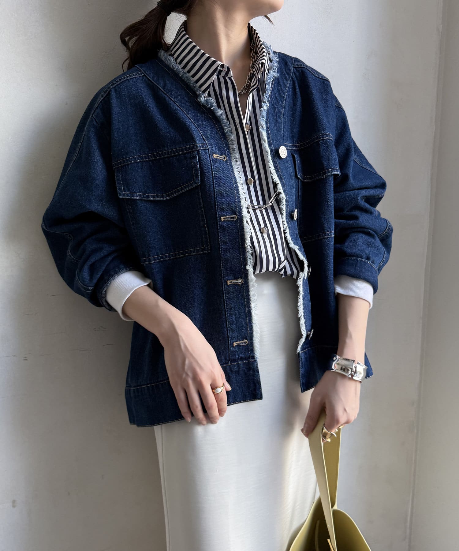 カジュアルなデニムでも大人っぽく。ノーカラーフリンジジャケット