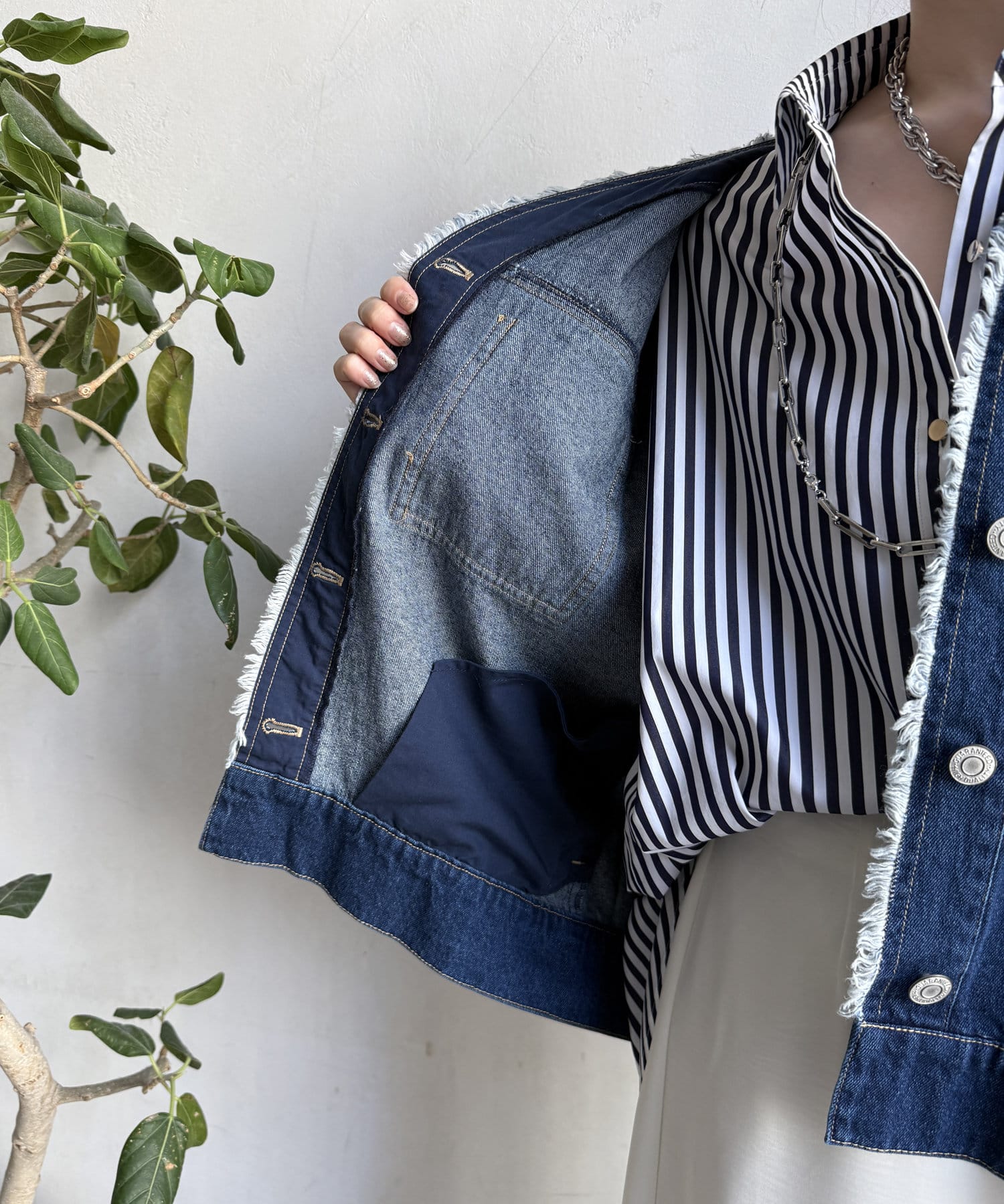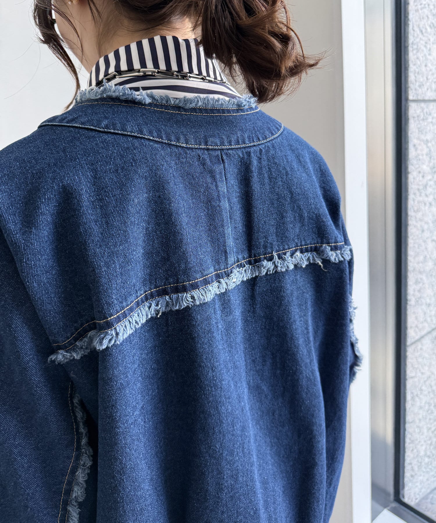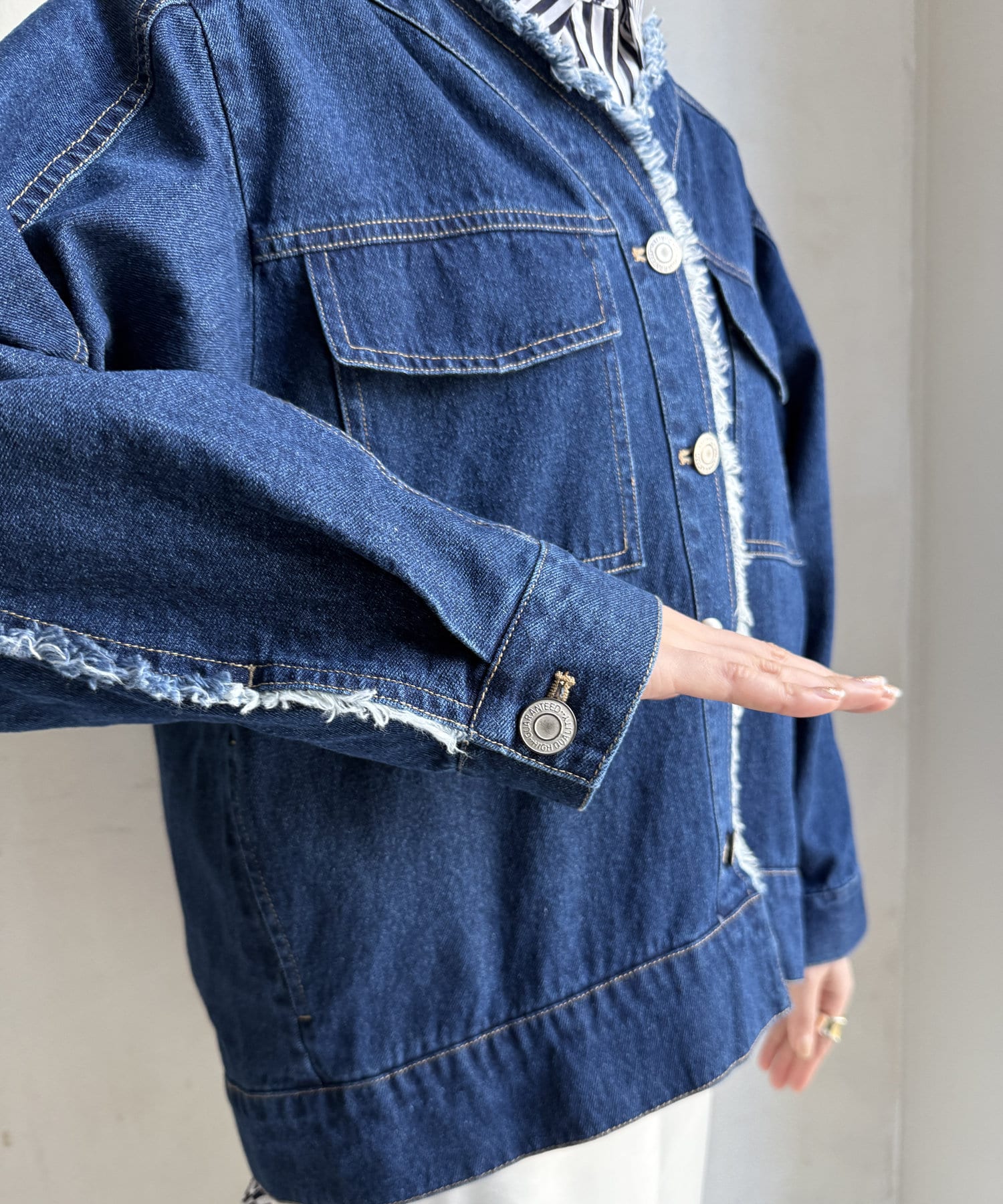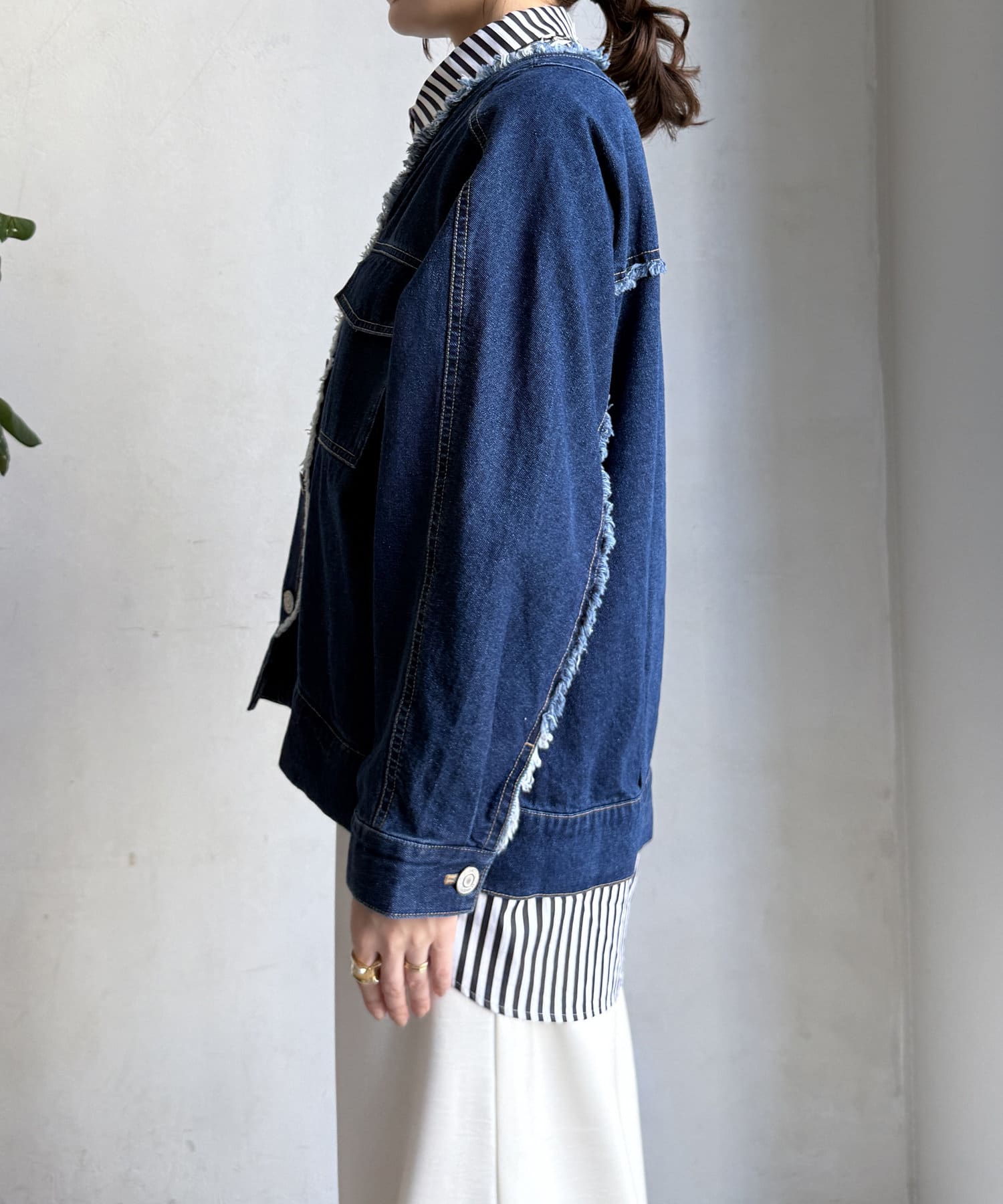 カジュアルなデニムでも大人っぽく。ノーカラーフリンジジャケット