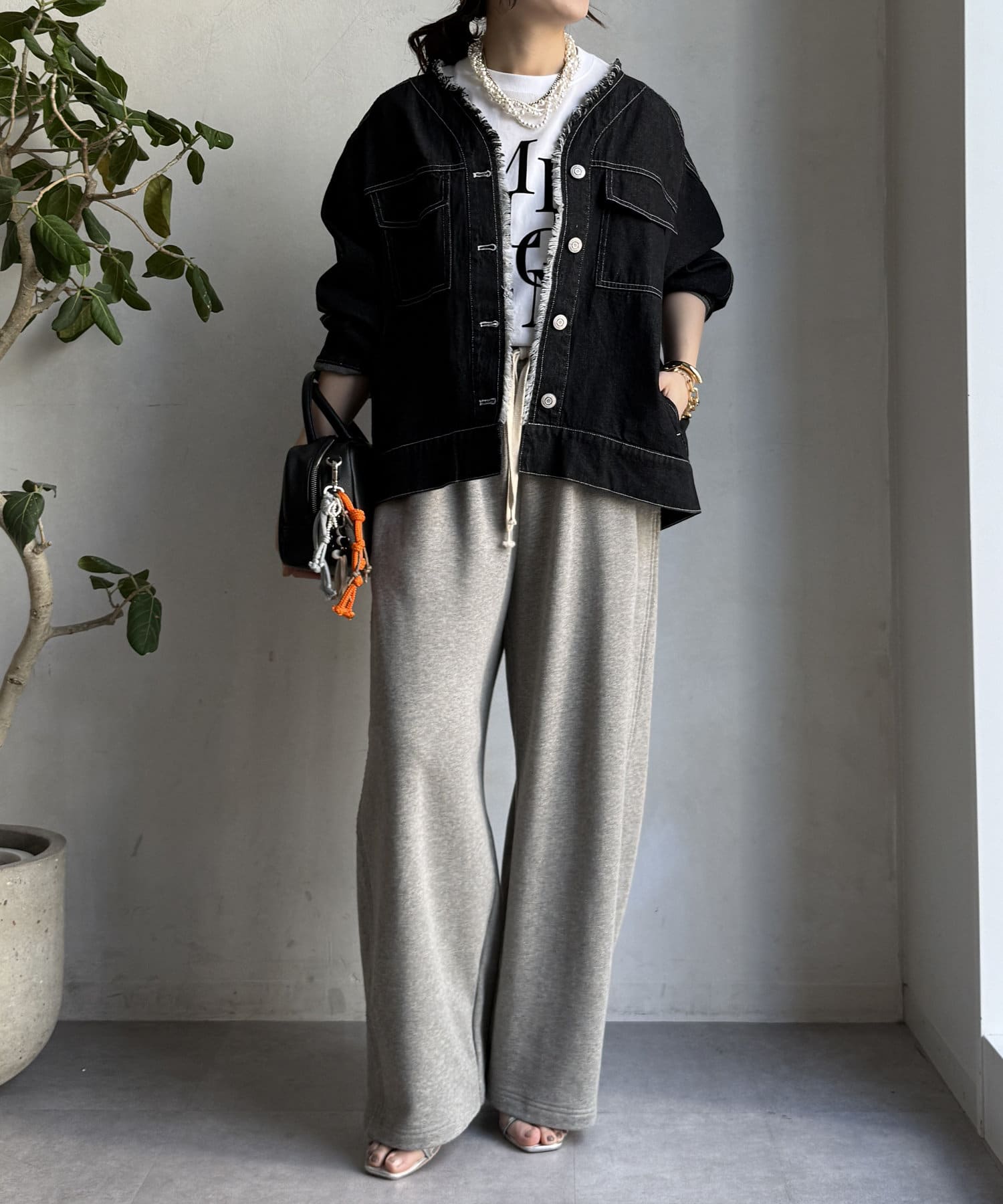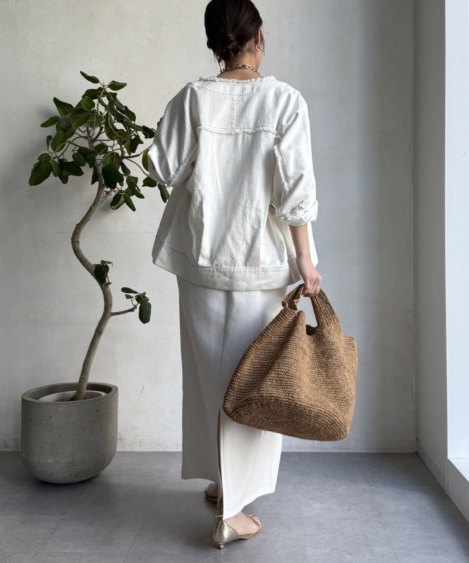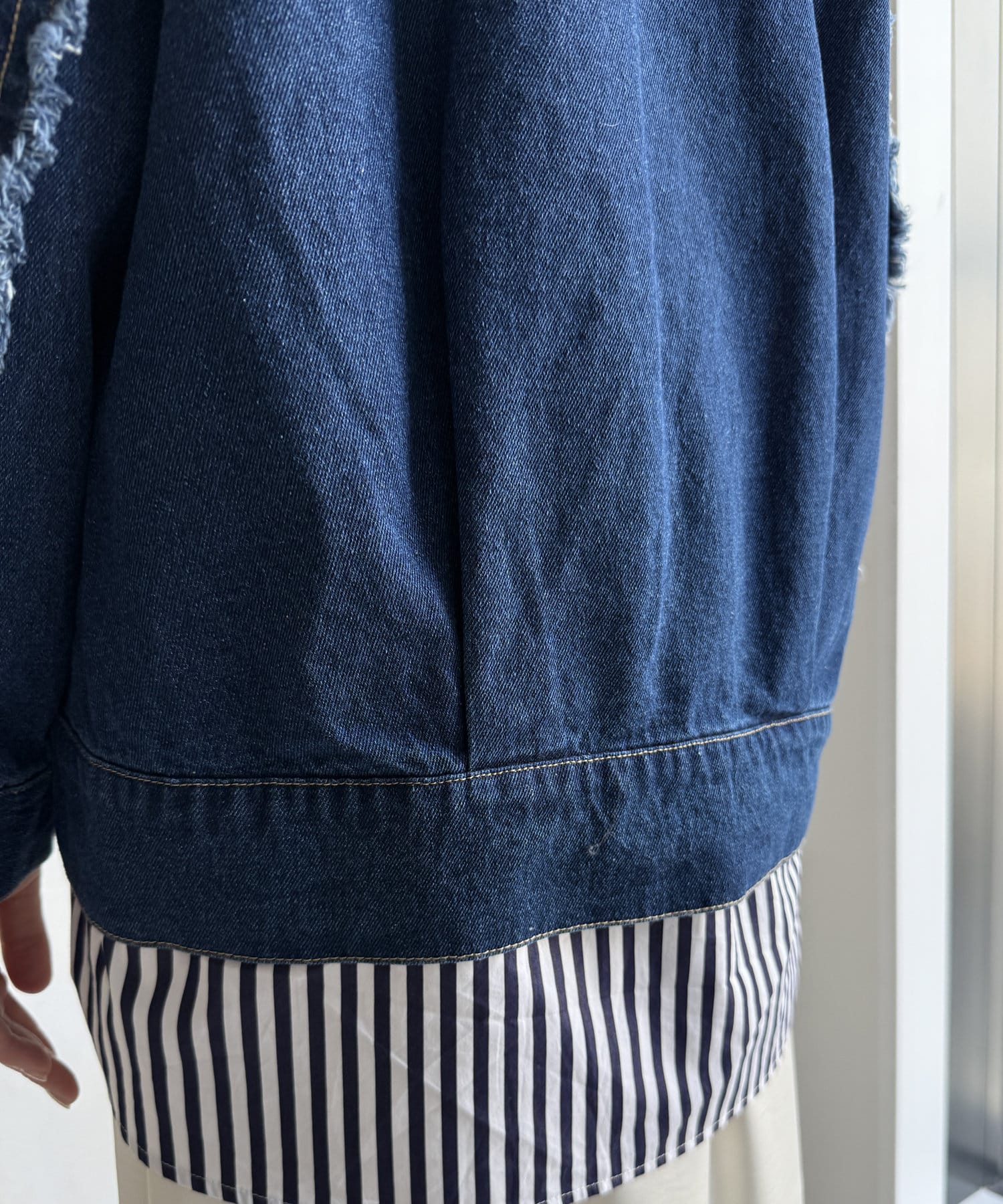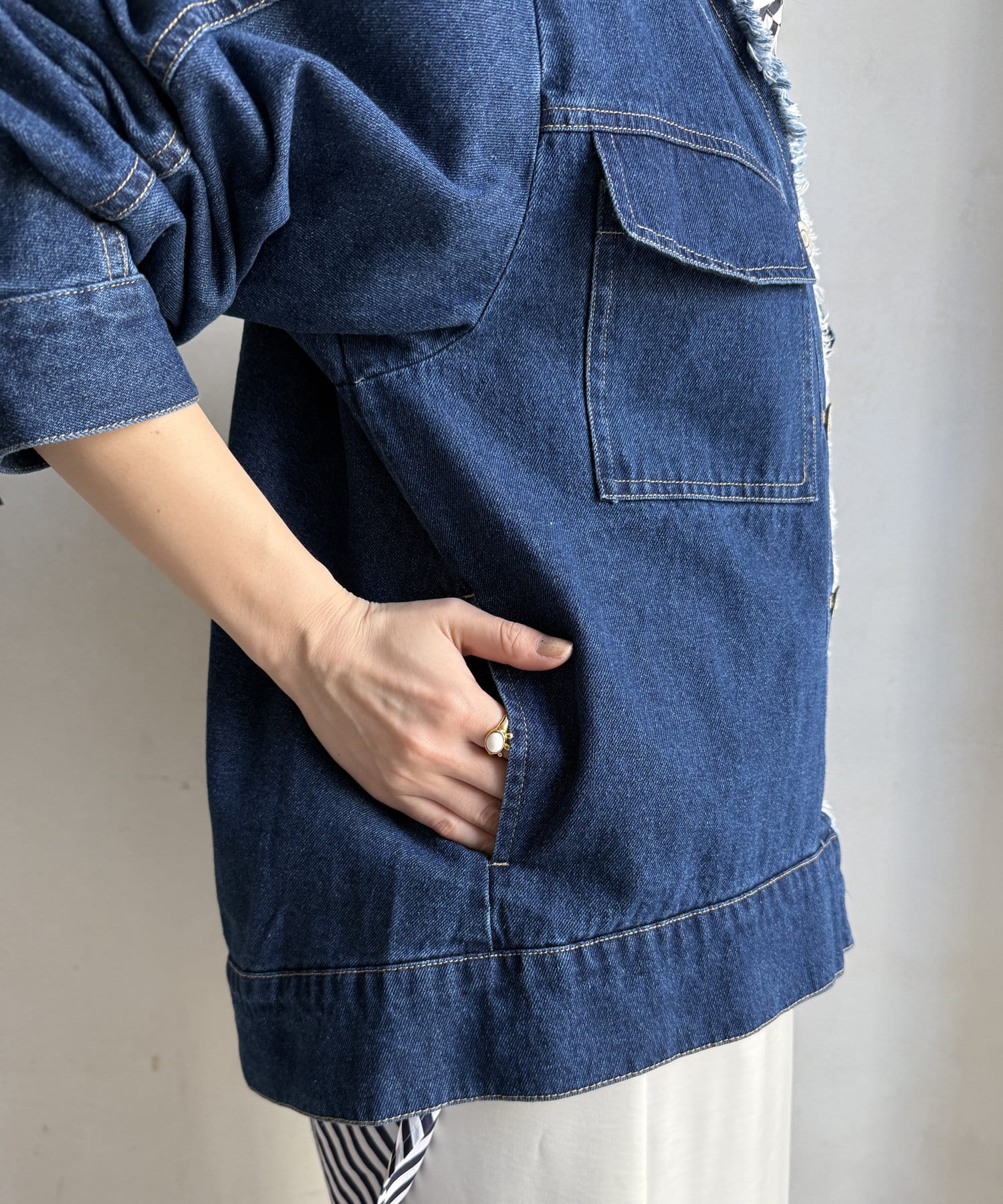 カジュアルなデニムでも大人っぽく。ノーカラーフリンジジャケット