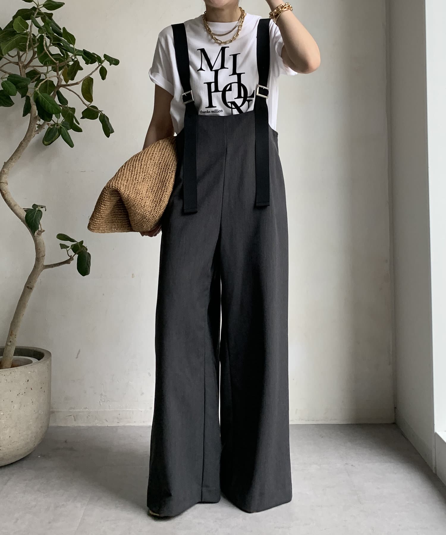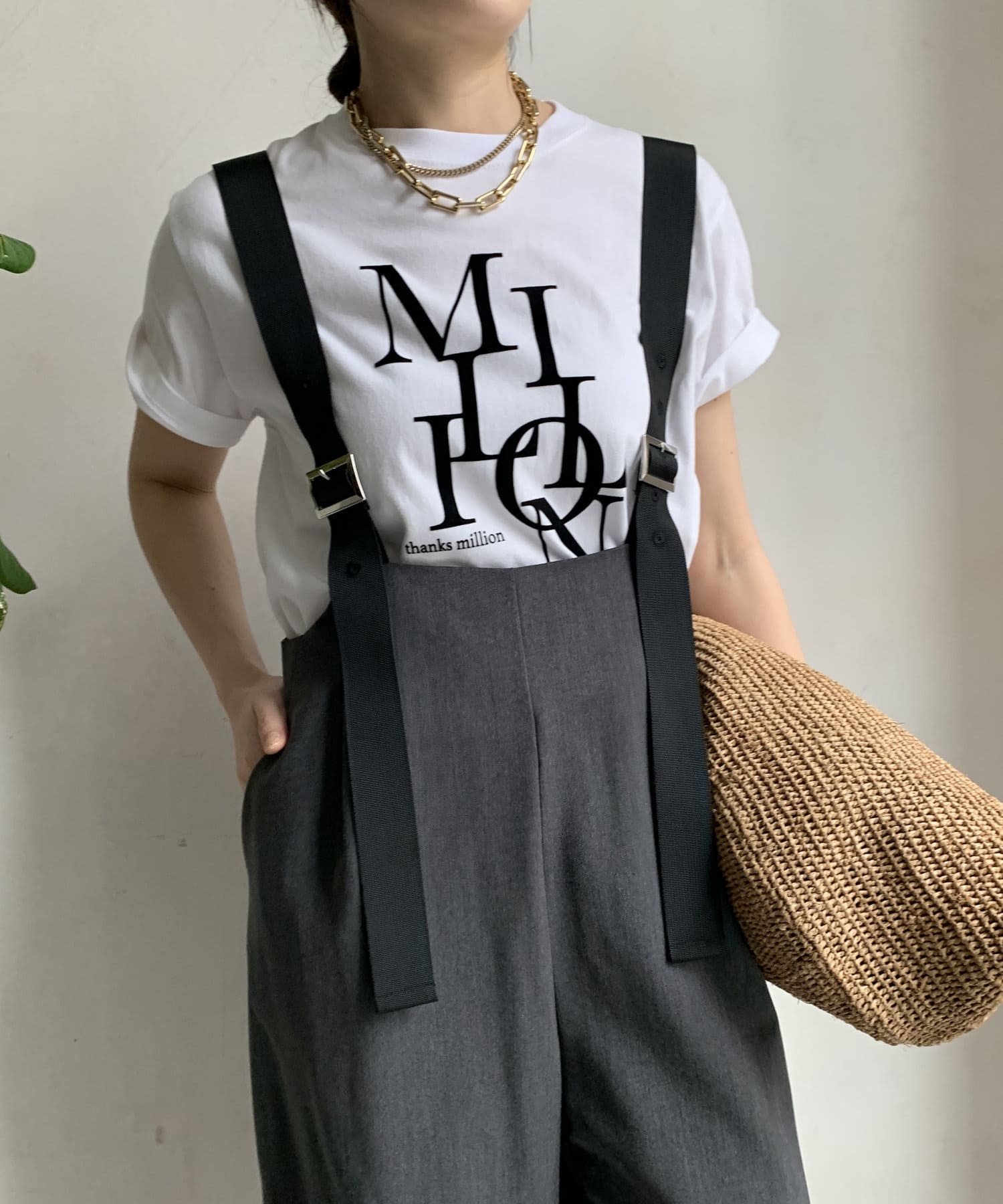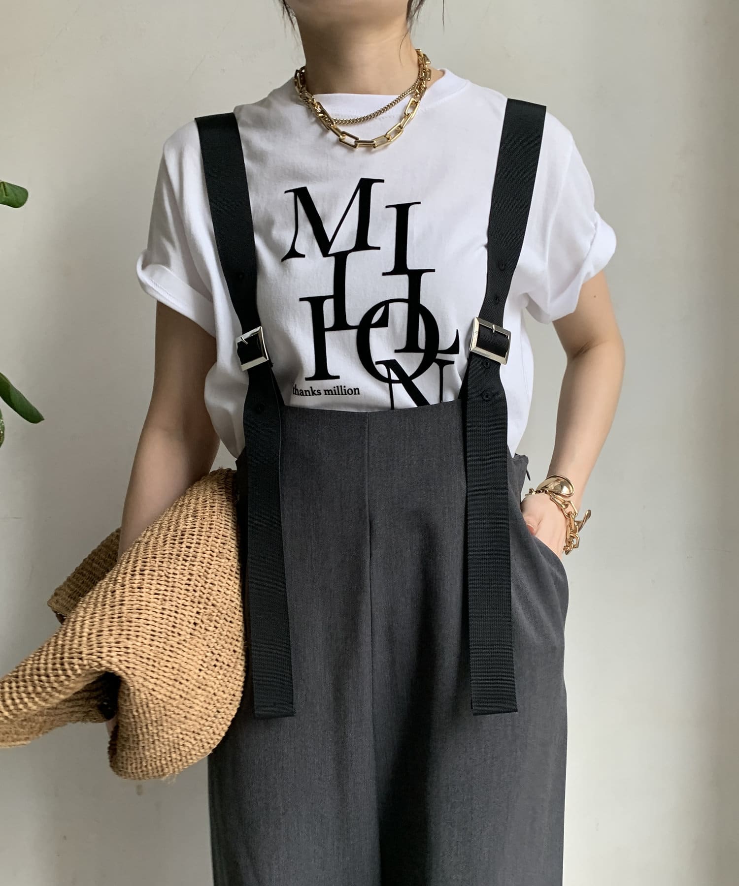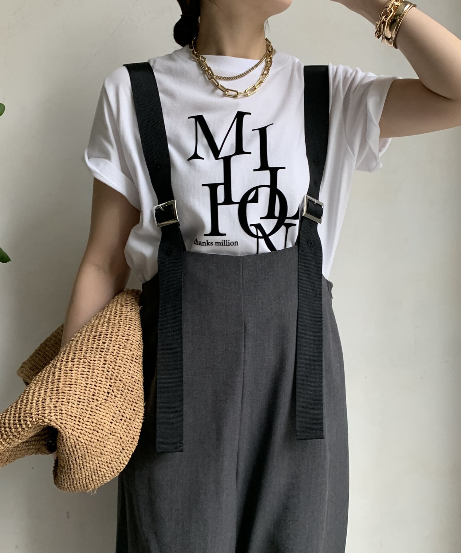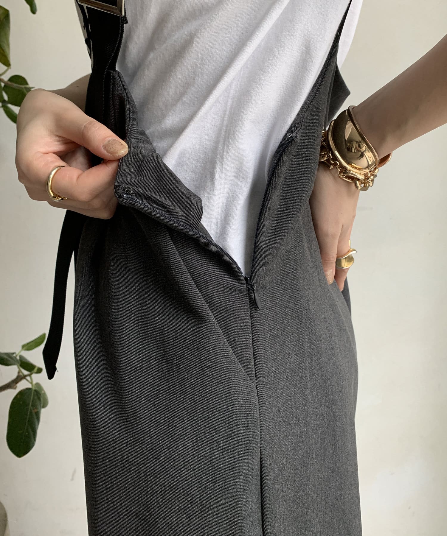程よいワイドシルエットなので身体のラインを拾いすぎず、肩紐で長さを調整できるのも嬉しいポイントです。