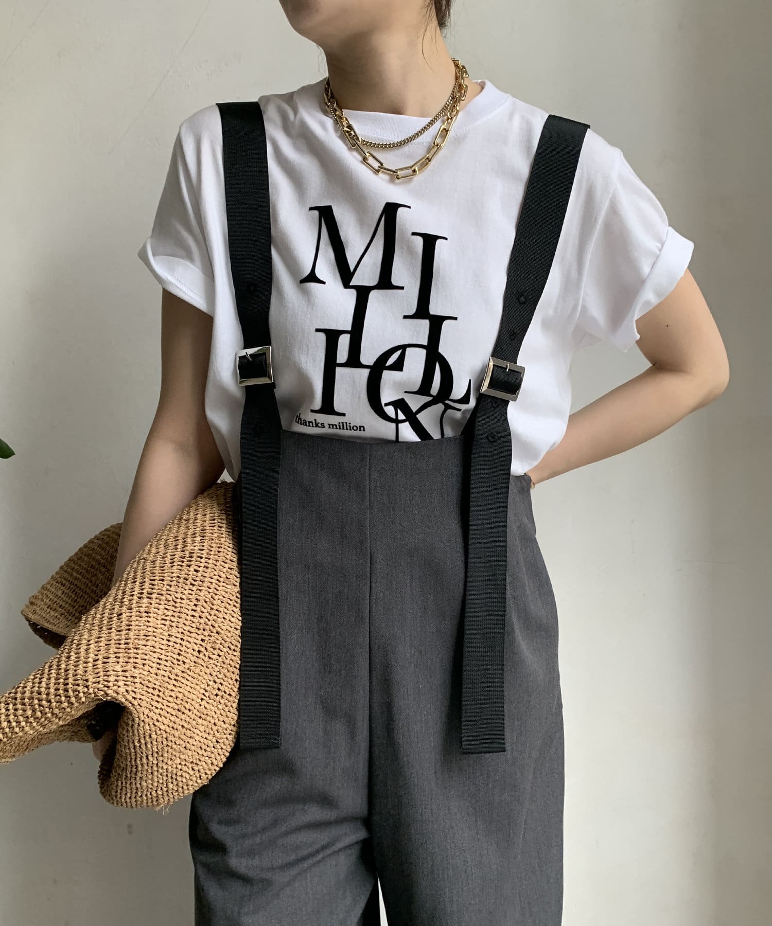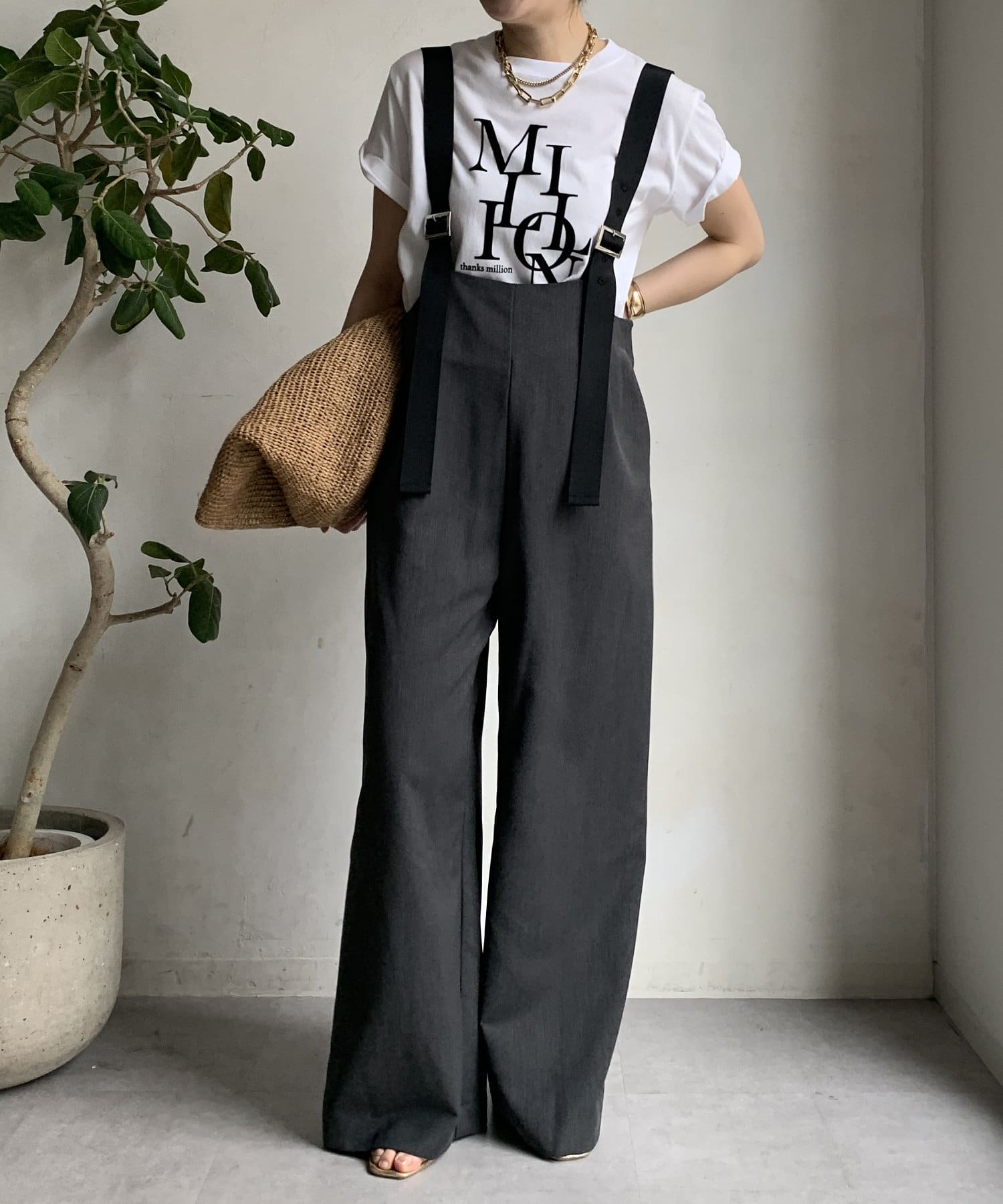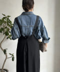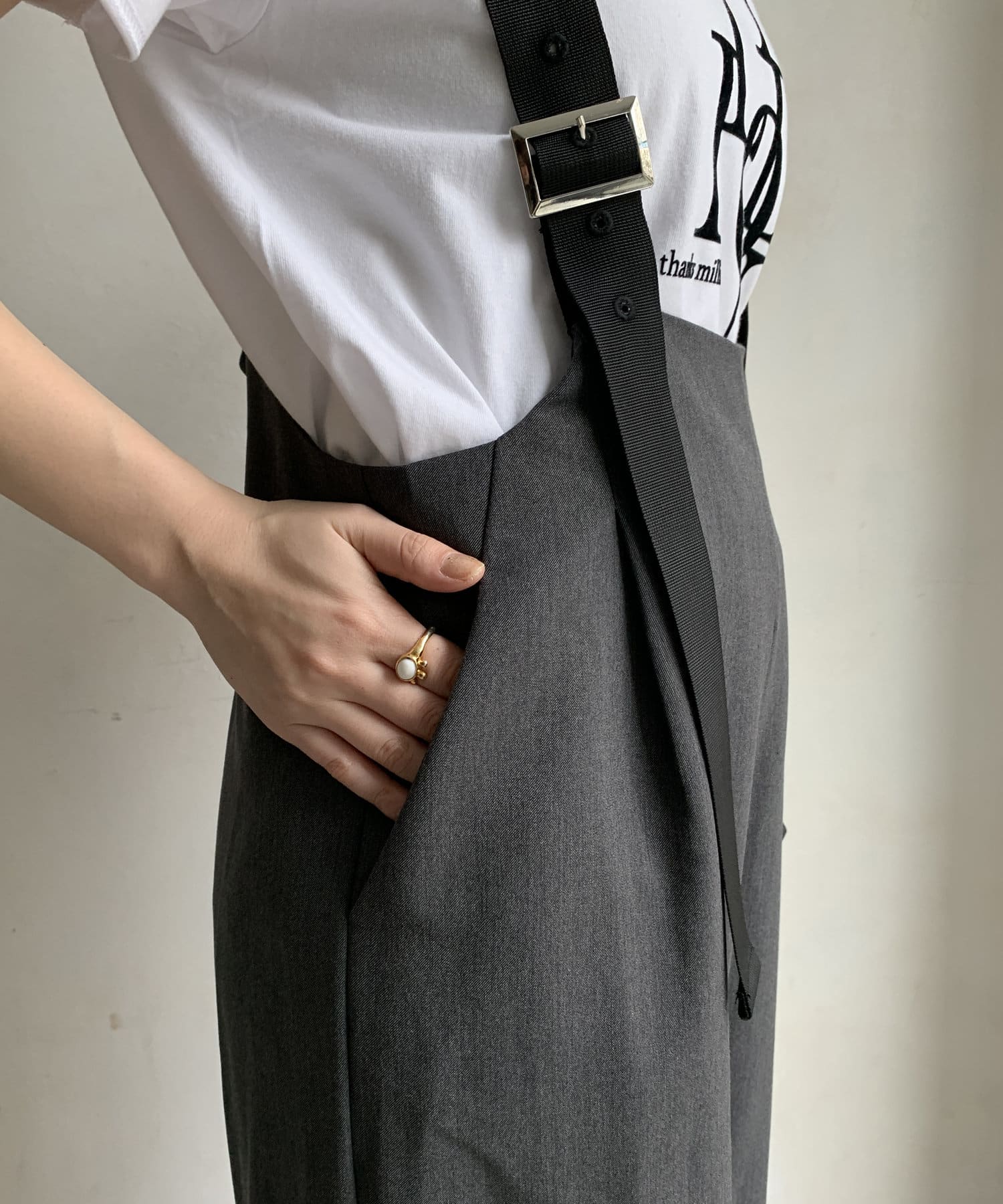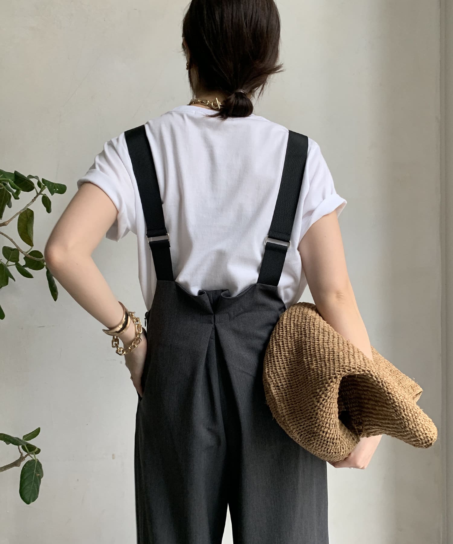 程よいワイドシルエットなので身体のラインを拾いすぎず、肩紐で長さを調整できるのも嬉しいポイントです。
