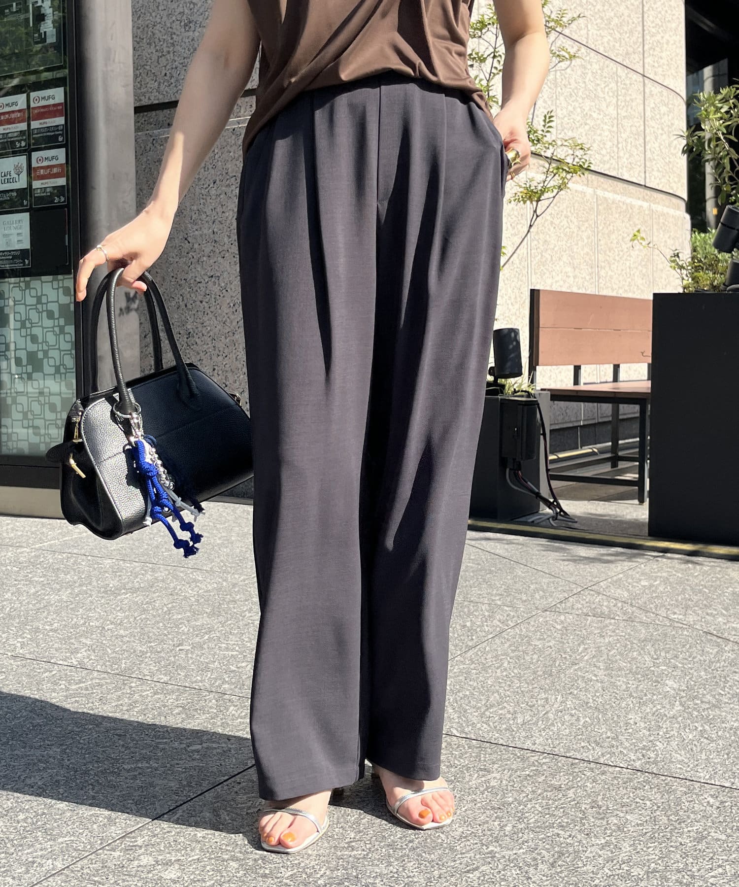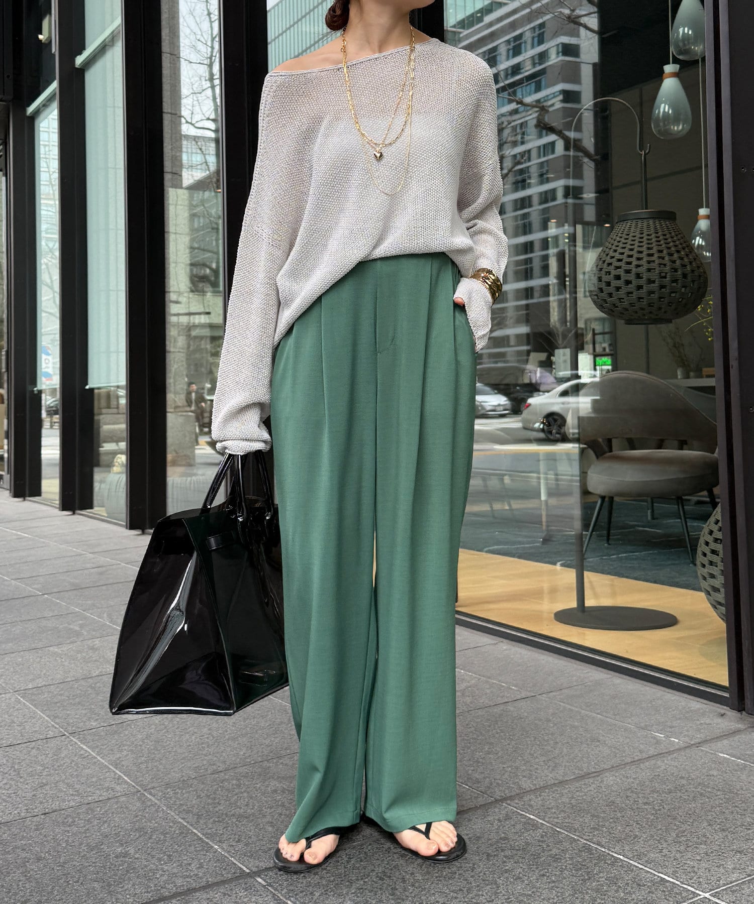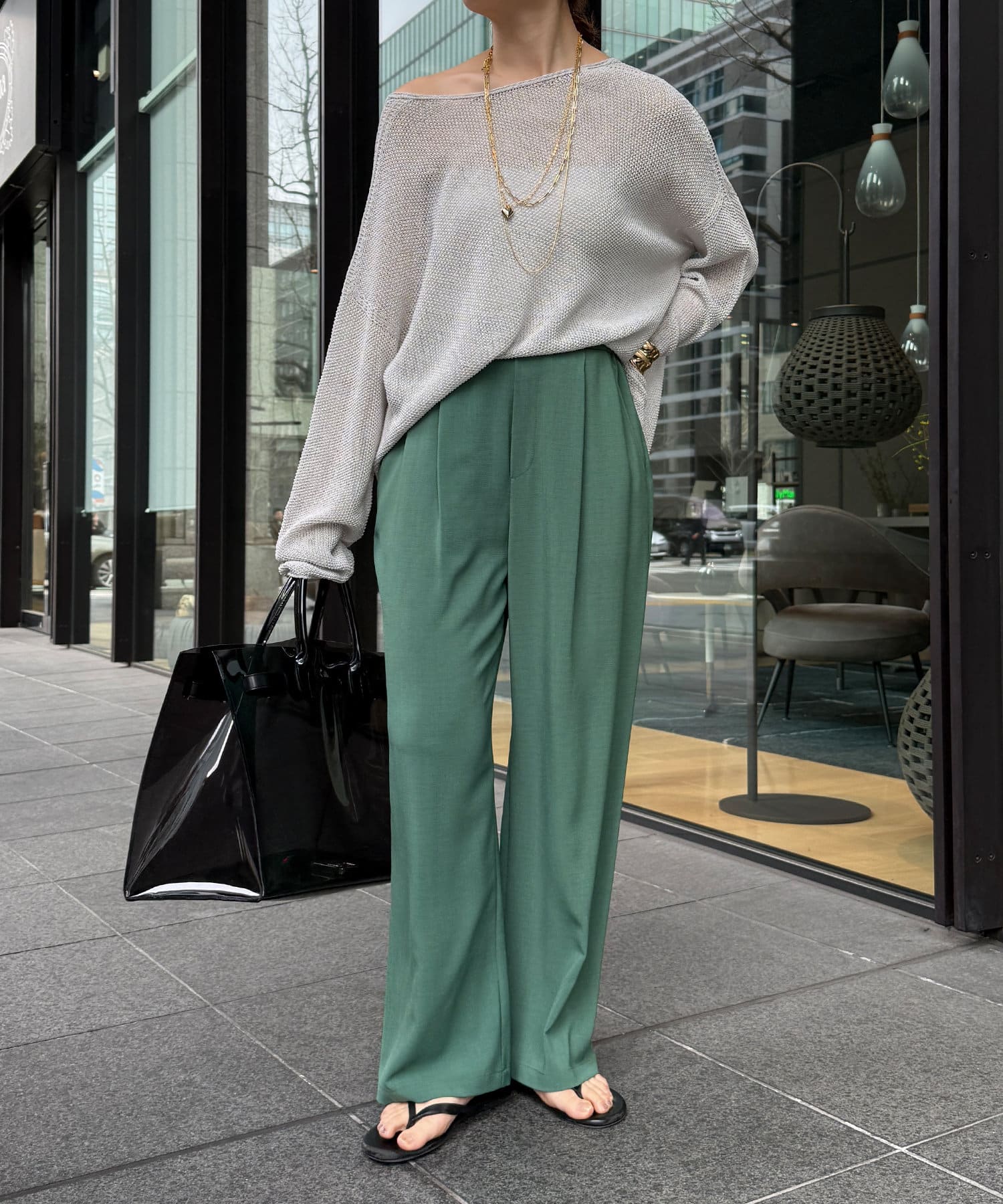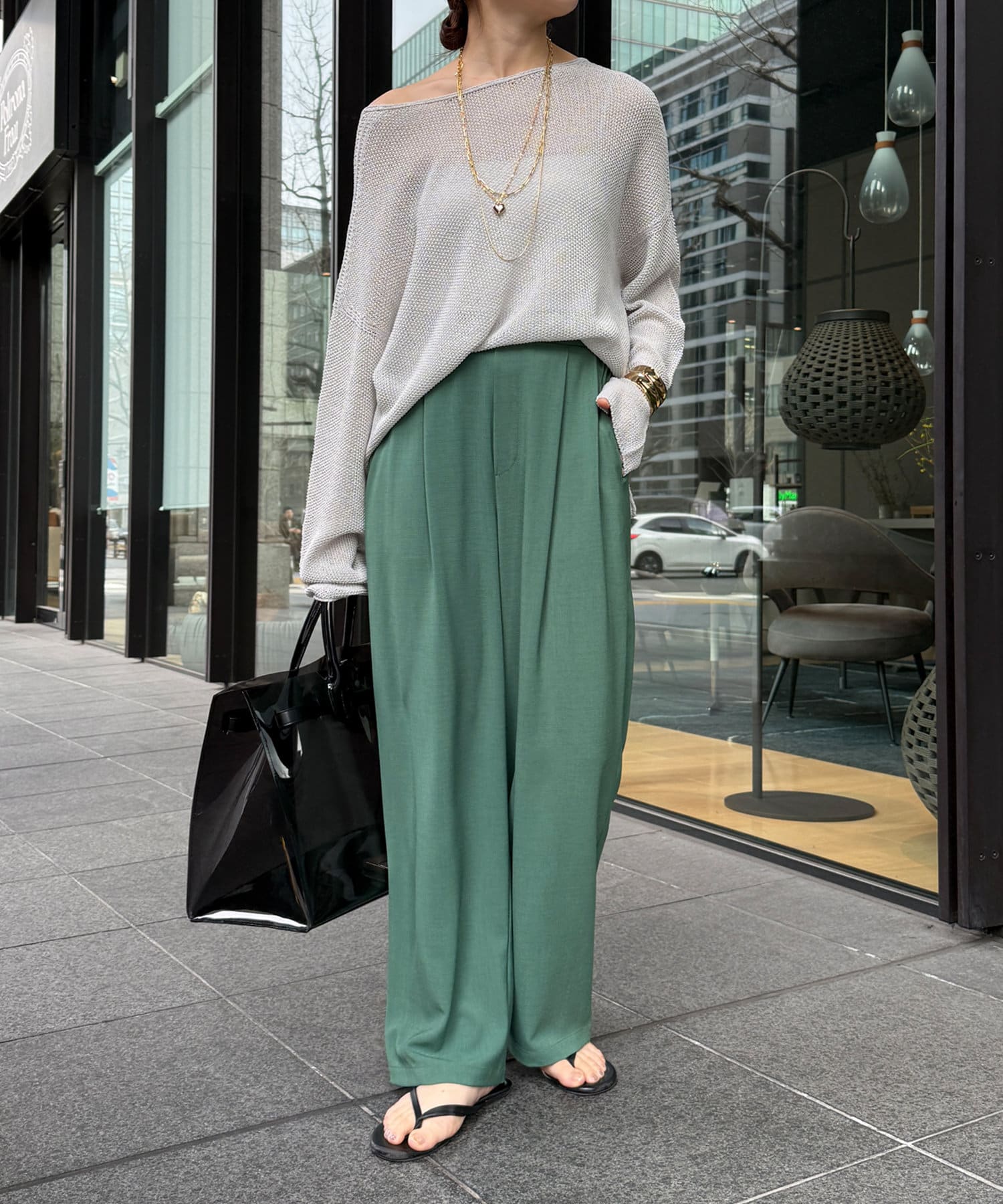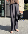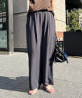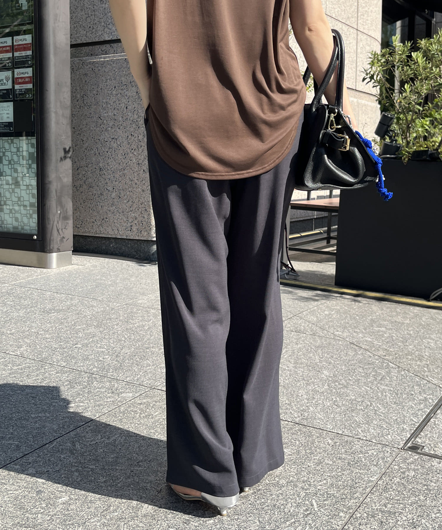 ワイドなシルエットは、脚のラインを拾わずイージー。