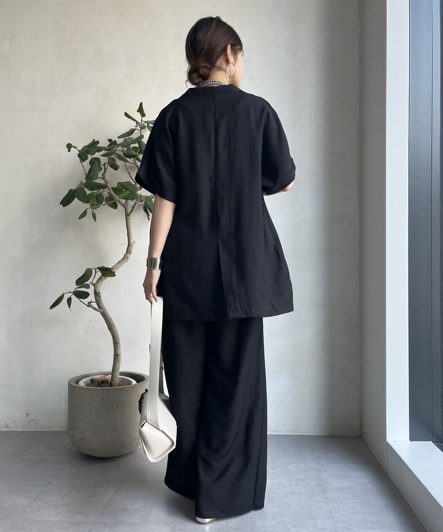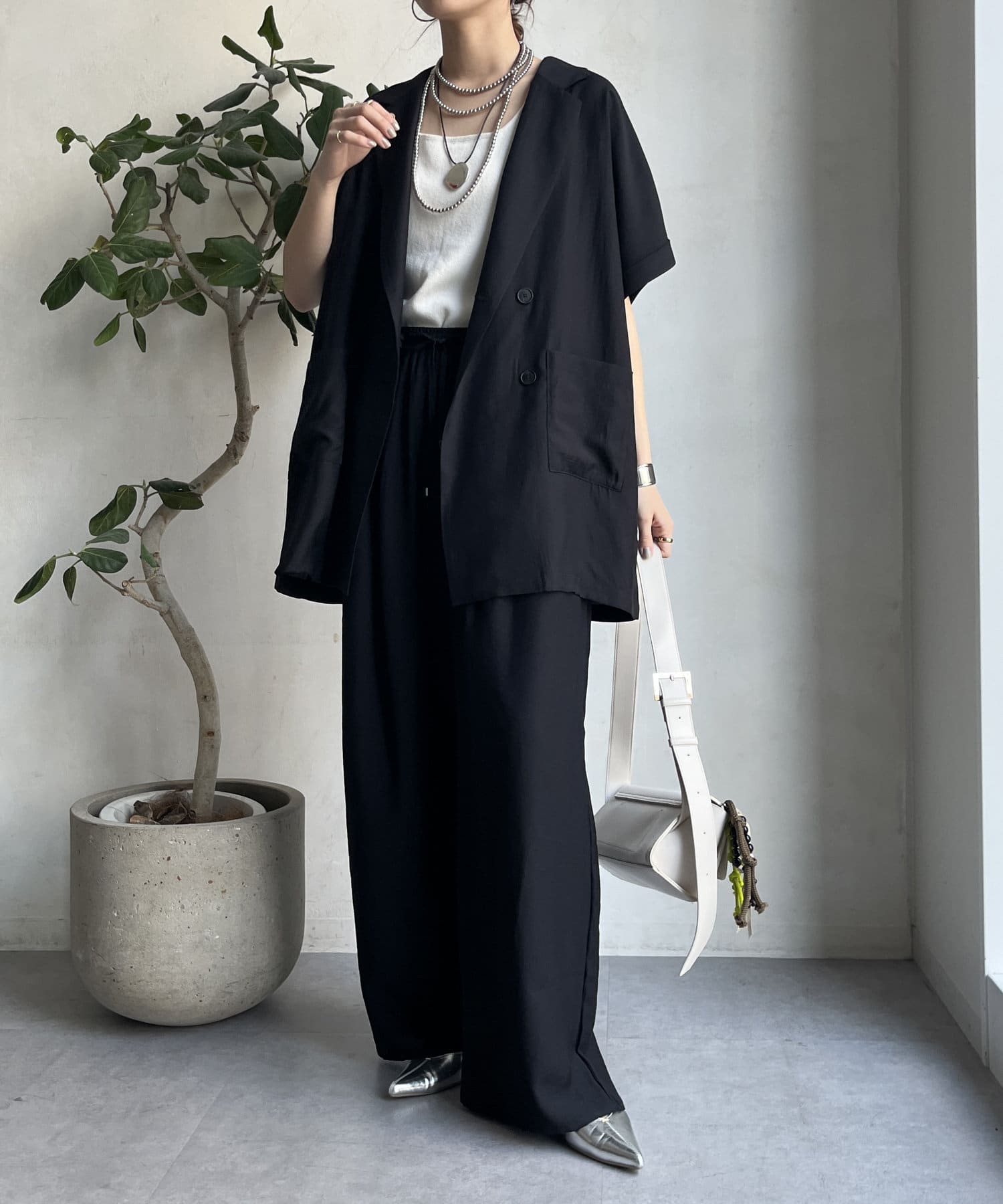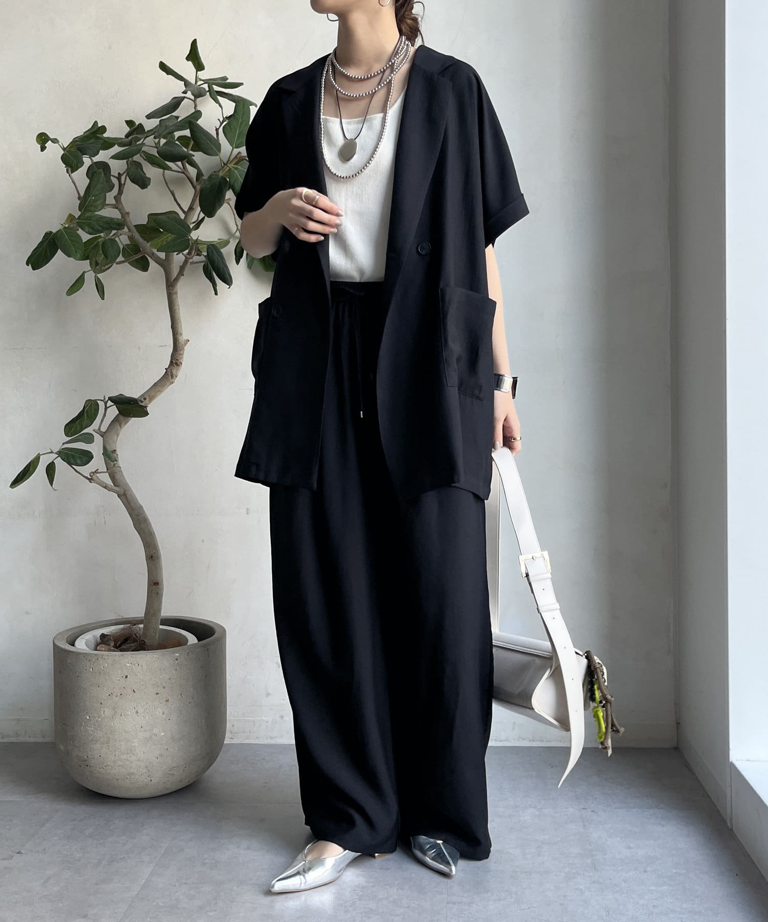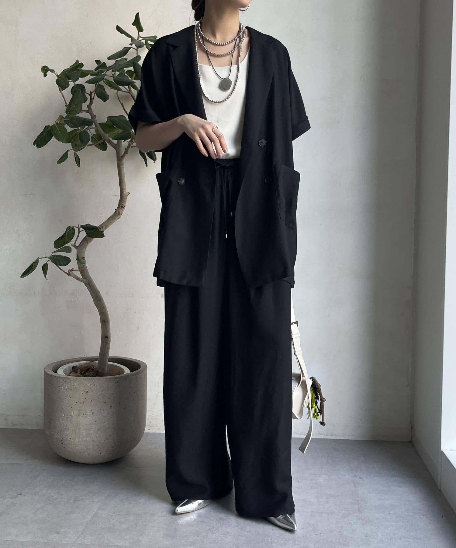 同素材のジャケット(【WEB限定】ショートスリーブジャケット/DDZ1051307A0005)とのセットアップコーデもおススメです。
