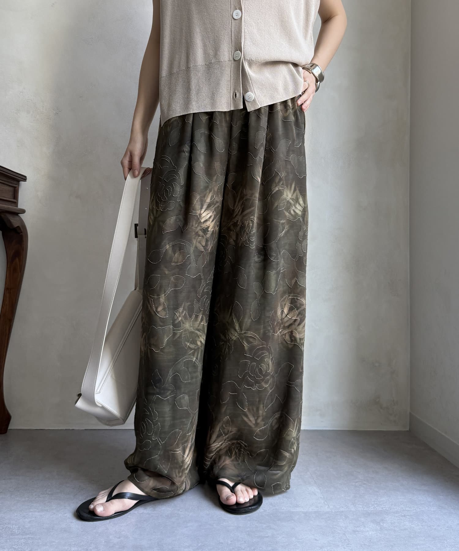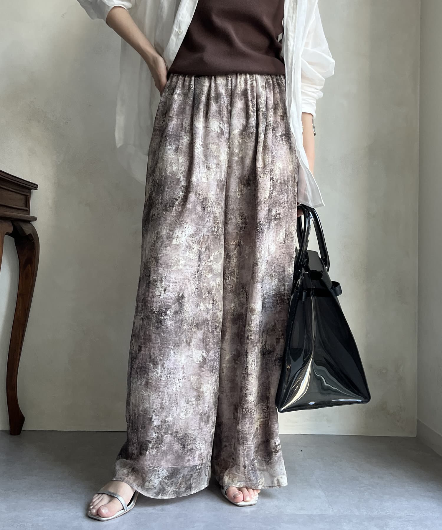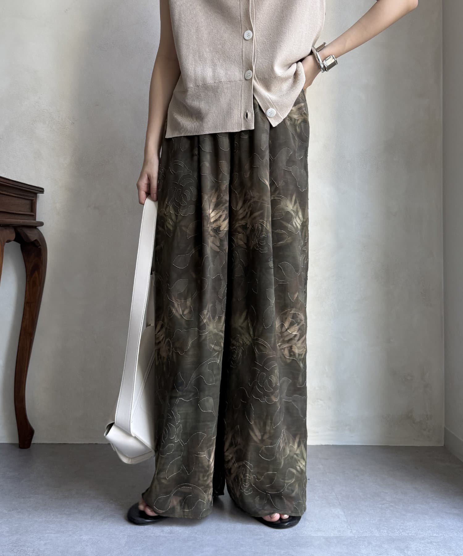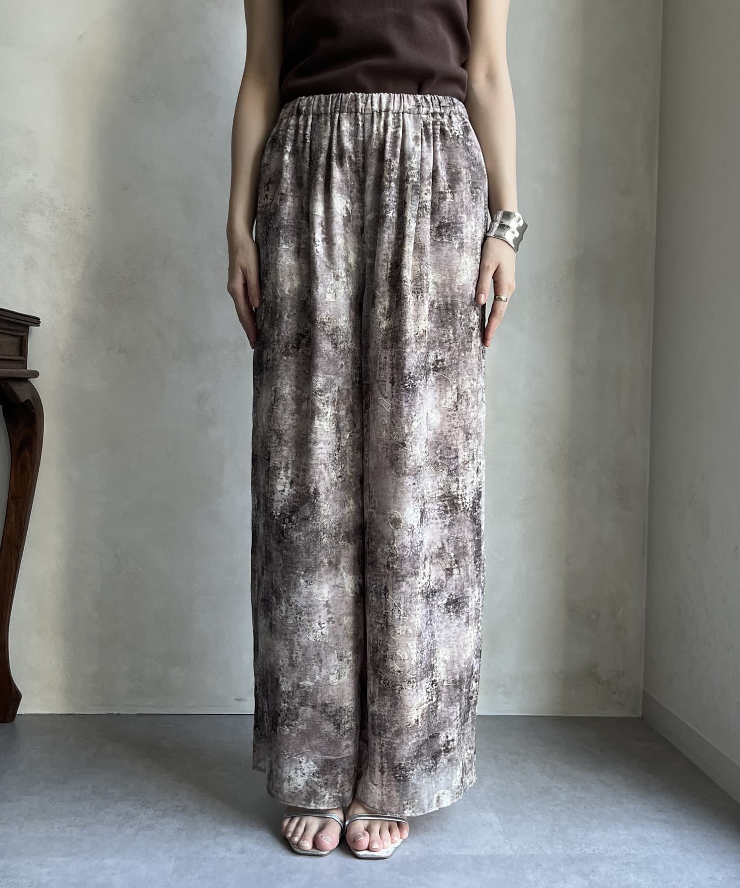 柄になったカットジャガードにプリントを施した、生地が特徴的なイージーワイドパンツです。