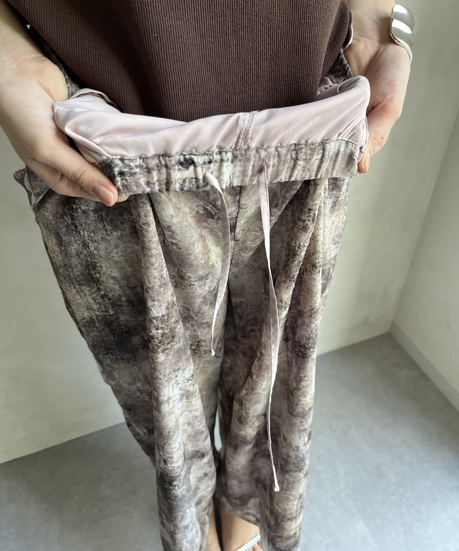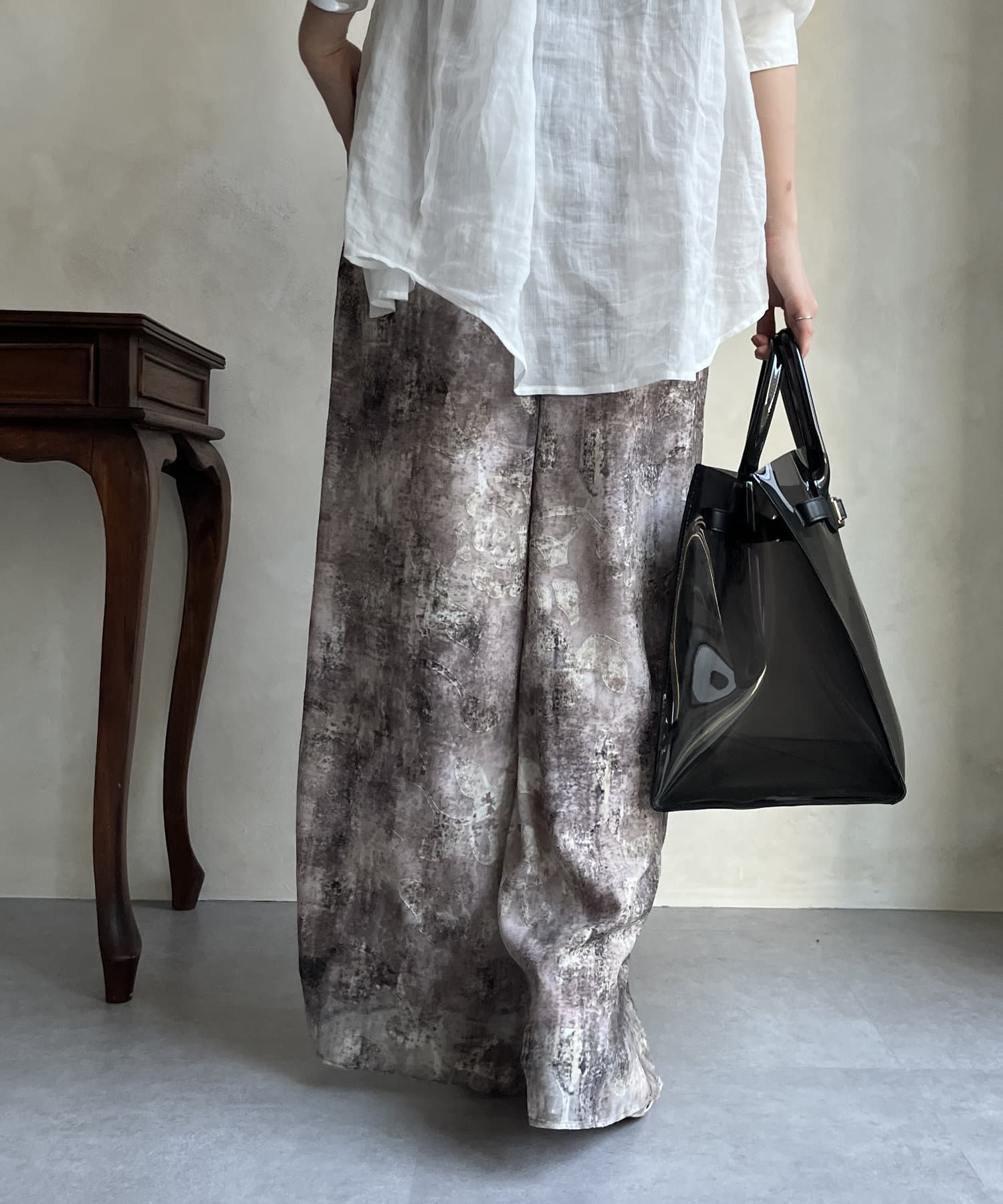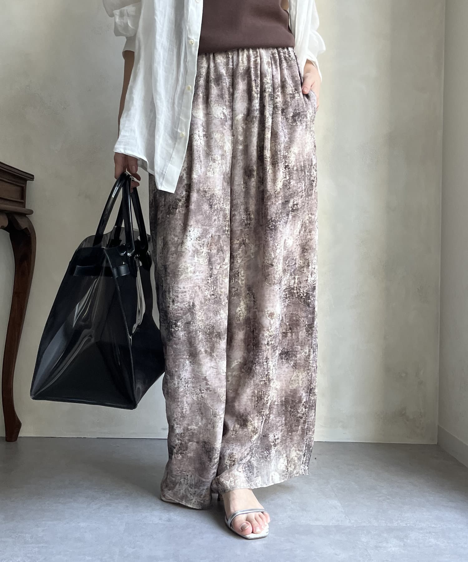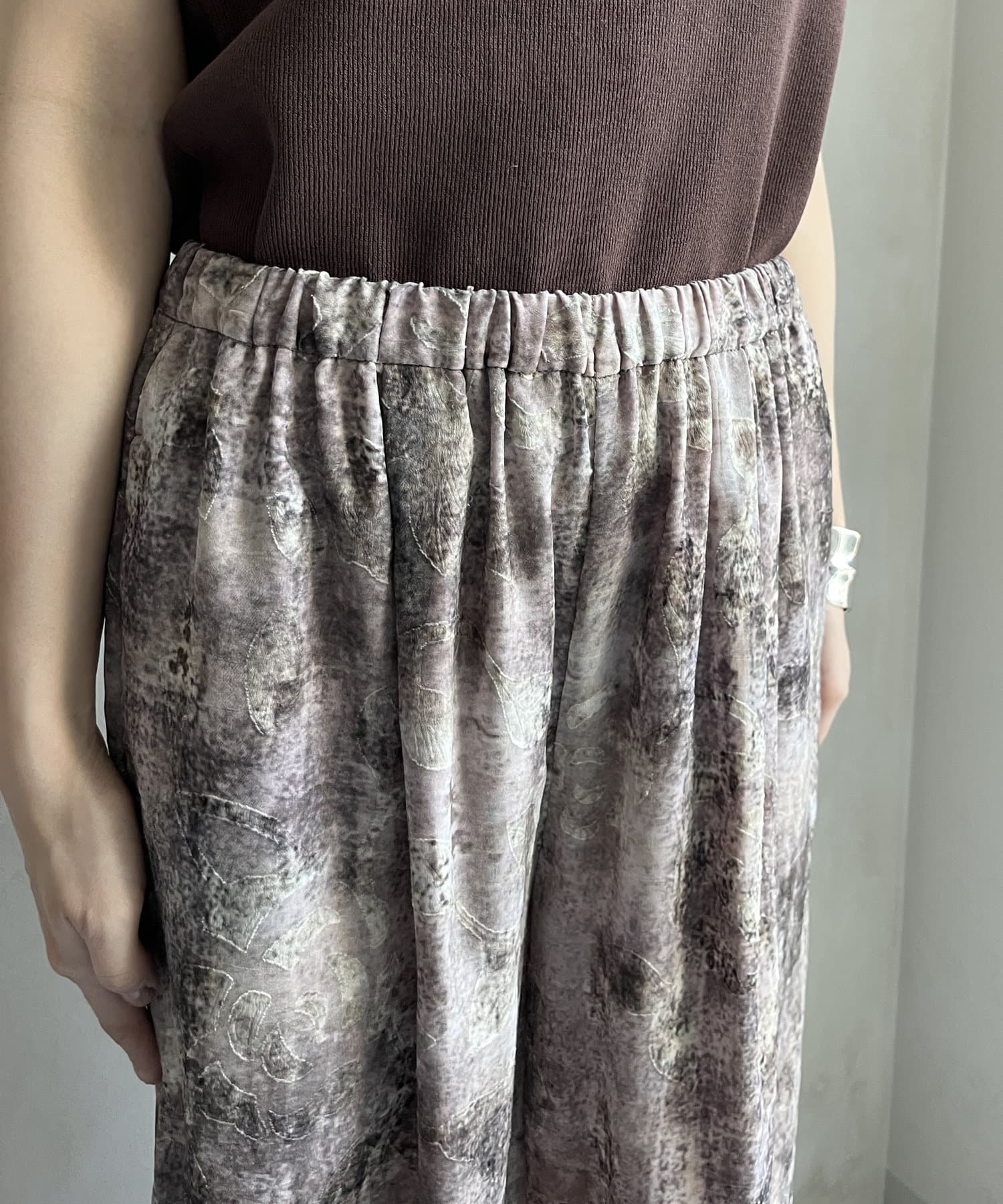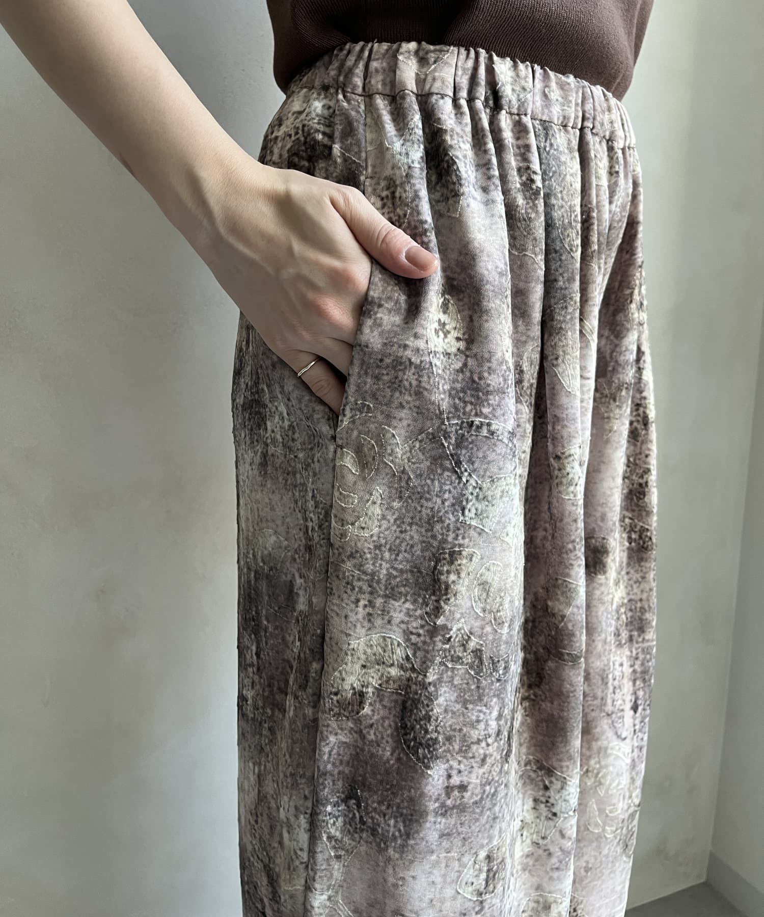 柄になったカットジャガードにプリントを施した、生地が特徴的なイージーワイドパンツです。
