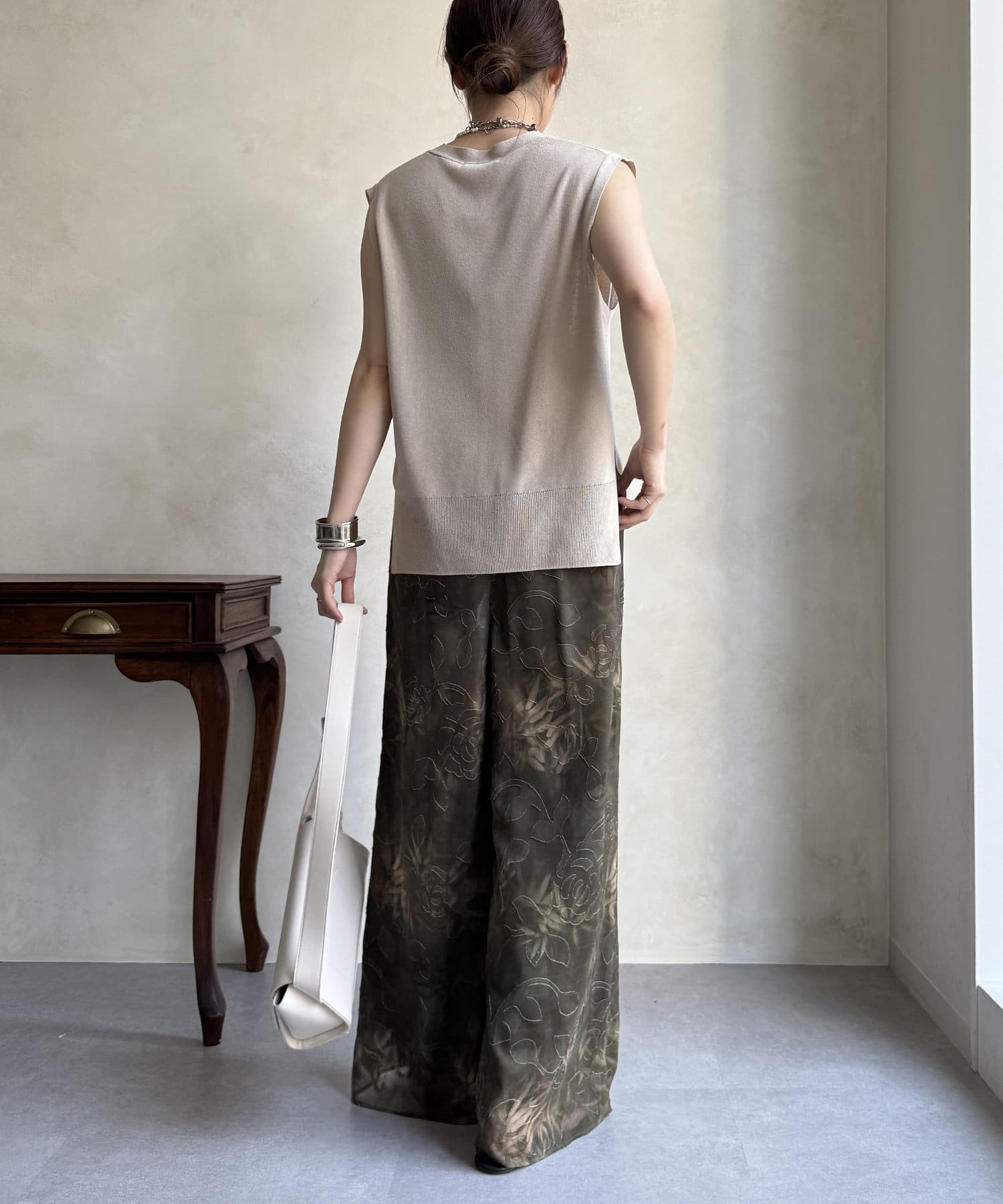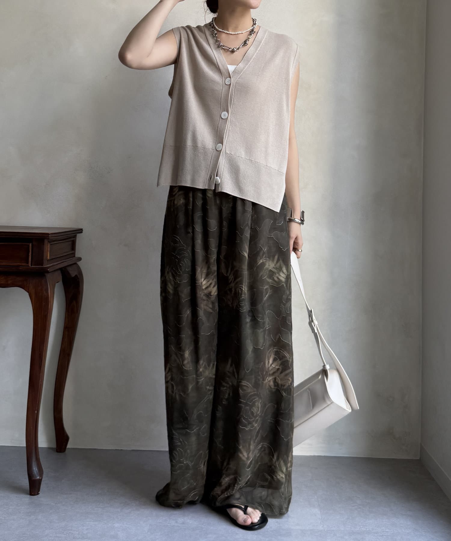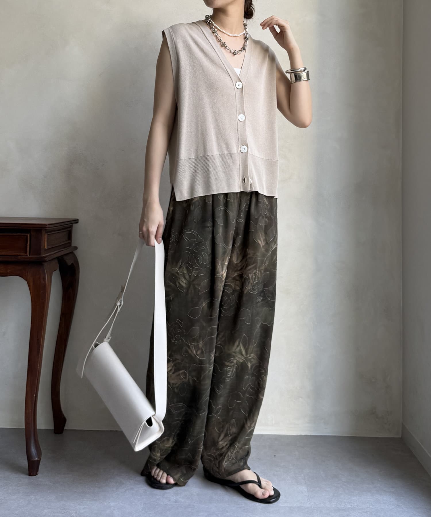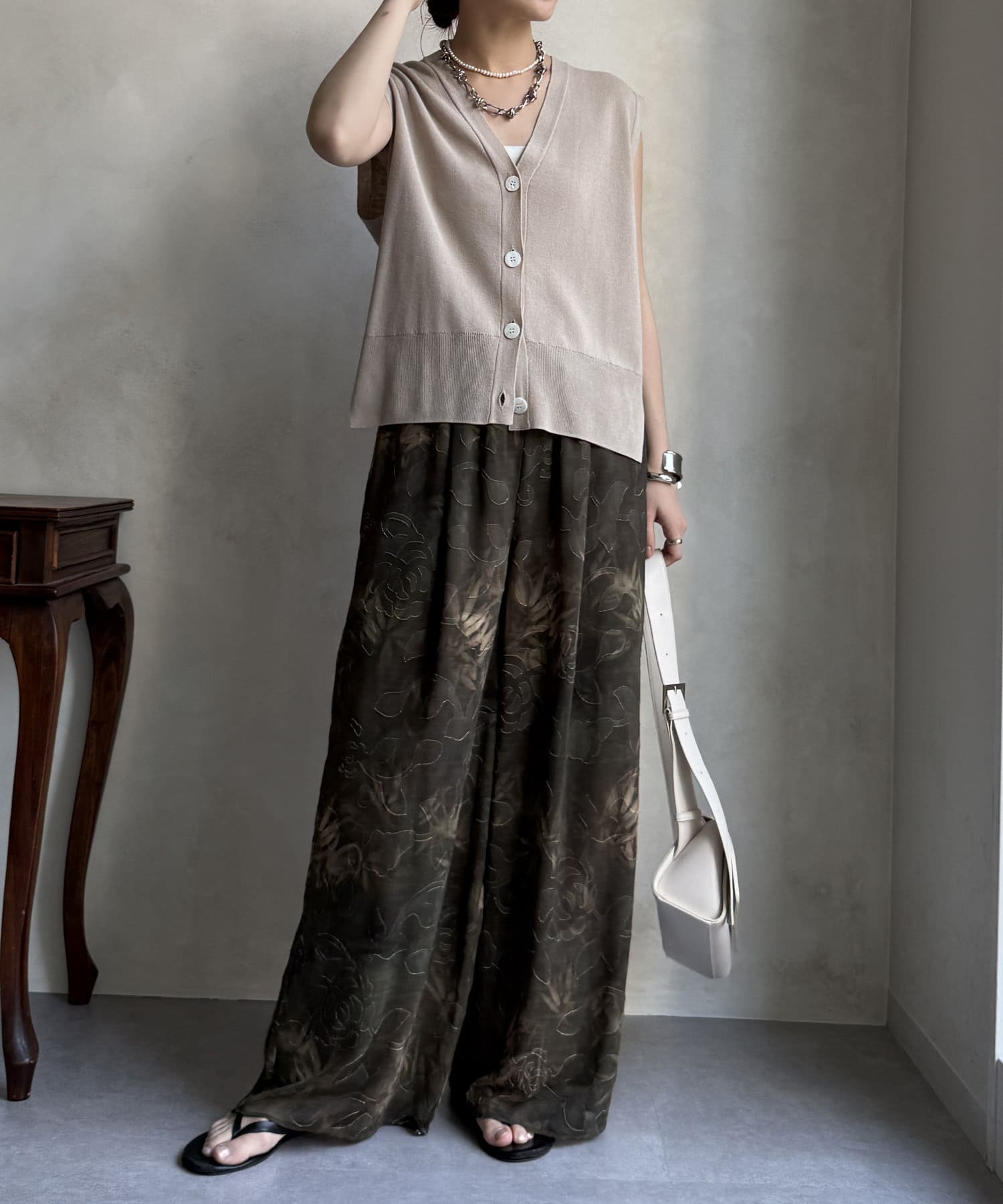 柄になったカットジャガードにプリントを施した、生地が特徴的なイージーワイドパンツです。