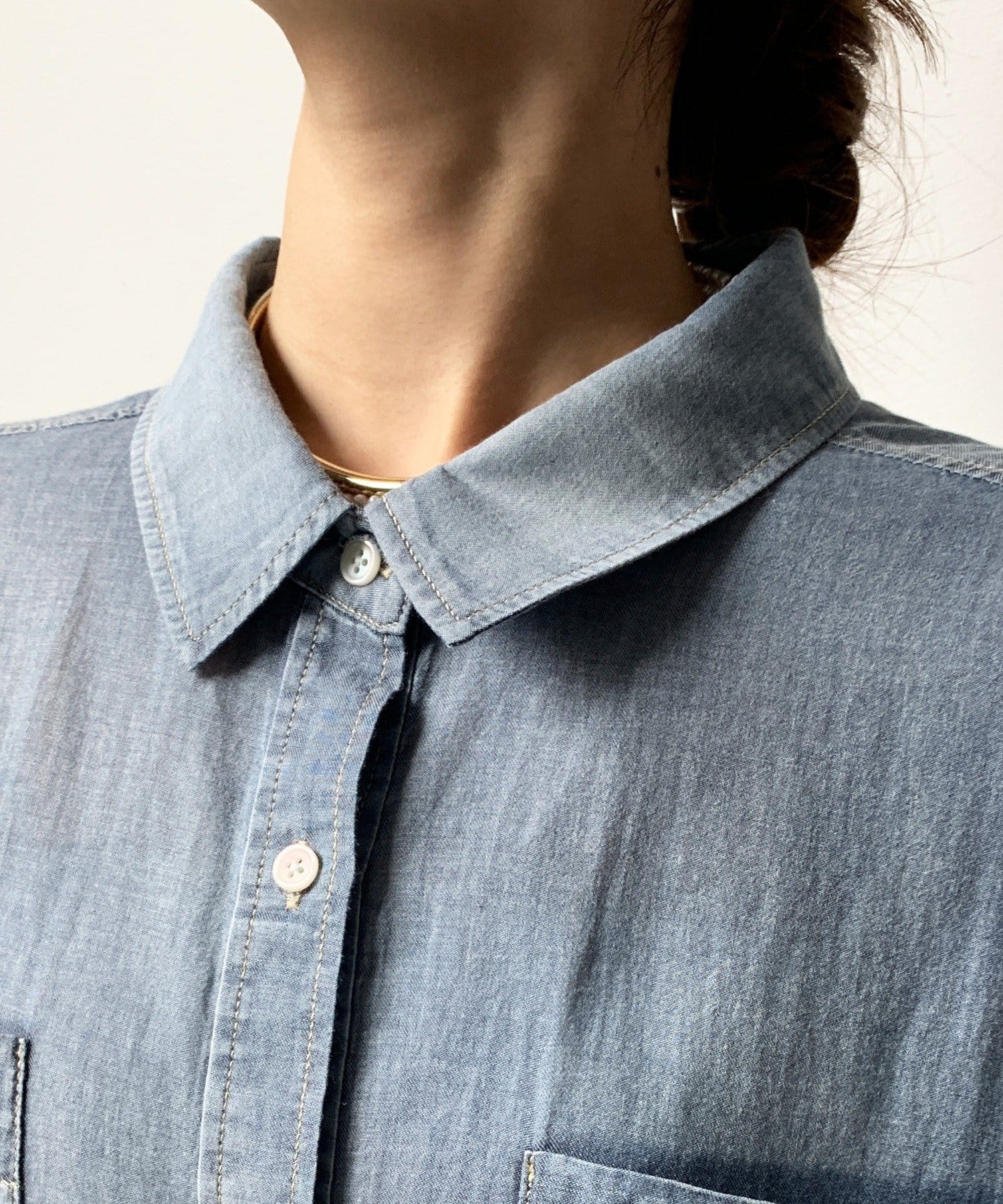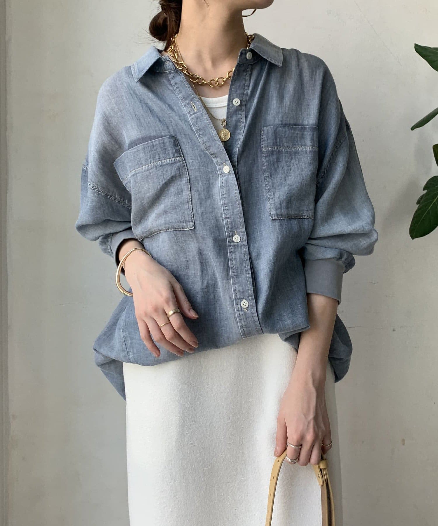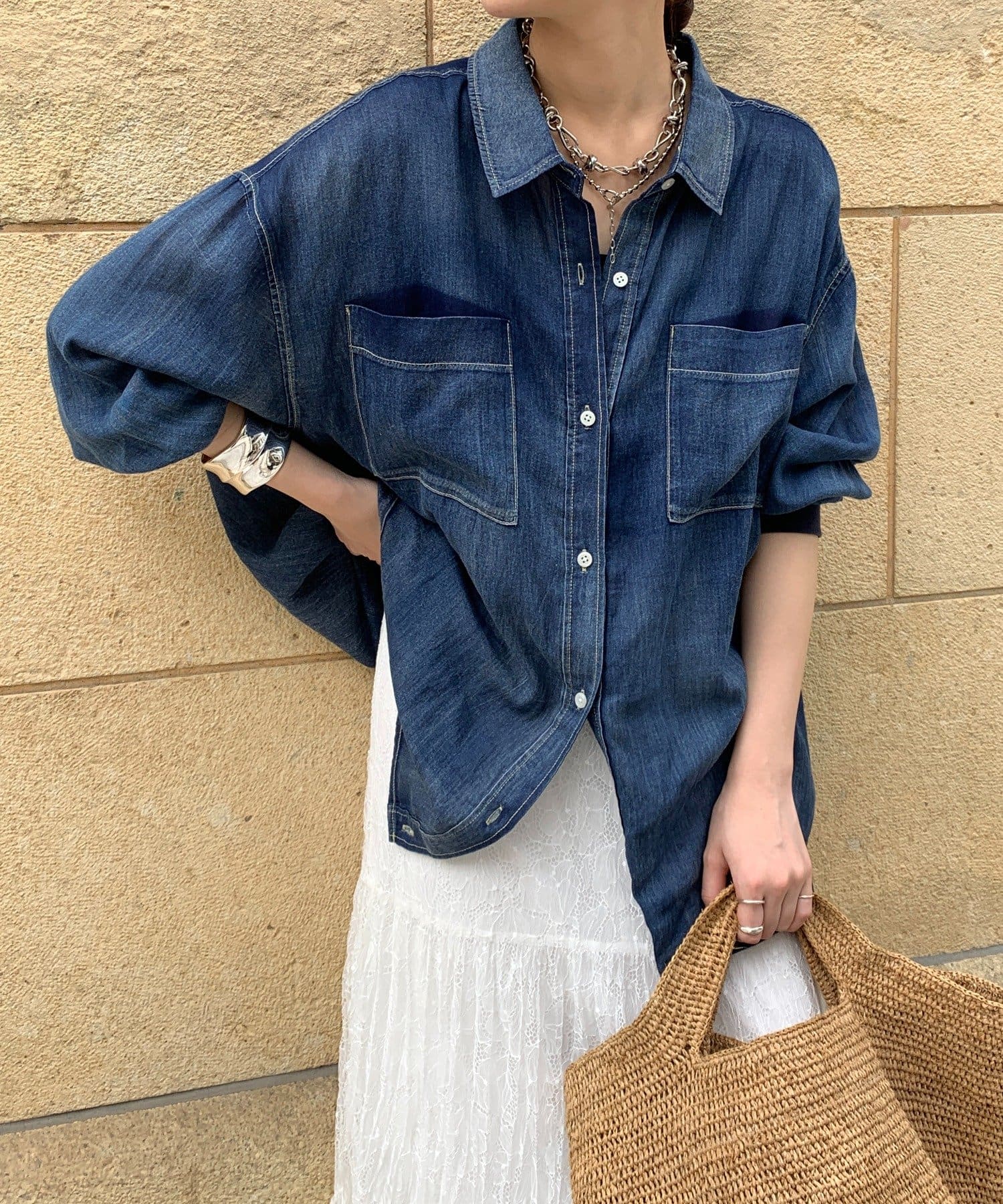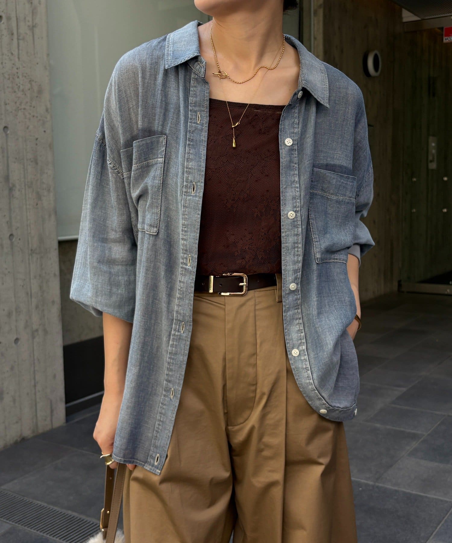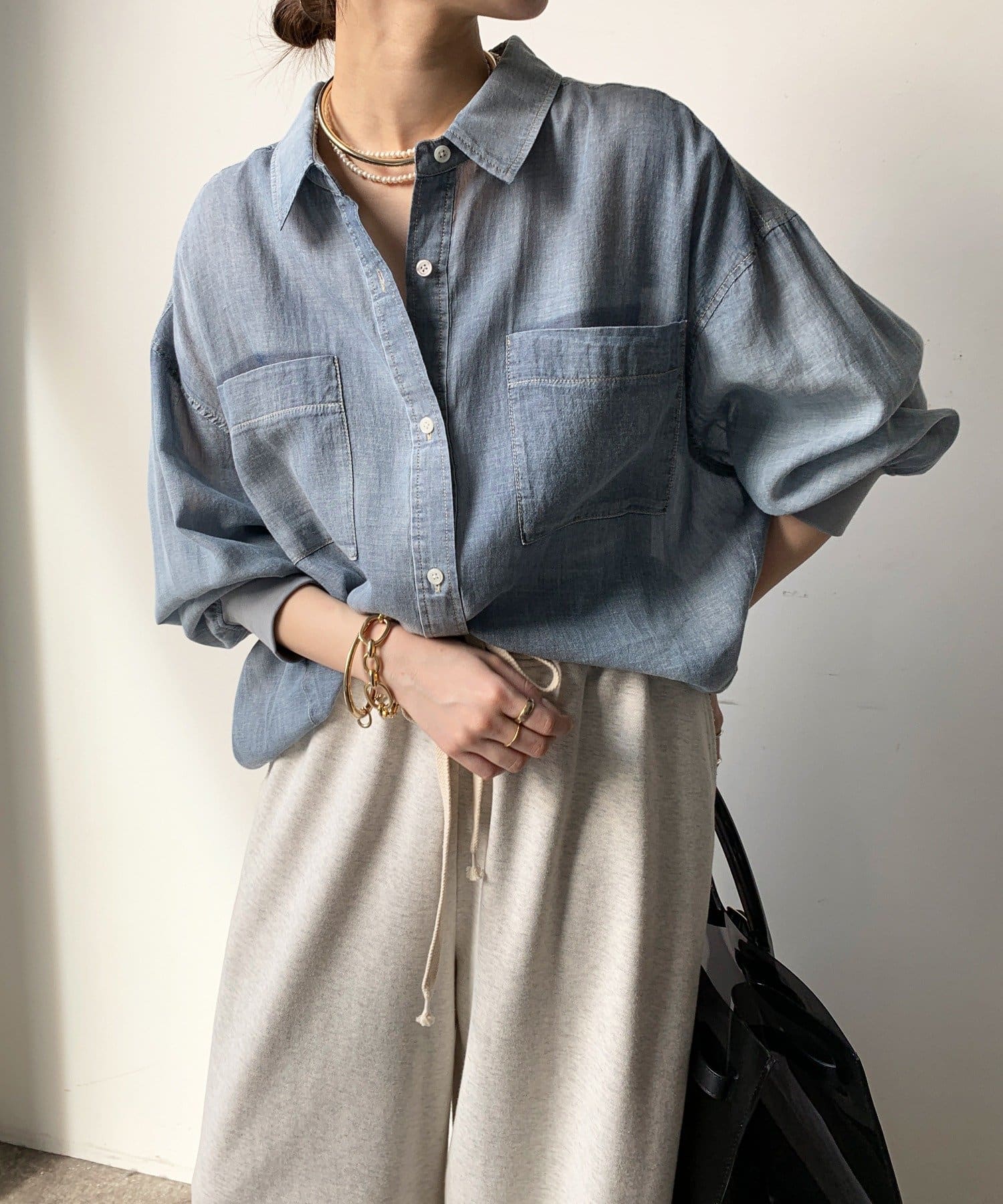 シアー感のあるデニムの素材で、新鮮に見せてくれるデニムシャツ。