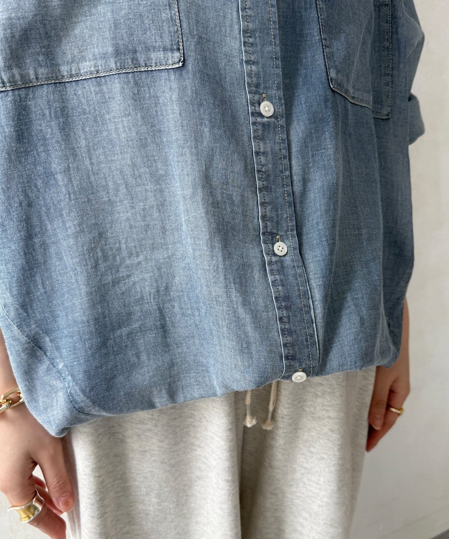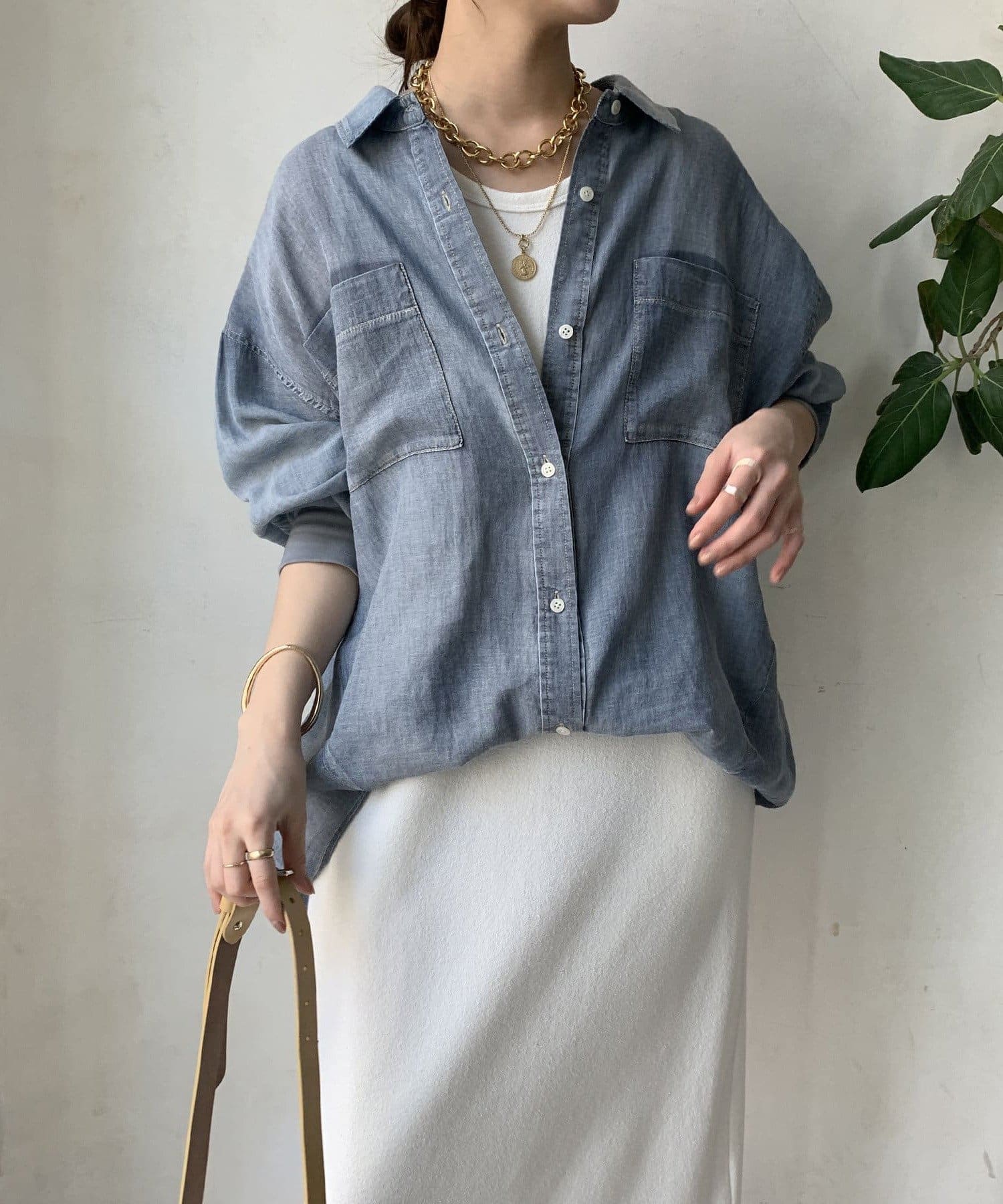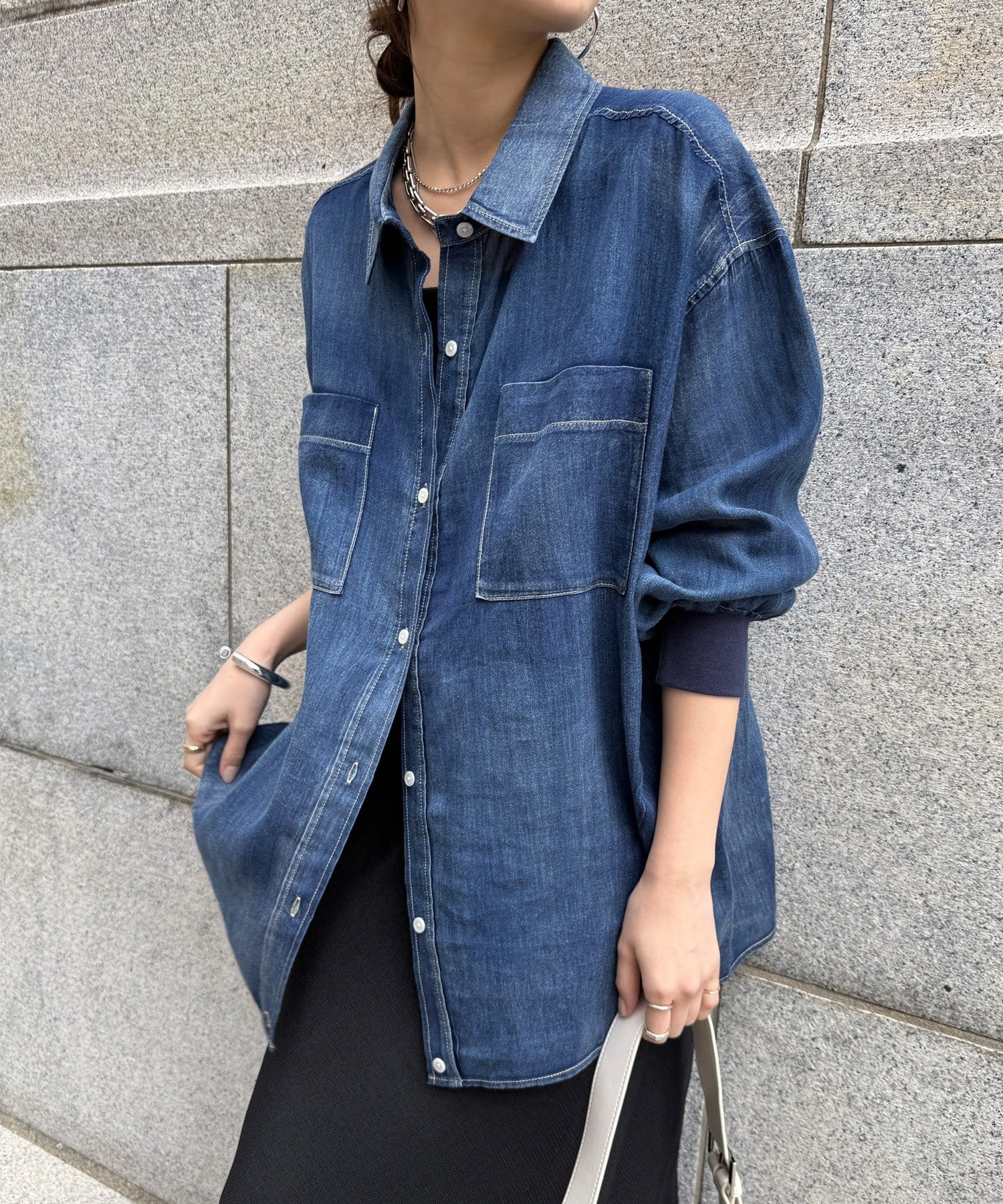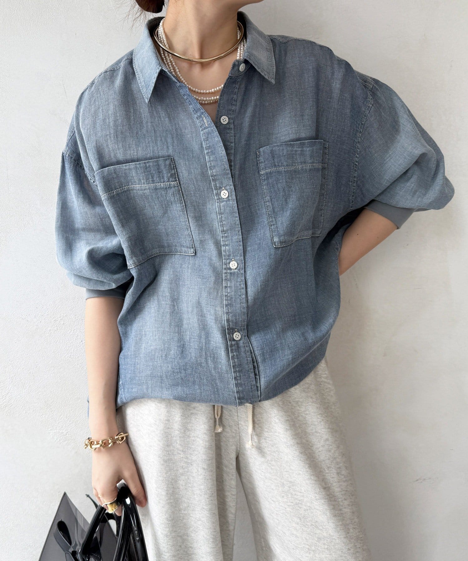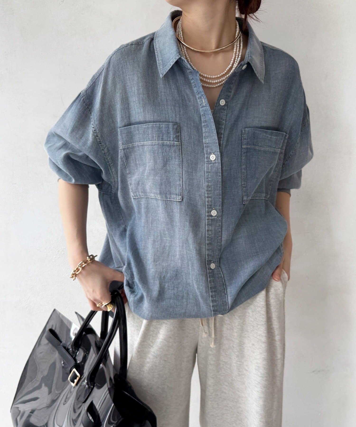 シアー感のあるデニムの素材で、新鮮に見せてくれるデニムシャツ。