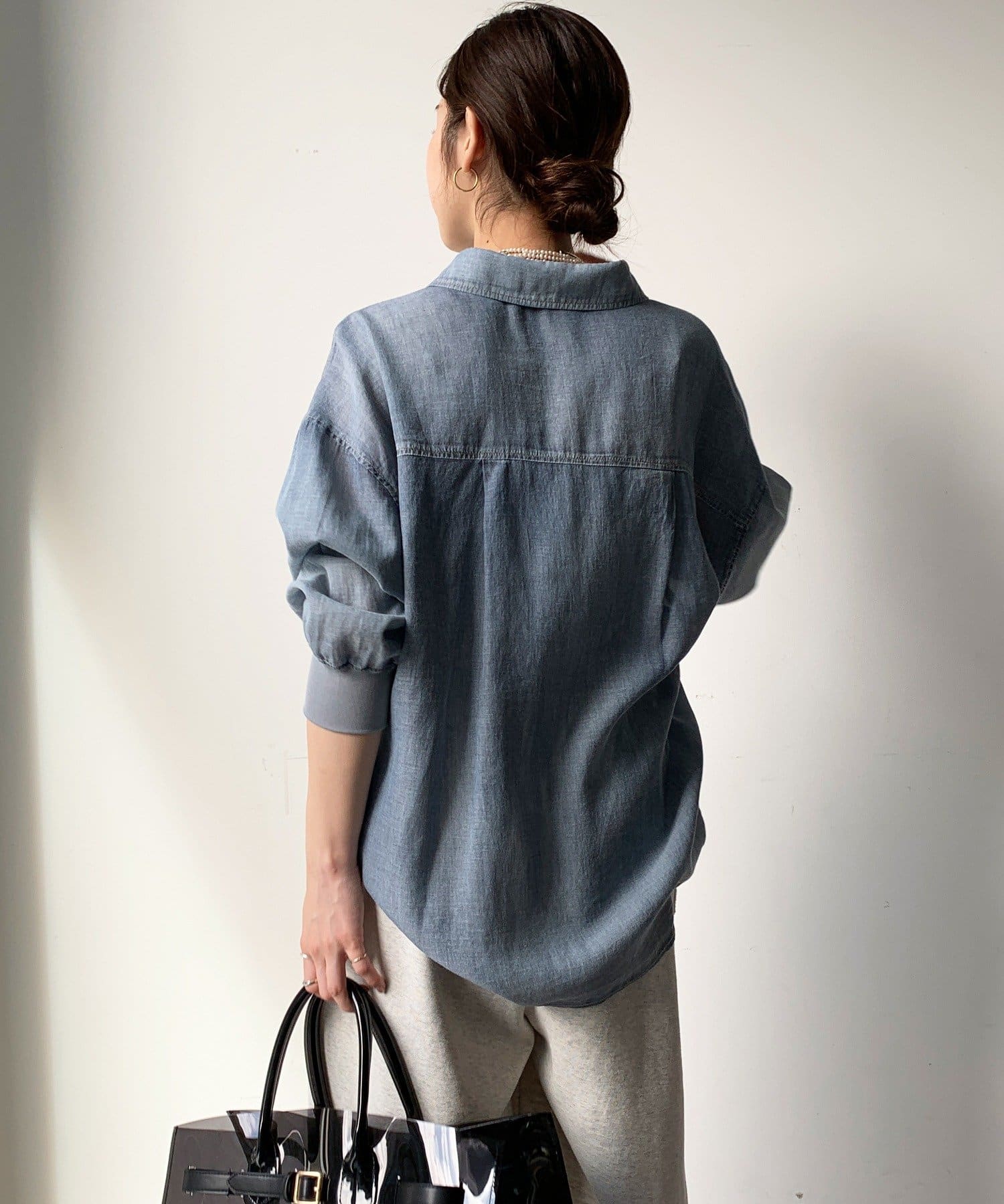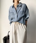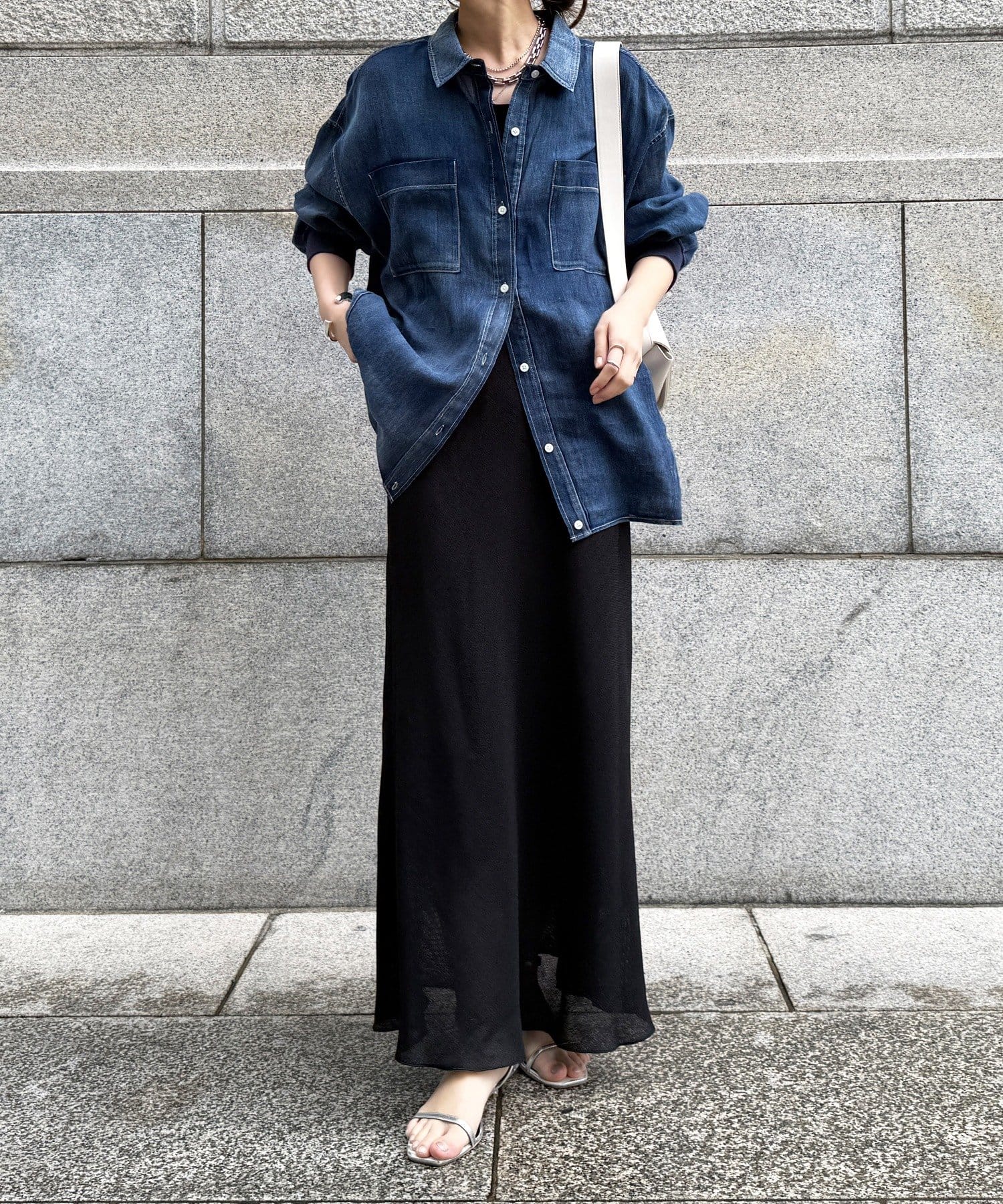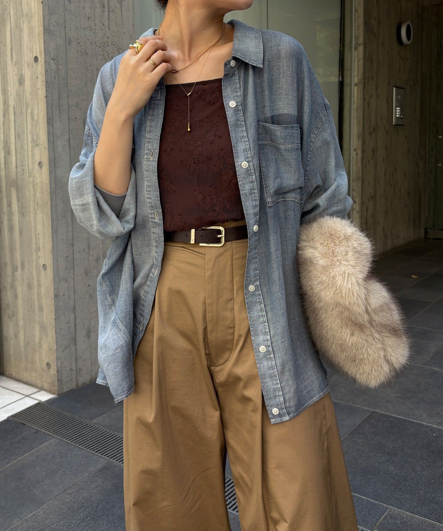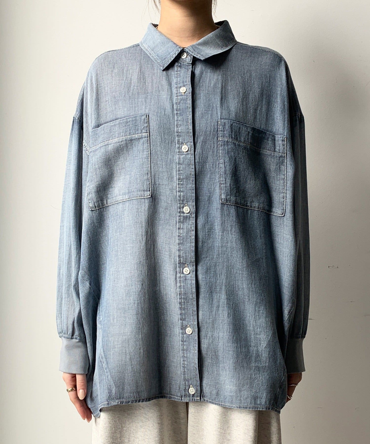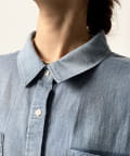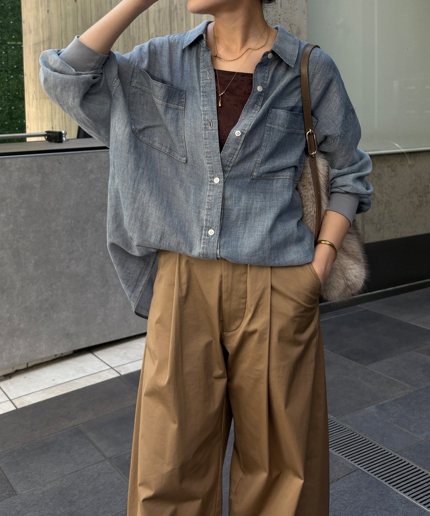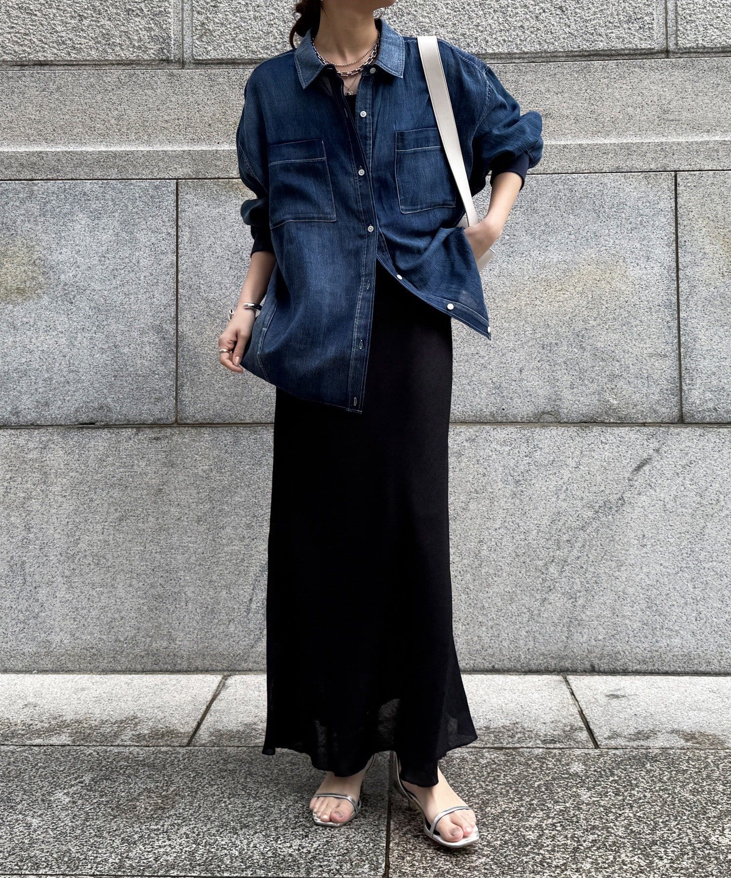 シアー感のあるデニムの素材で、新鮮に見せてくれるデニムシャツ。