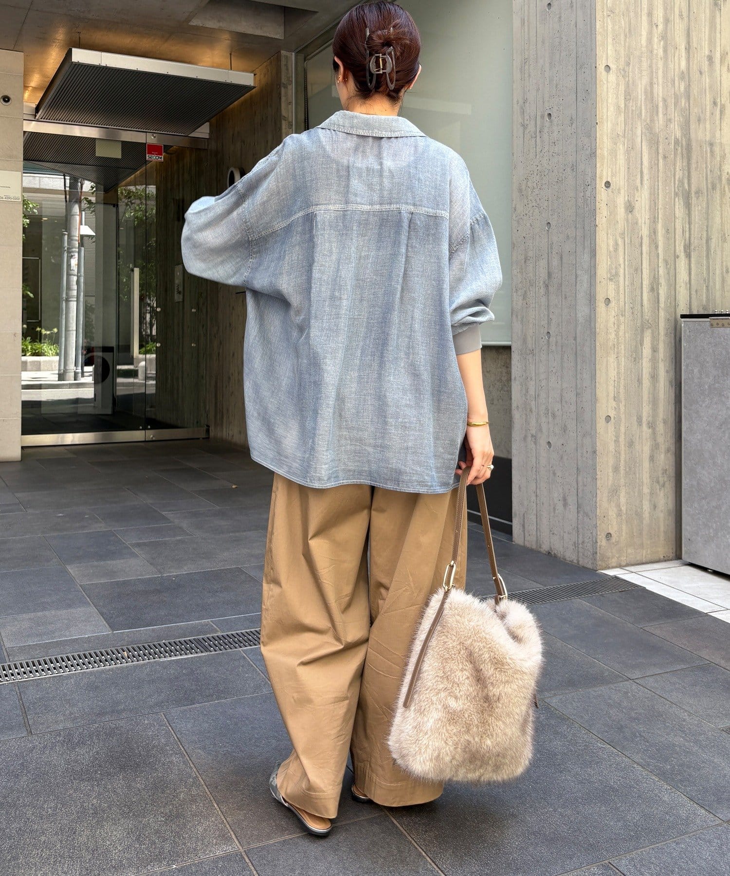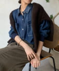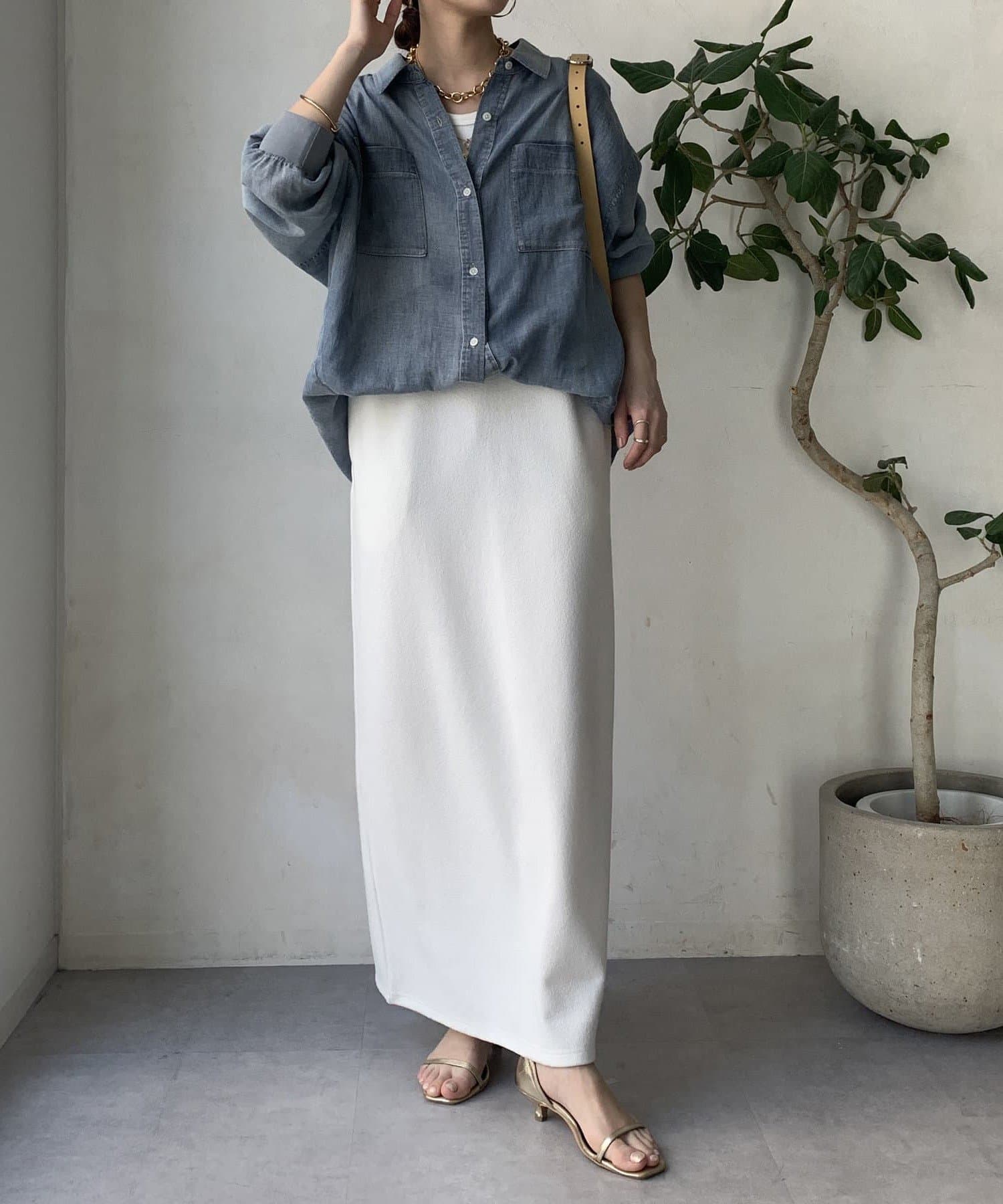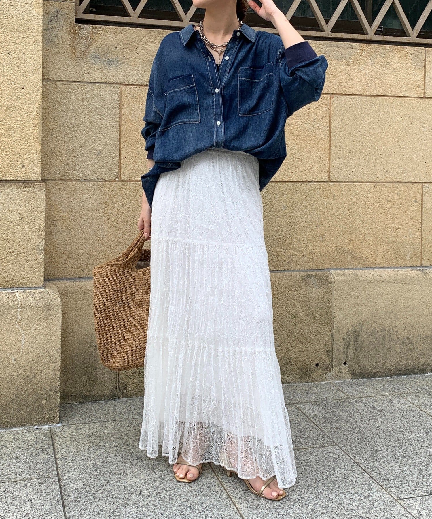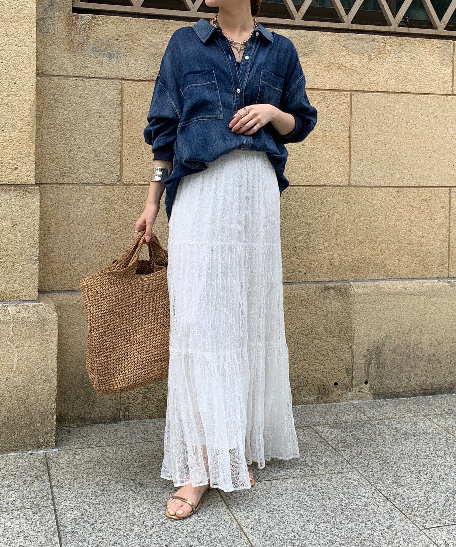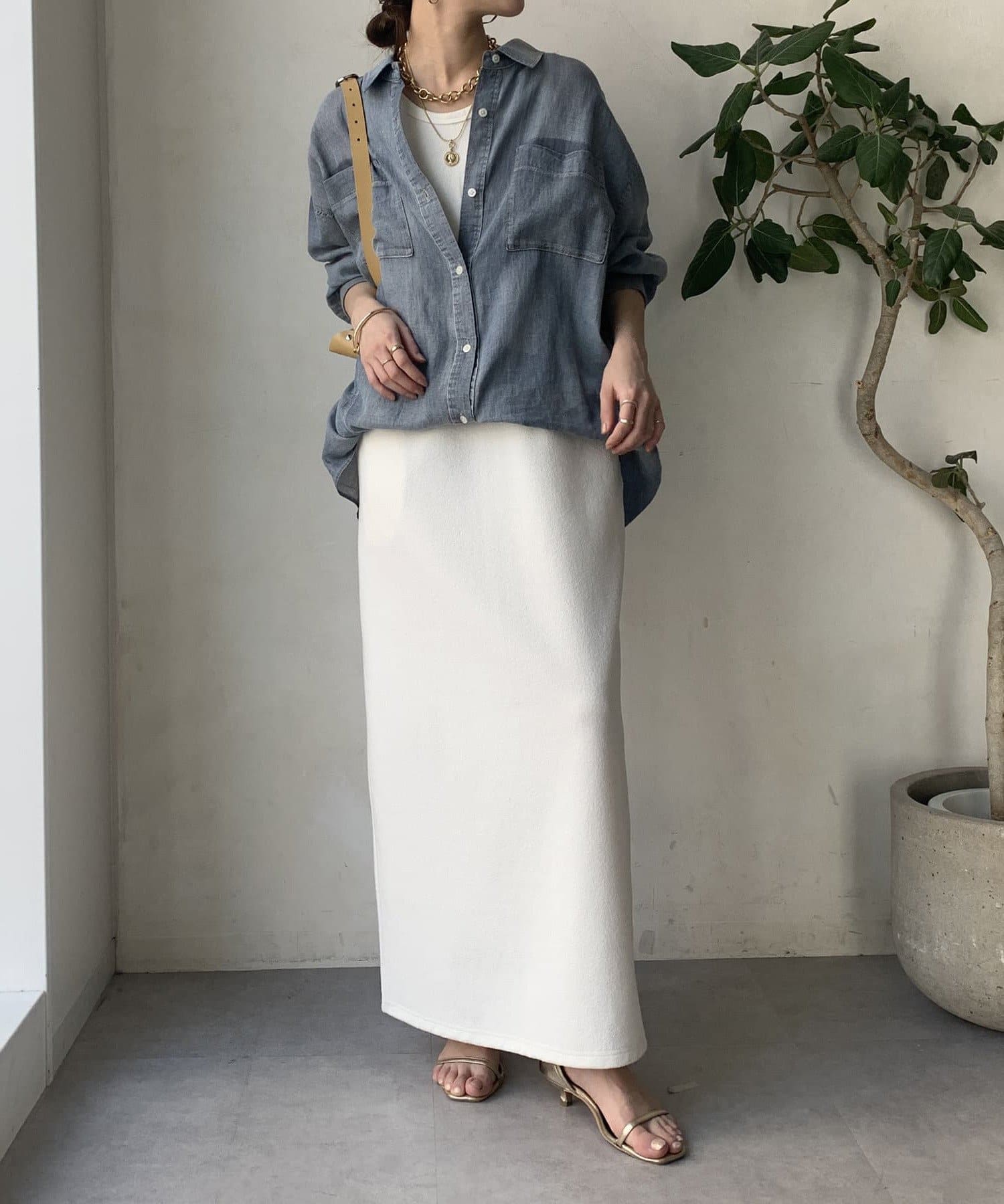 シアー感のあるデニムの素材で、新鮮に見せてくれるデニムシャツ。