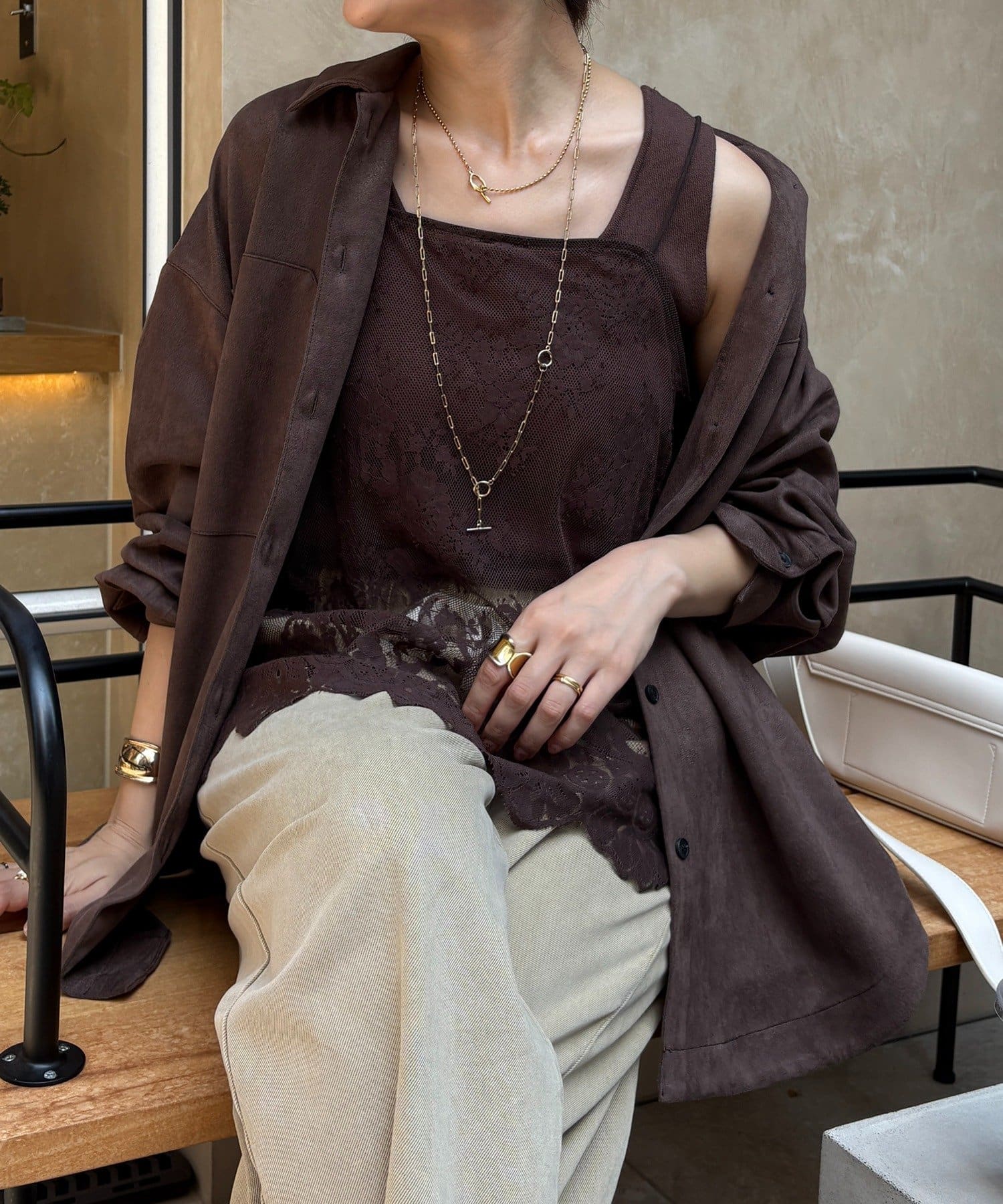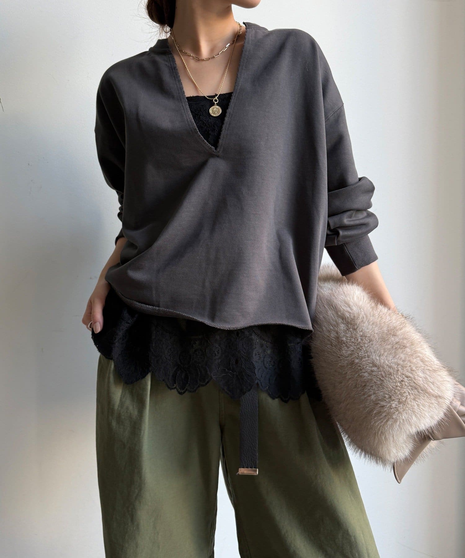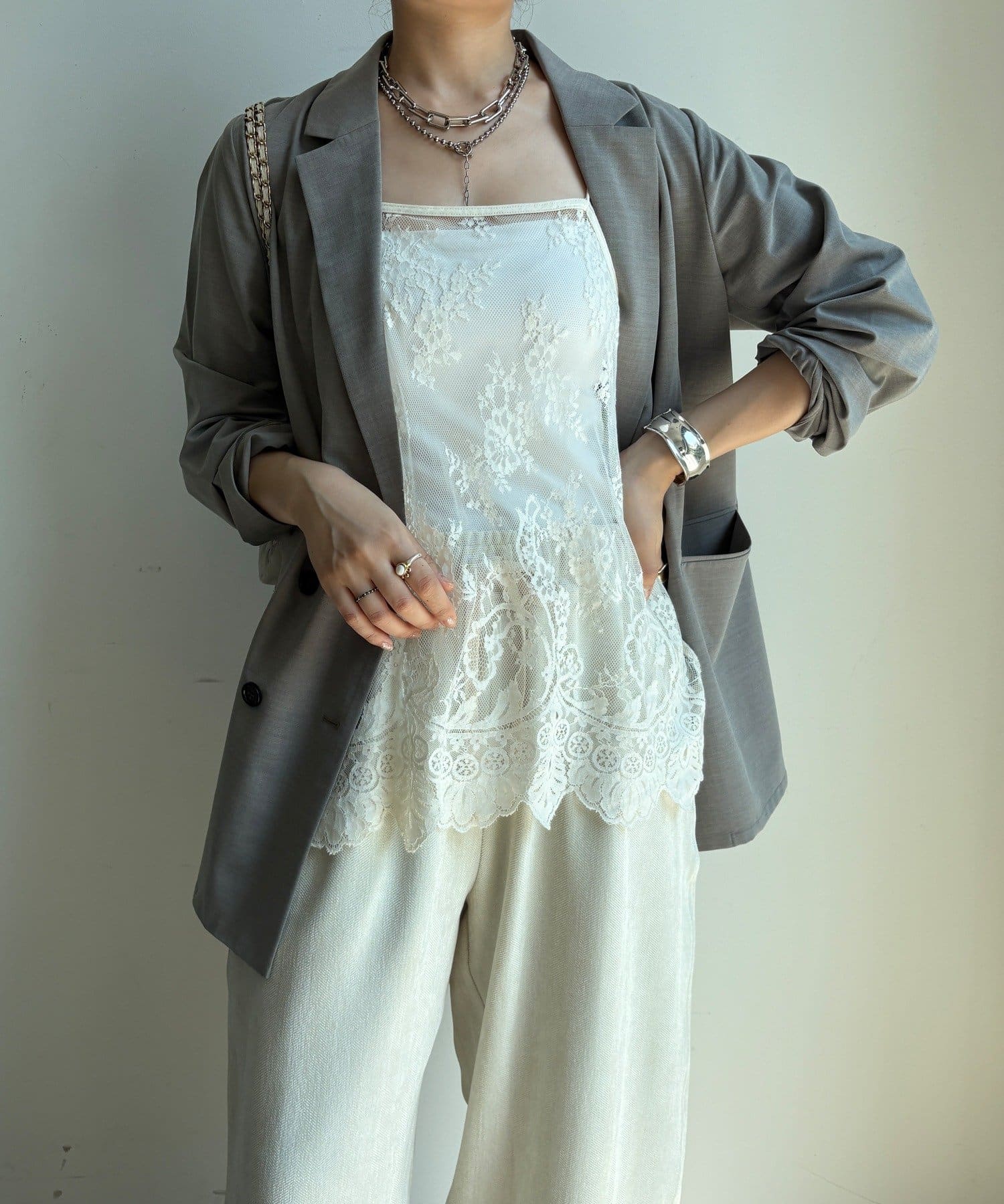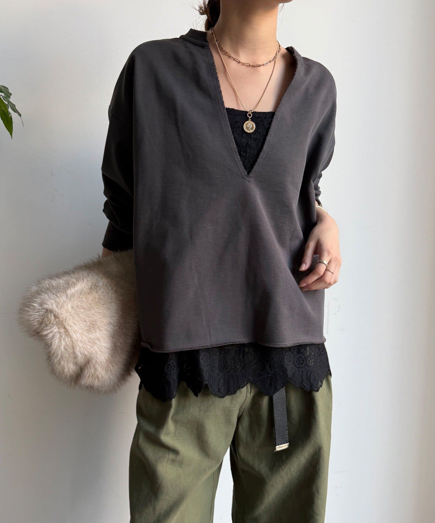 長めの丈がボトムスと被り、透け感のあるレースがスタイリングのアクセントになってくれます!