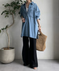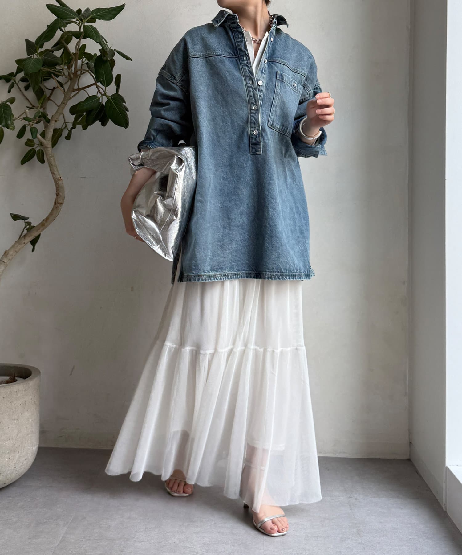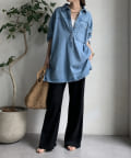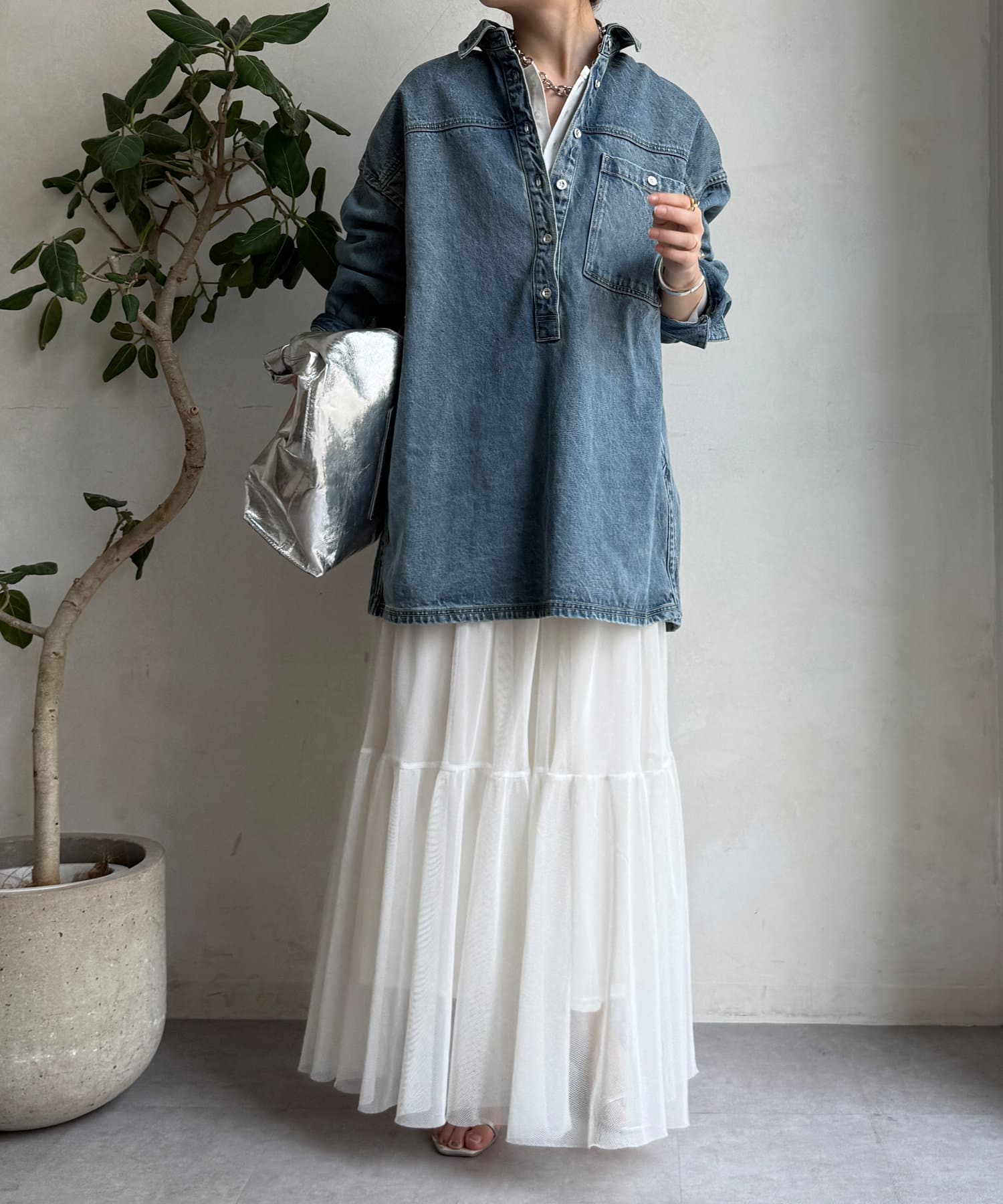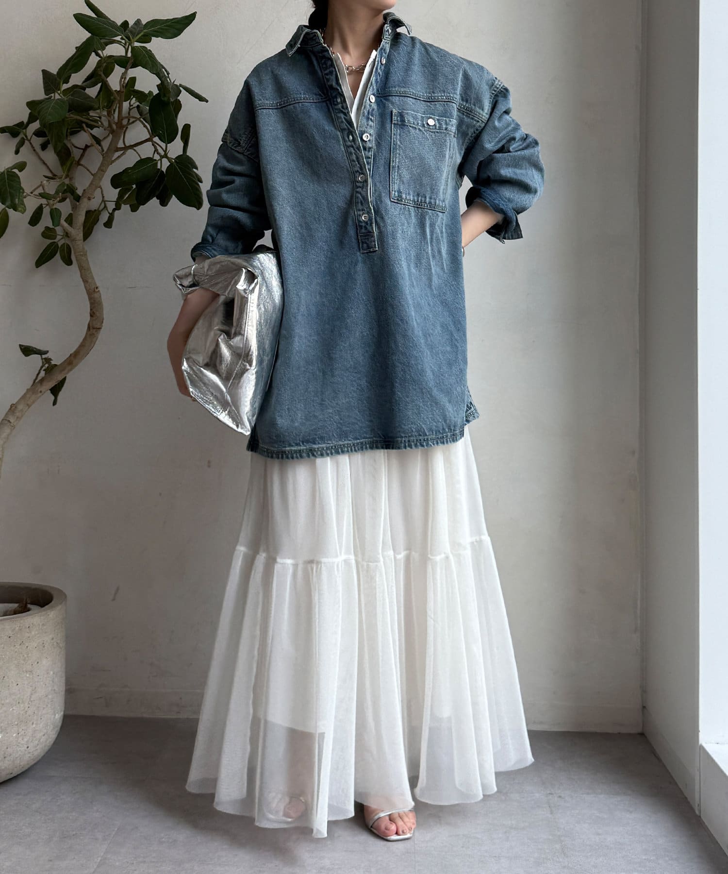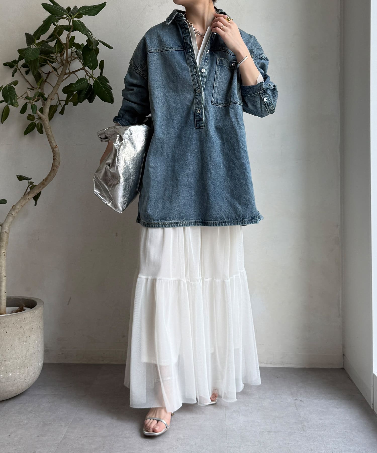 デニム素材ながらも、柔らかな素材感とややオーバーサイズなシルエットが、こなれ感を演出。
