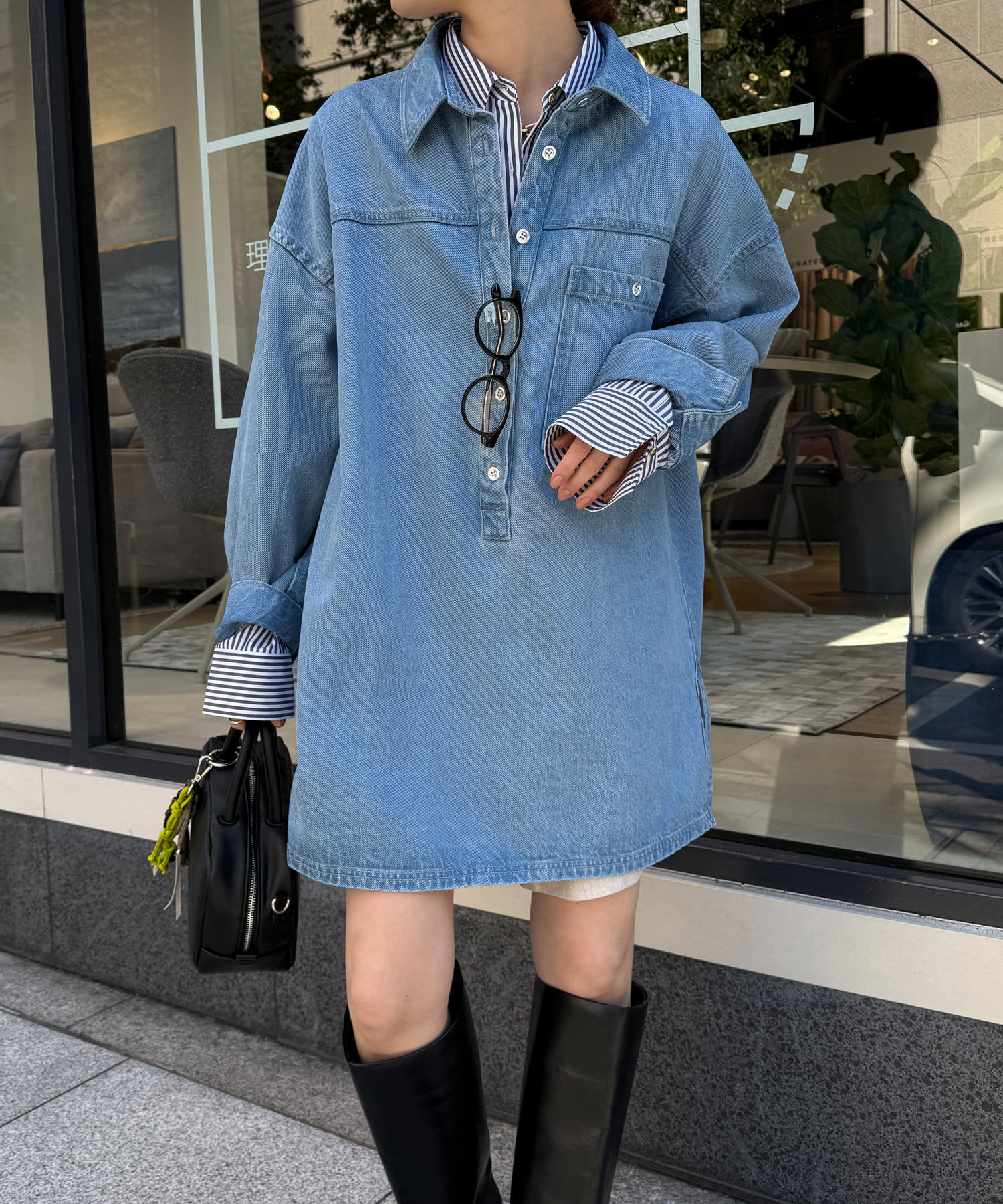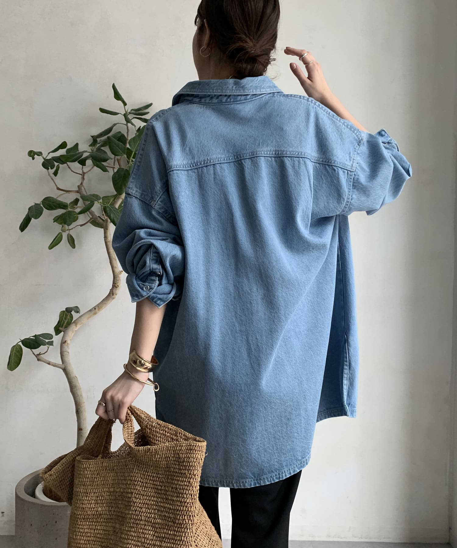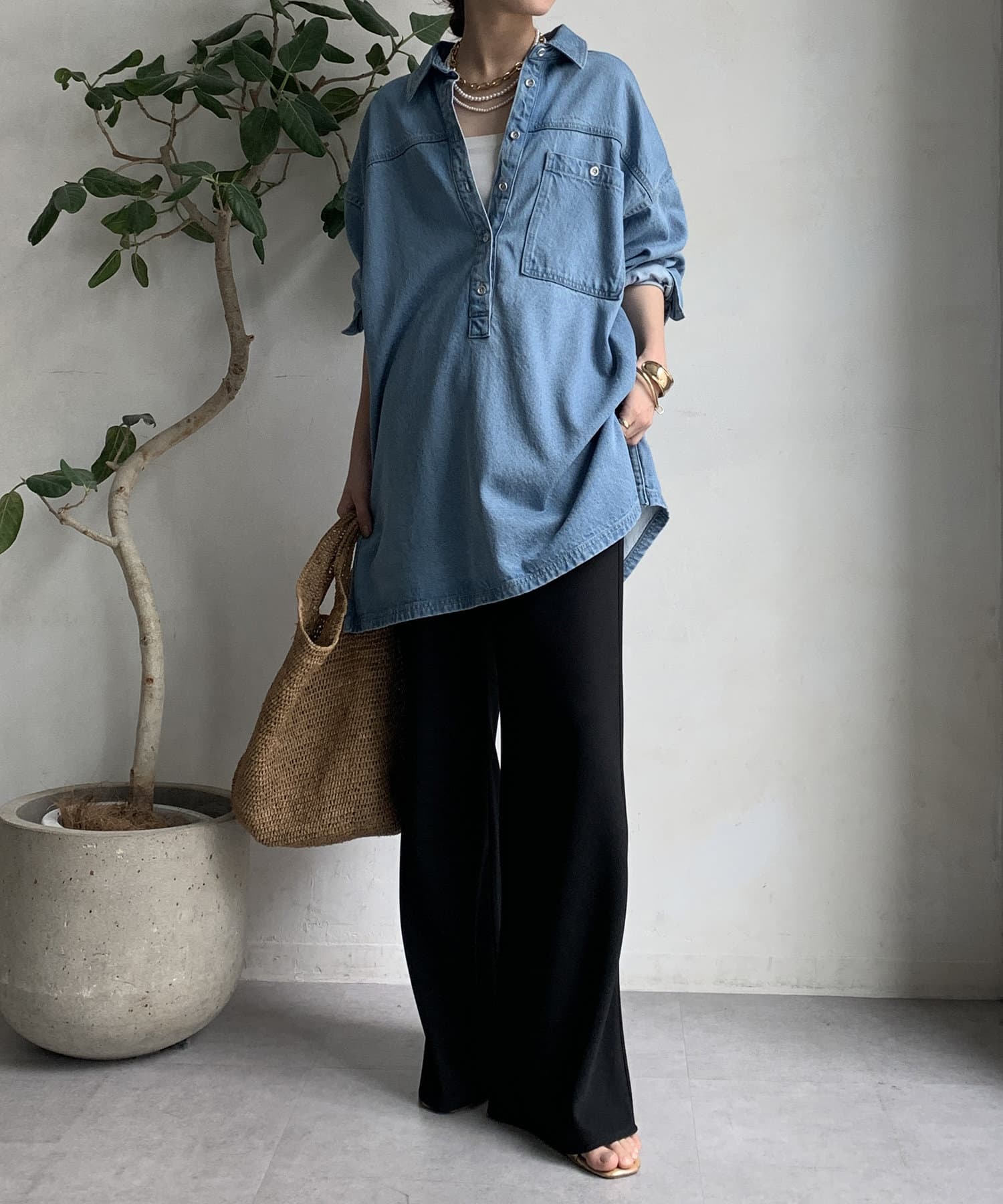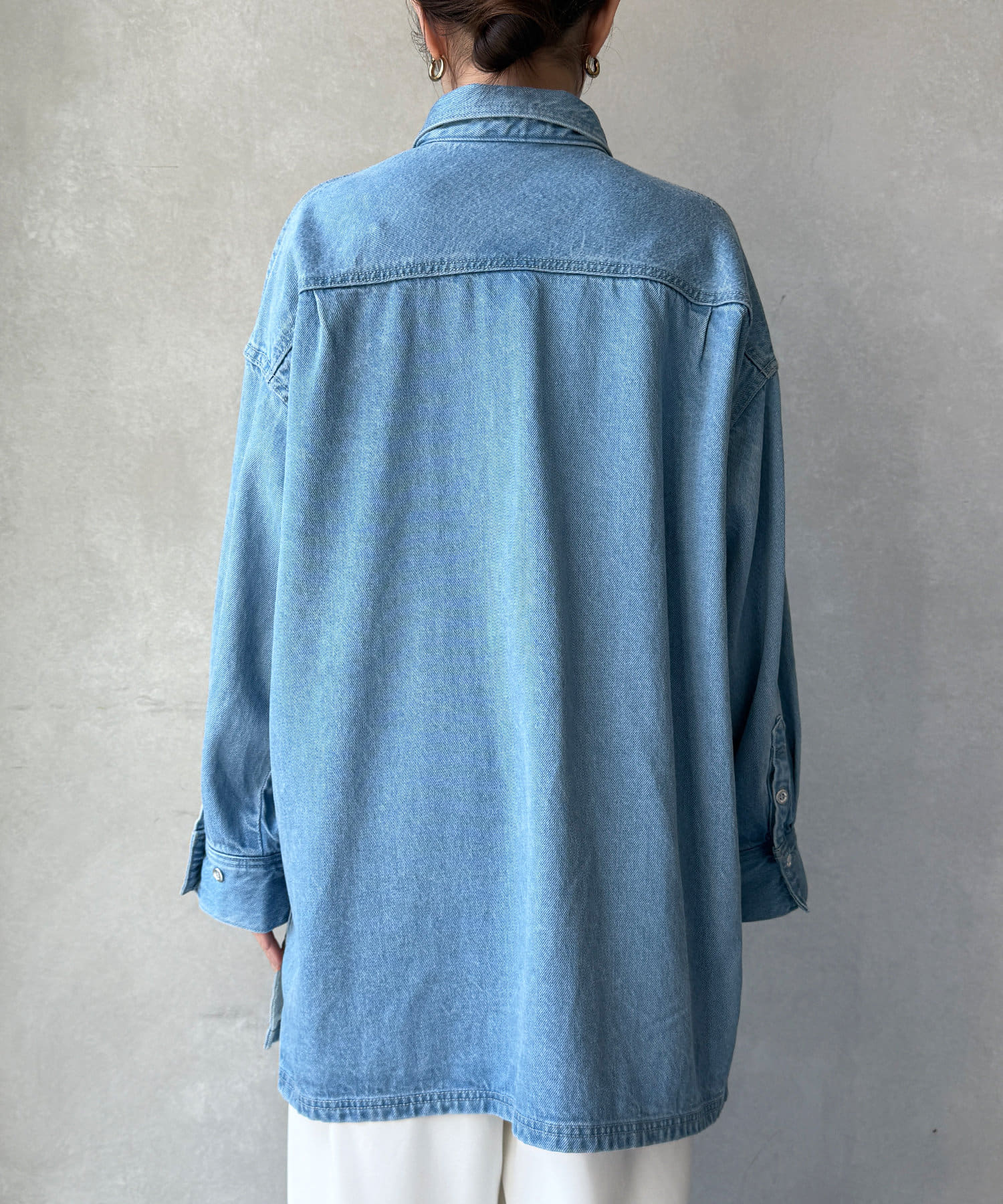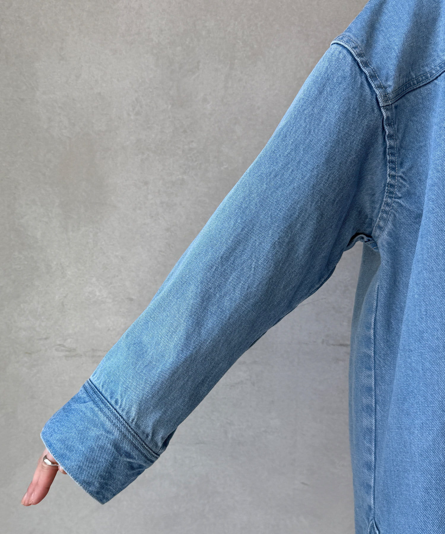 デニム素材ながらも、柔らかな素材感とややオーバーサイズなシルエットが、こなれ感を演出。