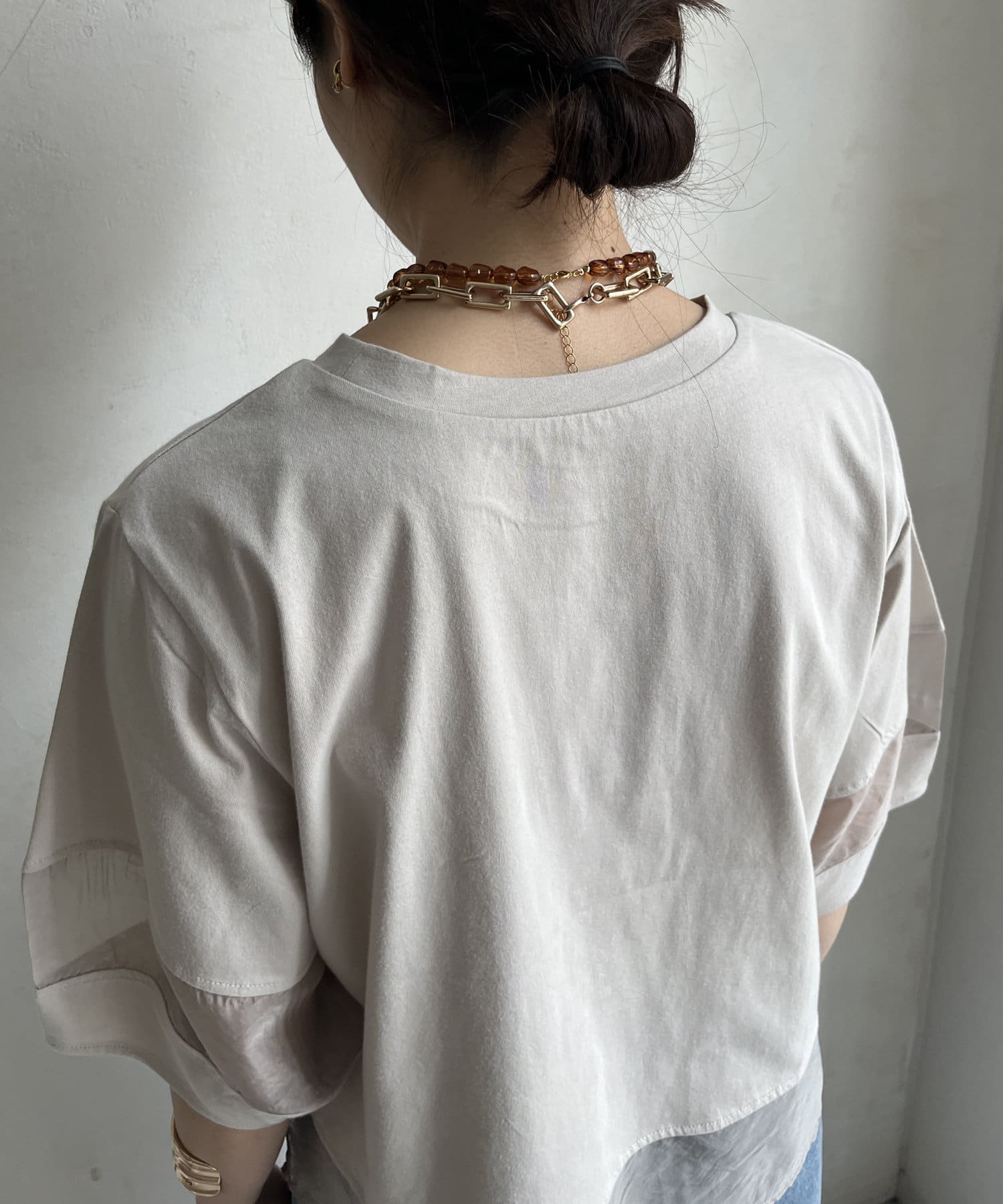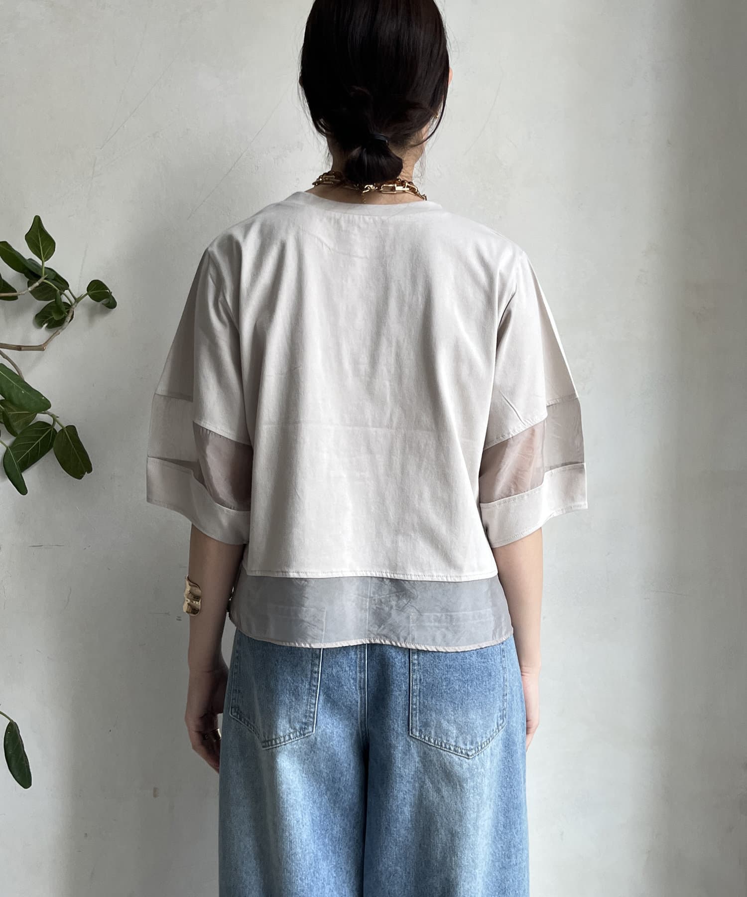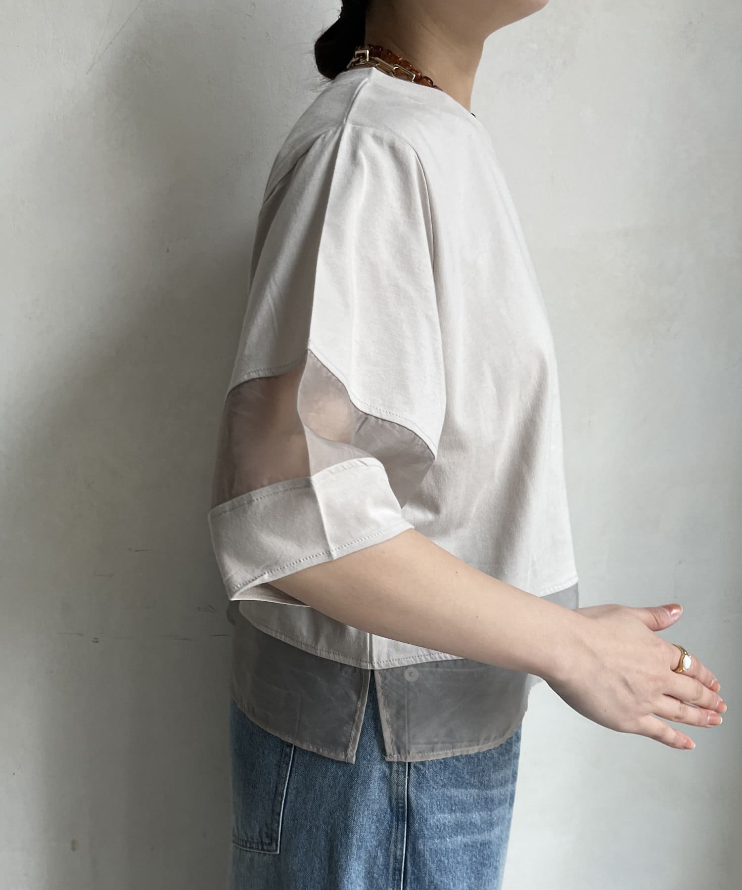 袖のオーガンジー切り替えがコーディネートのアクセントになること間違いなし。