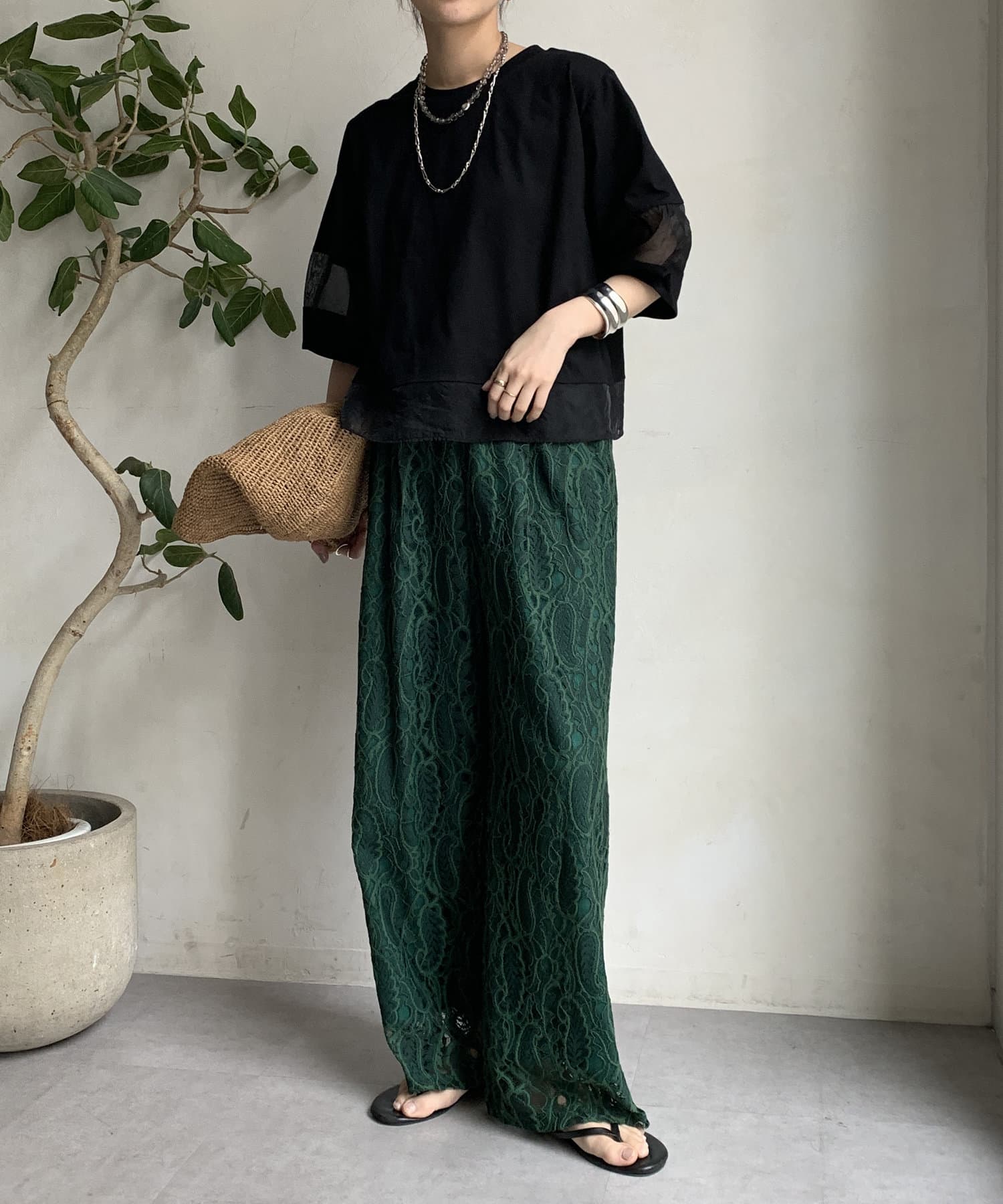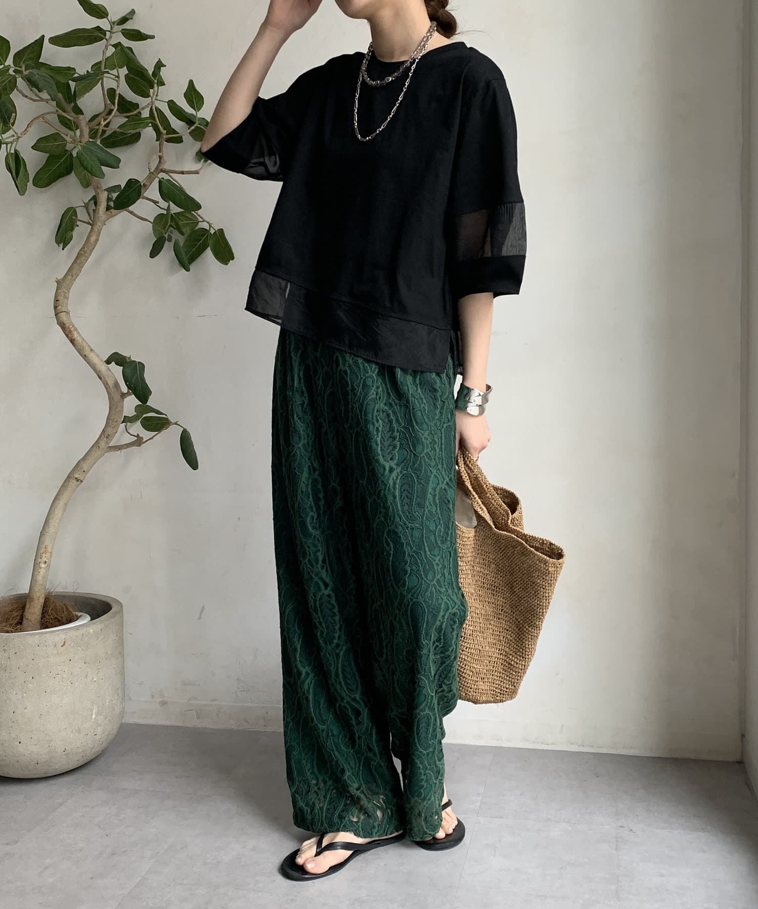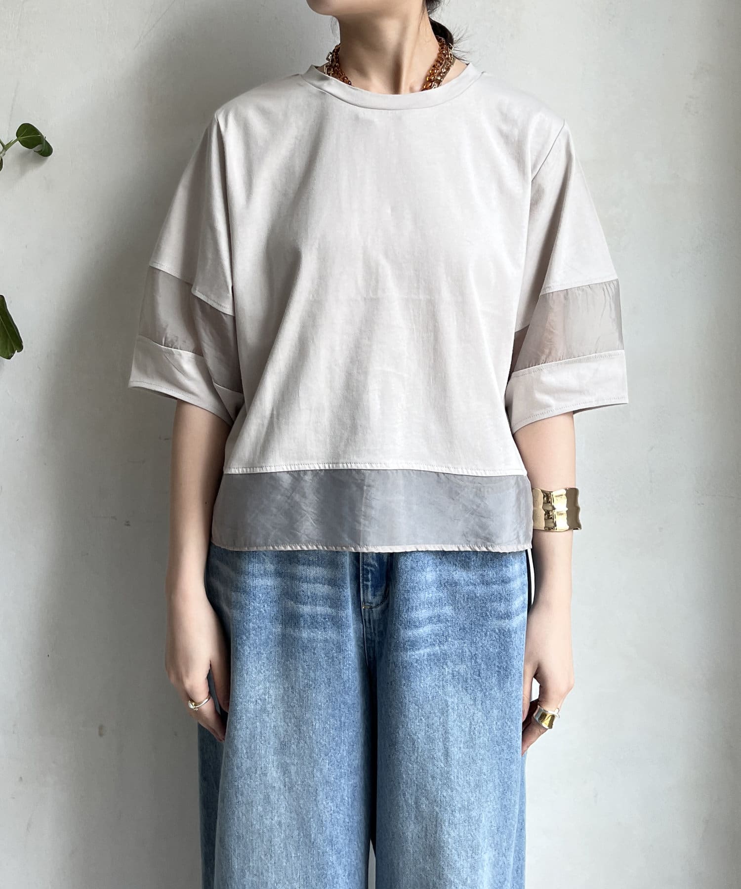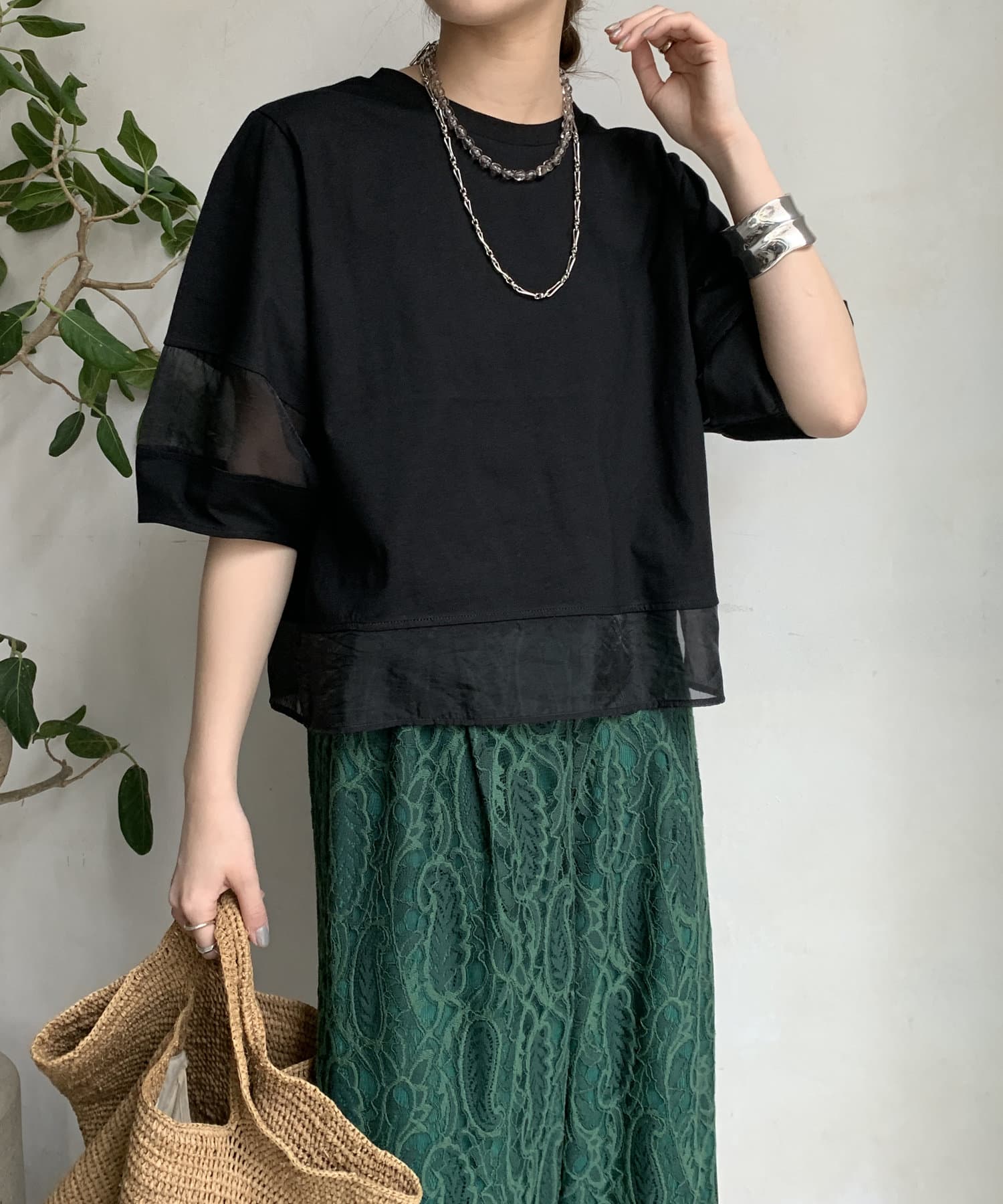 袖のオーガンジー切り替えがコーディネートのアクセントになること間違いなし。